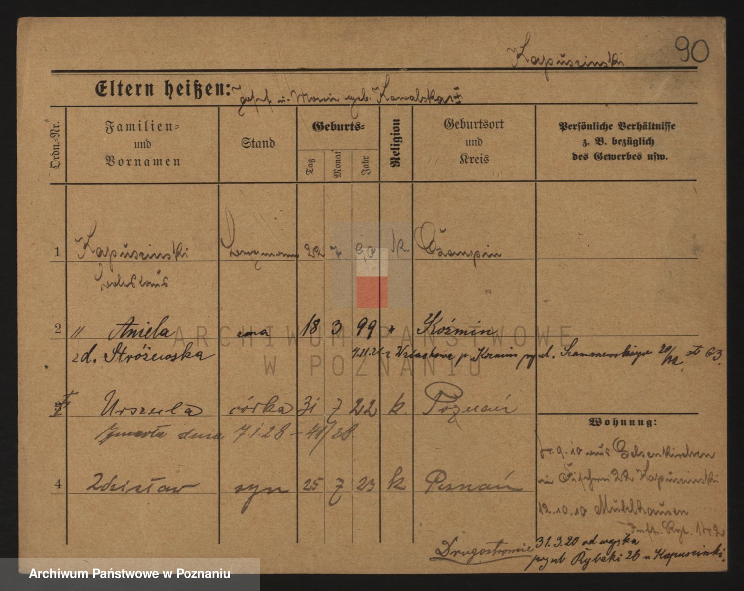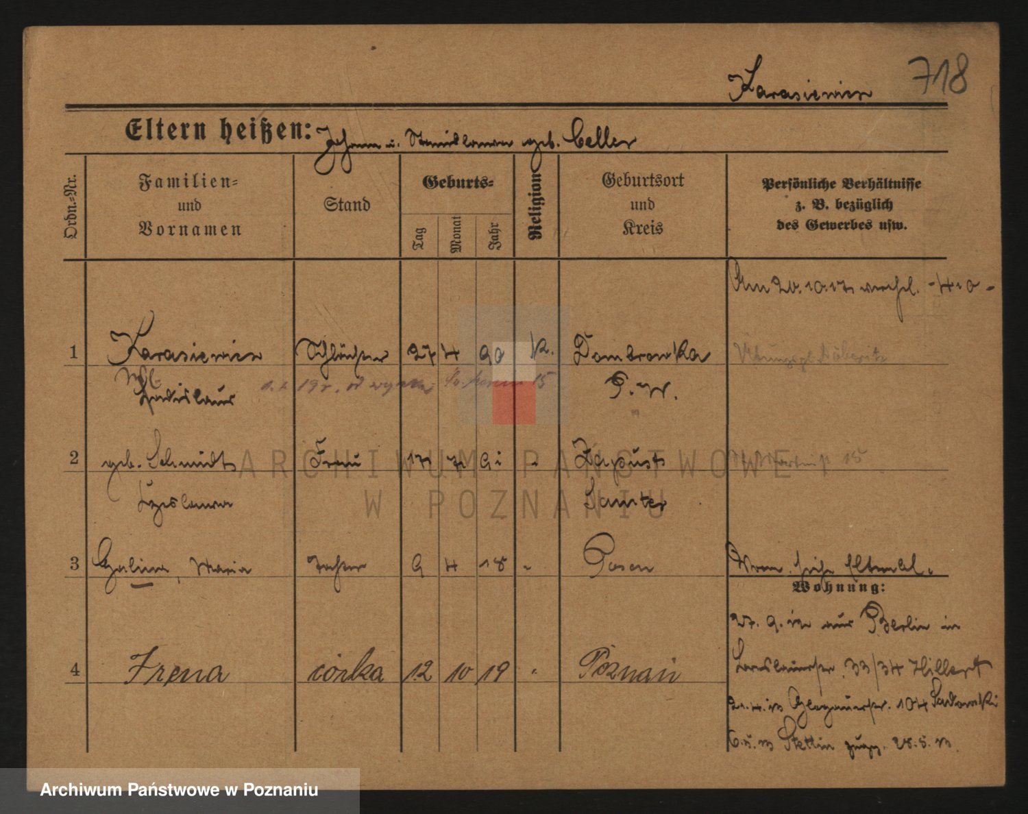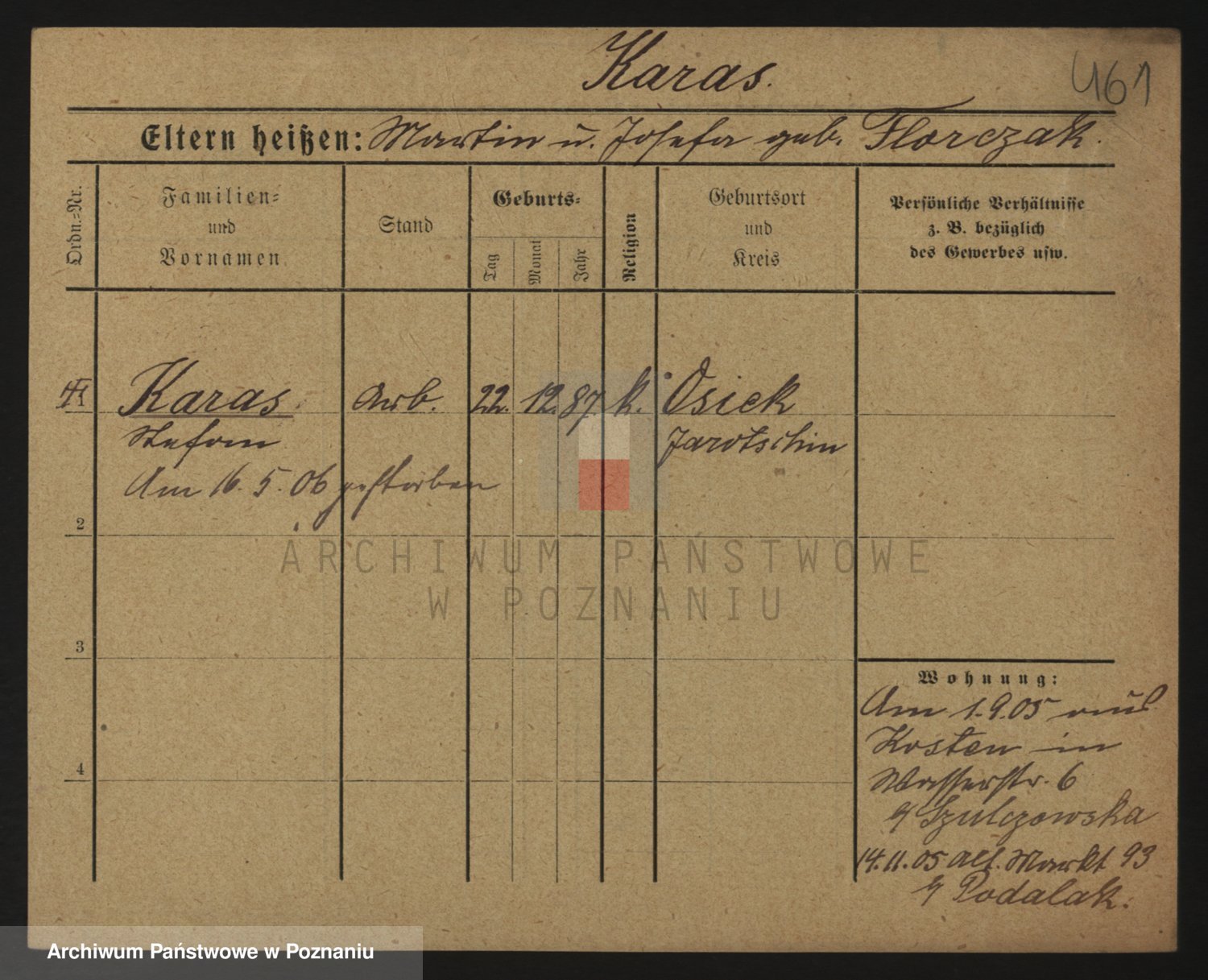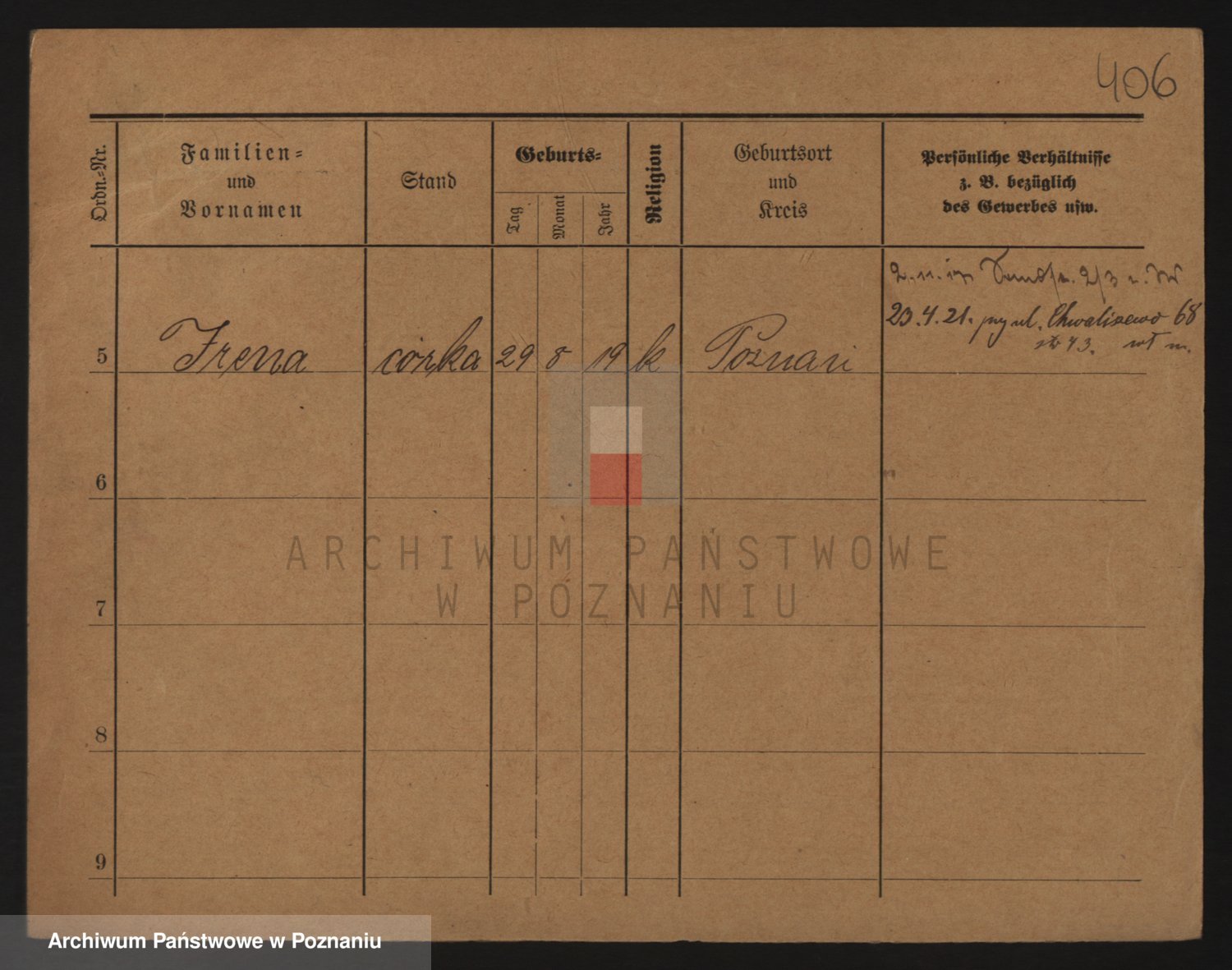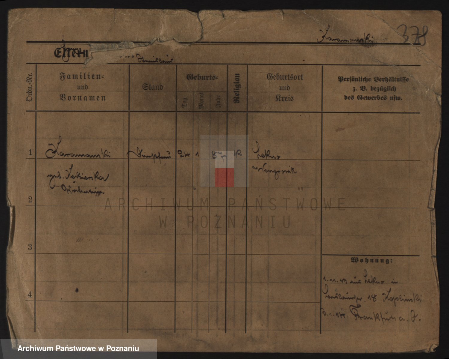 Podgląd karty osobowej dostępny jest po kliknięciu na nazwisko lub ikonkę karty. Można dokonywać powiększenia (ikony na górze) lub przechodzić między kolejnymi skanami (strzałki po bokach).