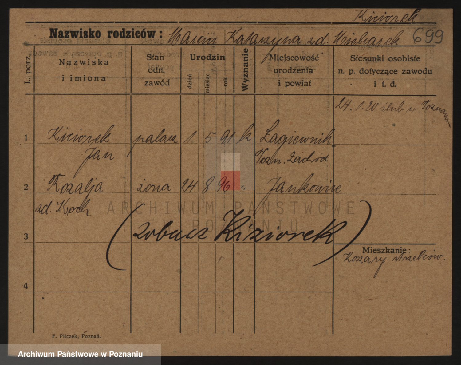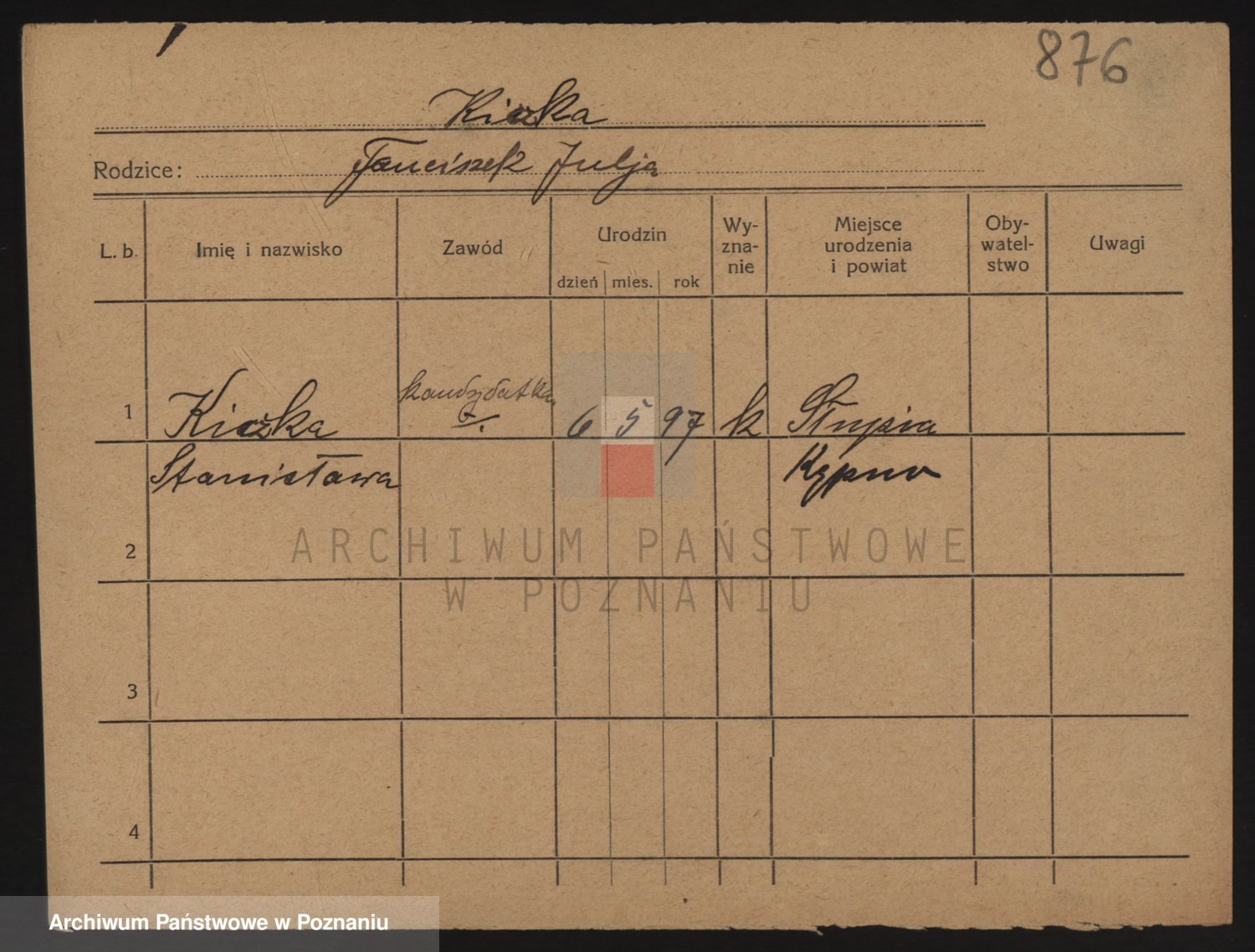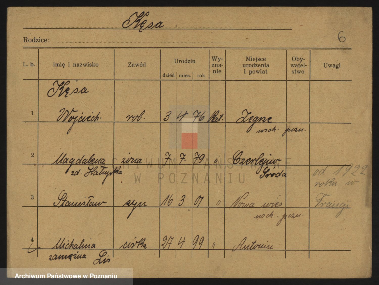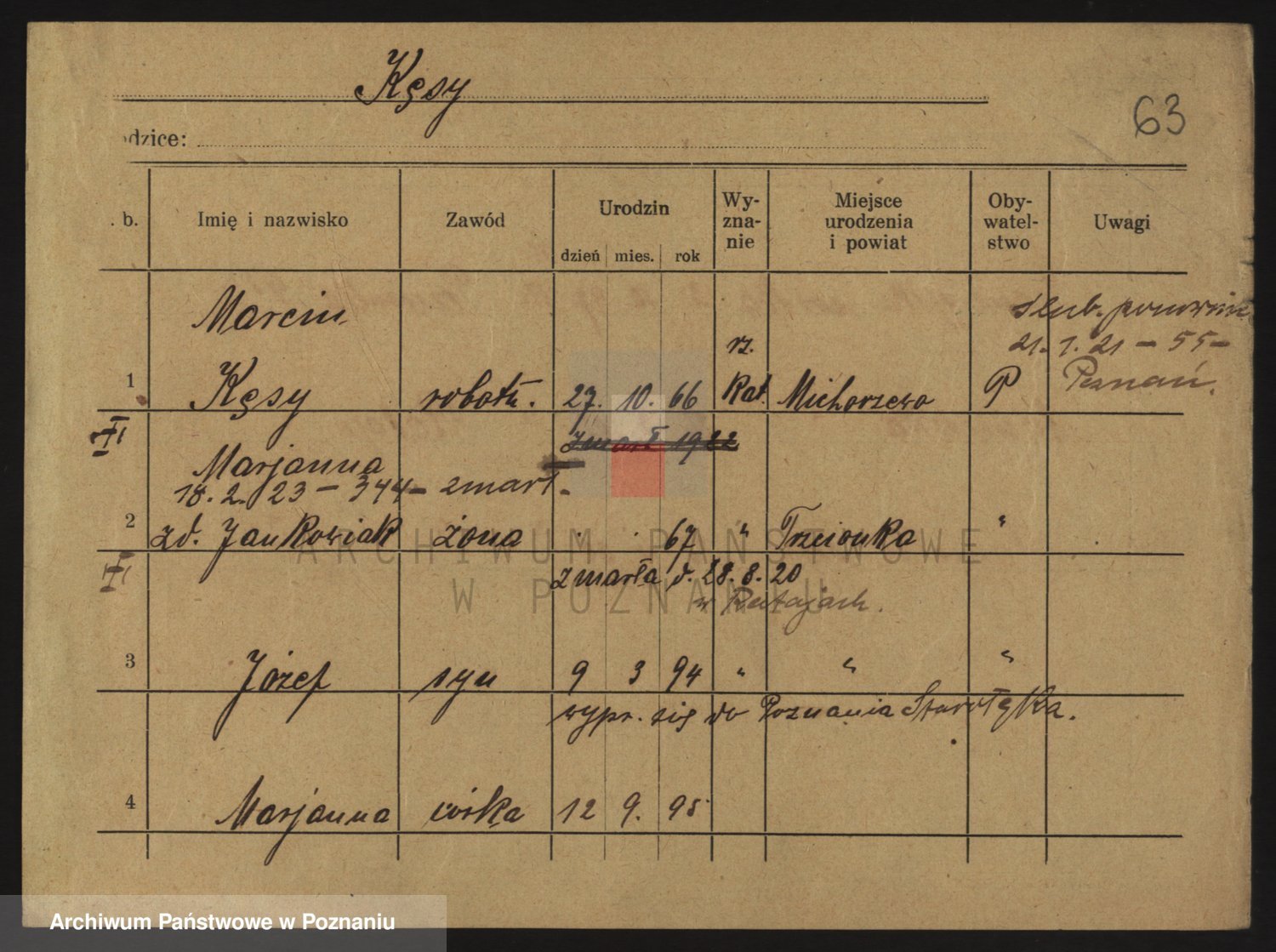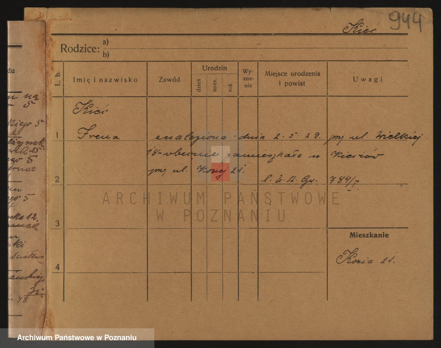 Podgląd karty osobowej dostępny jest po kliknięciu na nazwisko lub ikonkę karty. Można dokonywać powiększenia (ikony na górze) lub przechodzić między kolejnymi skanami (strzałki po bokach).
