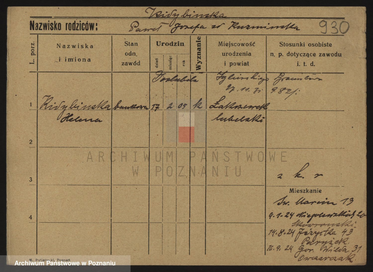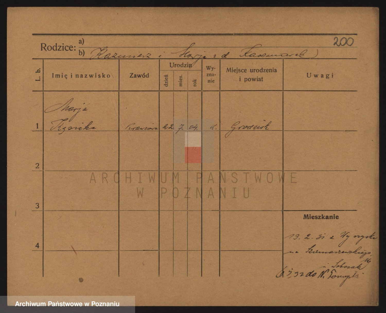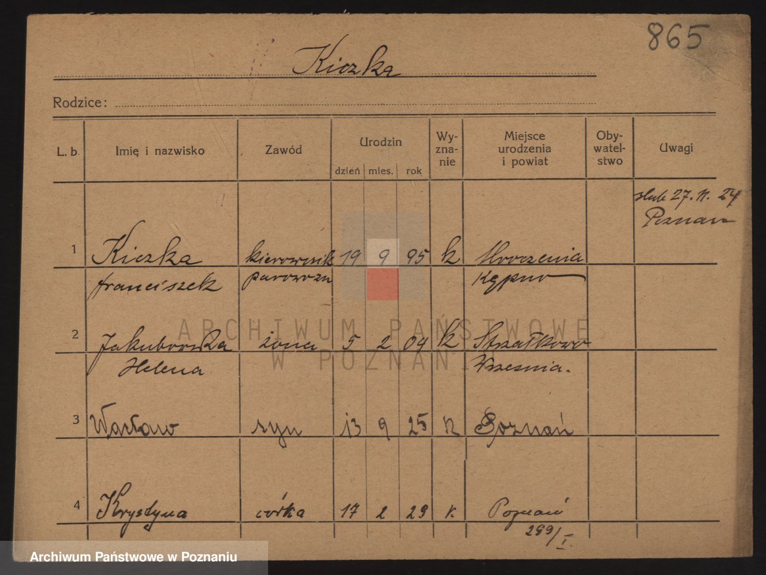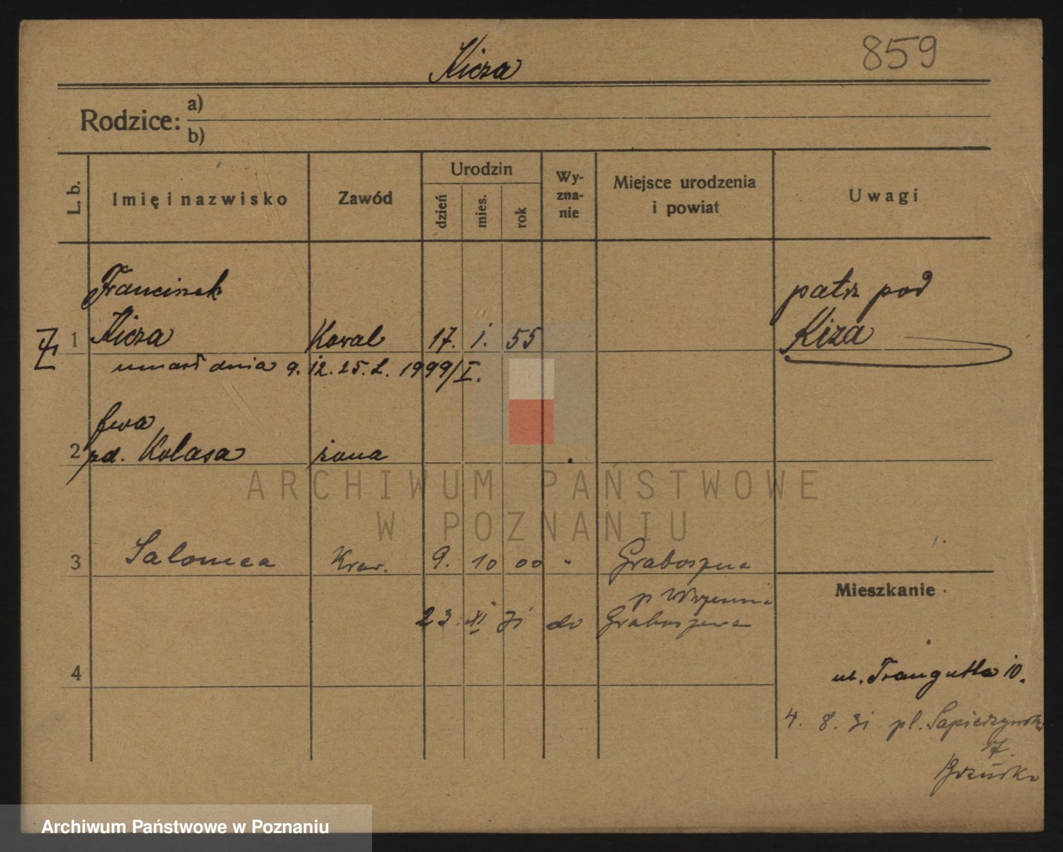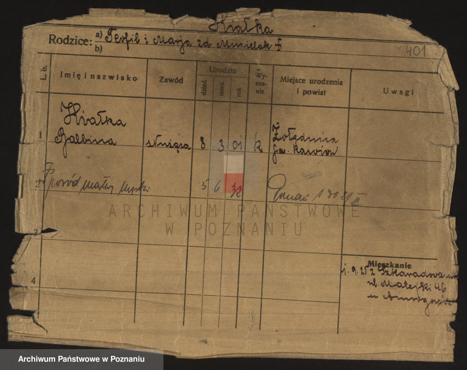 Podgląd karty osobowej dostępny jest po kliknięciu na nazwisko lub ikonkę karty. Można dokonywać powiększenia (ikony na górze) lub przechodzić między kolejnymi skanami (strzałki po bokach).