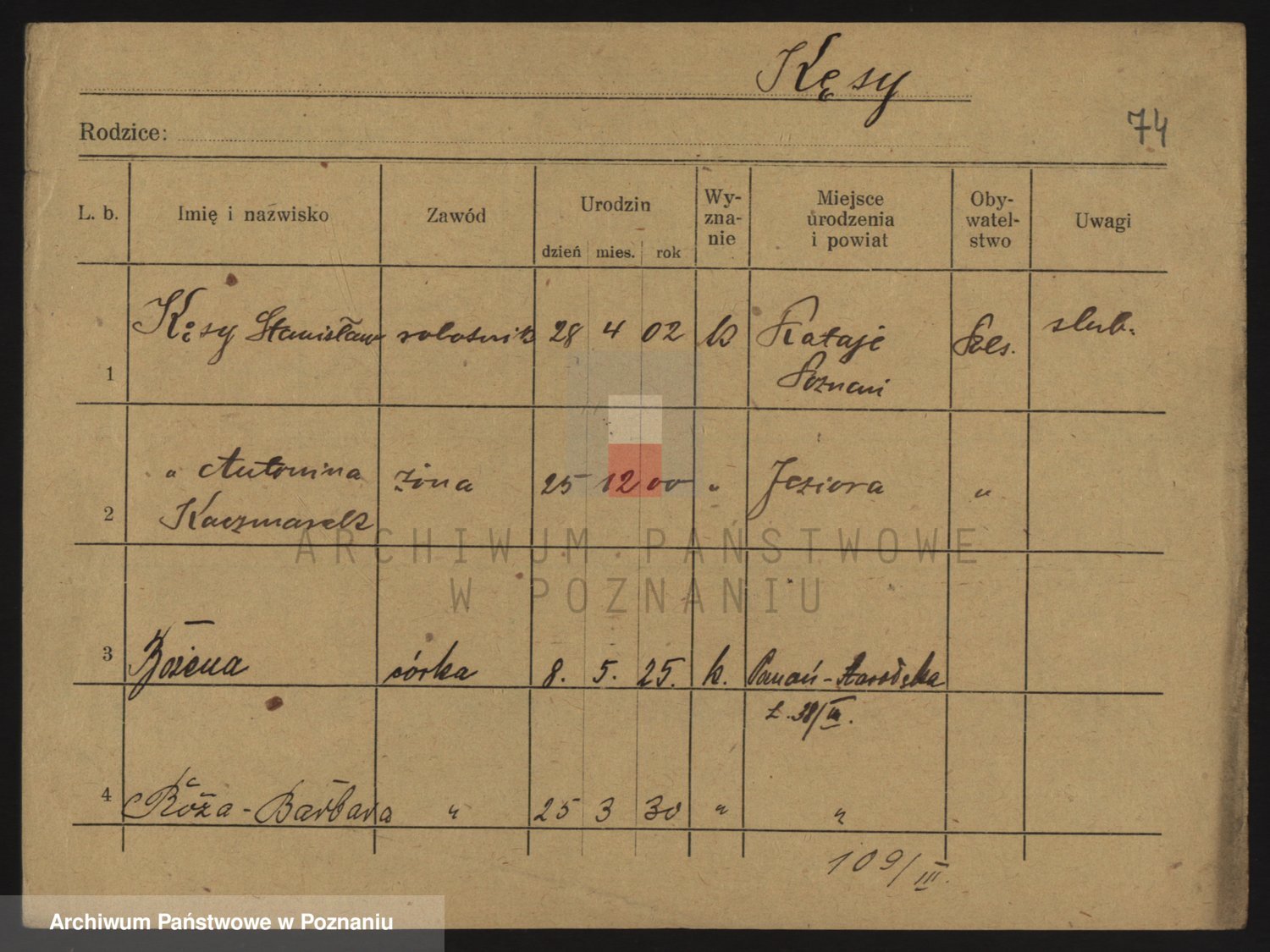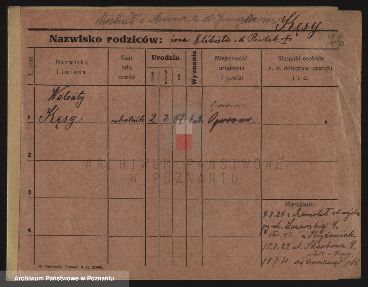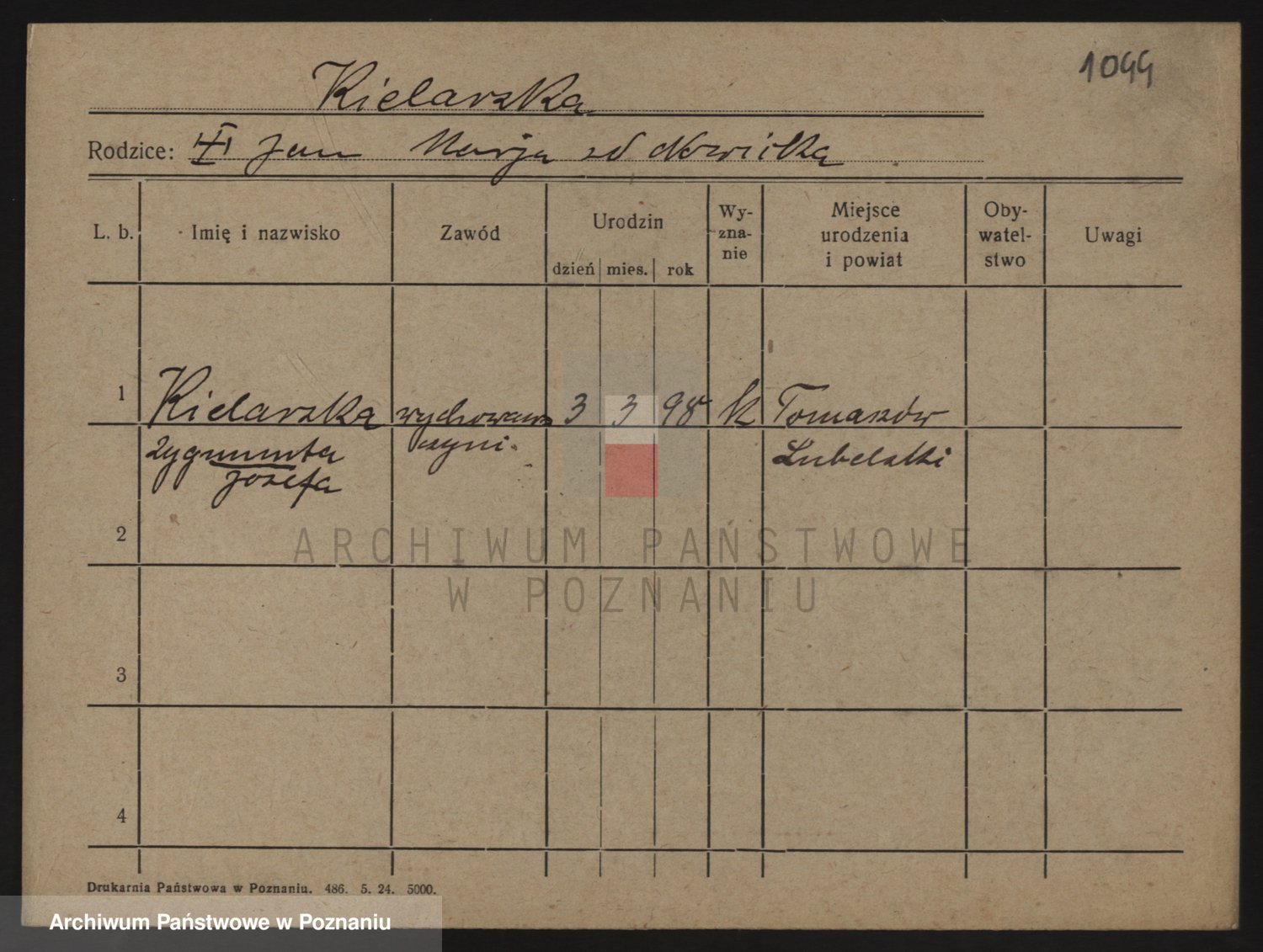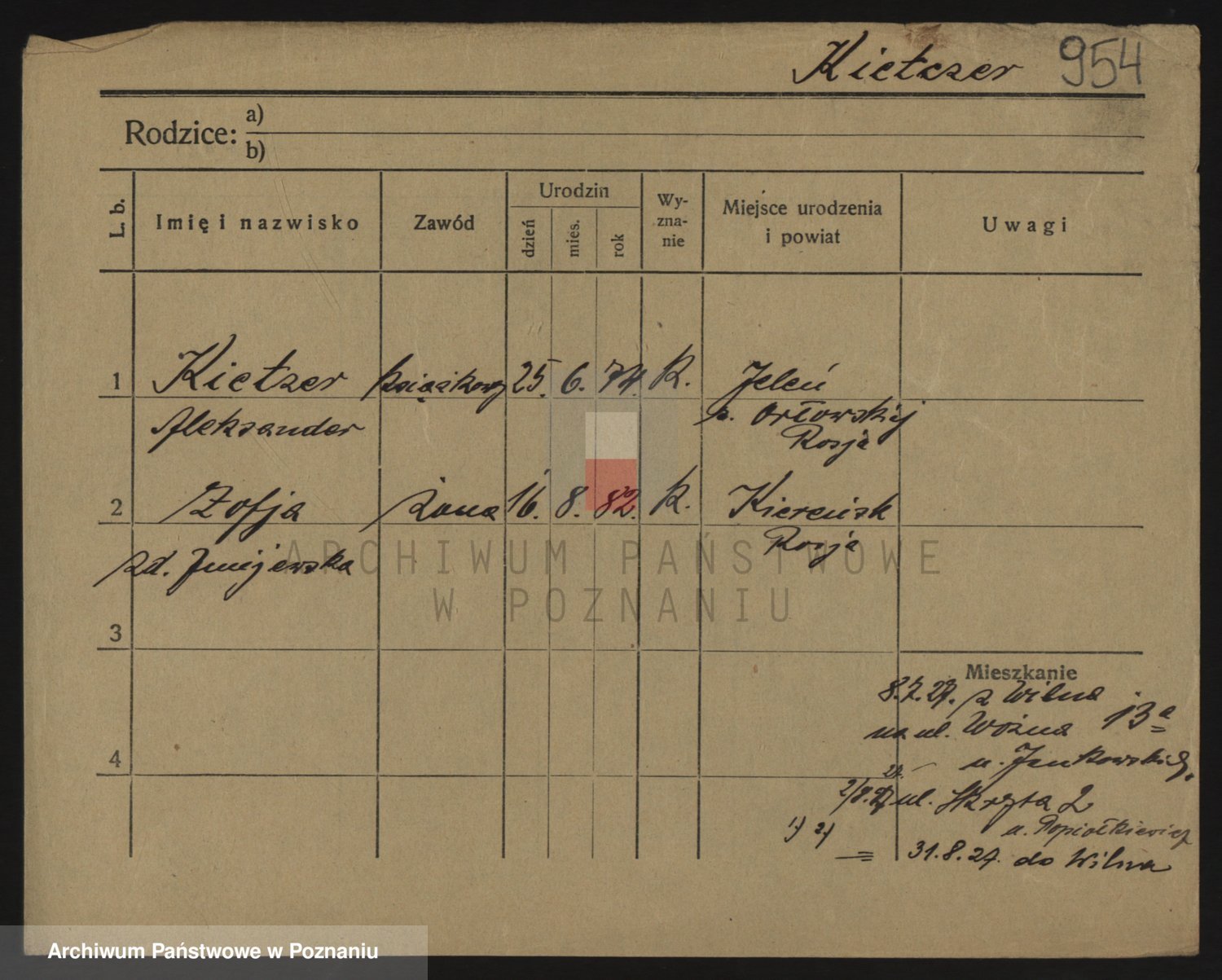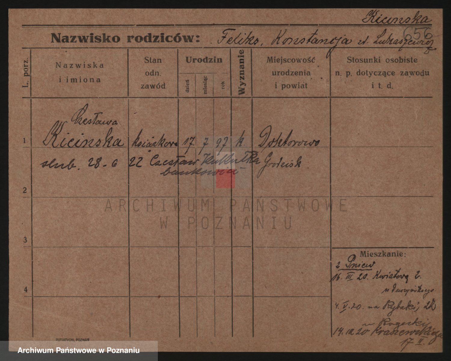 Podgląd karty osobowej dostępny jest po kliknięciu na nazwisko lub ikonkę karty. Można dokonywać powiększenia (ikony na górze) lub przechodzić między kolejnymi skanami (strzałki po bokach).