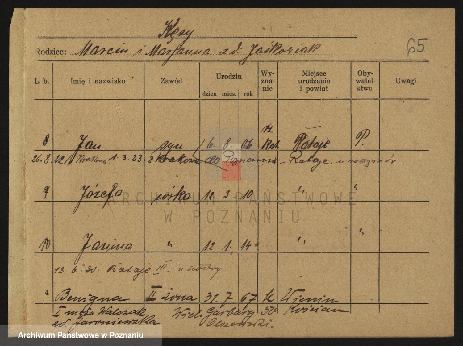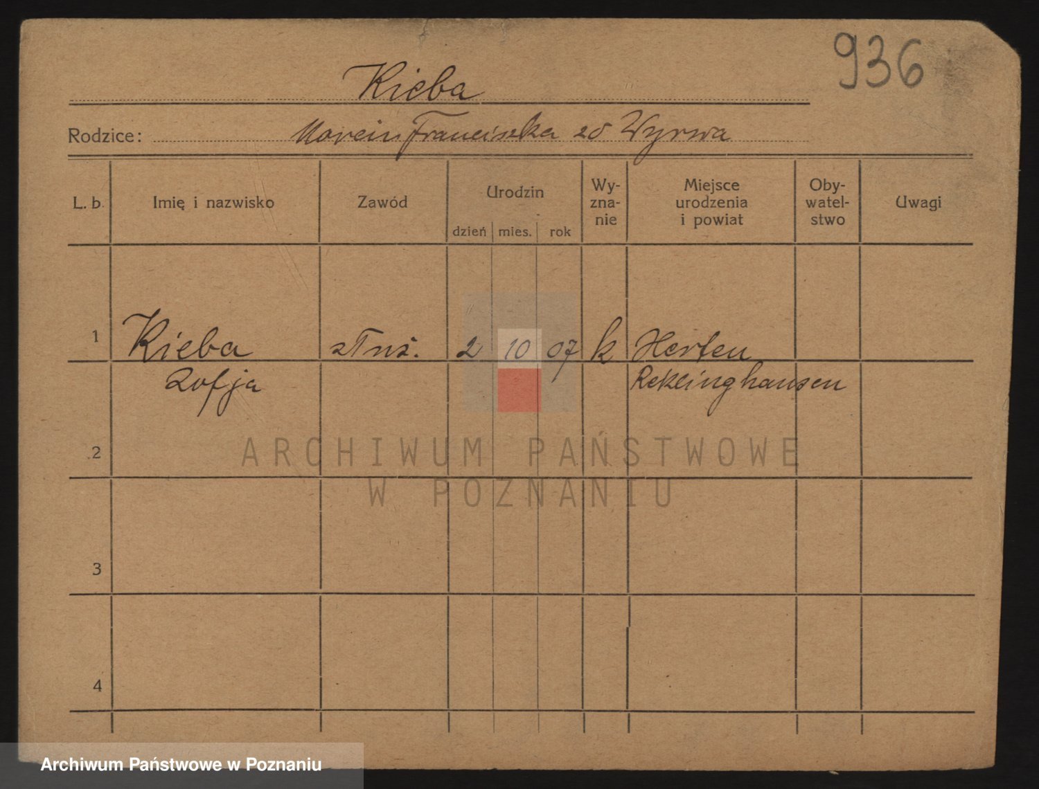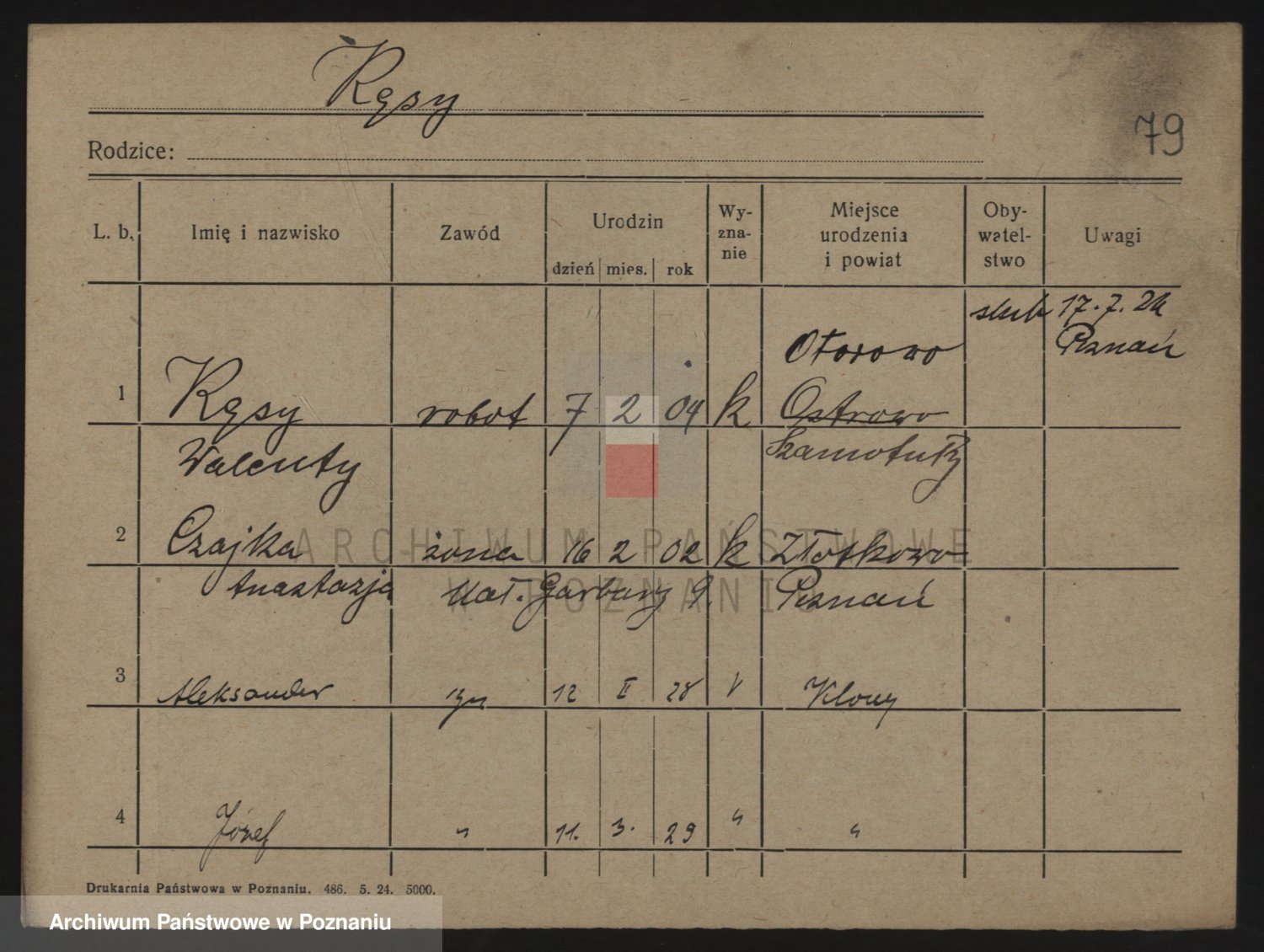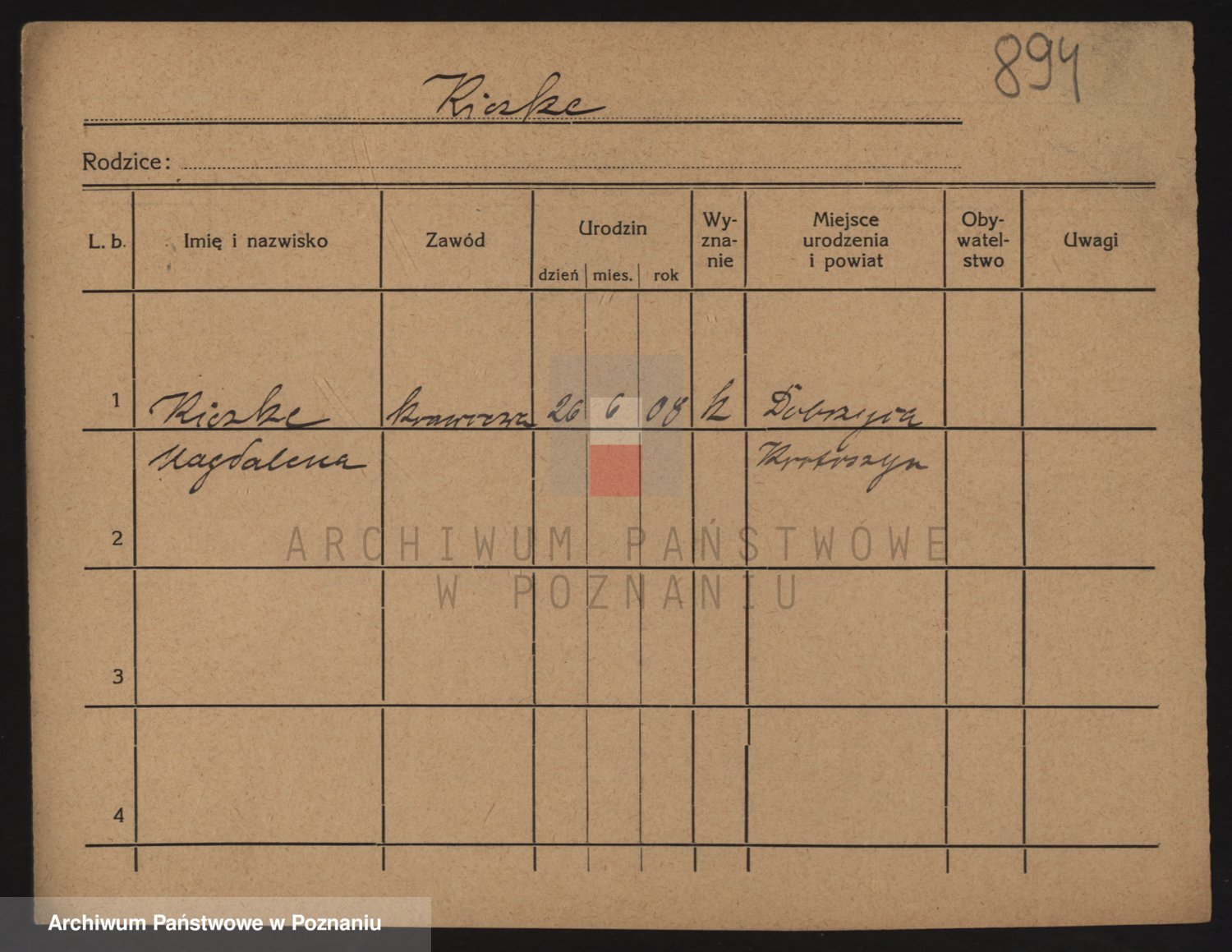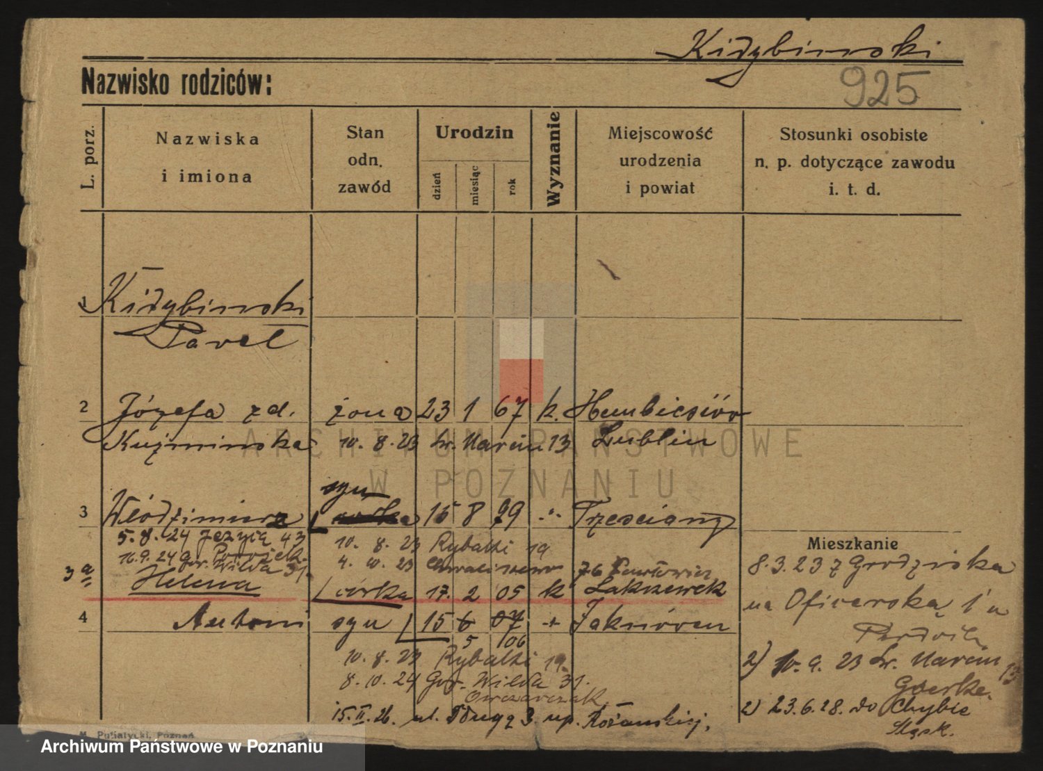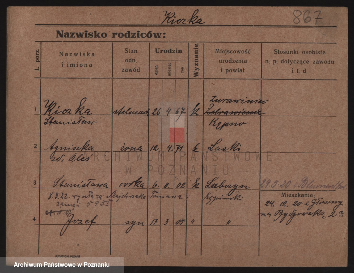 Podgląd karty osobowej dostępny jest po kliknięciu na nazwisko lub ikonkę karty. Można dokonywać powiększenia (ikony na górze) lub przechodzić między kolejnymi skanami (strzałki po bokach).