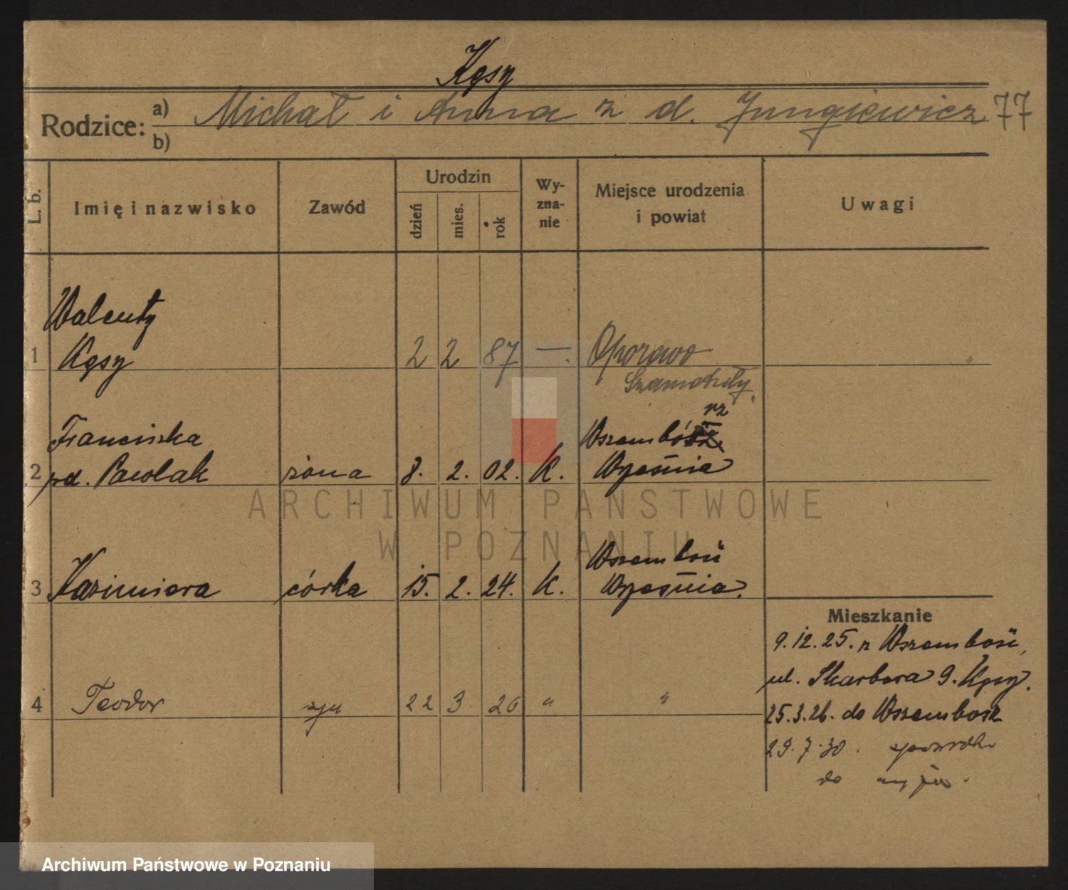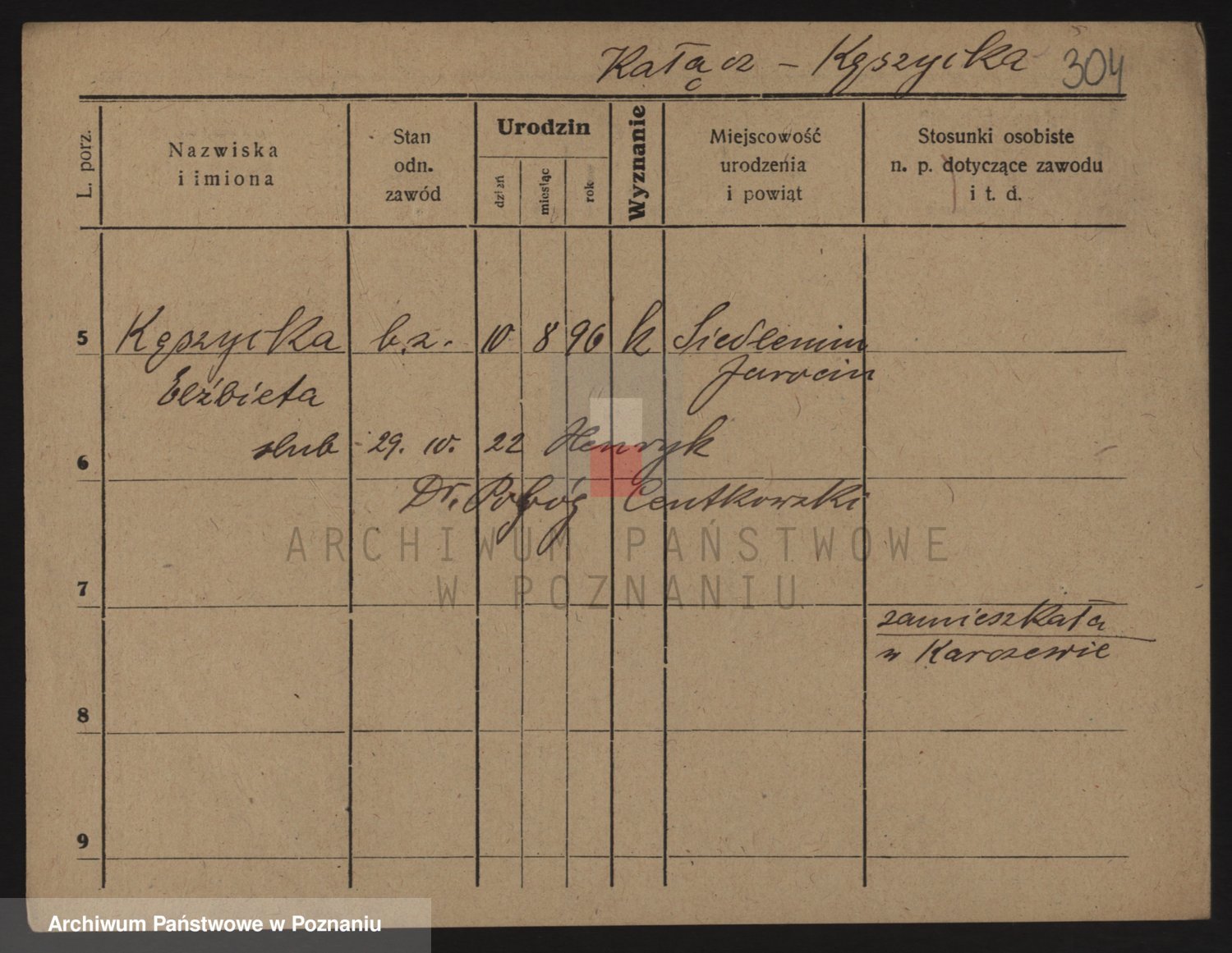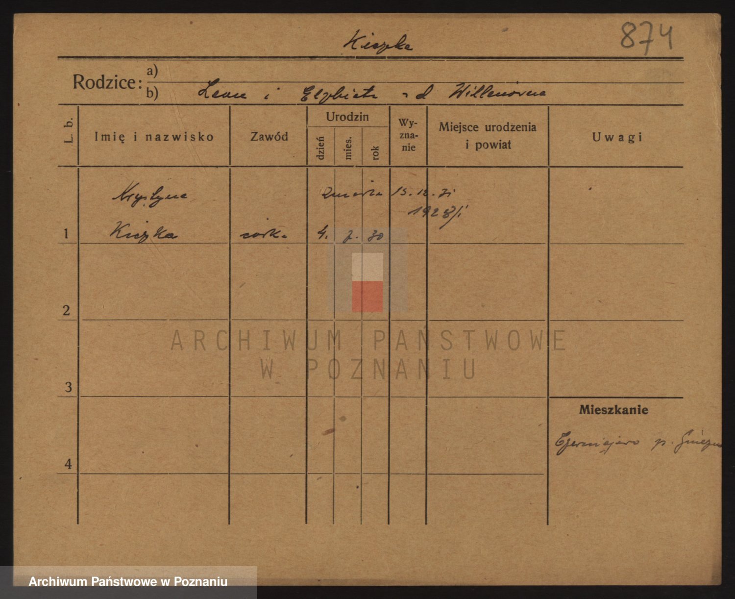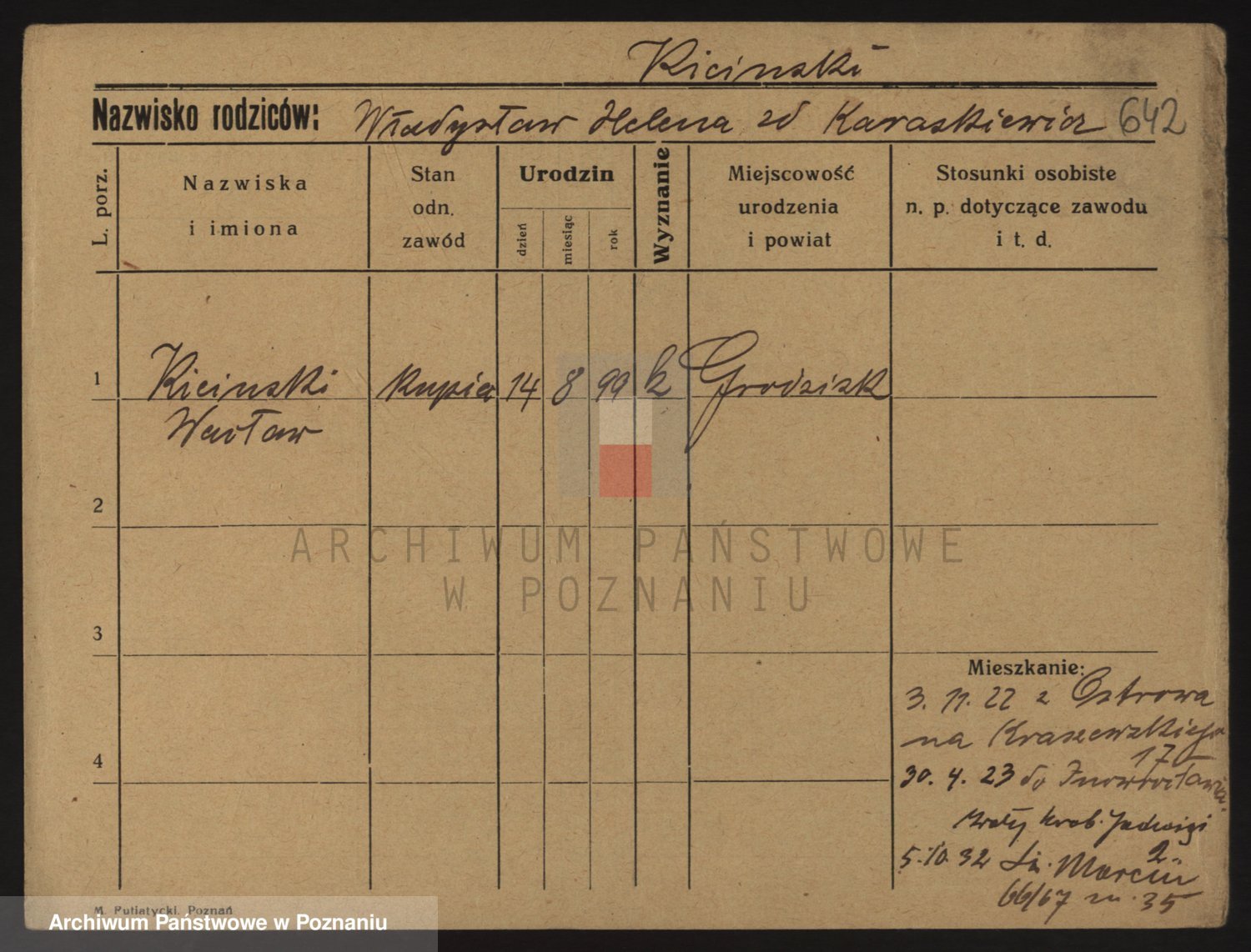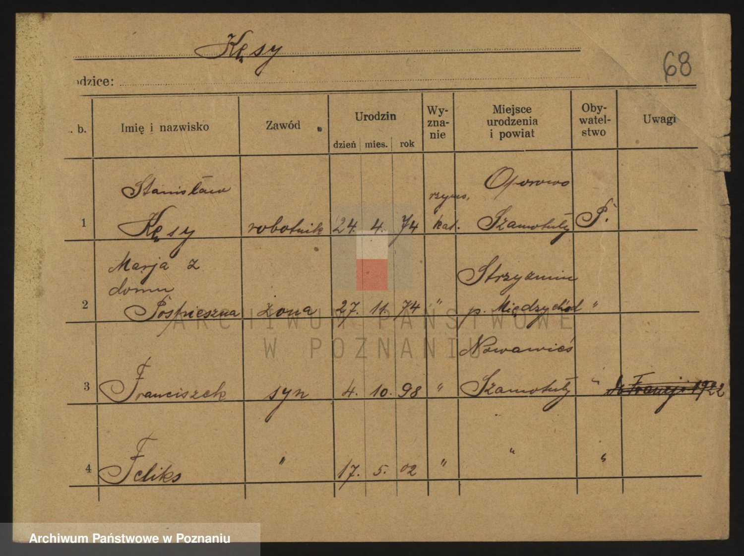 Podgląd karty osobowej dostępny jest po kliknięciu na nazwisko lub ikonkę karty. Można dokonywać powiększenia (ikony na górze) lub przechodzić między kolejnymi skanami (strzałki po bokach).
