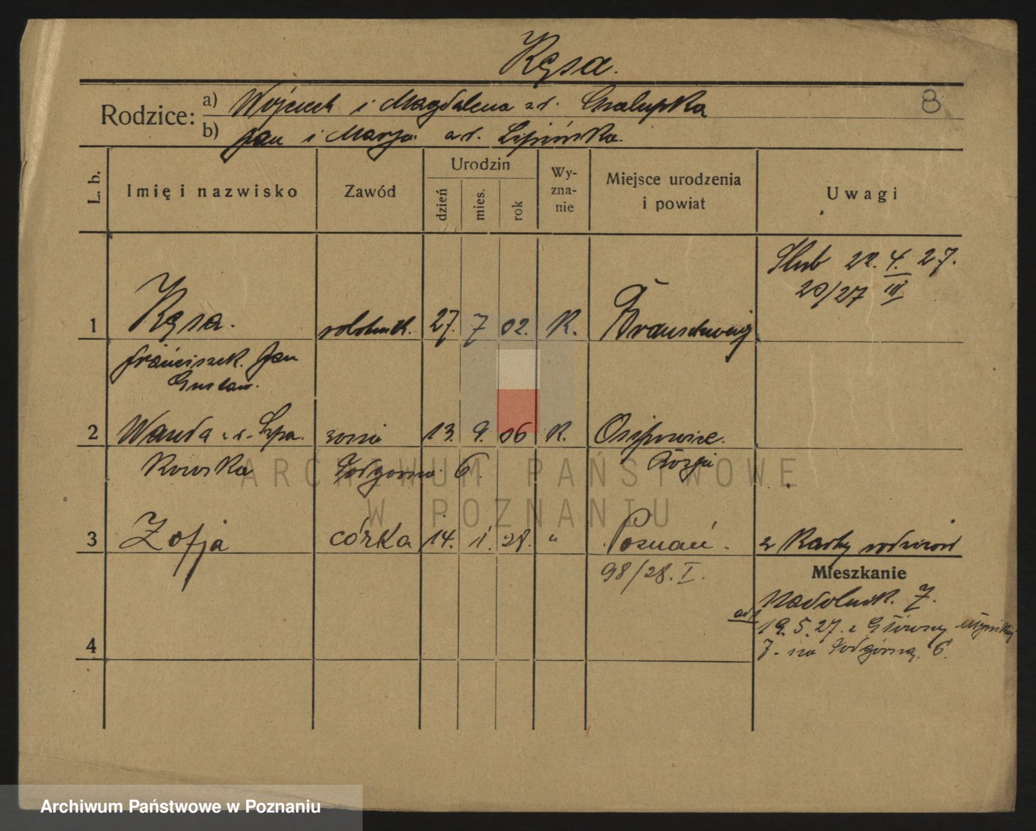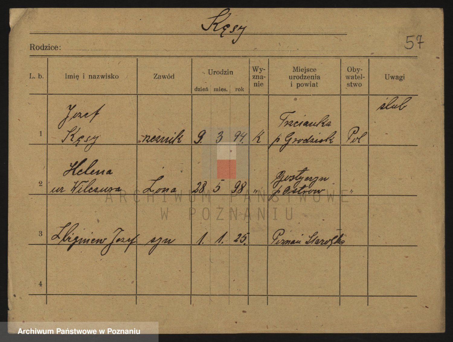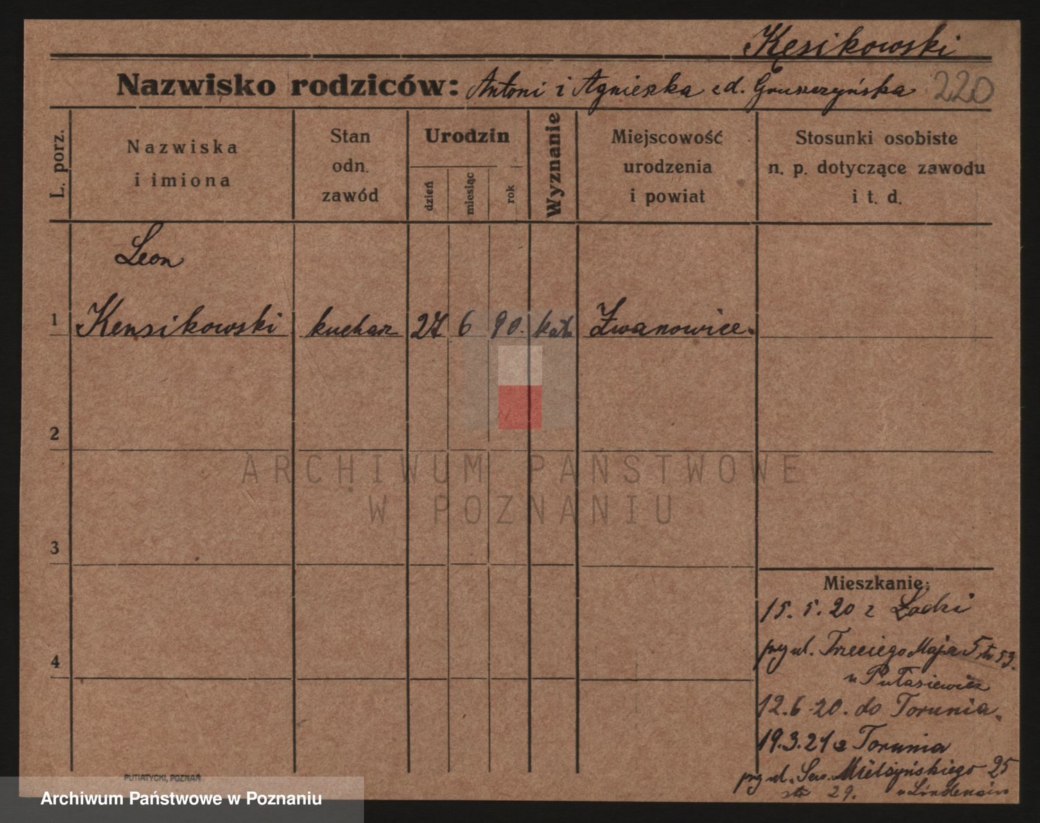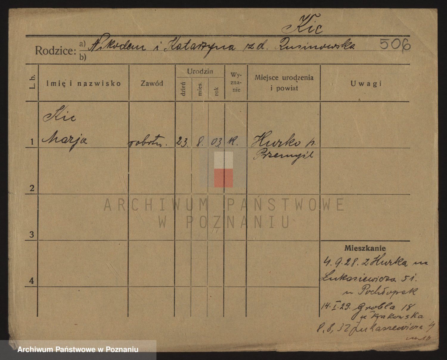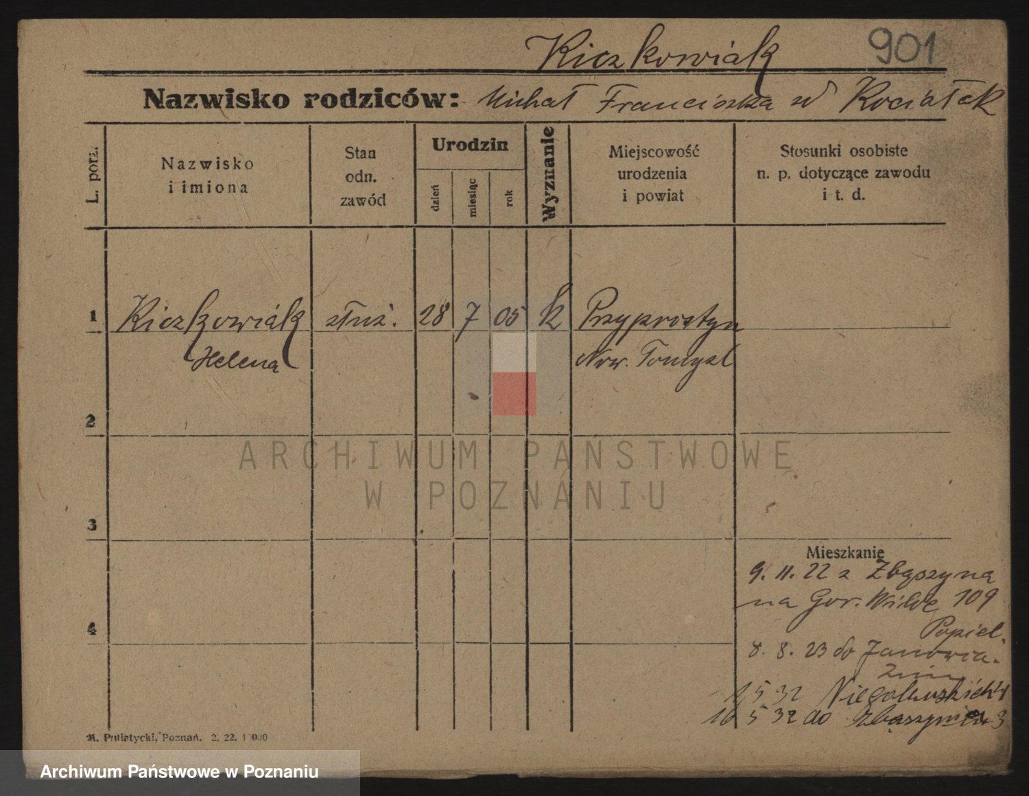 Podgląd karty osobowej dostępny jest po kliknięciu na nazwisko lub ikonkę karty. Można dokonywać powiększenia (ikony na górze) lub przechodzić między kolejnymi skanami (strzałki po bokach).