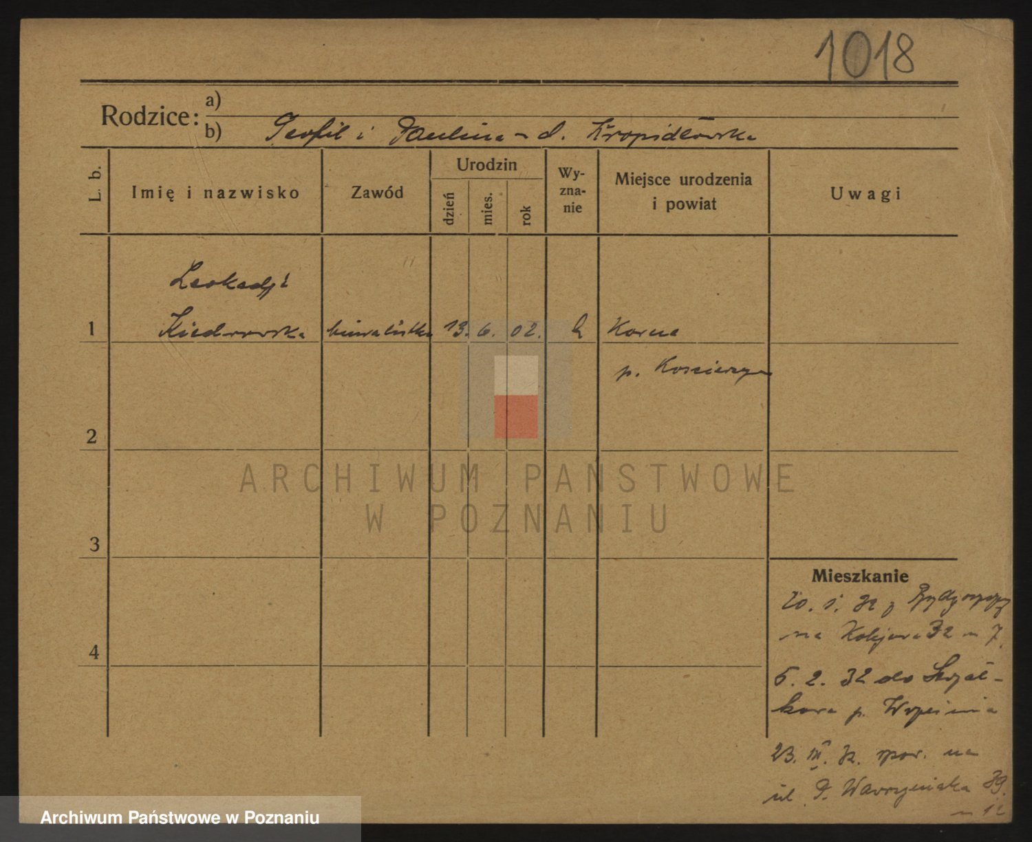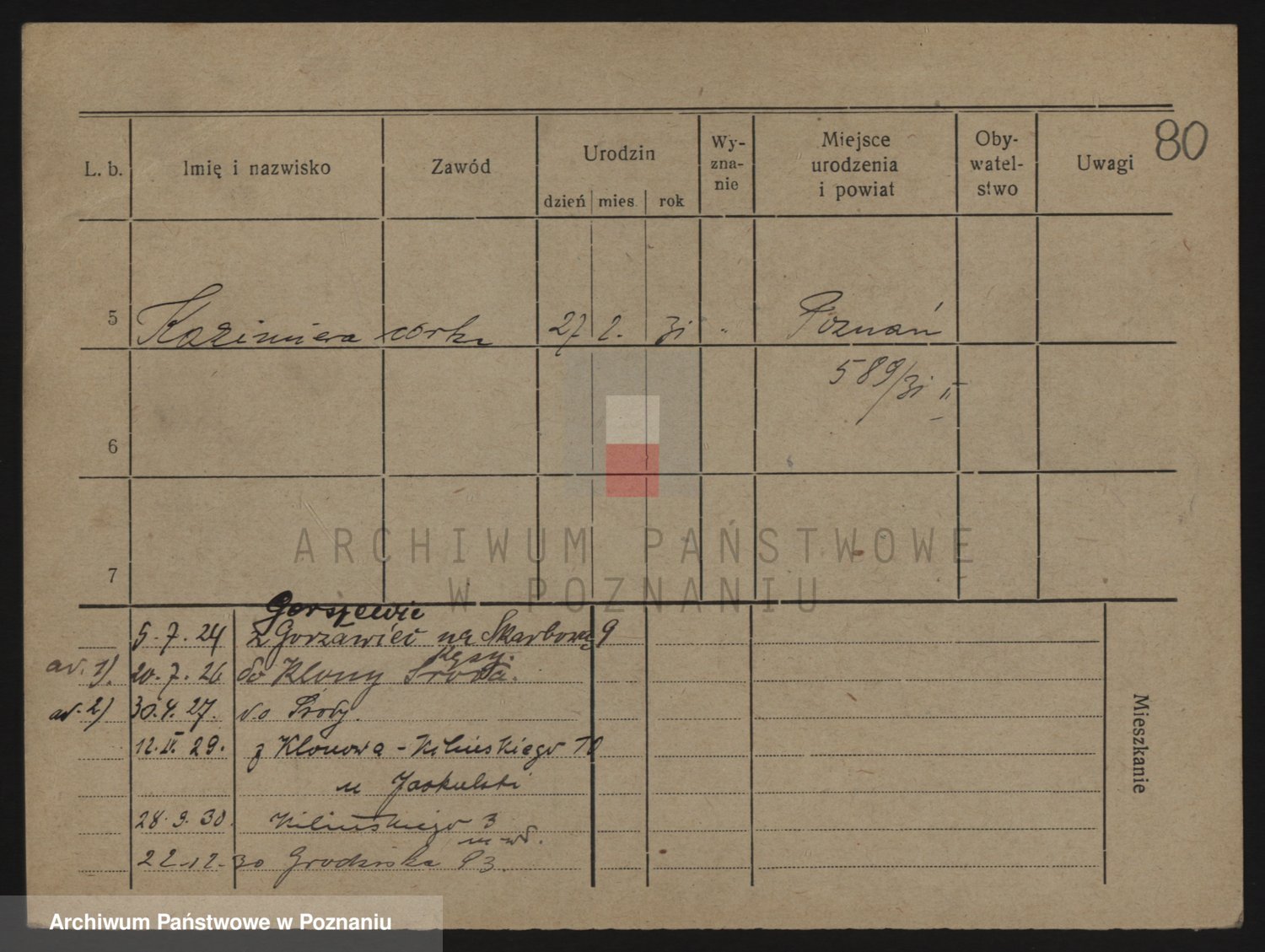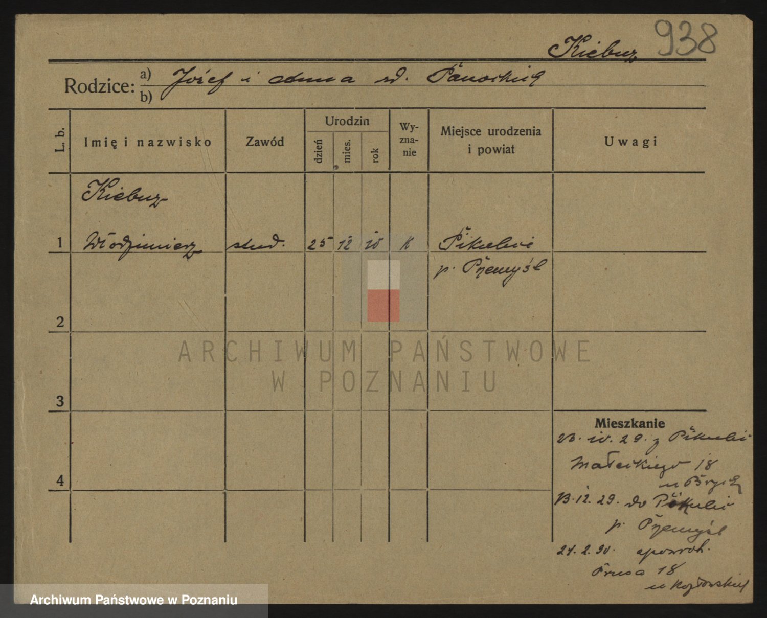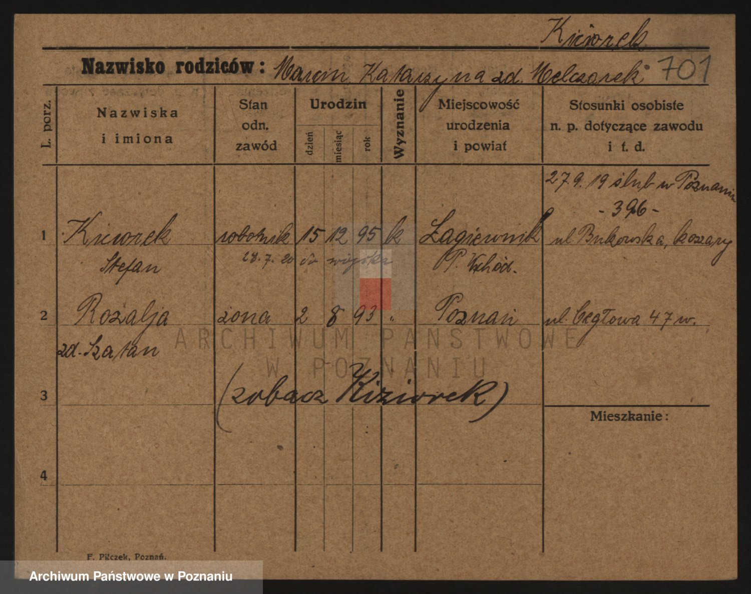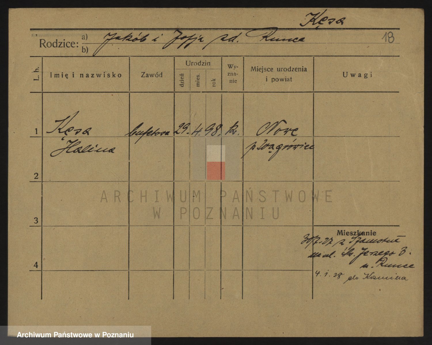 Podgląd karty osobowej dostępny jest po kliknięciu na nazwisko lub ikonkę karty. Można dokonywać powiększenia (ikony na górze) lub przechodzić między kolejnymi skanami (strzałki po bokach).