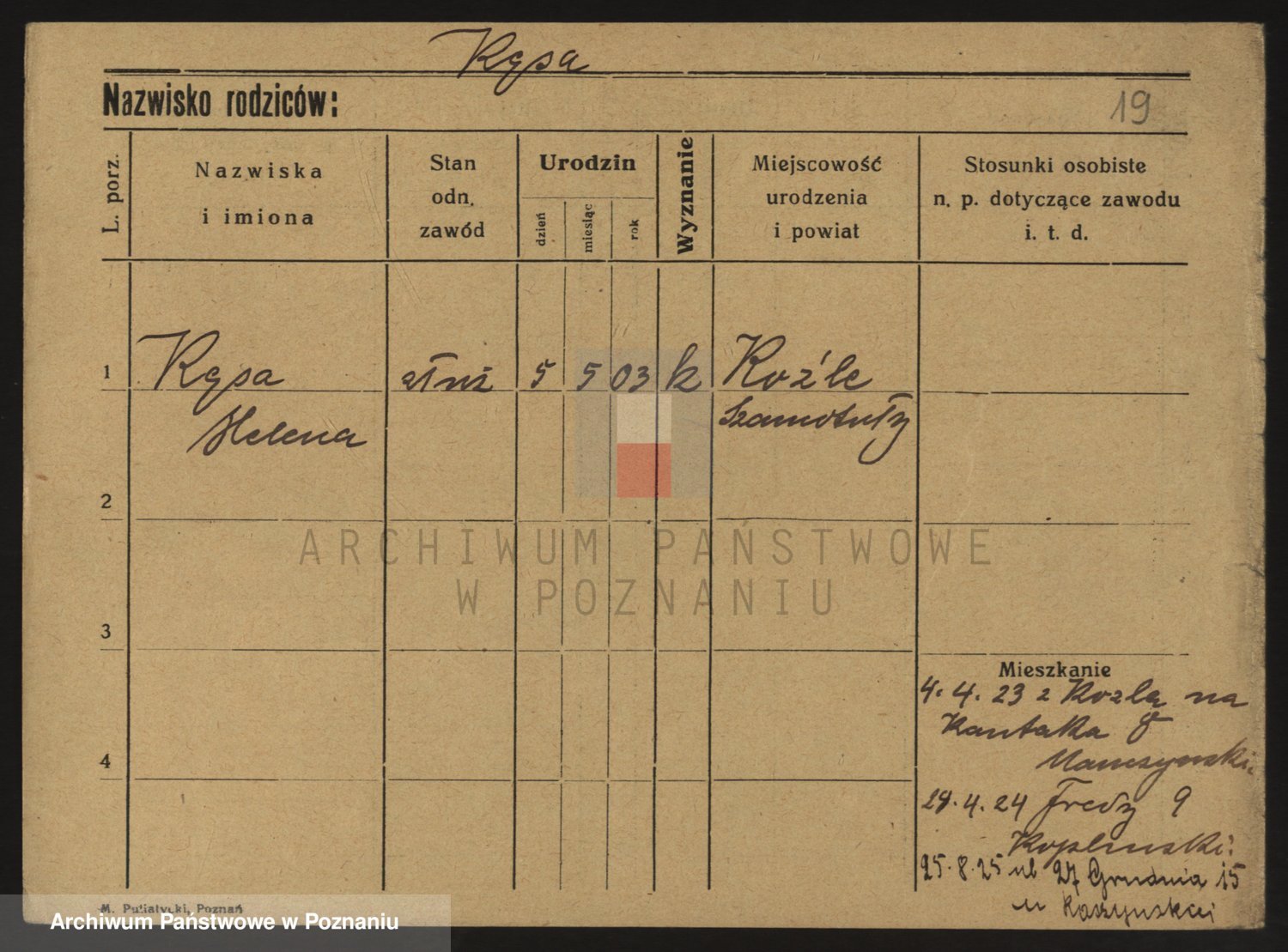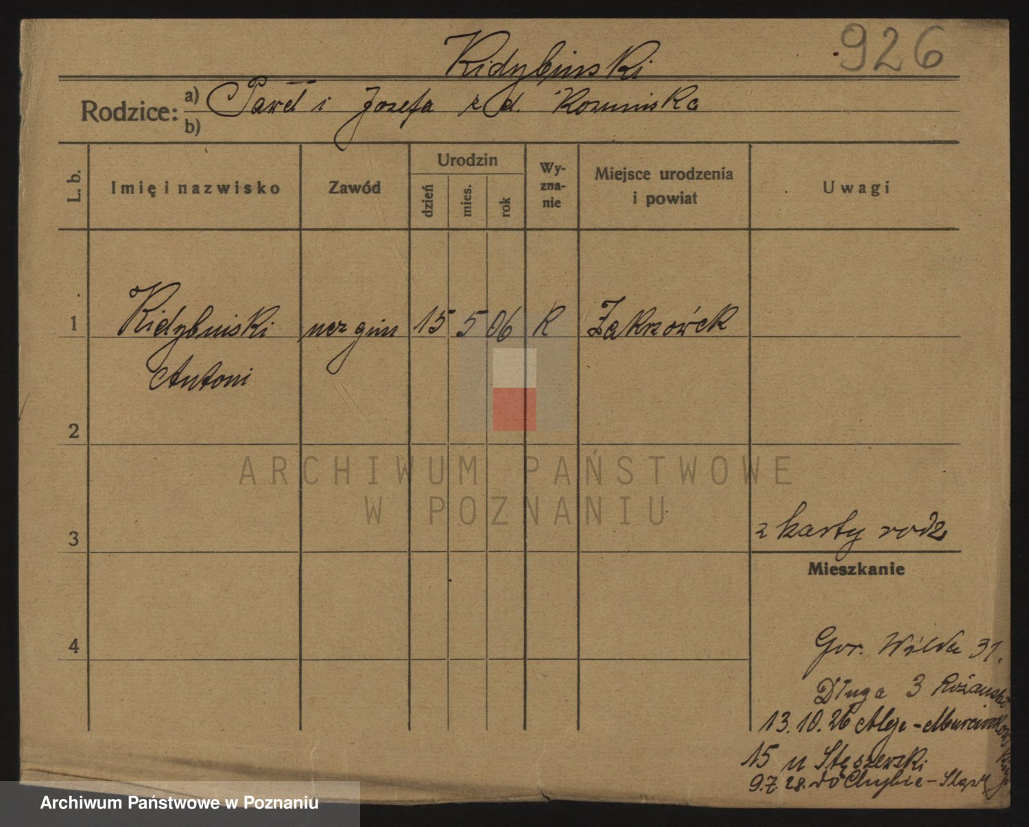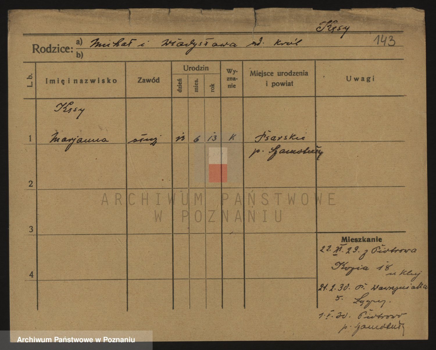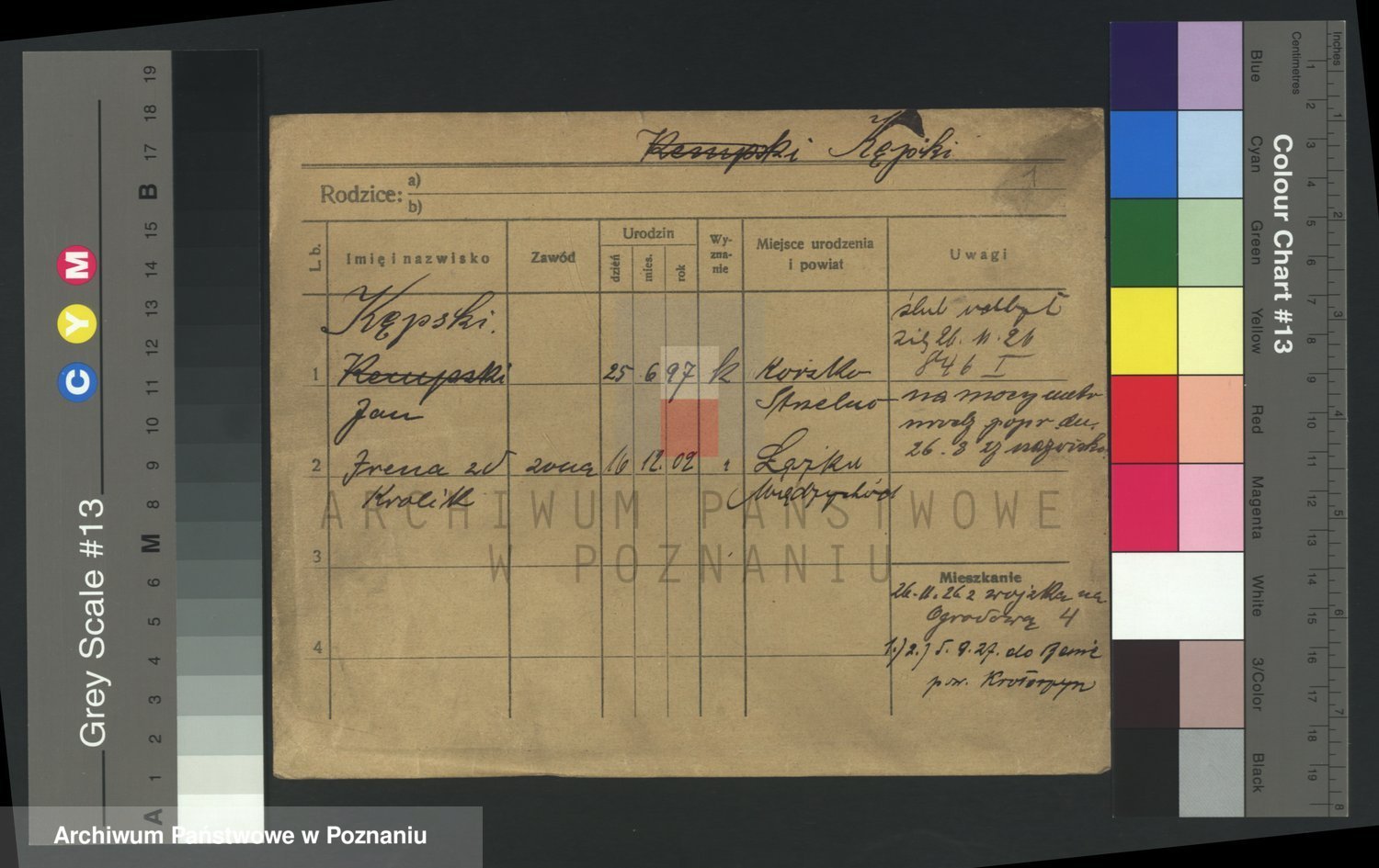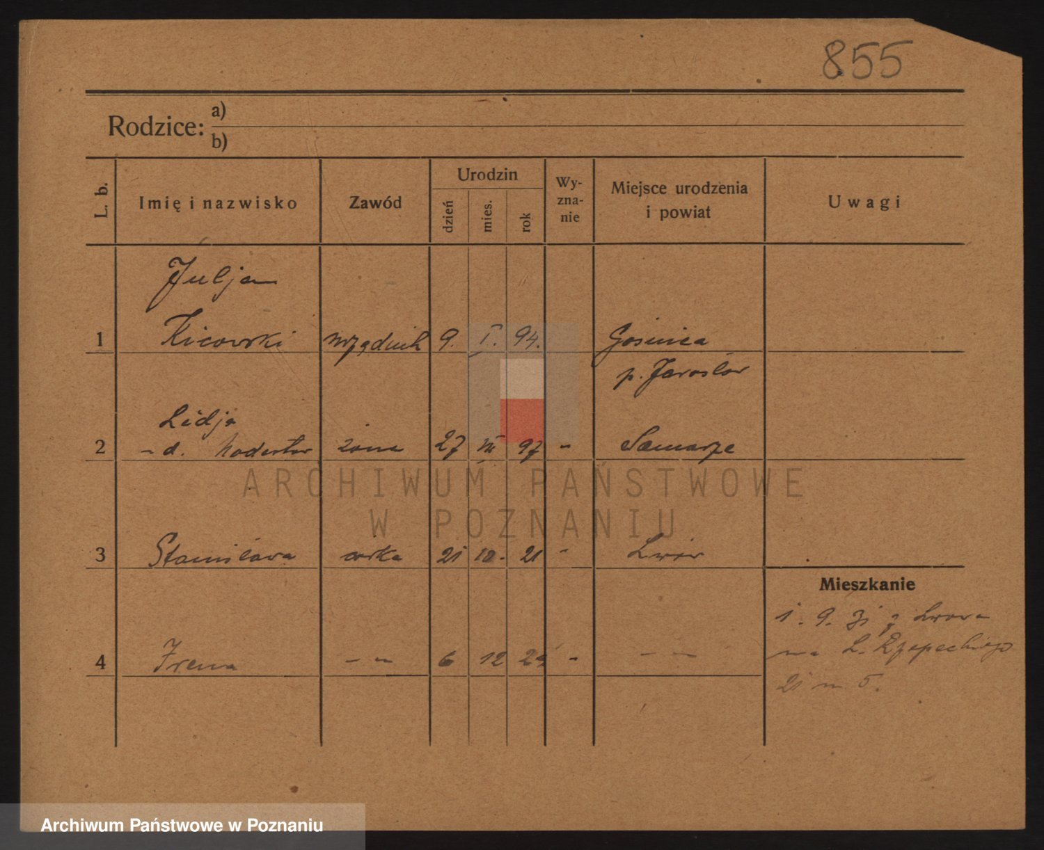 Podgląd karty osobowej dostępny jest po kliknięciu na nazwisko lub ikonkę karty. Można dokonywać powiększenia (ikony na górze) lub przechodzić między kolejnymi skanami (strzałki po bokach).