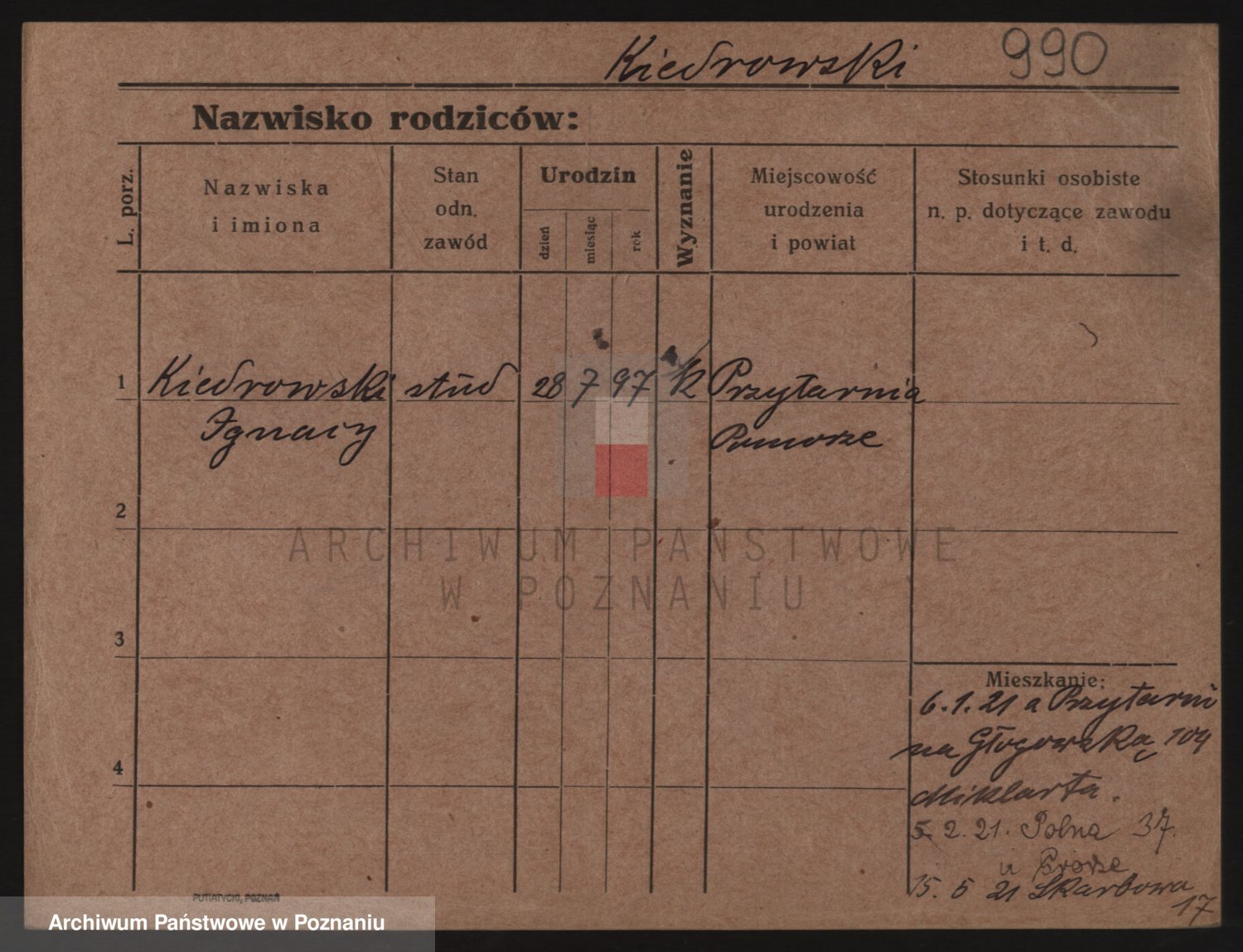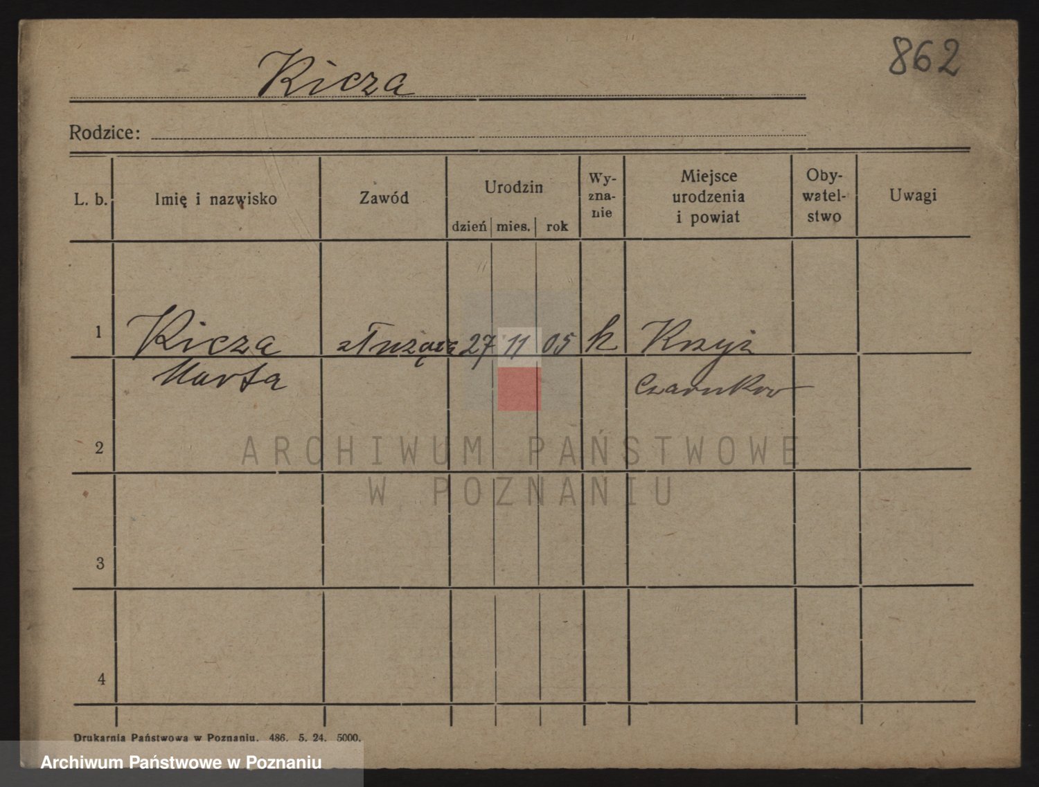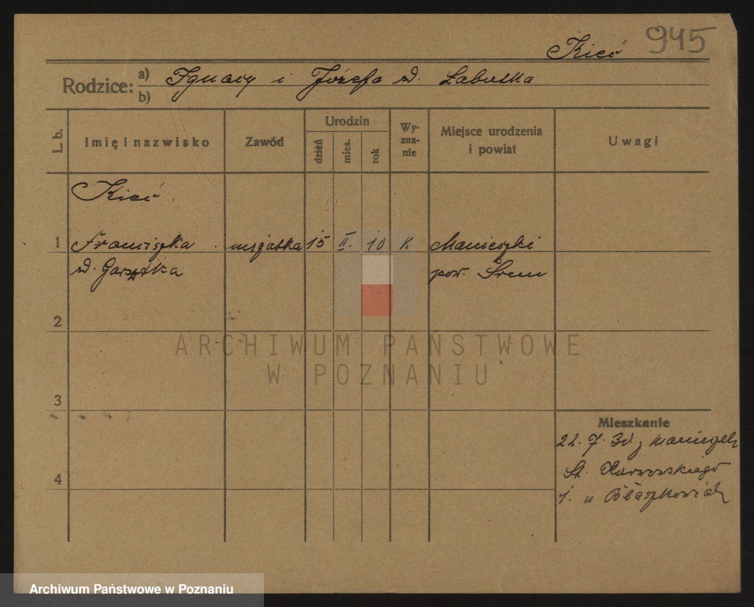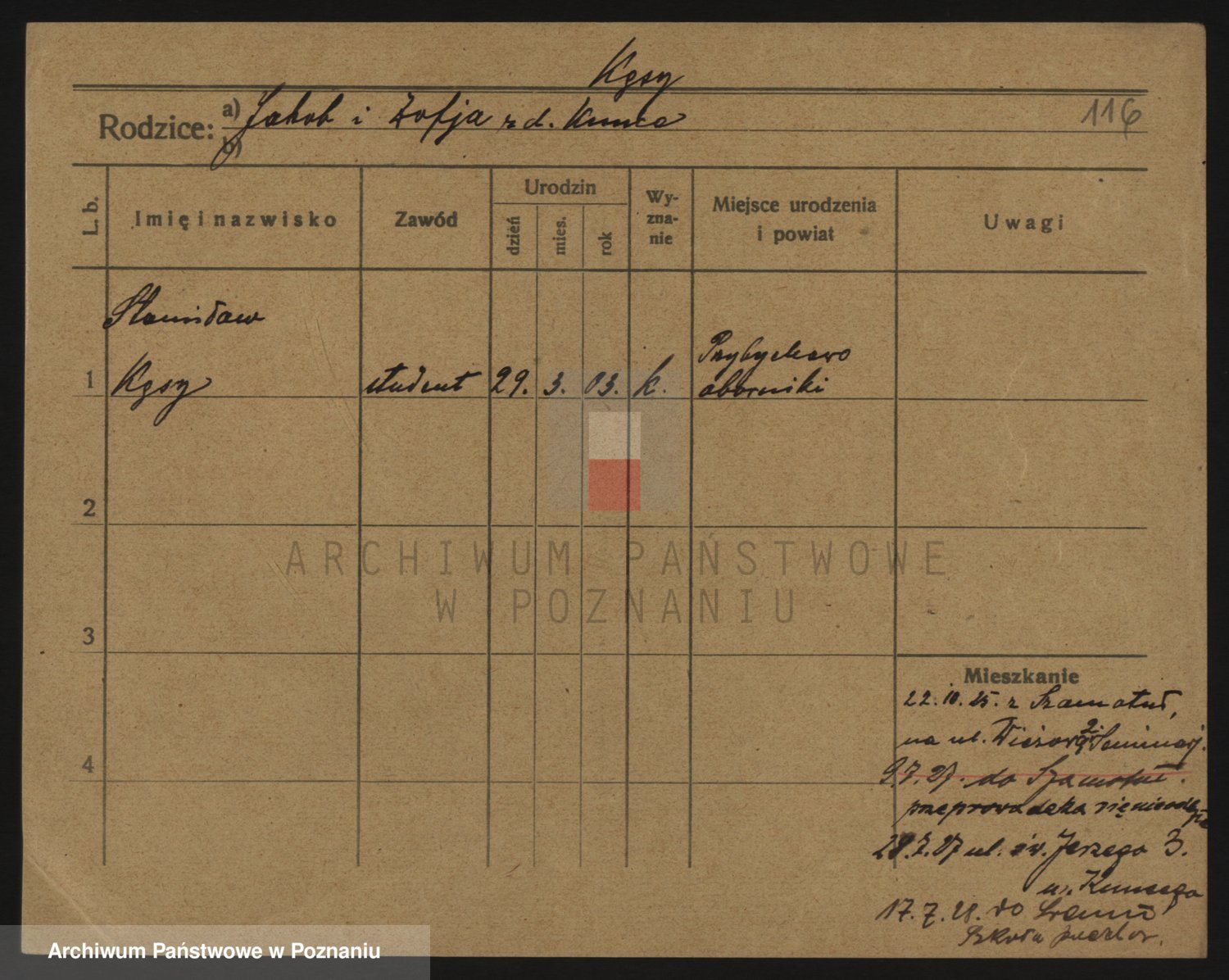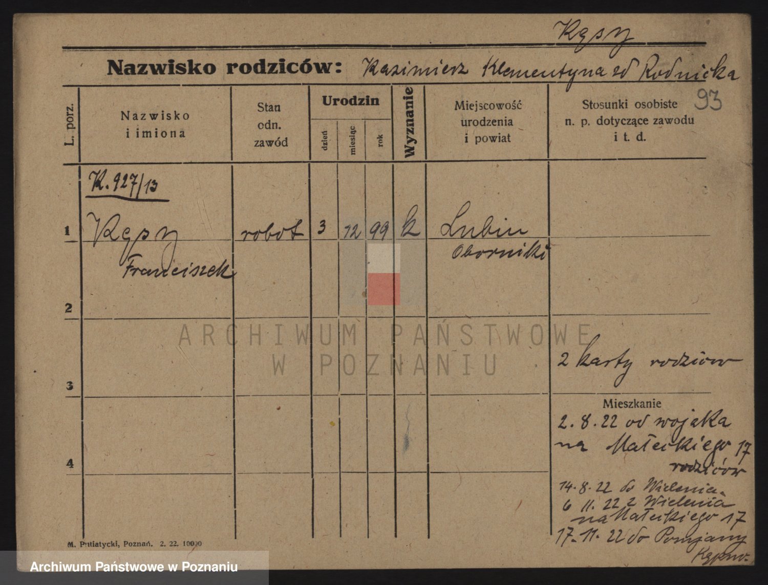 Podgląd karty osobowej dostępny jest po kliknięciu na nazwisko lub ikonkę karty. Można dokonywać powiększenia (ikony na górze) lub przechodzić między kolejnymi skanami (strzałki po bokach).