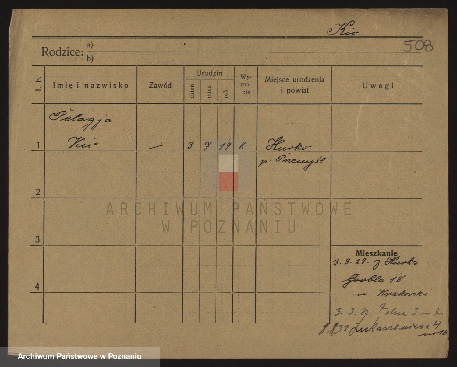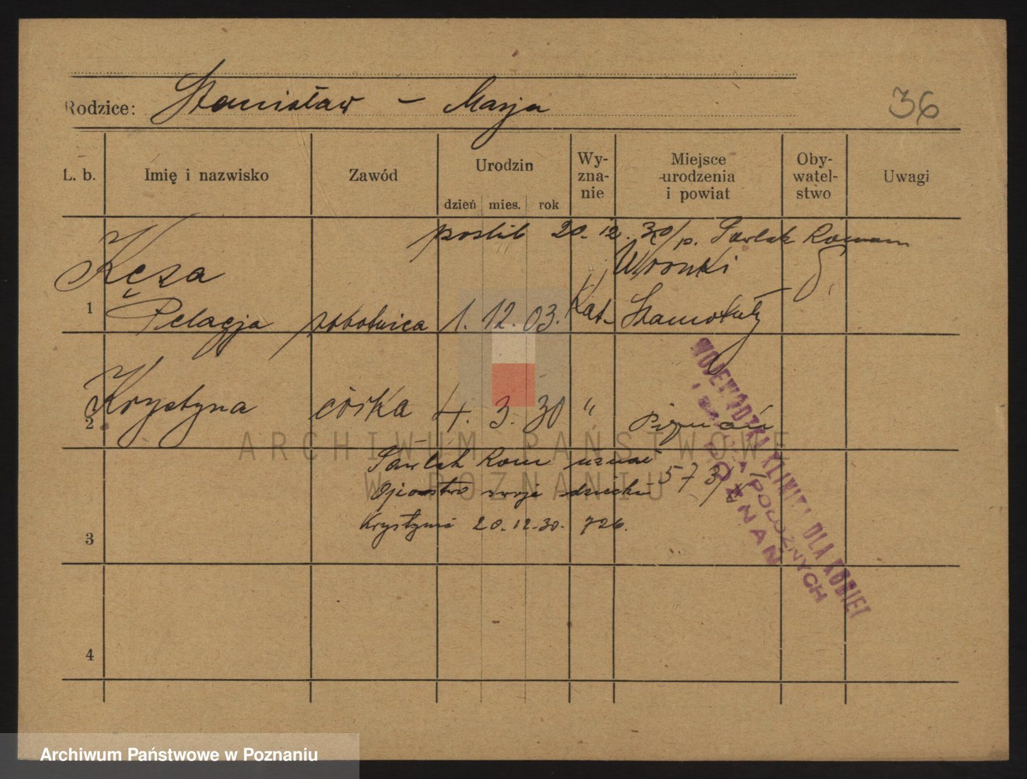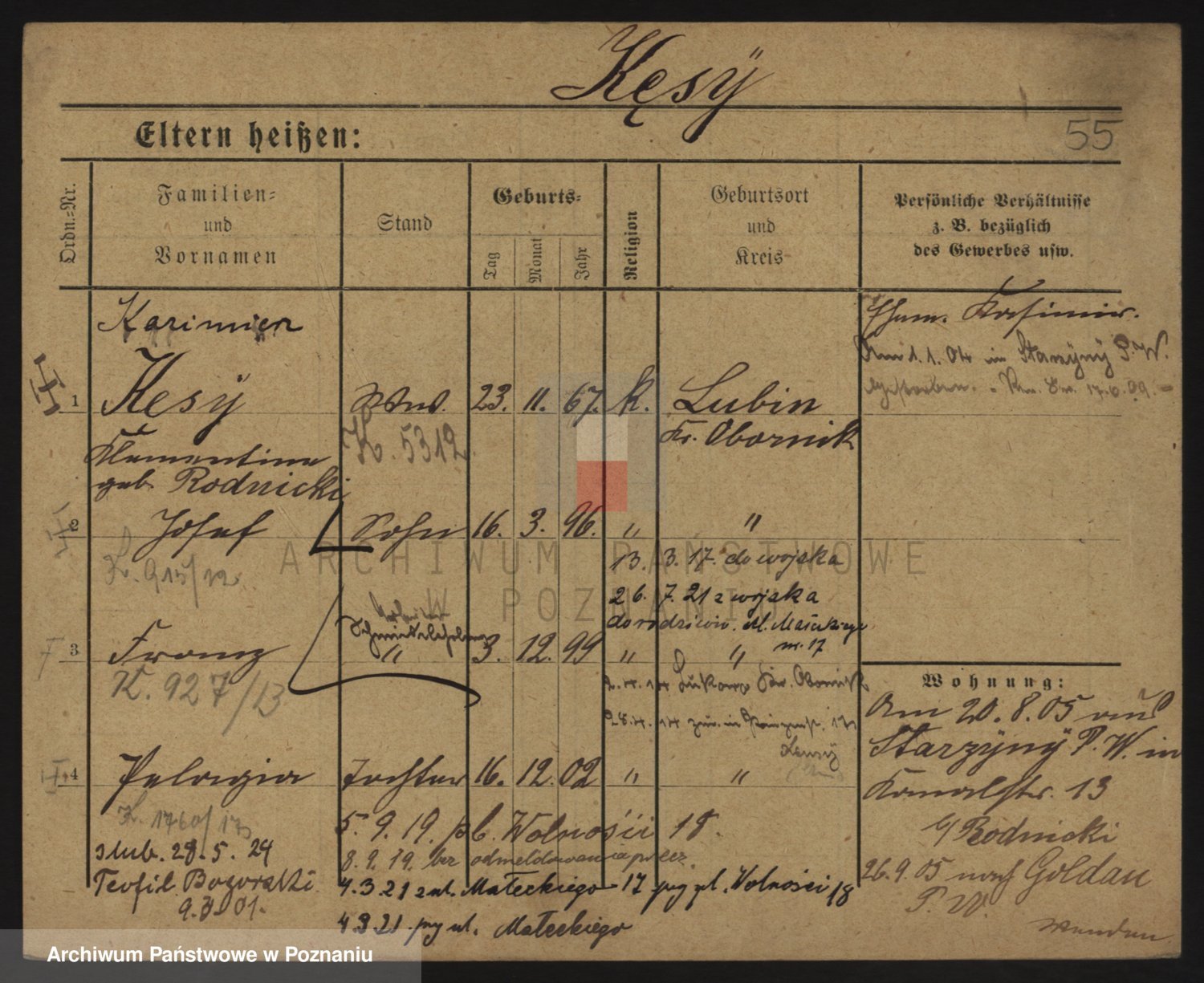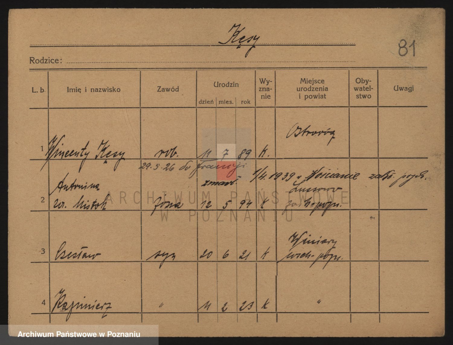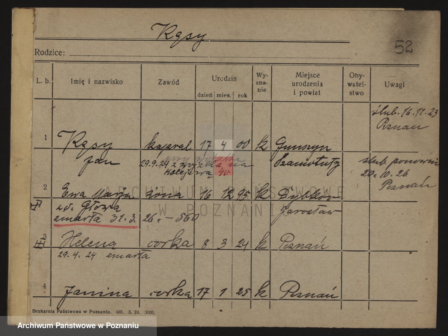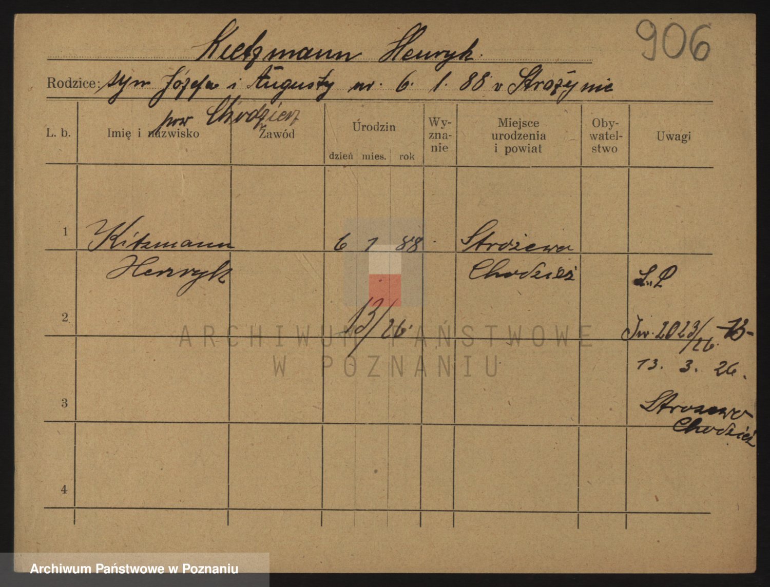Podgląd karty osobowej dostępny jest po kliknięciu na nazwisko lub ikonkę karty. Można dokonywać powiększenia (ikony na górze) lub przechodzić między kolejnymi skanami (strzałki po bokach).