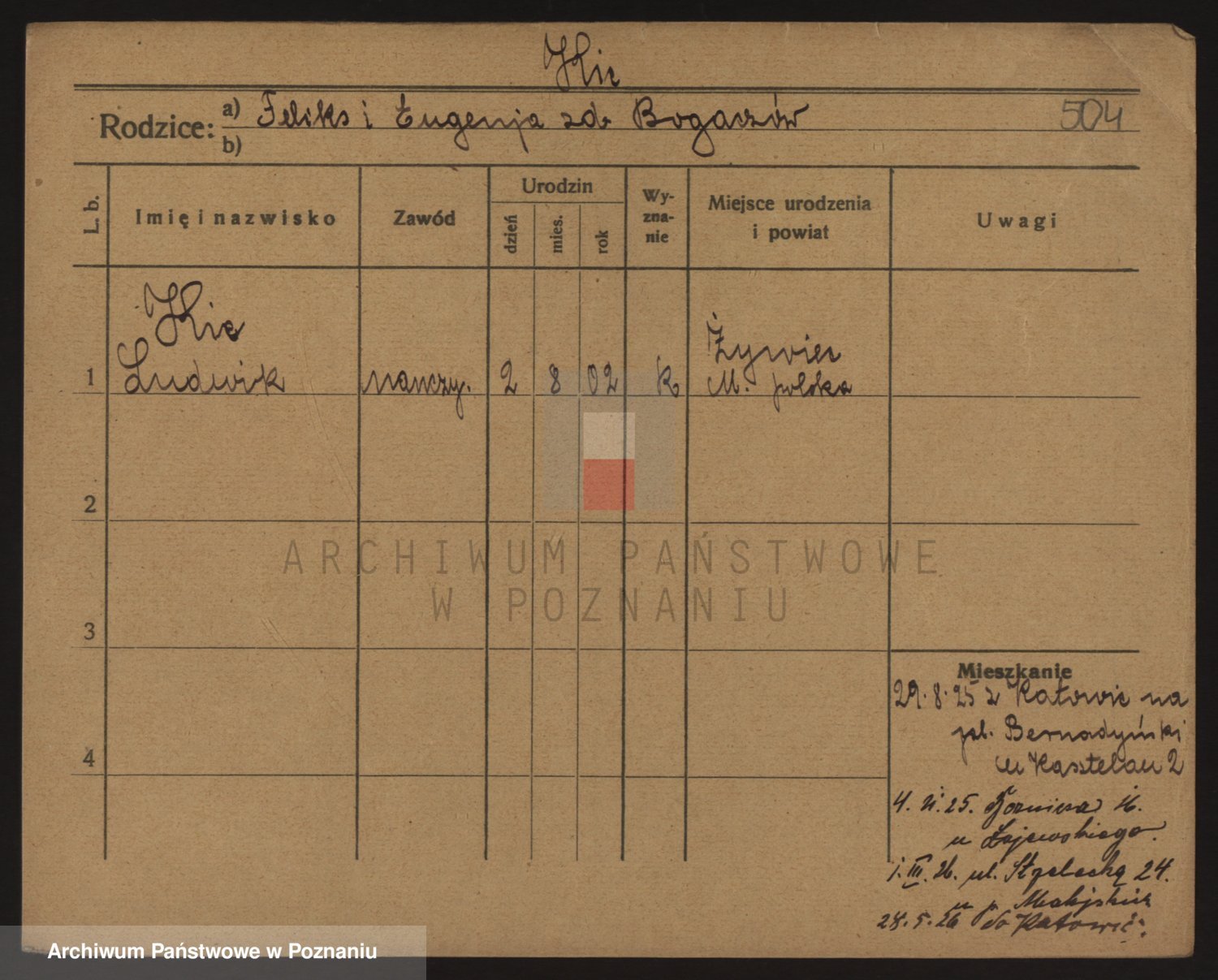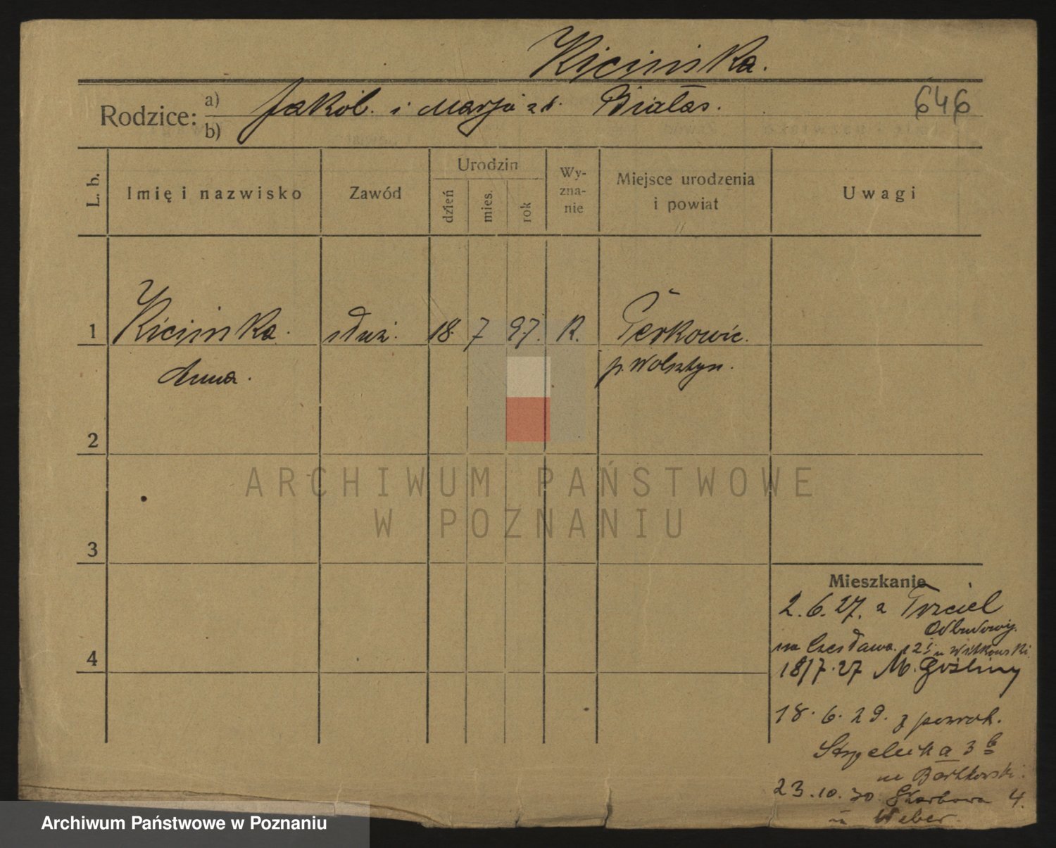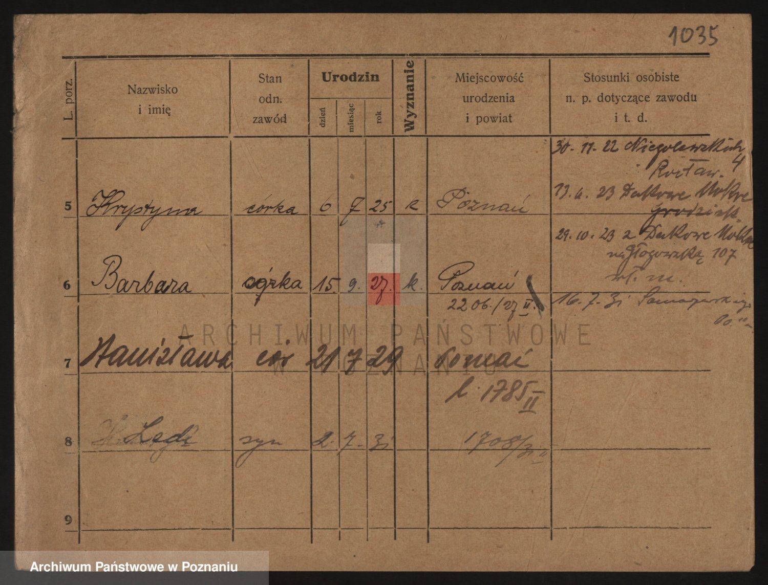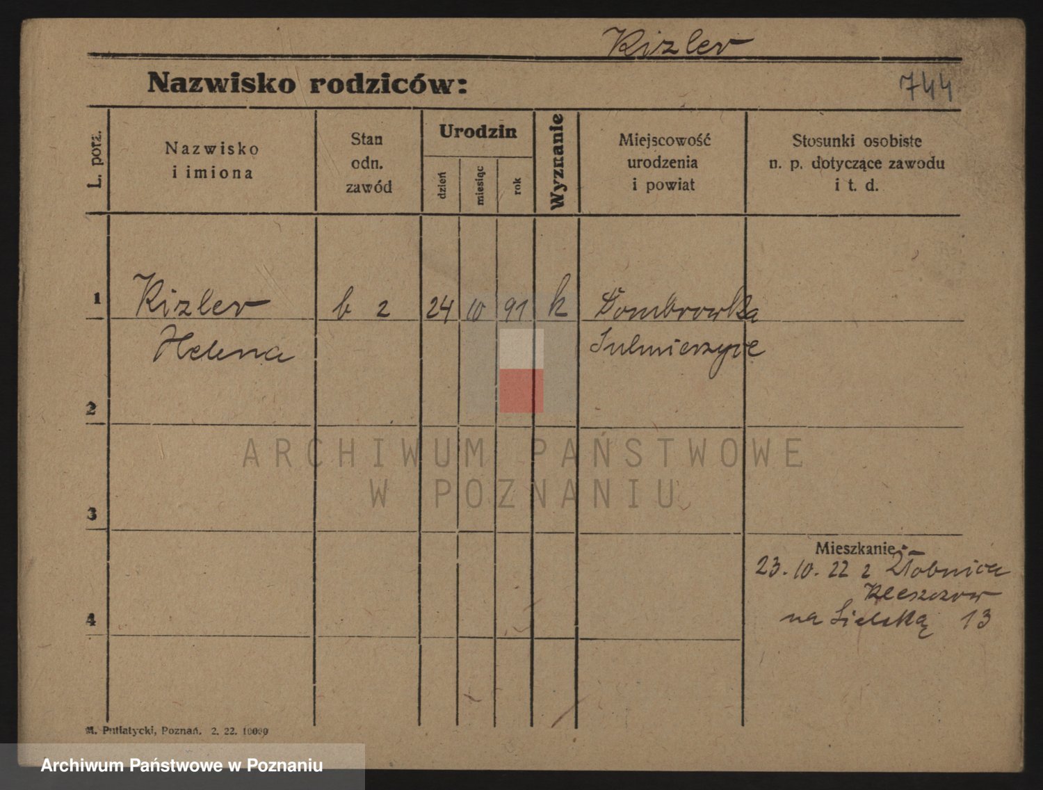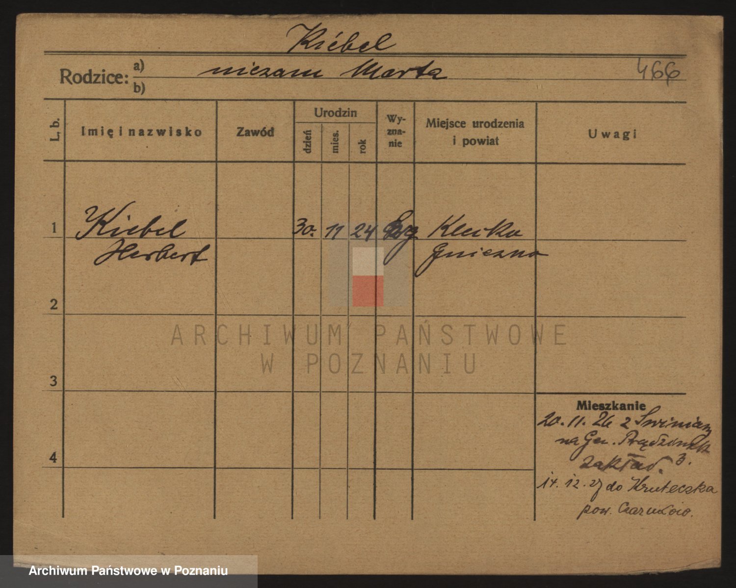Podgląd karty osobowej dostępny jest po kliknięciu na nazwisko lub ikonkę karty. Można dokonywać powiększenia (ikony na górze) lub przechodzić między kolejnymi skanami (strzałki po bokach).