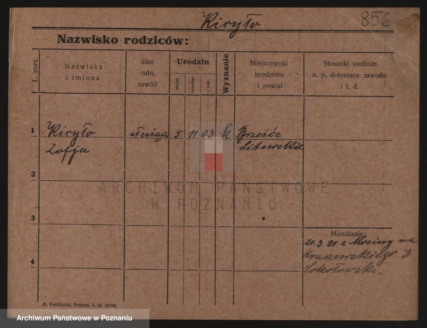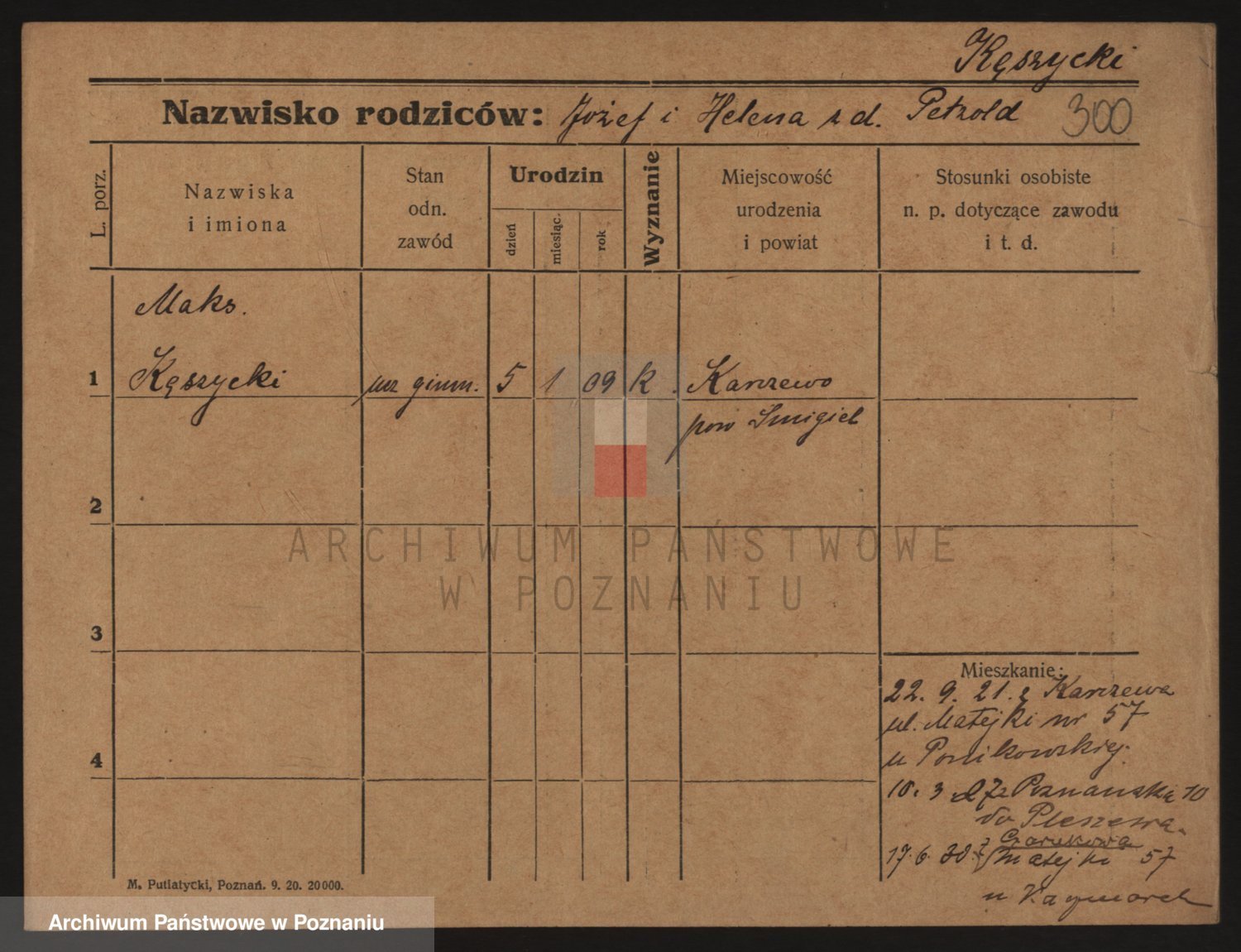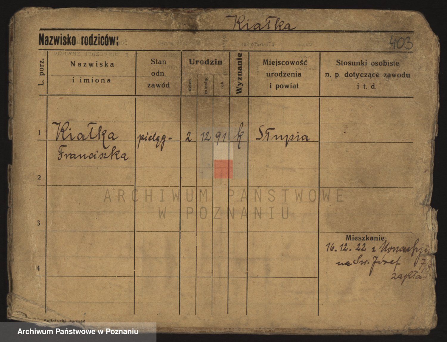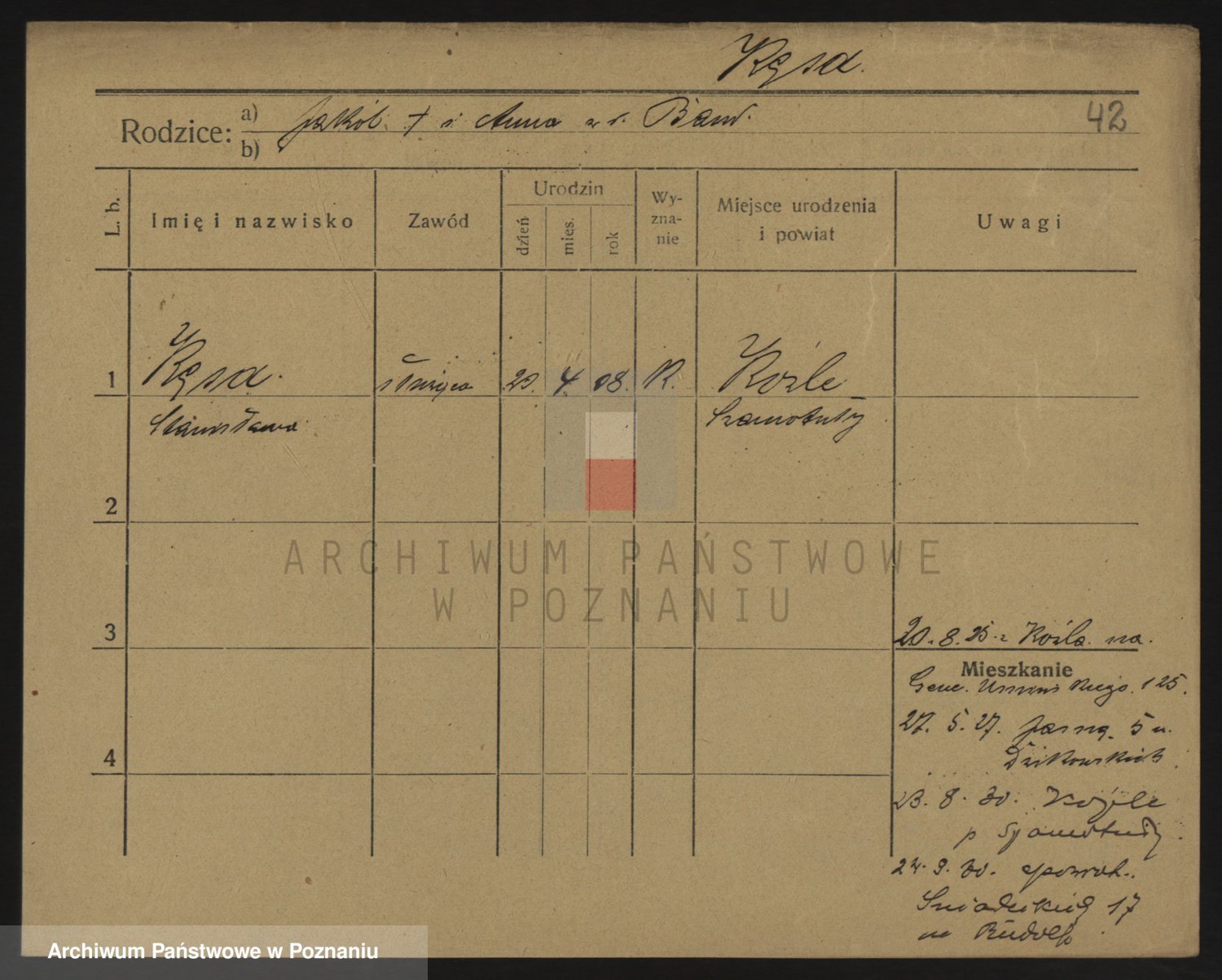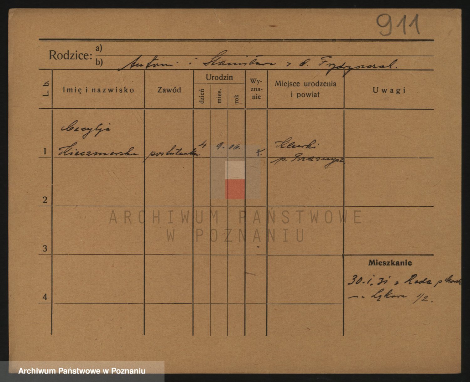 Podgląd karty osobowej dostępny jest po kliknięciu na nazwisko lub ikonkę karty. Można dokonywać powiększenia (ikony na górze) lub przechodzić między kolejnymi skanami (strzałki po bokach).