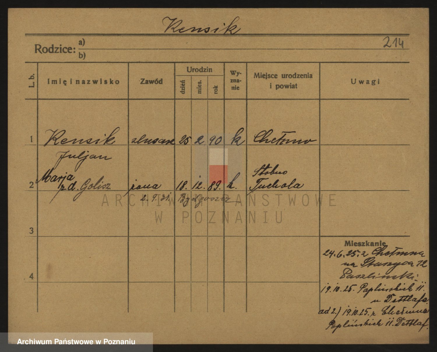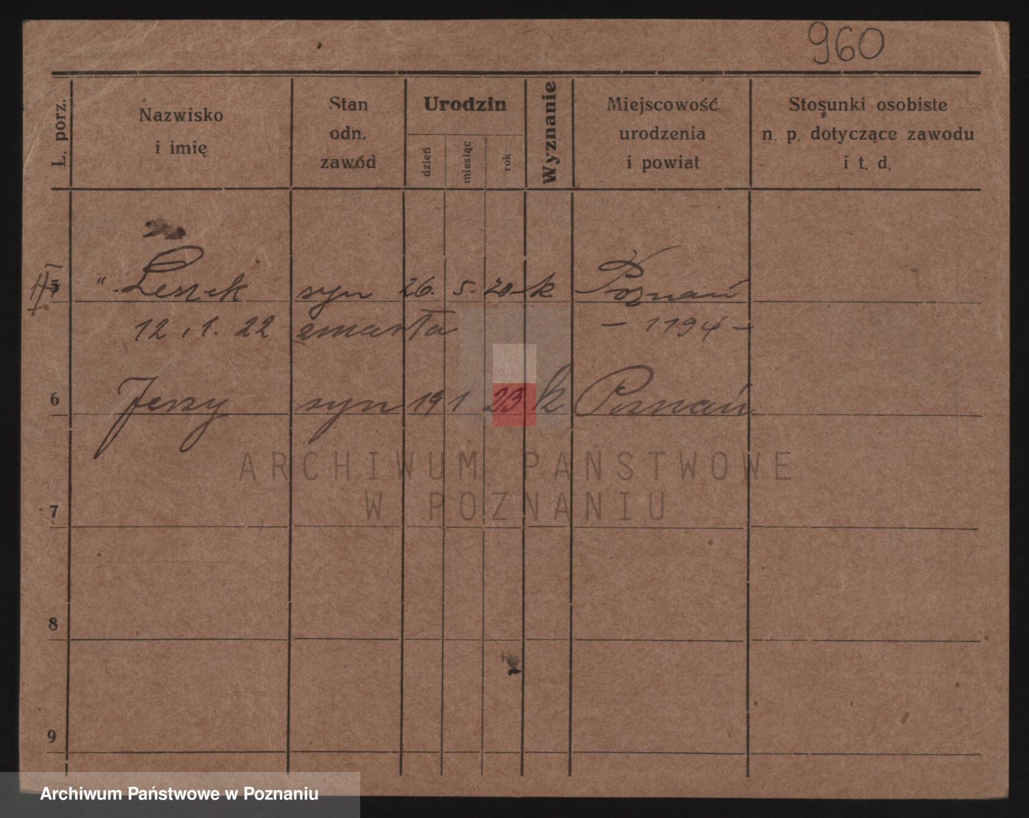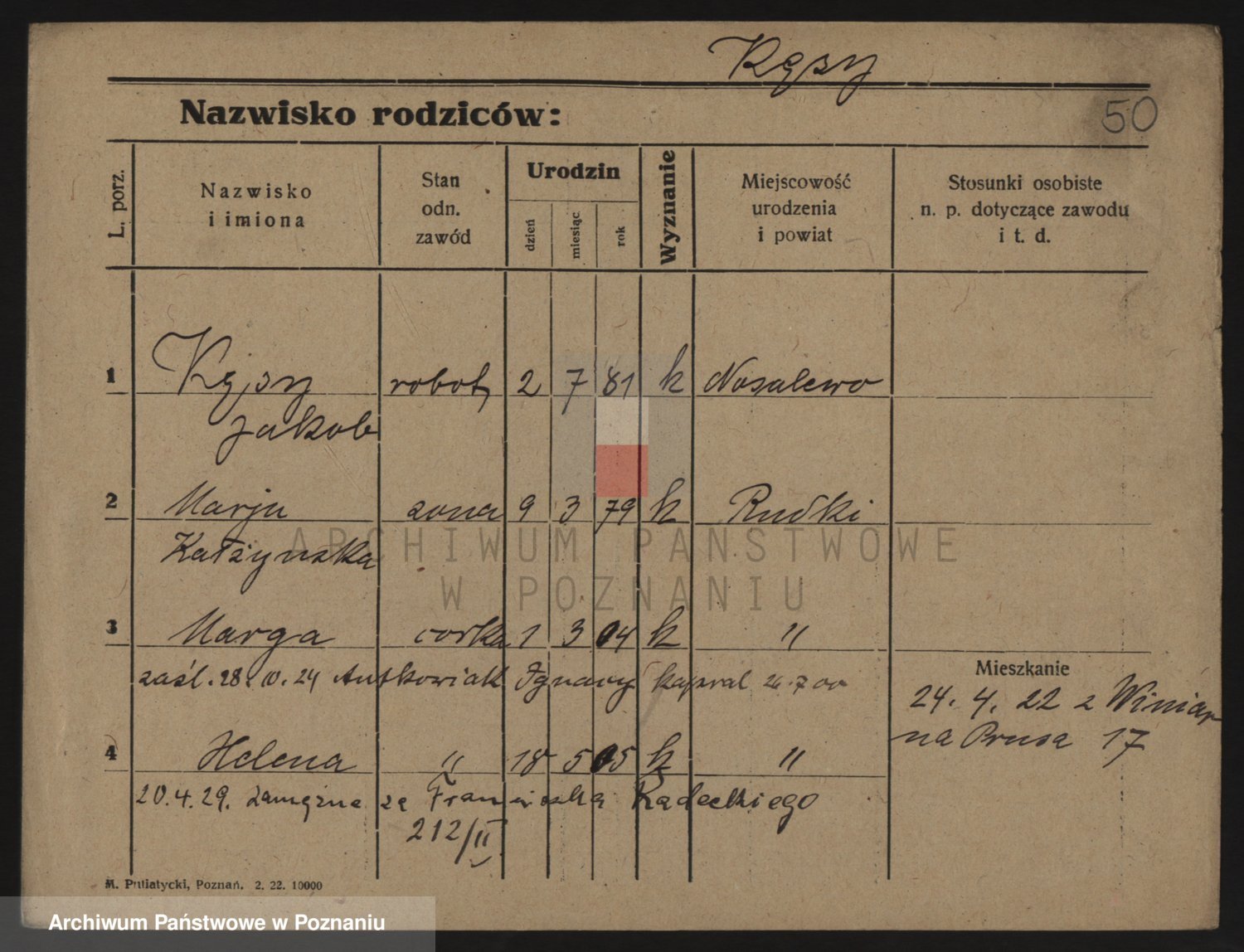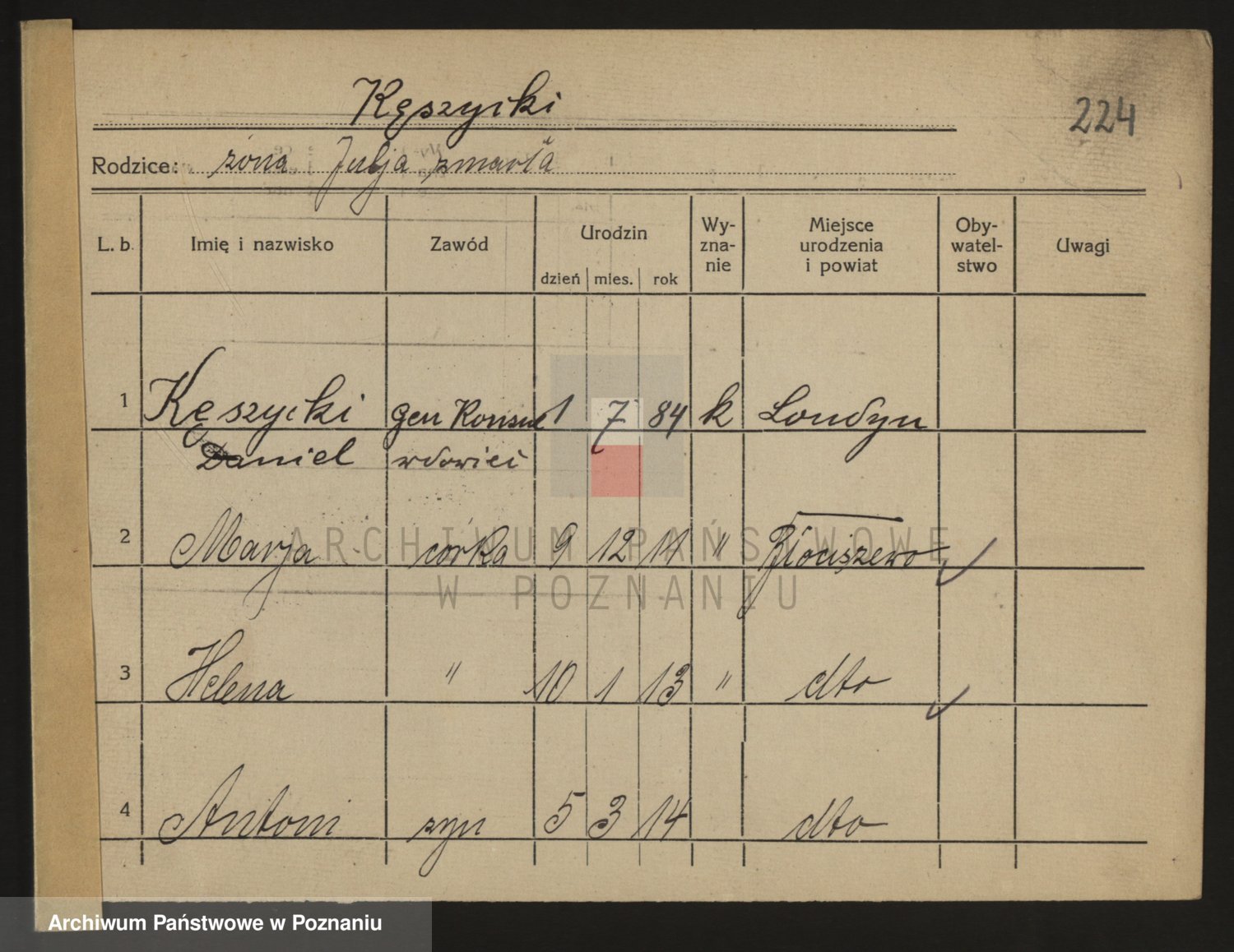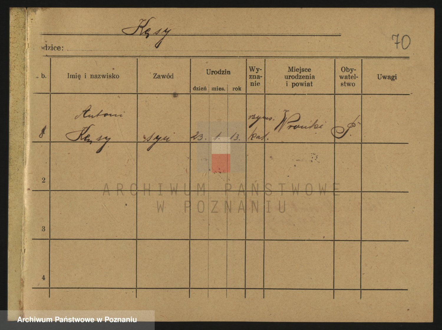 Podgląd karty osobowej dostępny jest po kliknięciu na nazwisko lub ikonkę karty. Można dokonywać powiększenia (ikony na górze) lub przechodzić między kolejnymi skanami (strzałki po bokach).