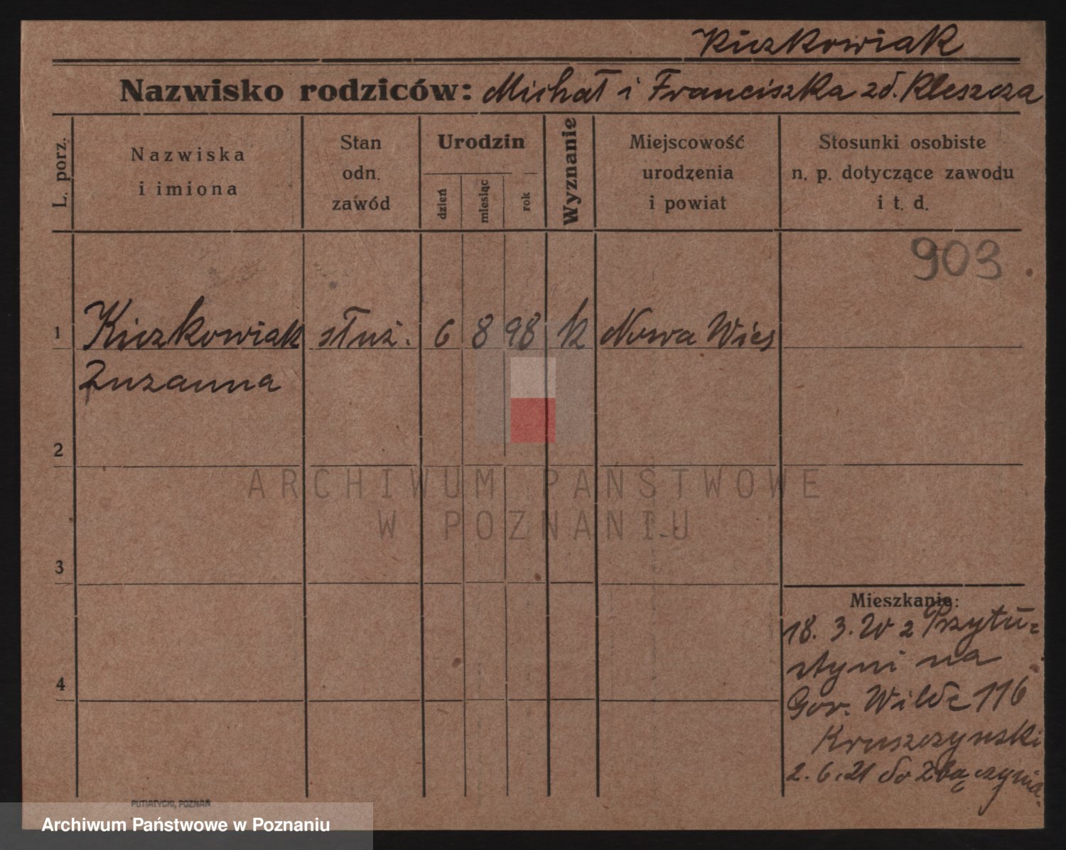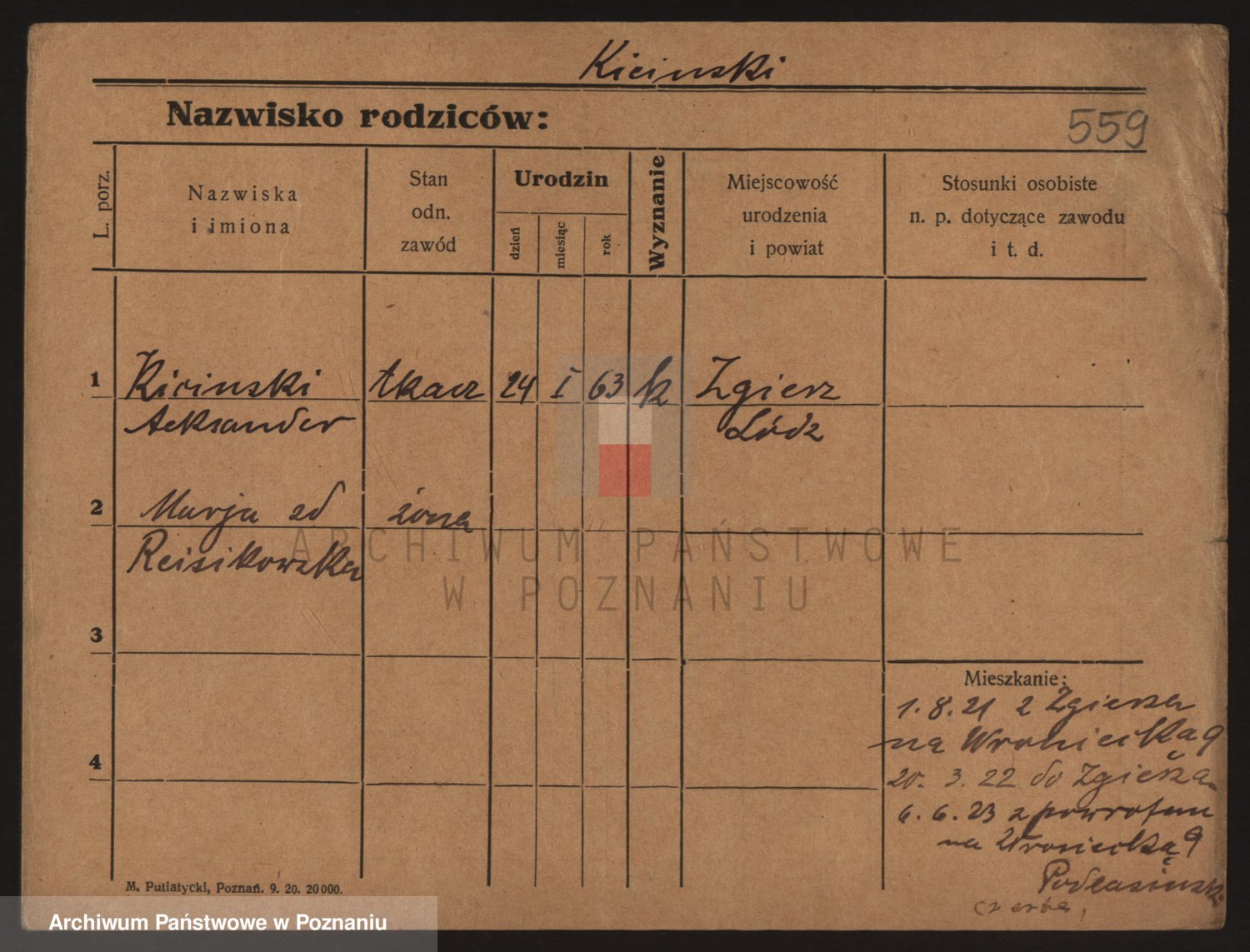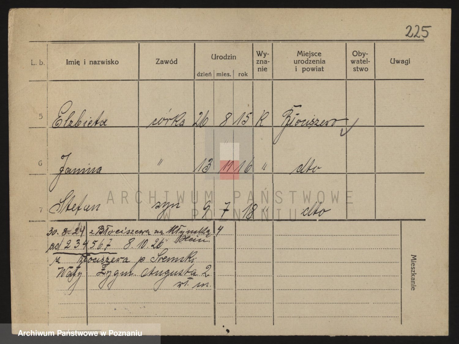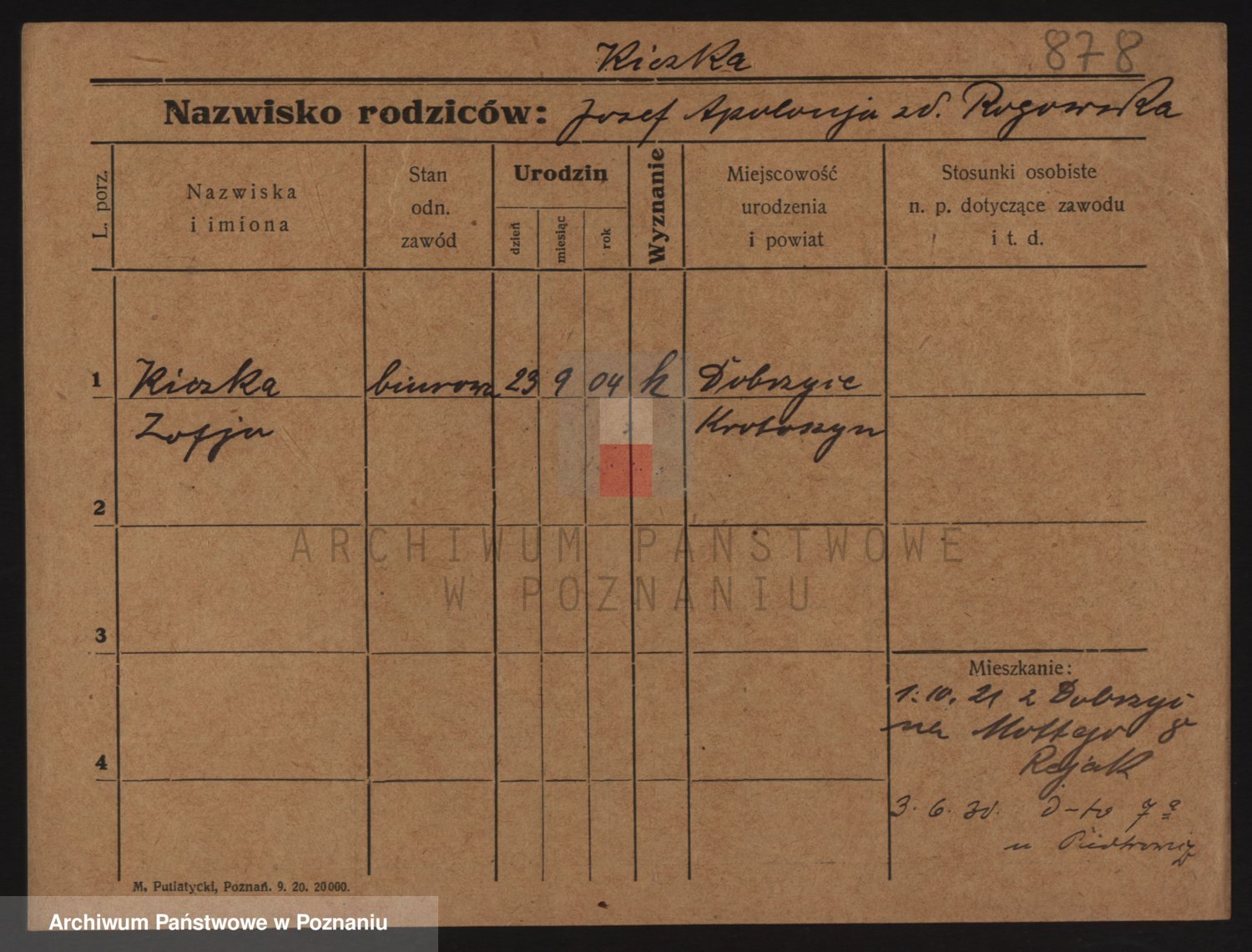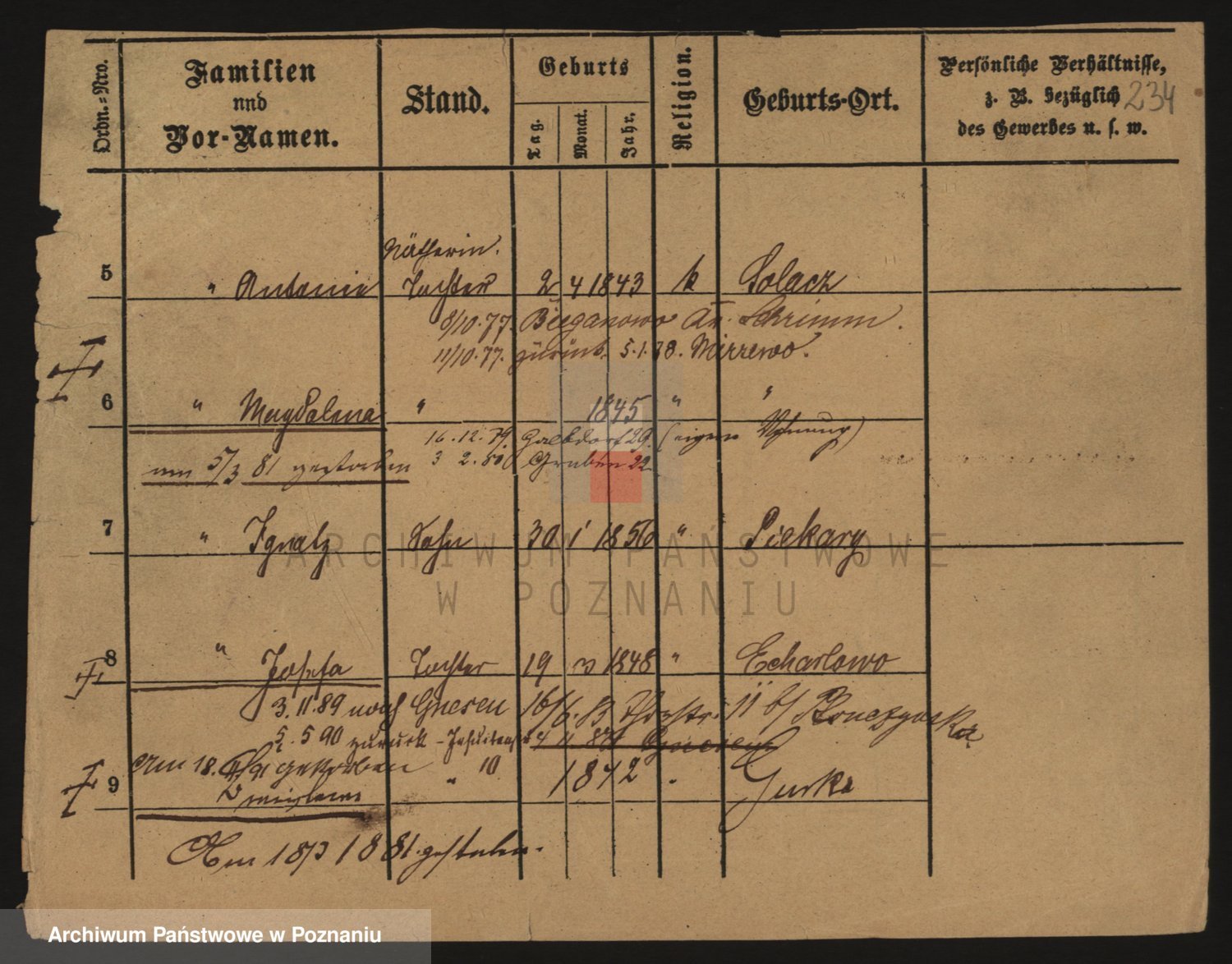 Podgląd karty osobowej dostępny jest po kliknięciu na nazwisko lub ikonkę karty. Można dokonywać powiększenia (ikony na górze) lub przechodzić między kolejnymi skanami (strzałki po bokach).