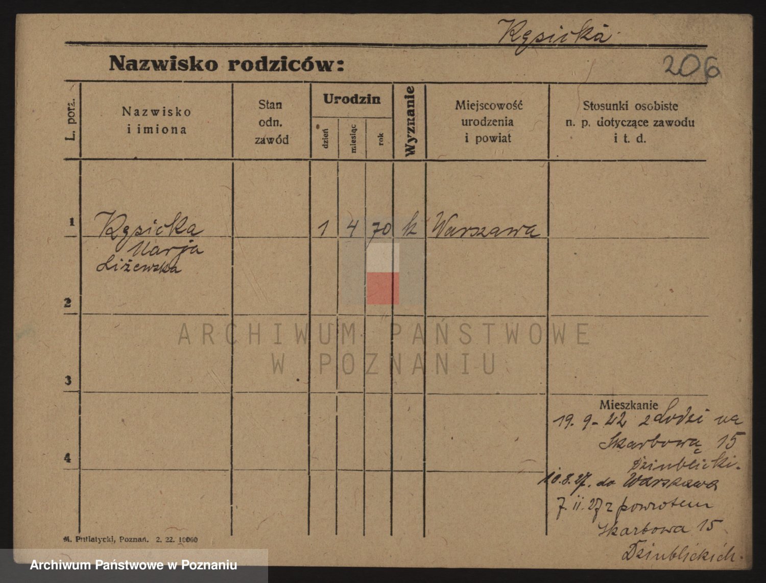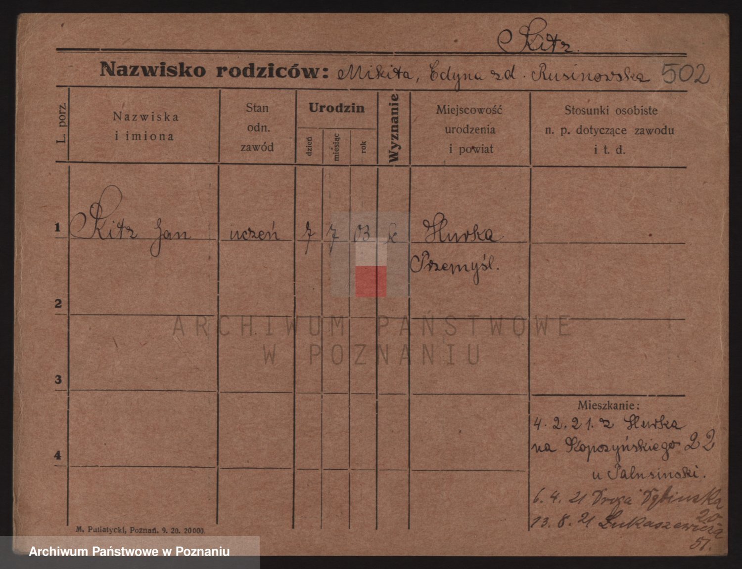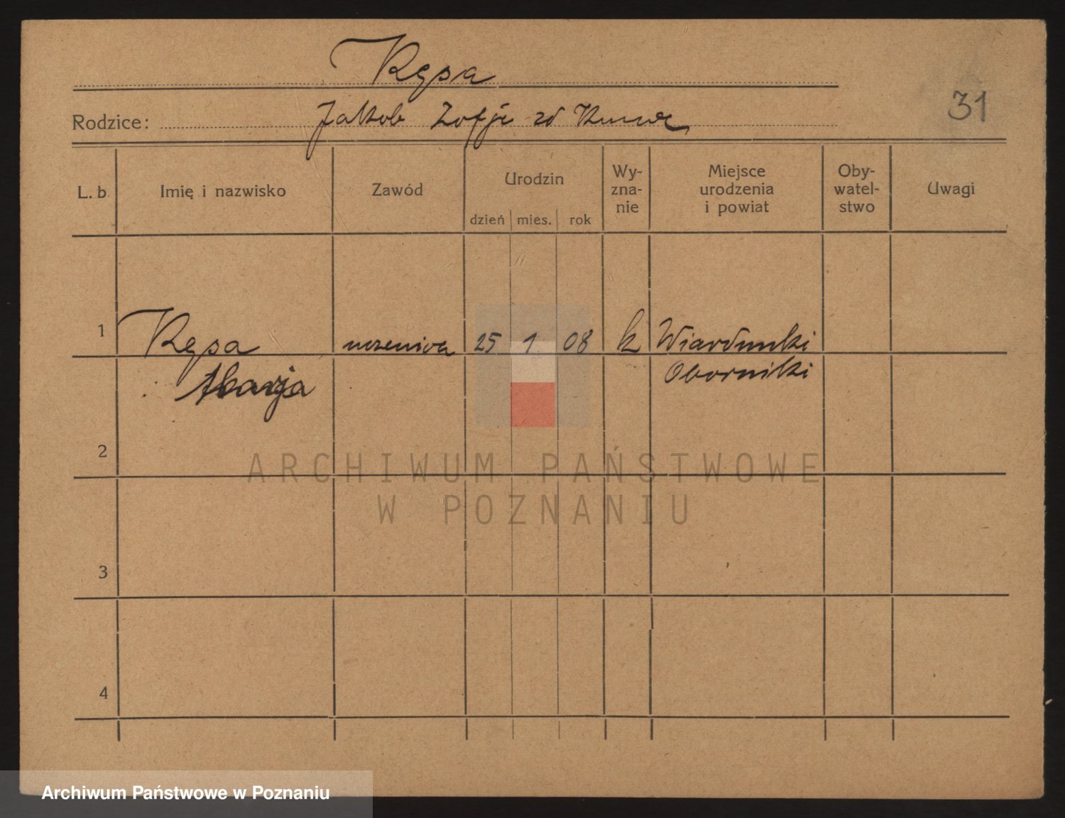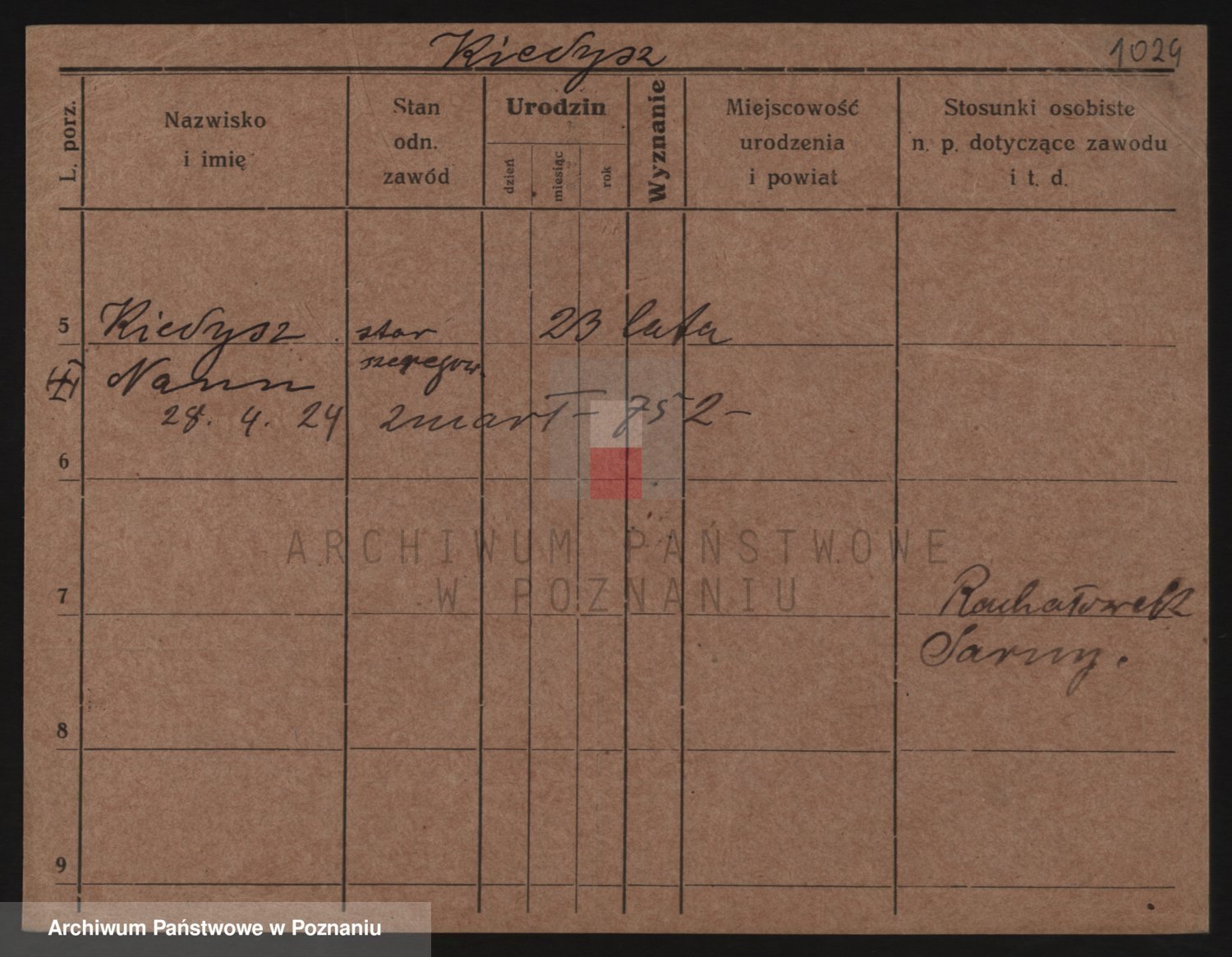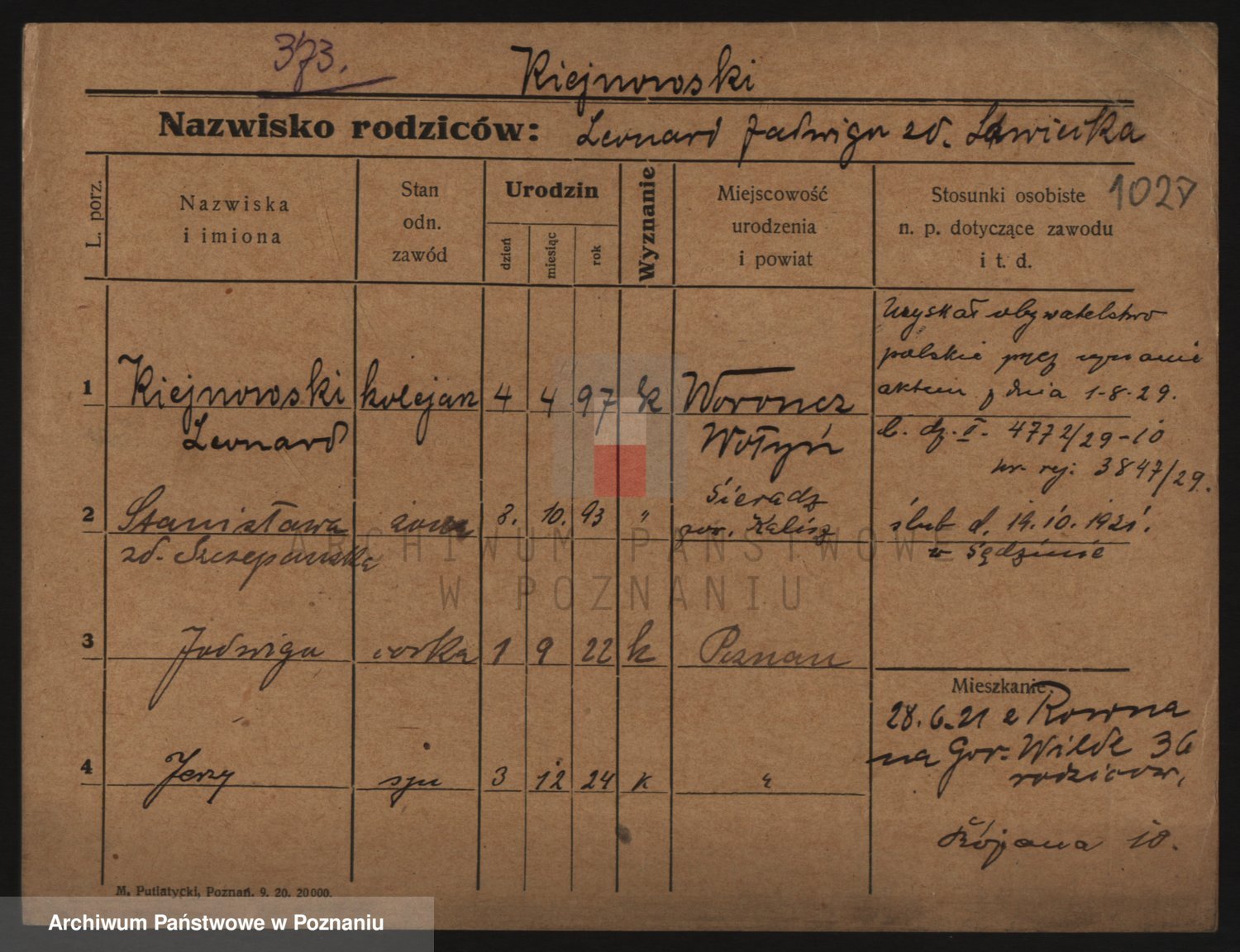 Podgląd karty osobowej dostępny jest po kliknięciu na nazwisko lub ikonkę karty. Można dokonywać powiększenia (ikony na górze) lub przechodzić między kolejnymi skanami (strzałki po bokach).