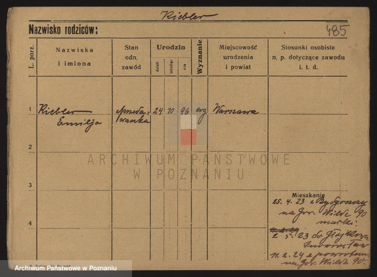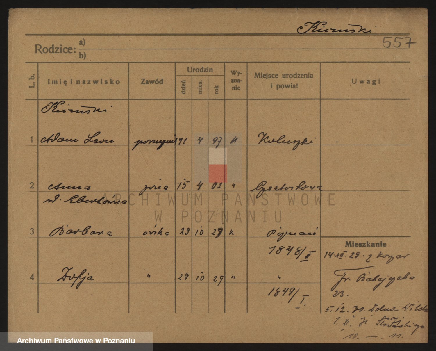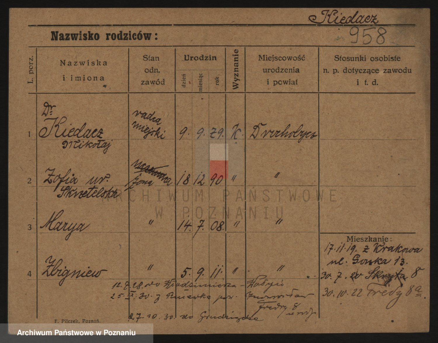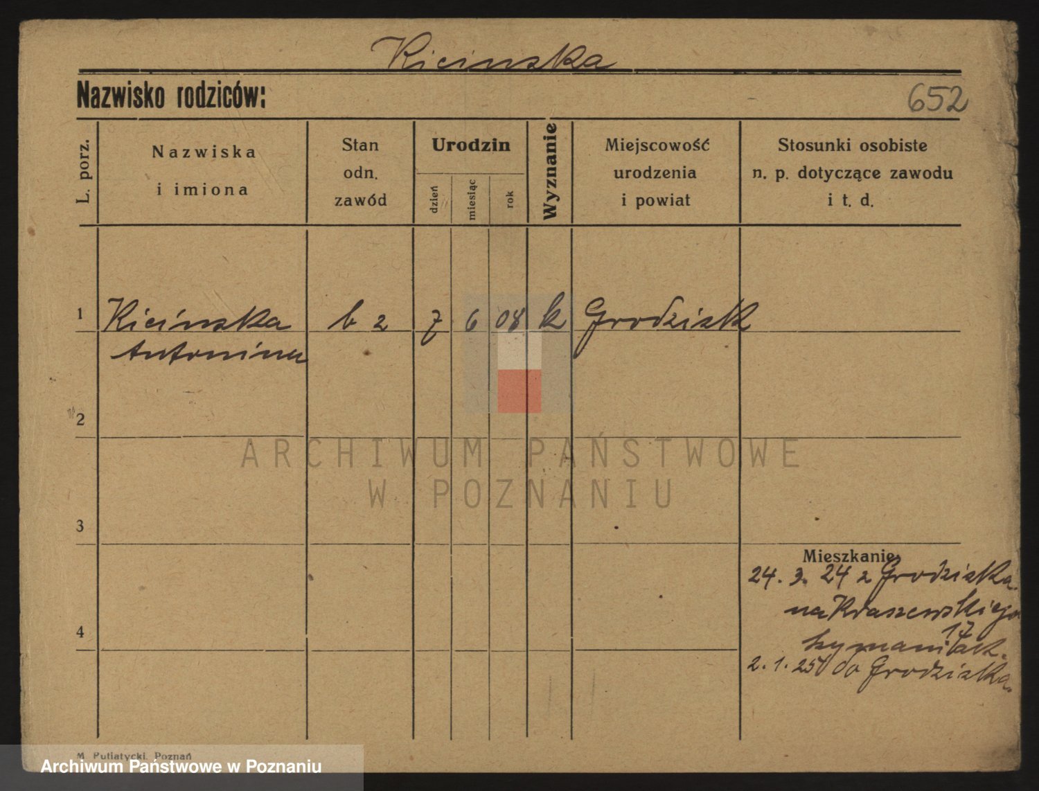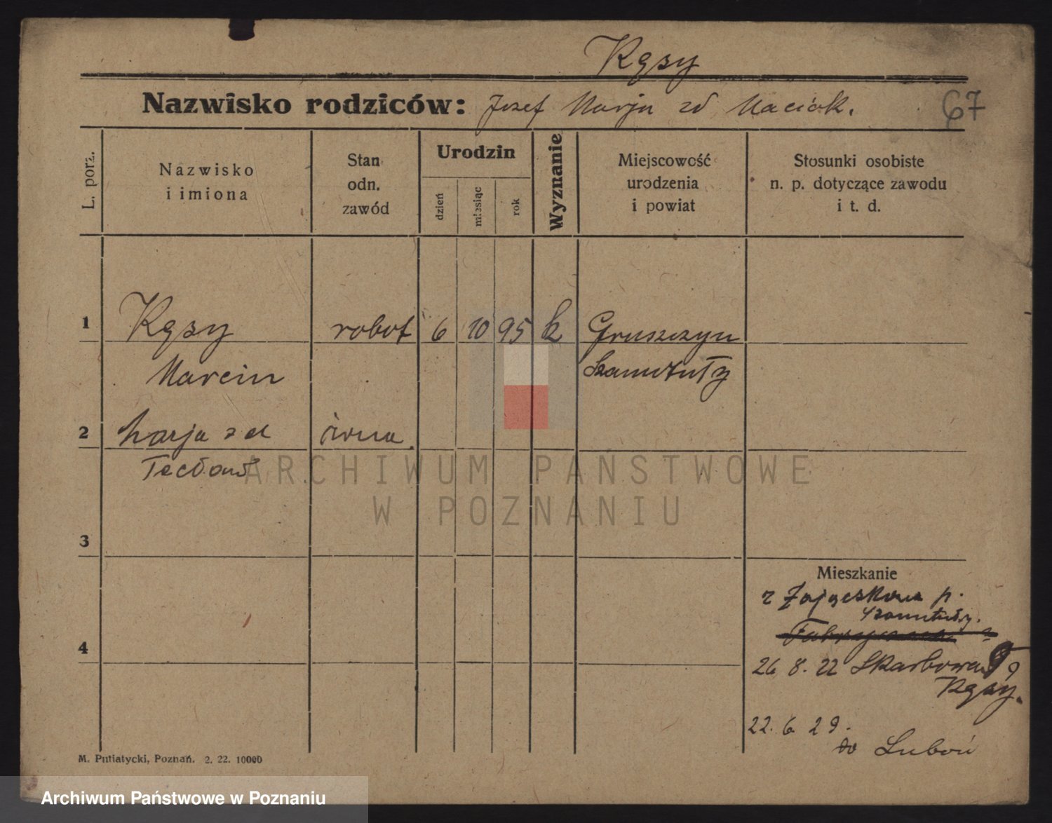 Podgląd karty osobowej dostępny jest po kliknięciu na nazwisko lub ikonkę karty. Można dokonywać powiększenia (ikony na górze) lub przechodzić między kolejnymi skanami (strzałki po bokach).