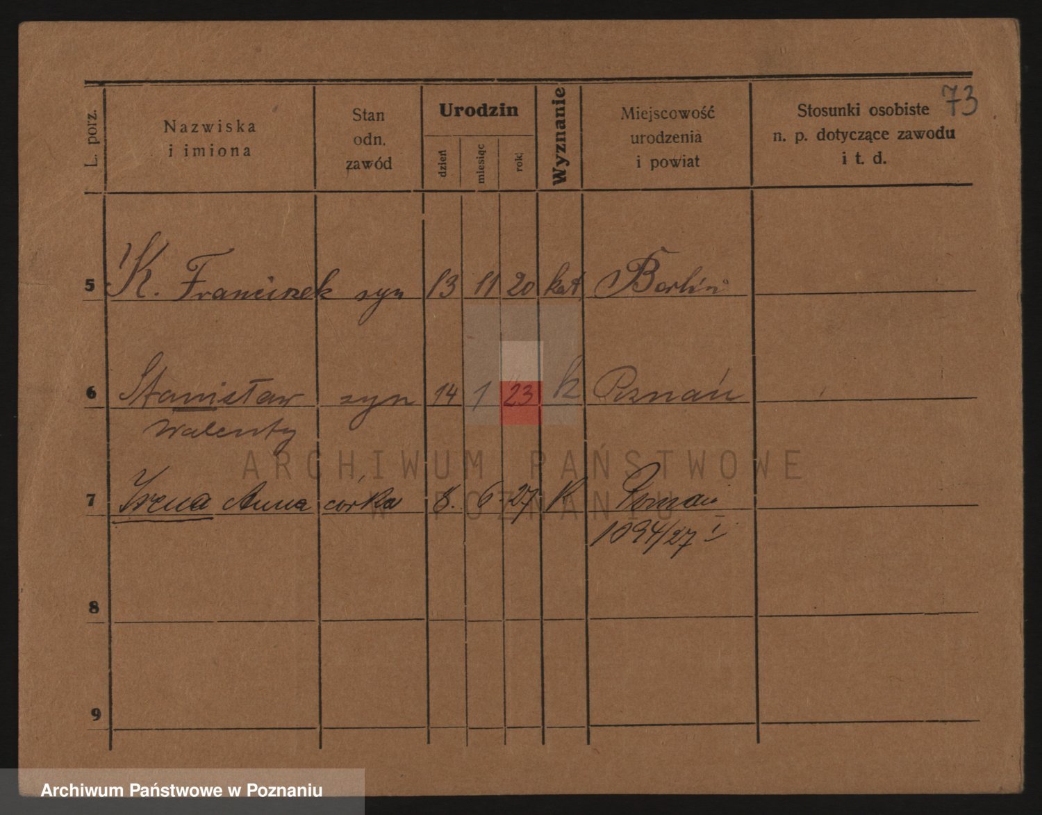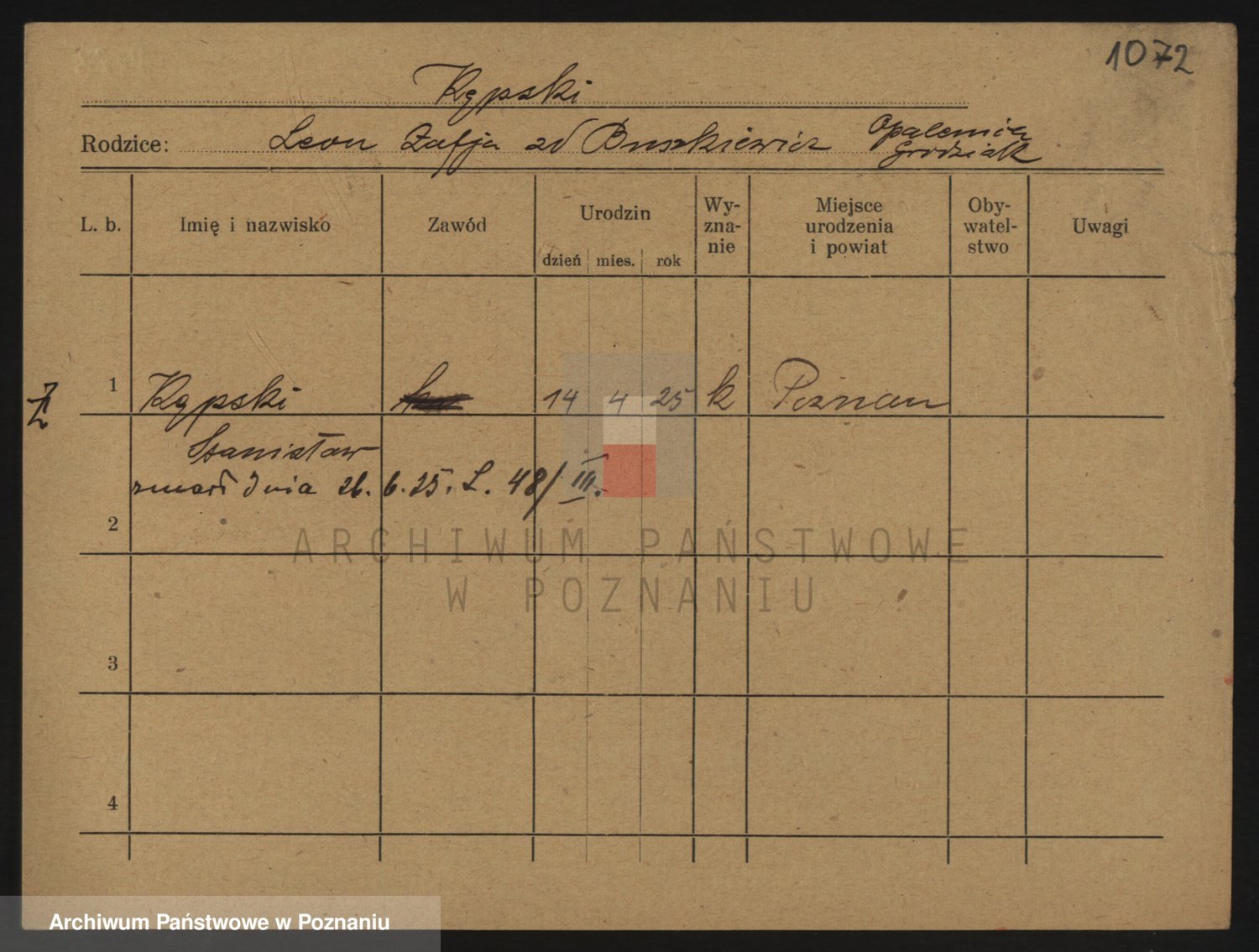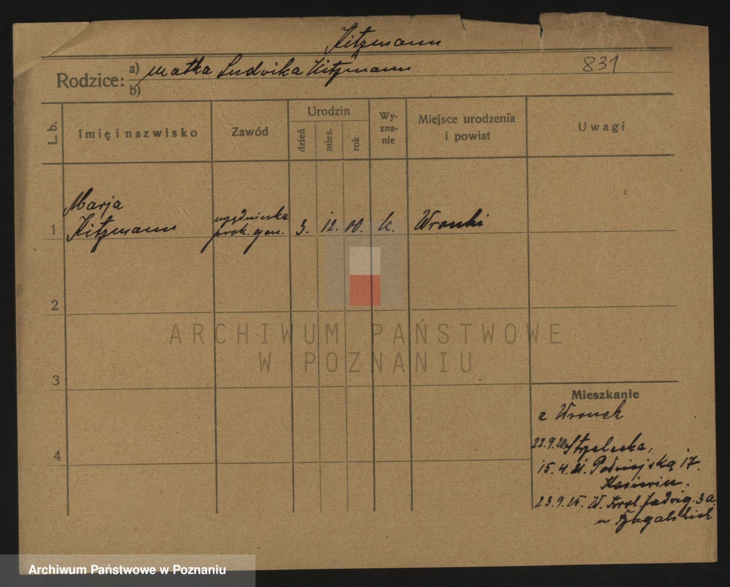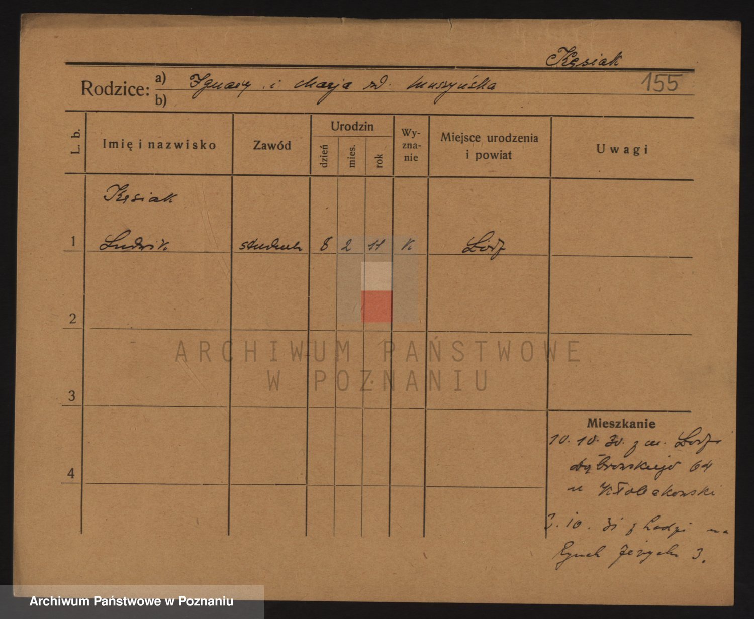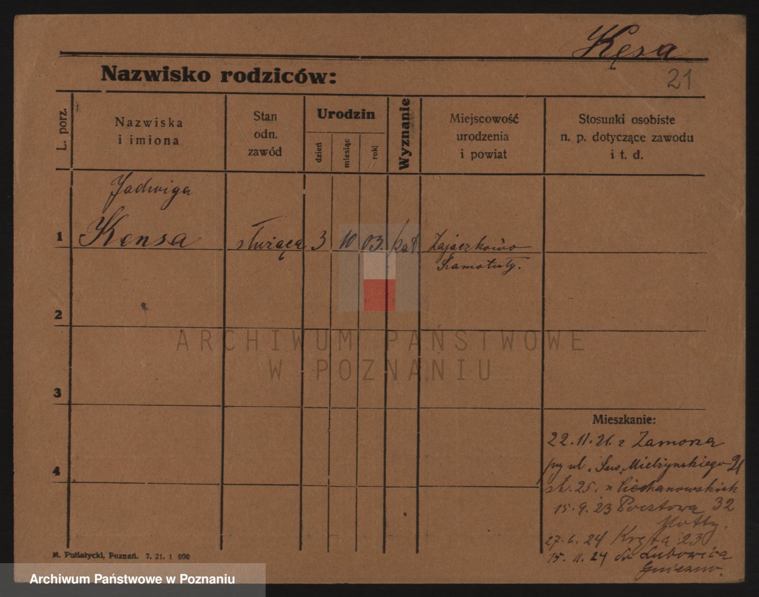 Podgląd karty osobowej dostępny jest po kliknięciu na nazwisko lub ikonkę karty. Można dokonywać powiększenia (ikony na górze) lub przechodzić między kolejnymi skanami (strzałki po bokach).