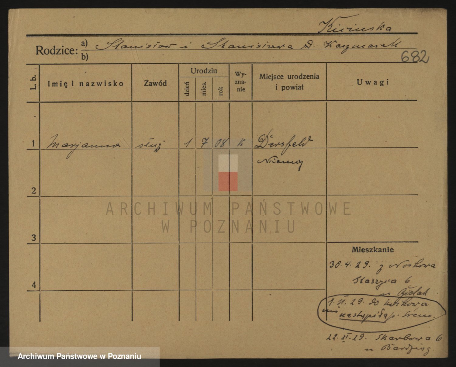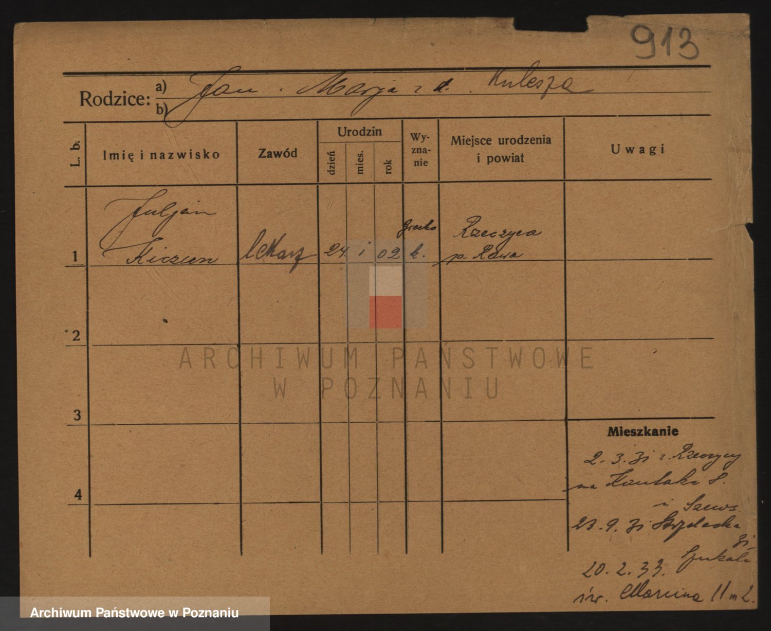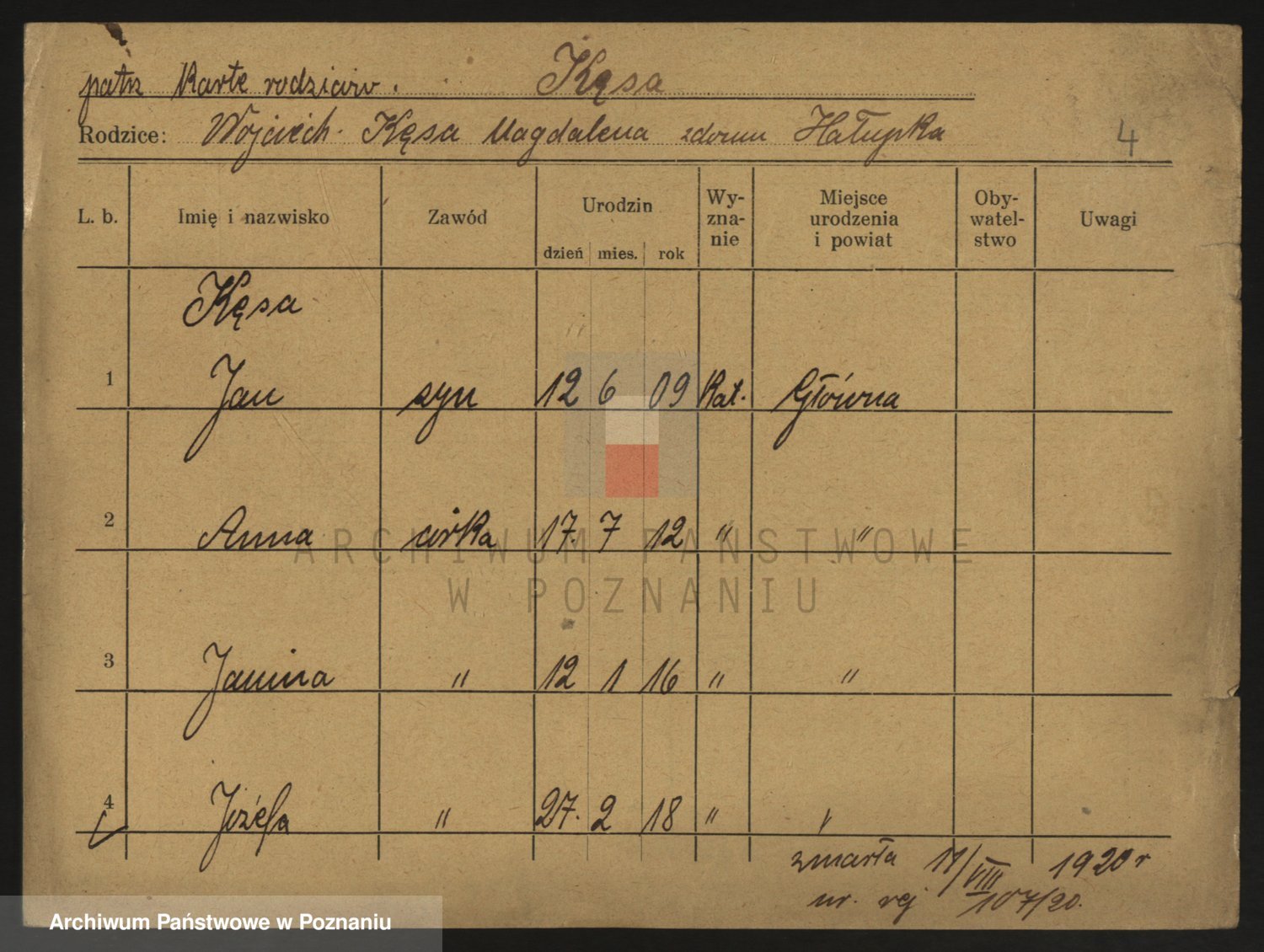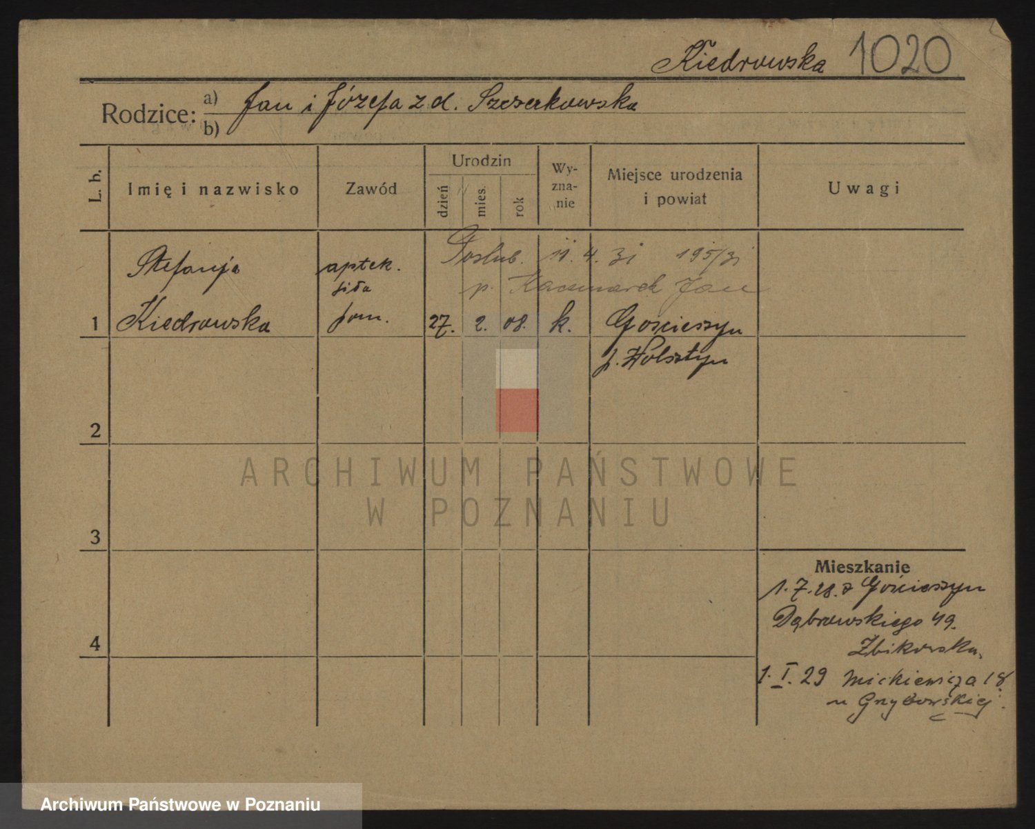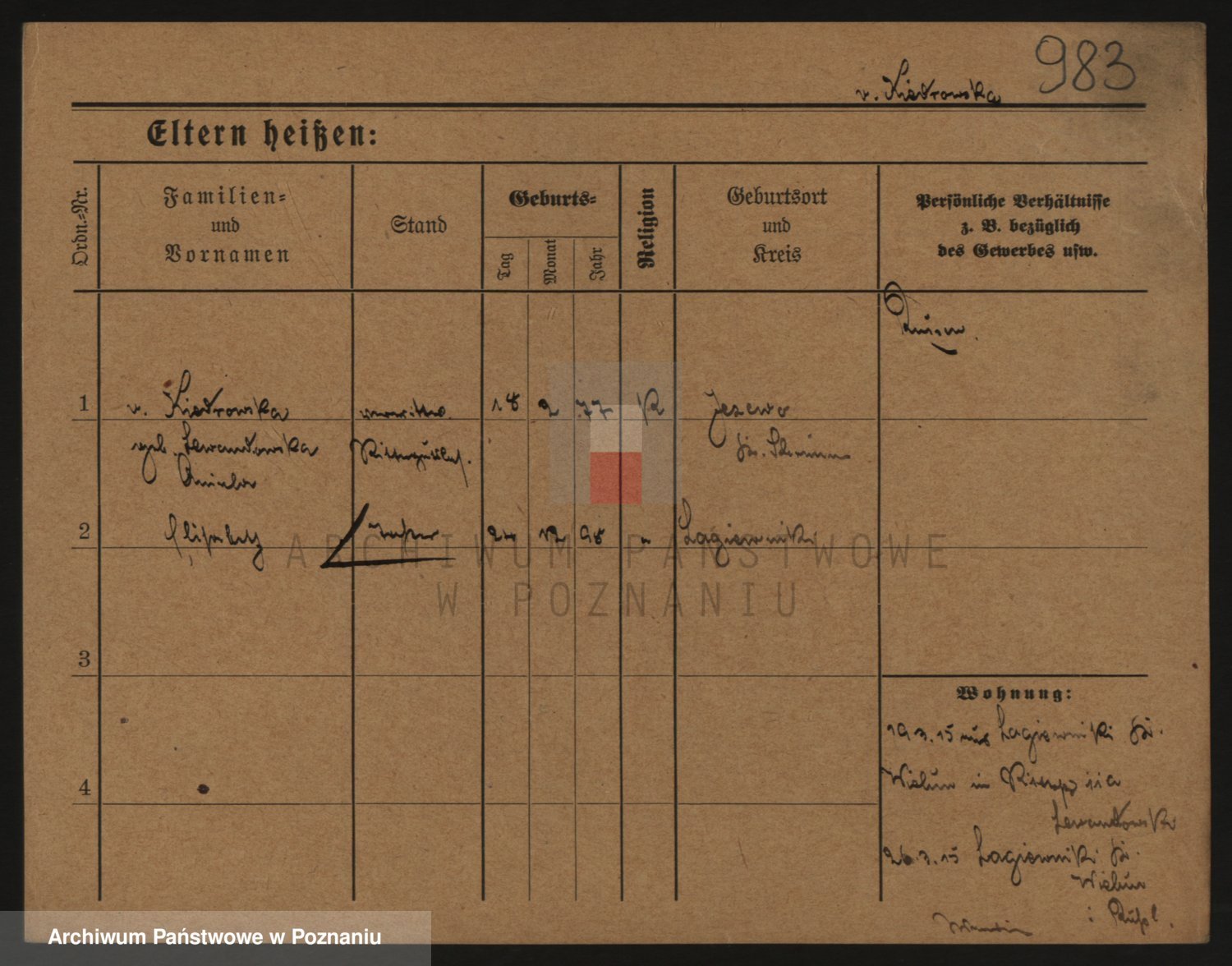Podgląd karty osobowej dostępny jest po kliknięciu na nazwisko lub ikonkę karty. Można dokonywać powiększenia (ikony na górze) lub przechodzić między kolejnymi skanami (strzałki po bokach).