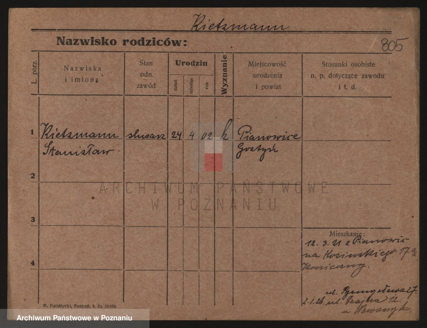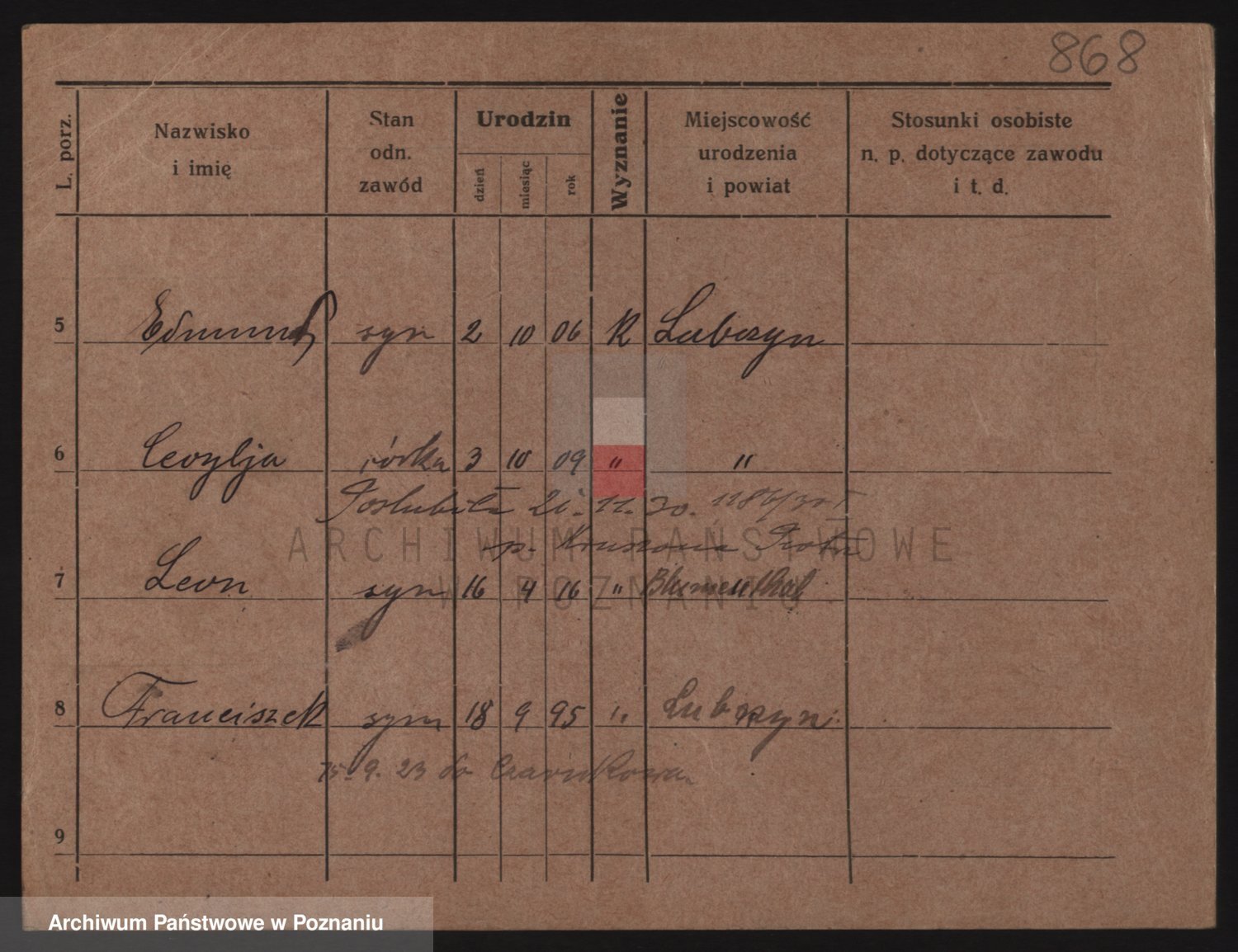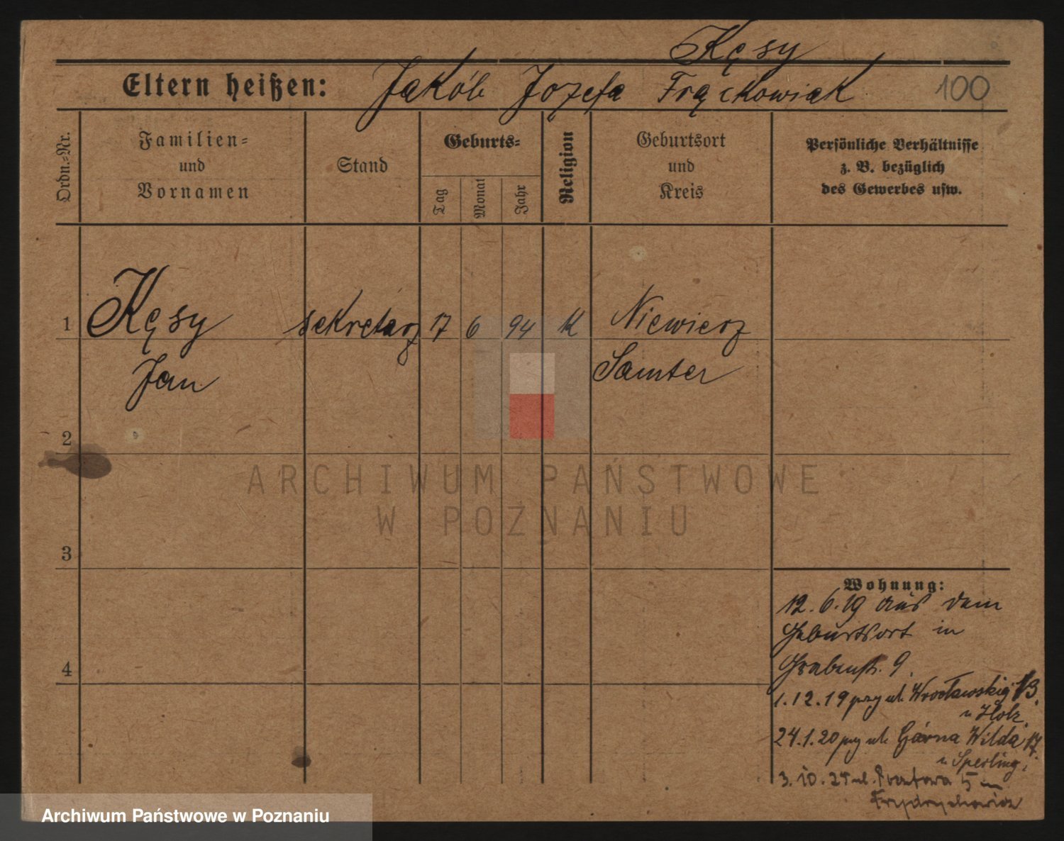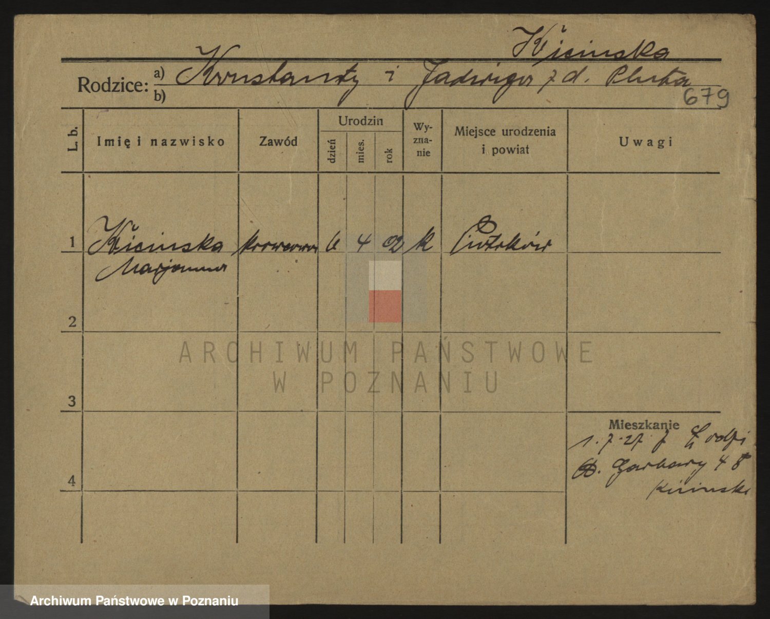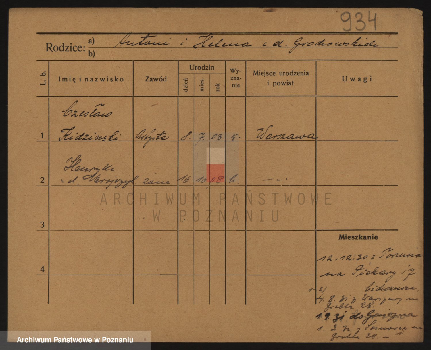 Podgląd karty osobowej dostępny jest po kliknięciu na nazwisko lub ikonkę karty. Można dokonywać powiększenia (ikony na górze) lub przechodzić między kolejnymi skanami (strzałki po bokach).