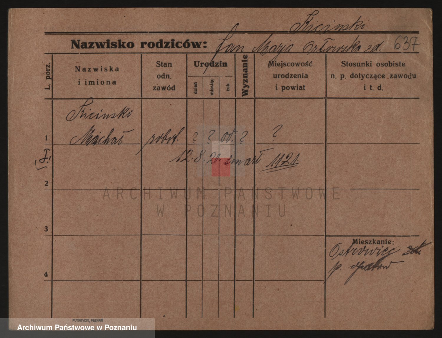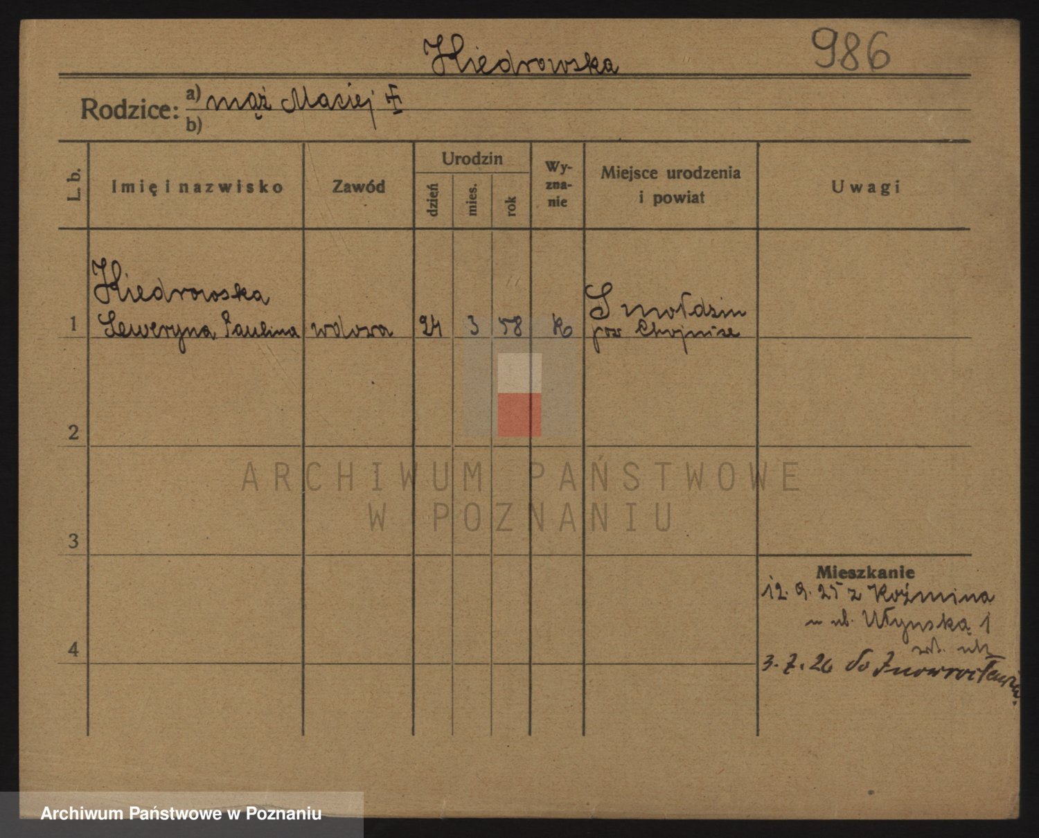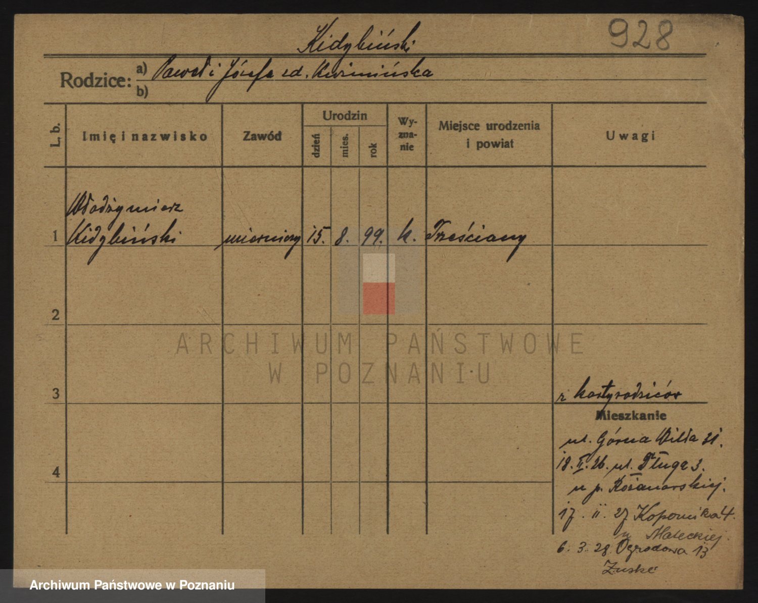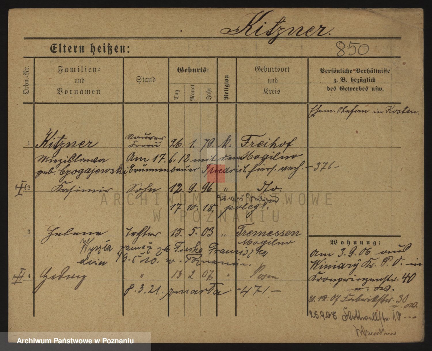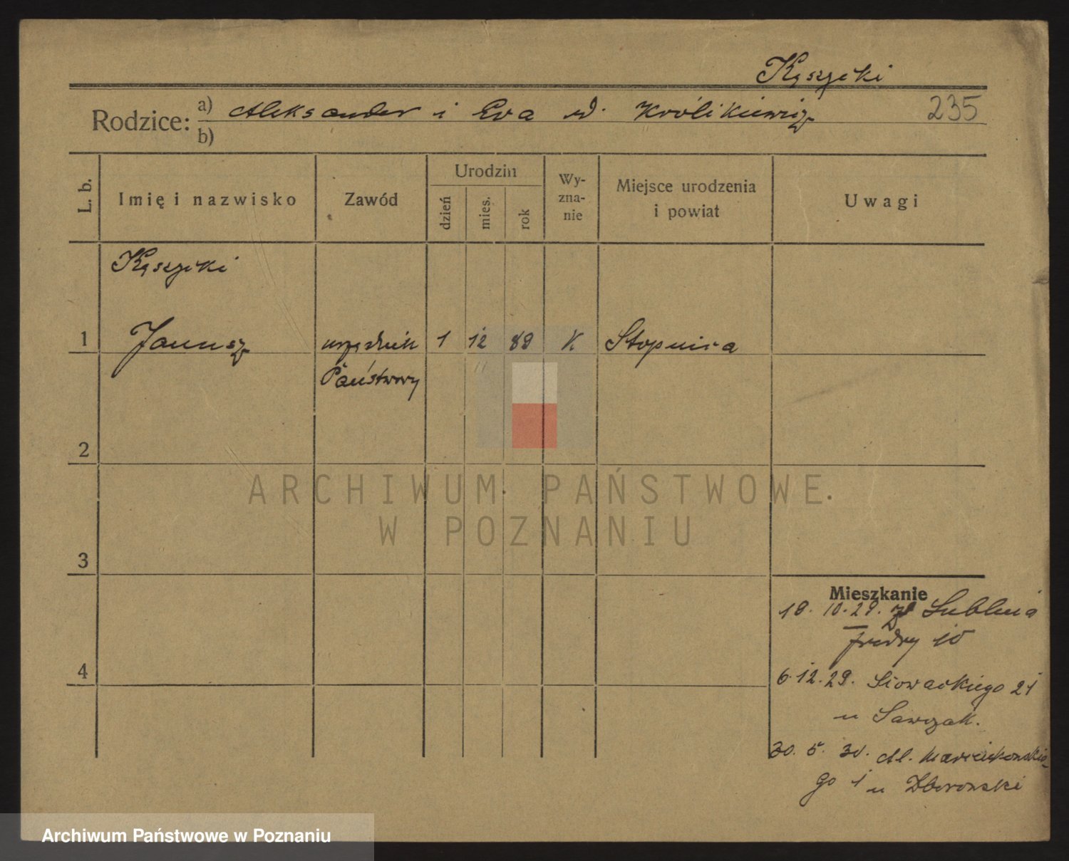 Podgląd karty osobowej dostępny jest po kliknięciu na nazwisko lub ikonkę karty. Można dokonywać powiększenia (ikony na górze) lub przechodzić między kolejnymi skanami (strzałki po bokach).