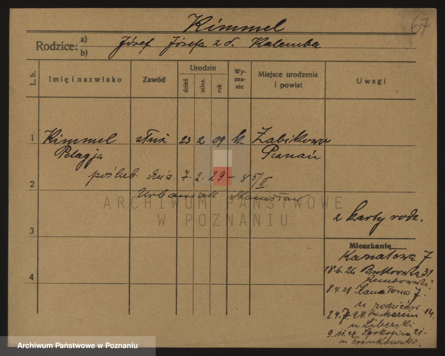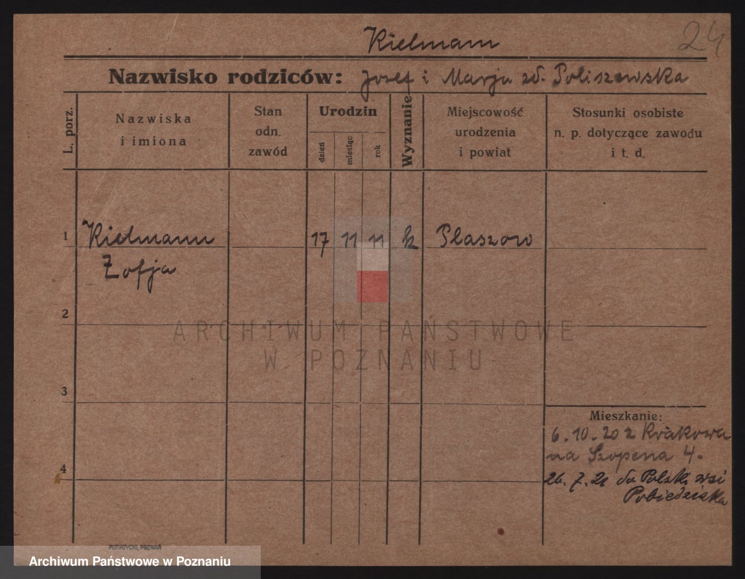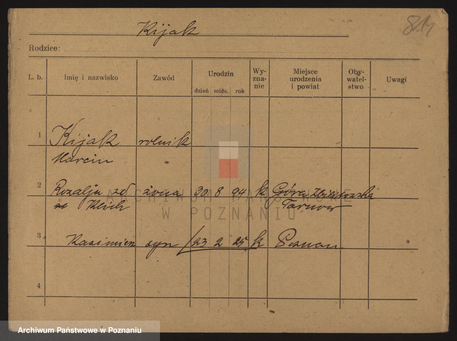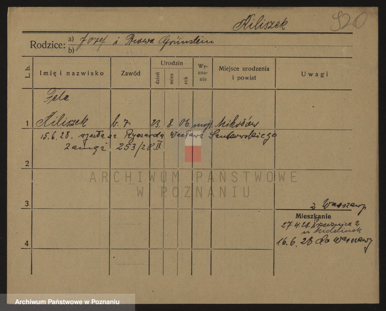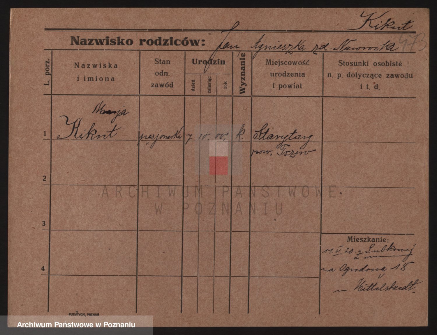 Podgląd karty osobowej dostępny jest po kliknięciu na nazwisko lub ikonkę karty. Można dokonywać powiększenia (ikony na górze) lub przechodzić między kolejnymi skanami (strzałki po bokach).