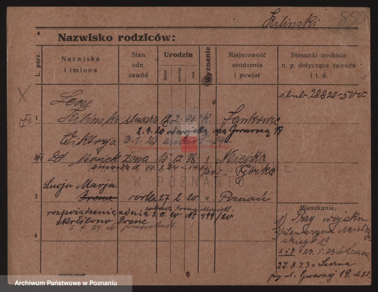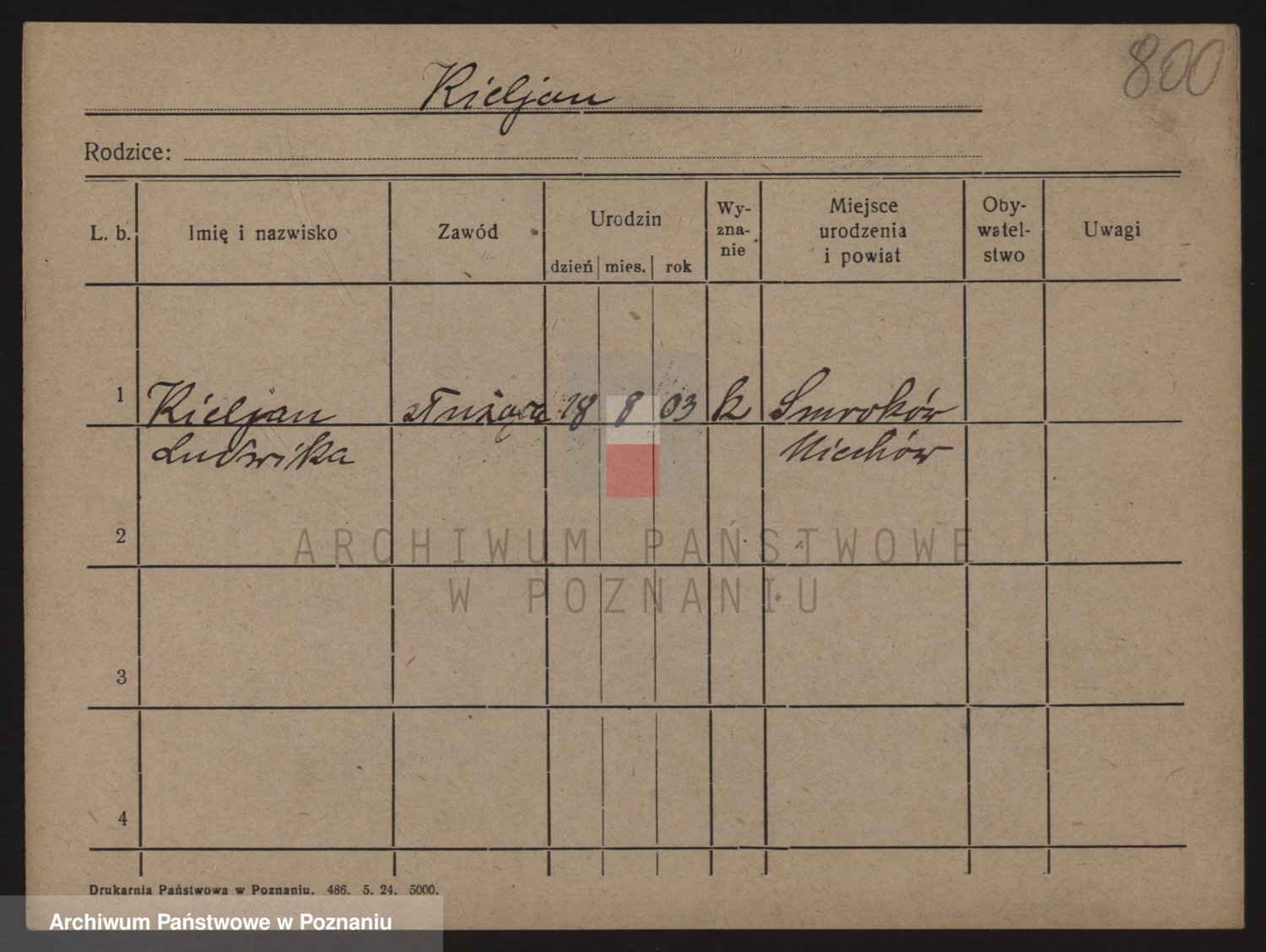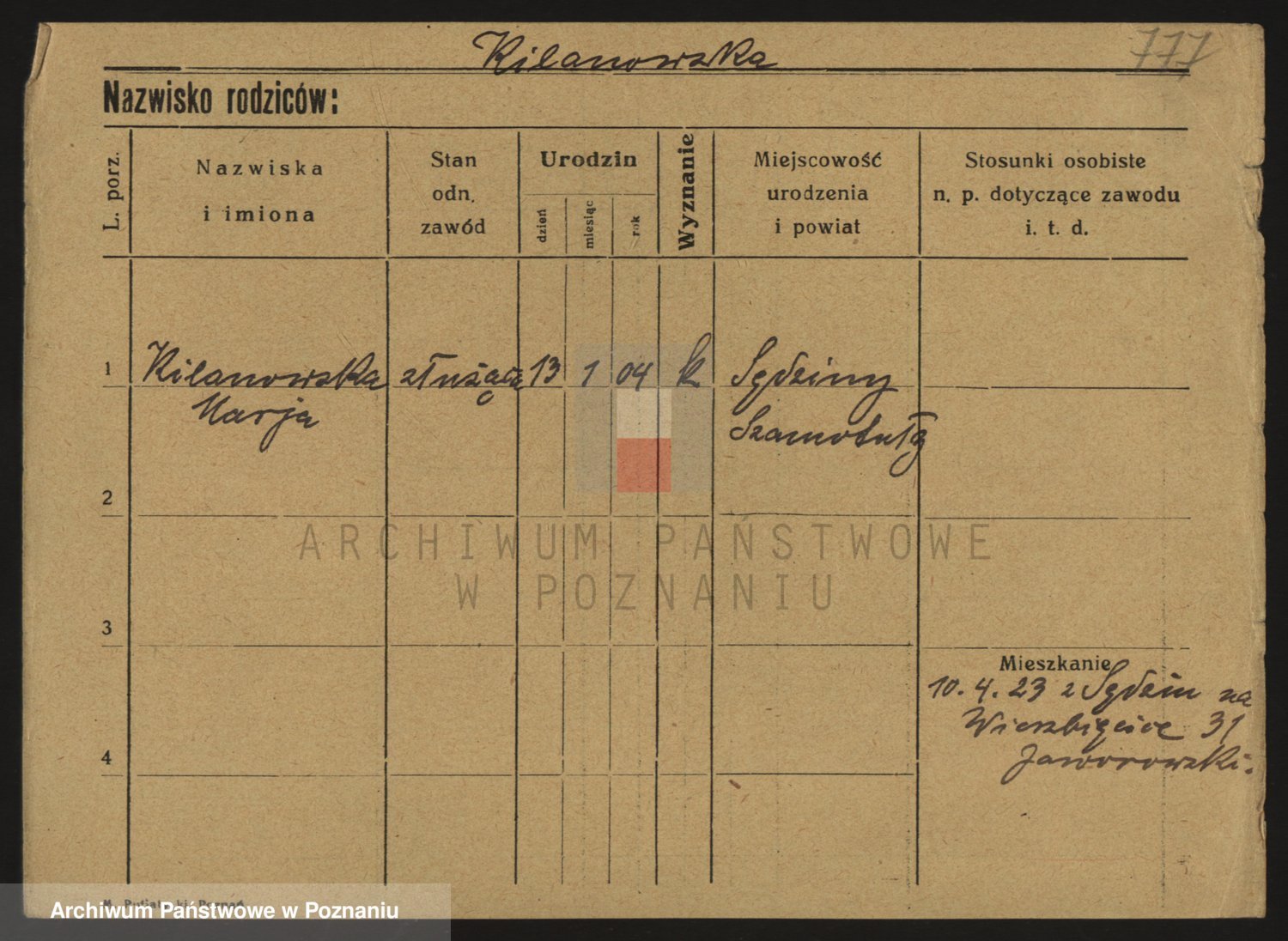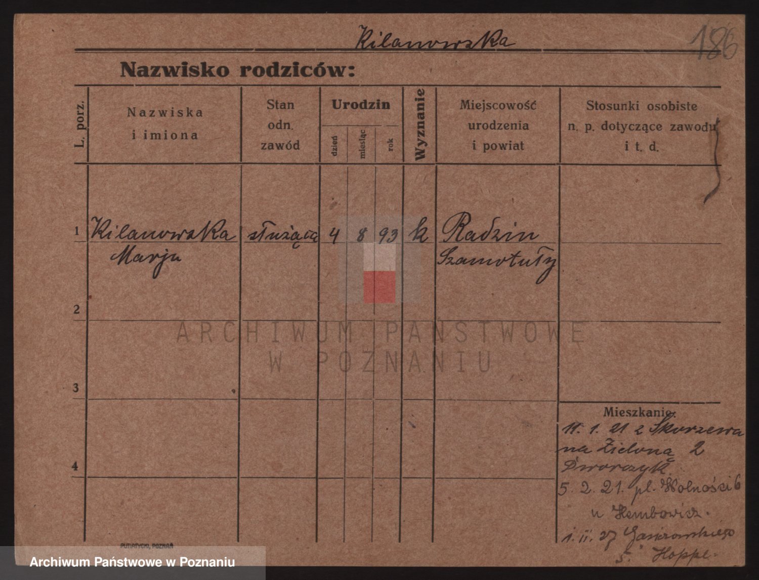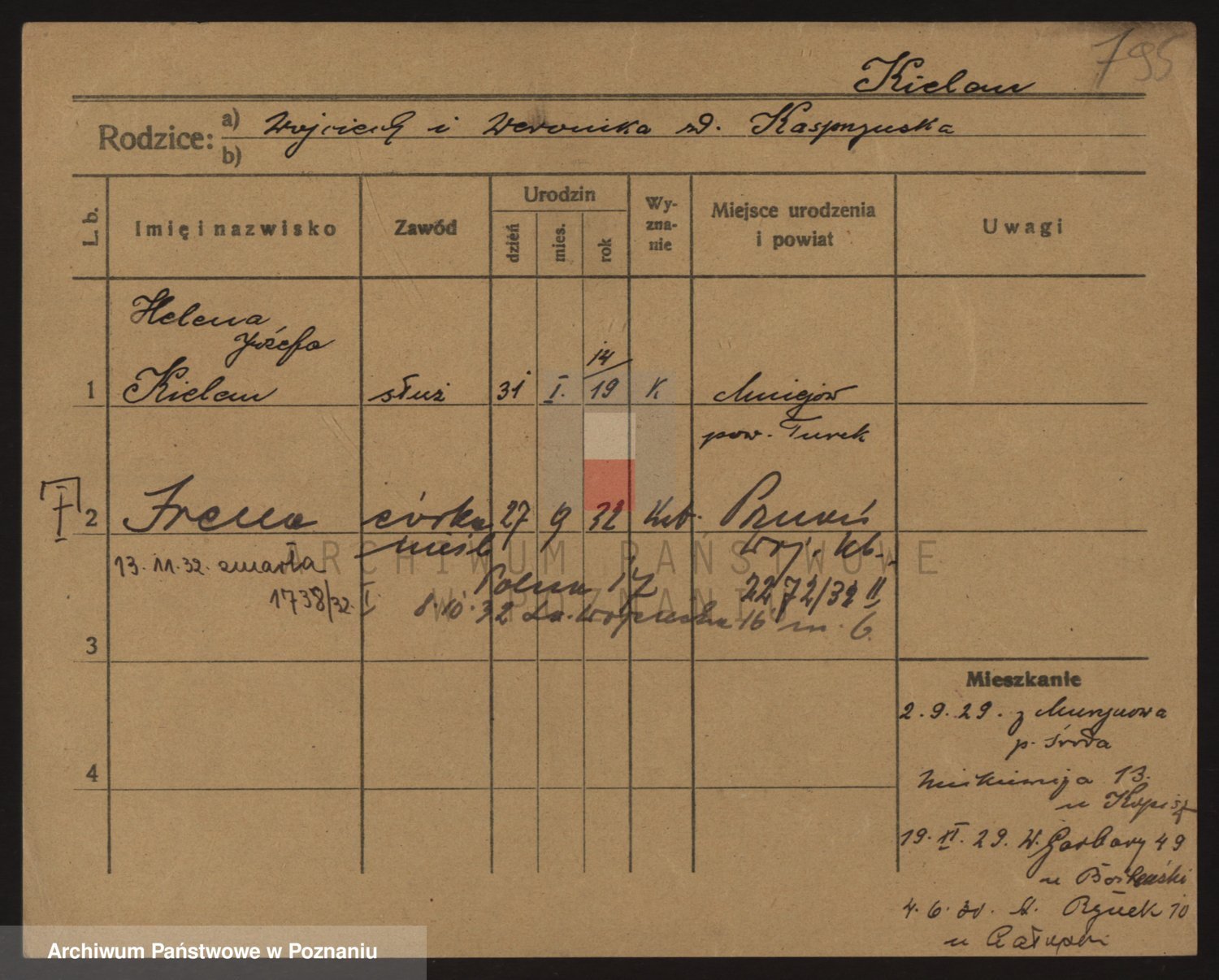 Podgląd karty osobowej dostępny jest po kliknięciu na nazwisko lub ikonkę karty. Można dokonywać powiększenia (ikony na górze) lub przechodzić między kolejnymi skanami (strzałki po bokach).