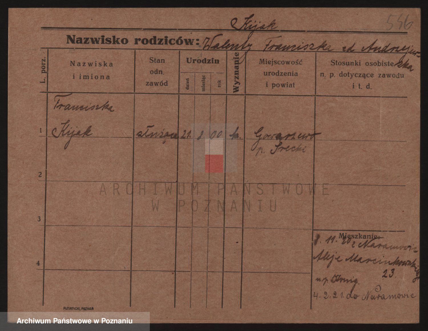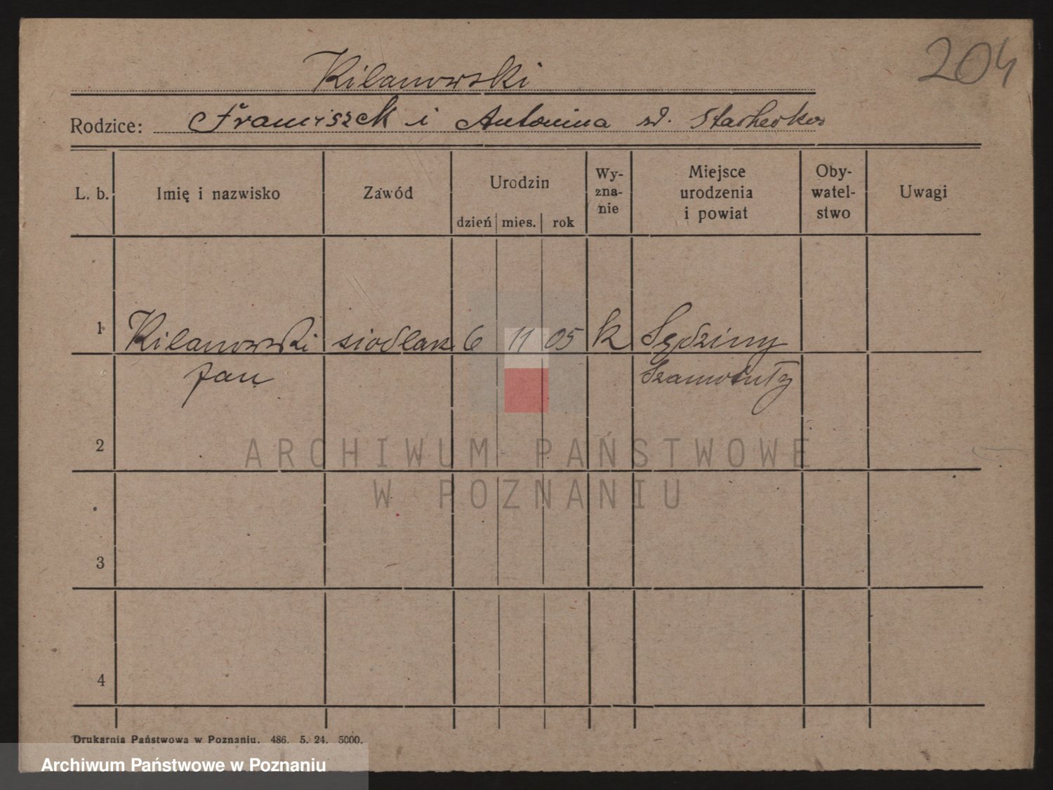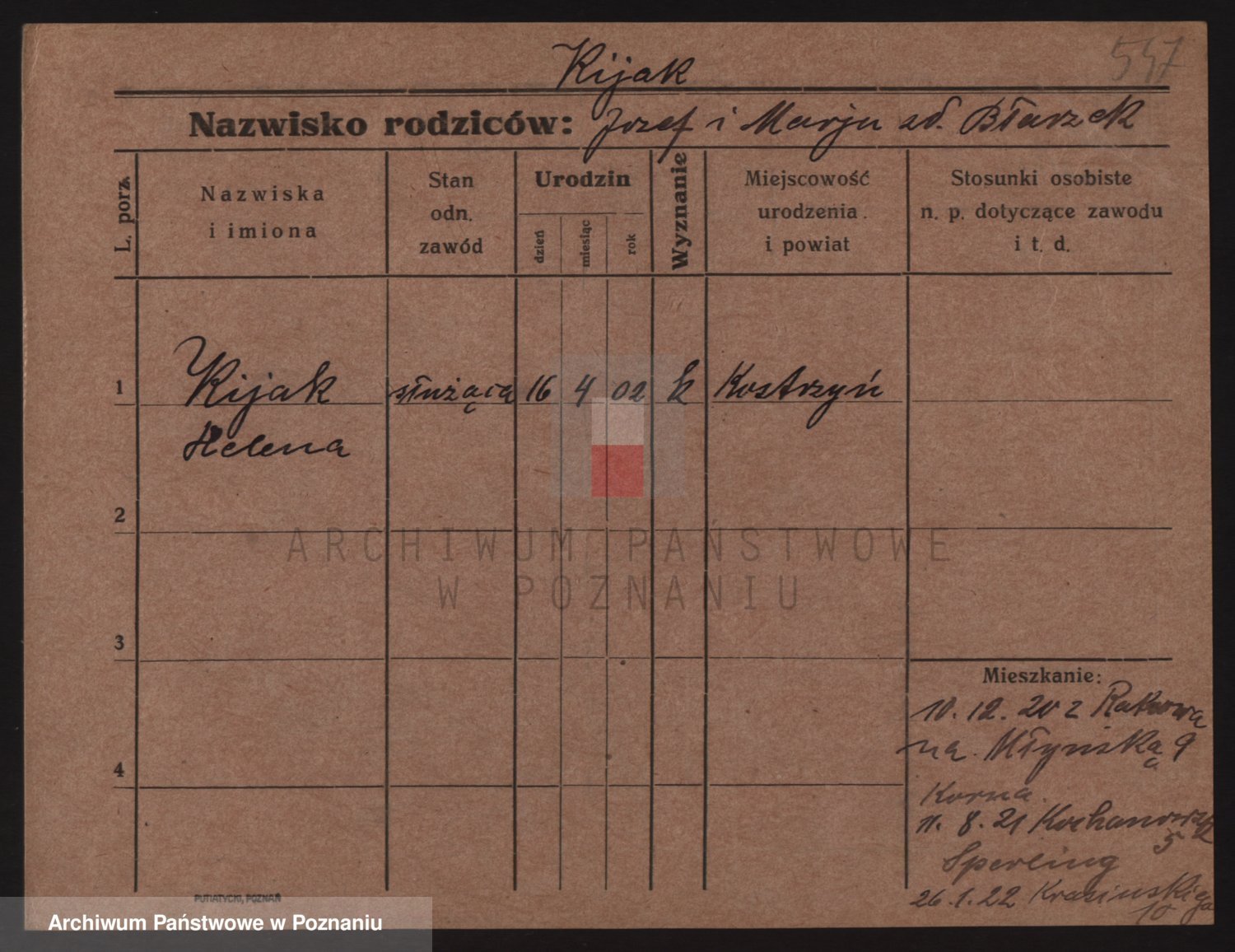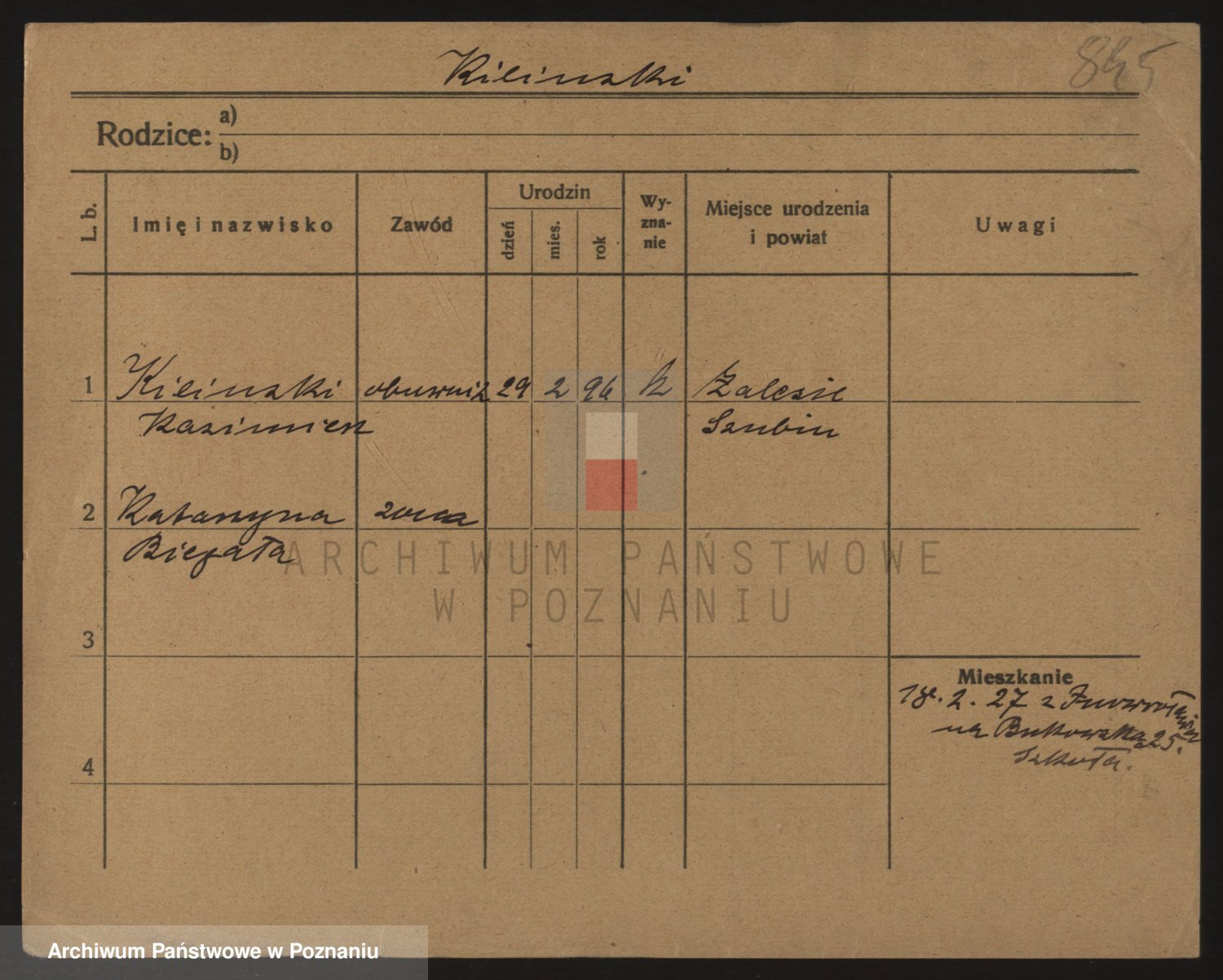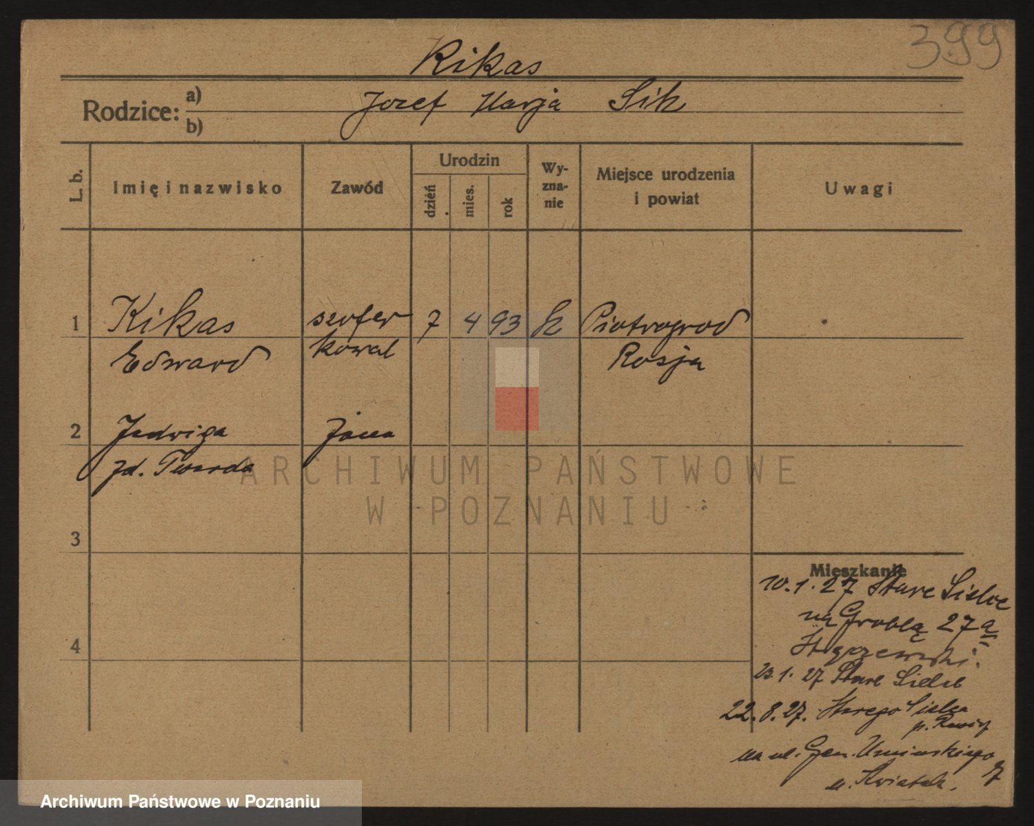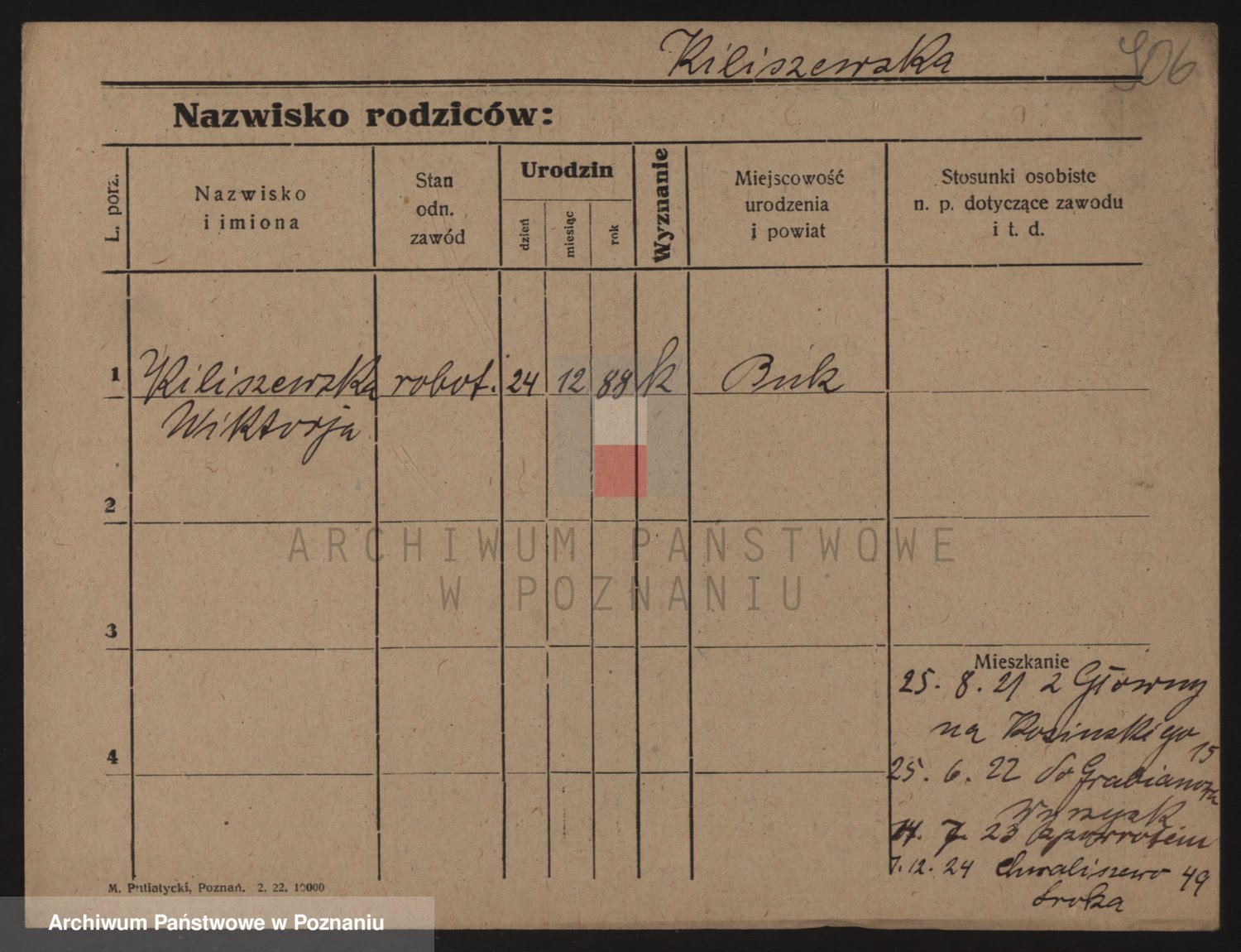 Podgląd karty osobowej dostępny jest po kliknięciu na nazwisko lub ikonkę karty. Można dokonywać powiększenia (ikony na górze) lub przechodzić między kolejnymi skanami (strzałki po bokach).