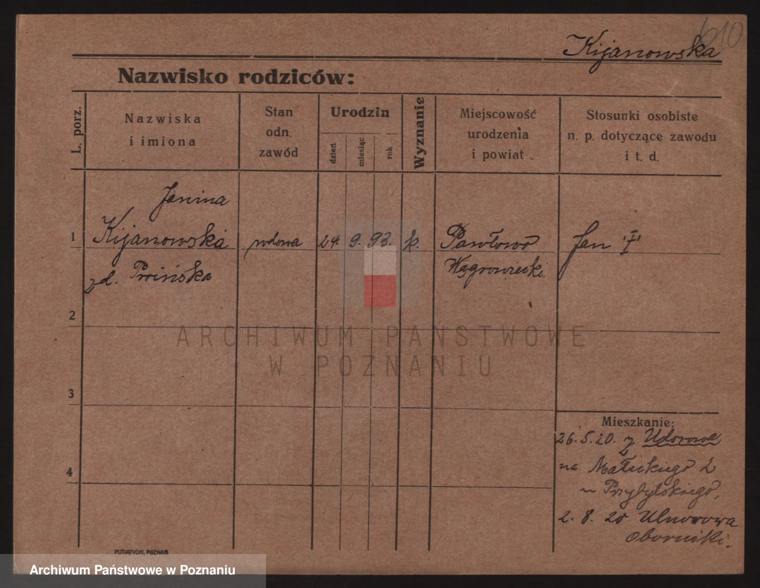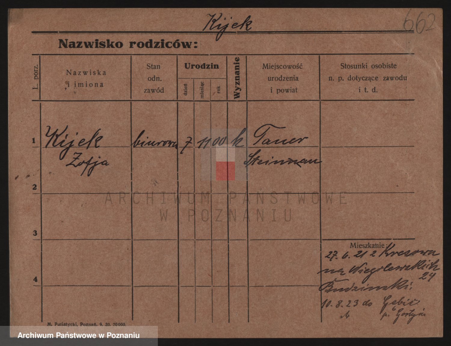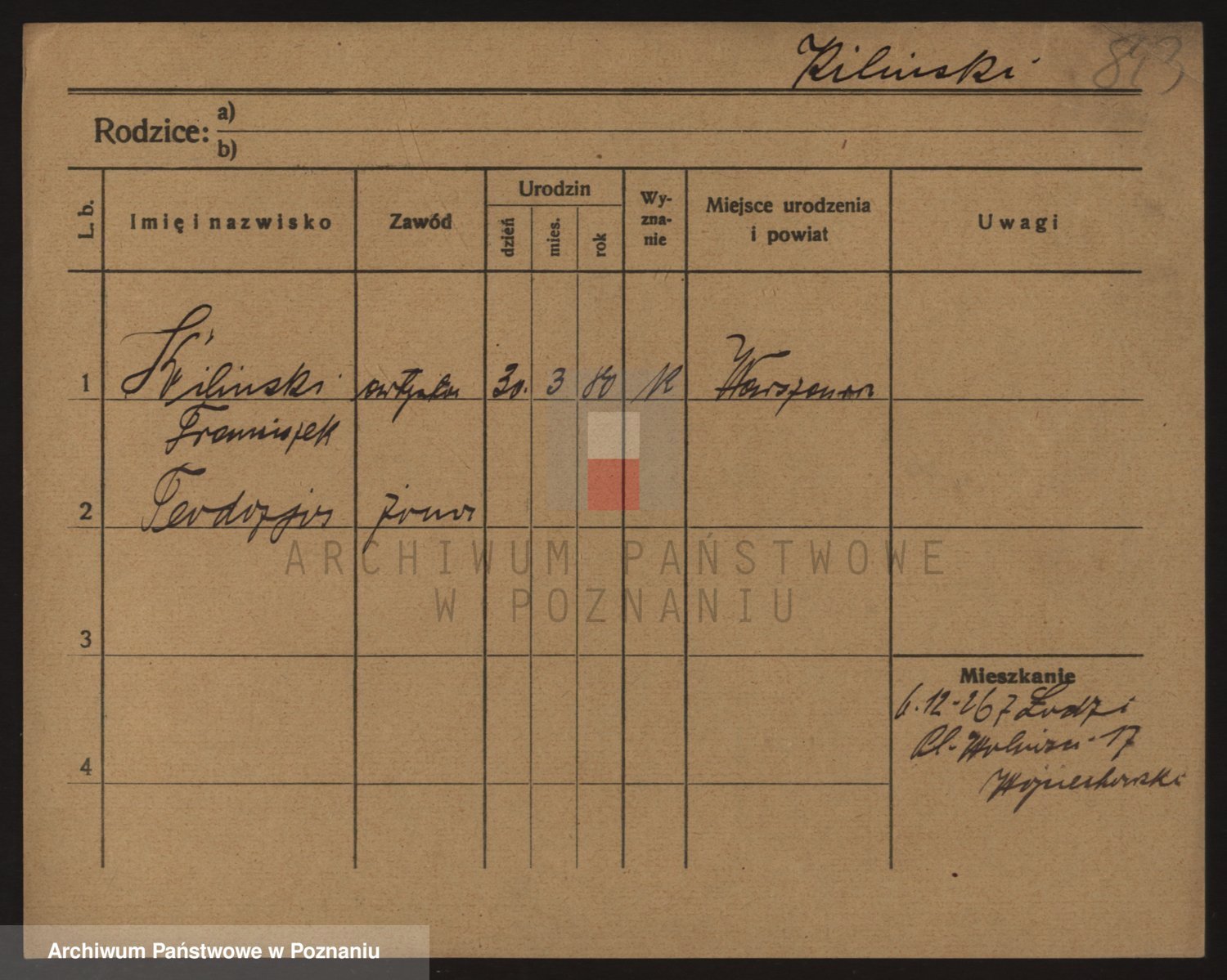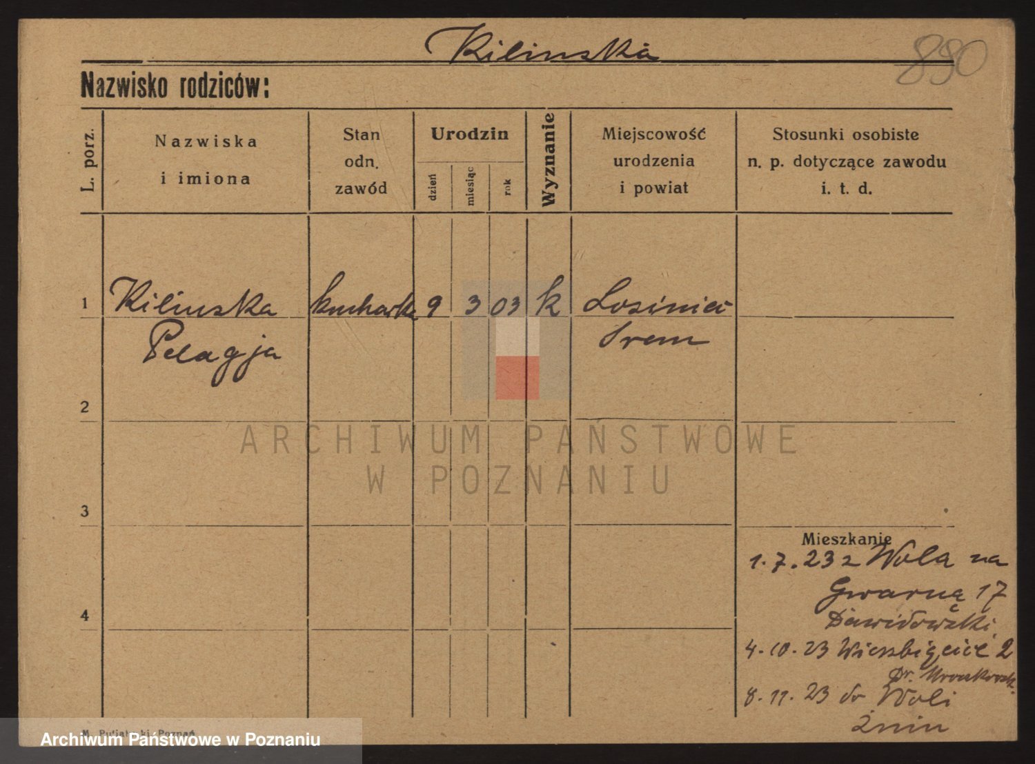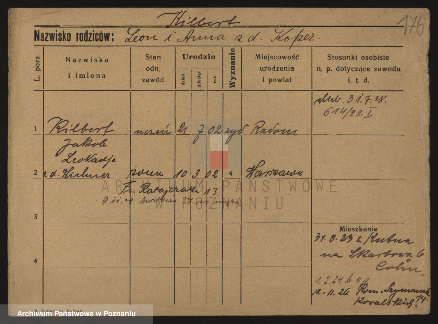 Podgląd karty osobowej dostępny jest po kliknięciu na nazwisko lub ikonkę karty. Można dokonywać powiększenia (ikony na górze) lub przechodzić między kolejnymi skanami (strzałki po bokach).