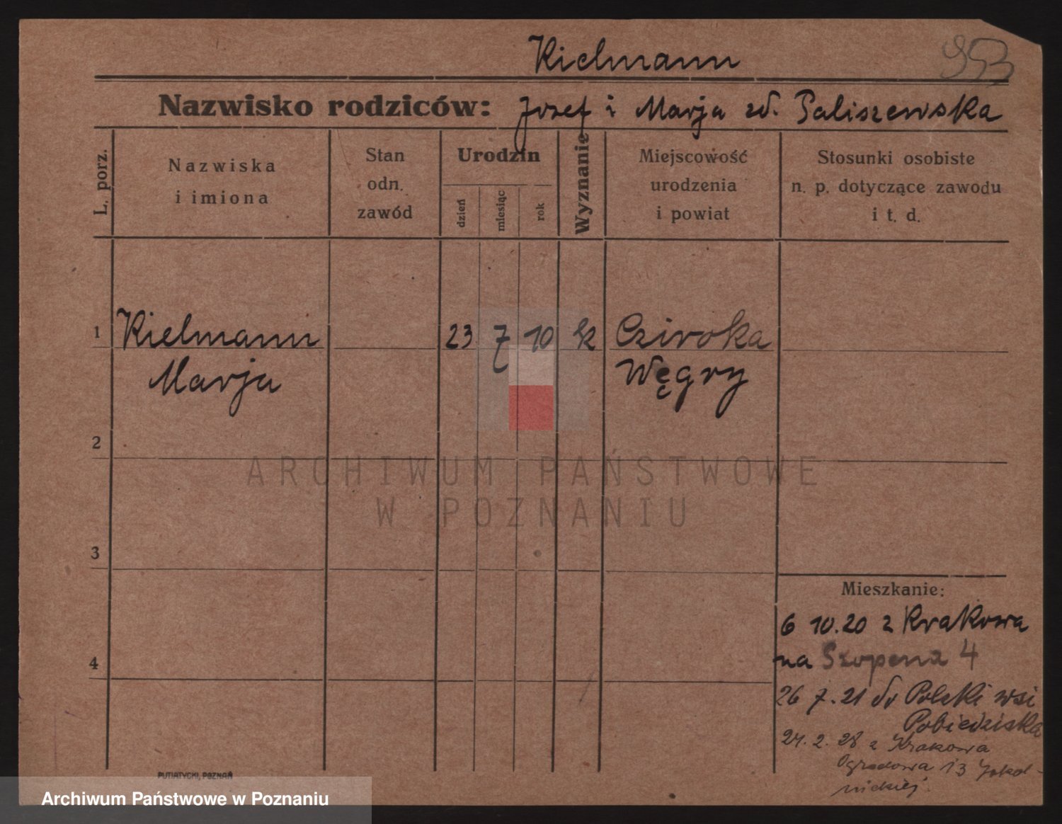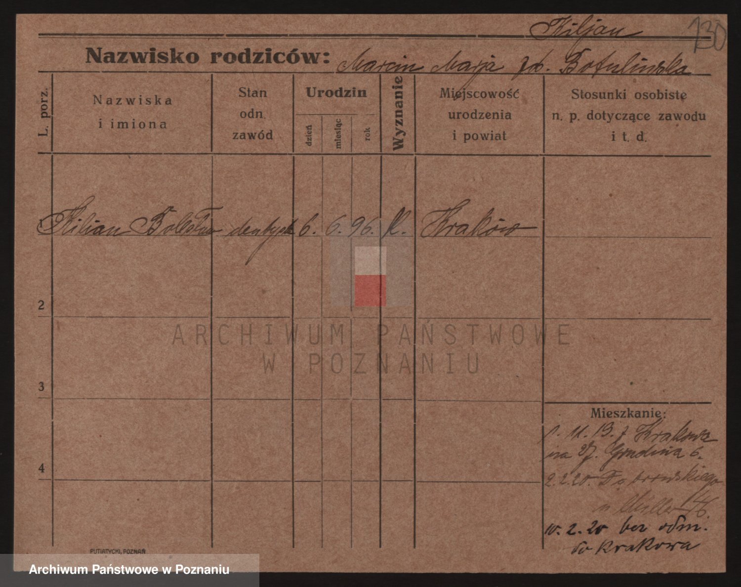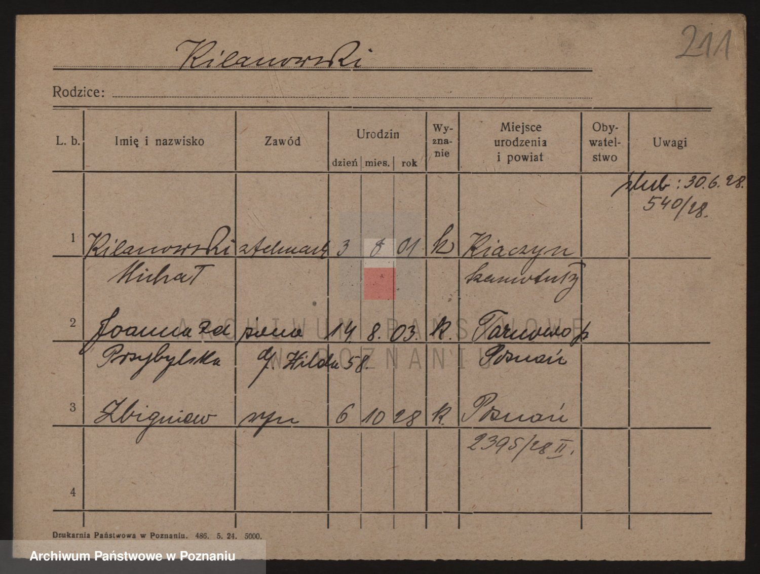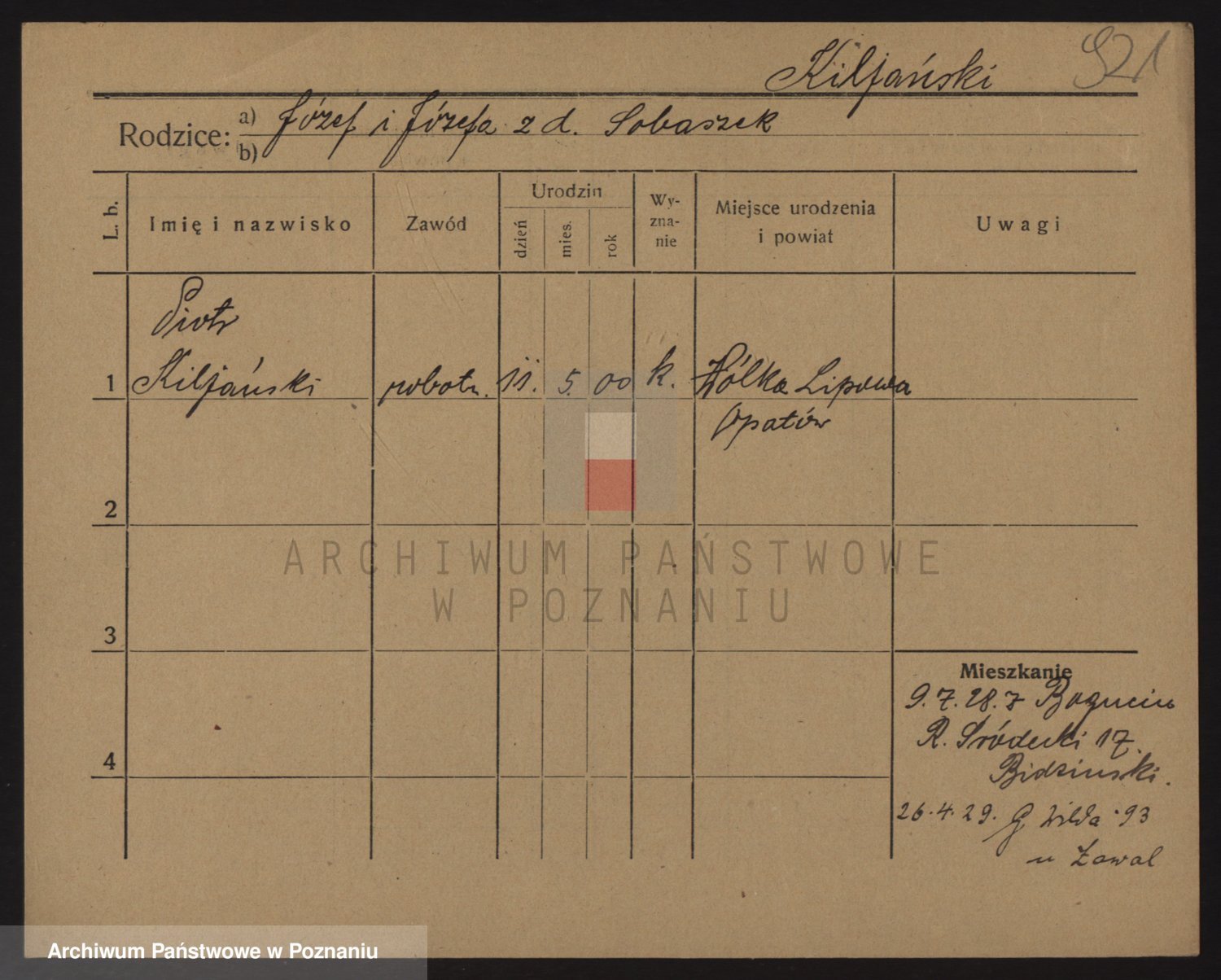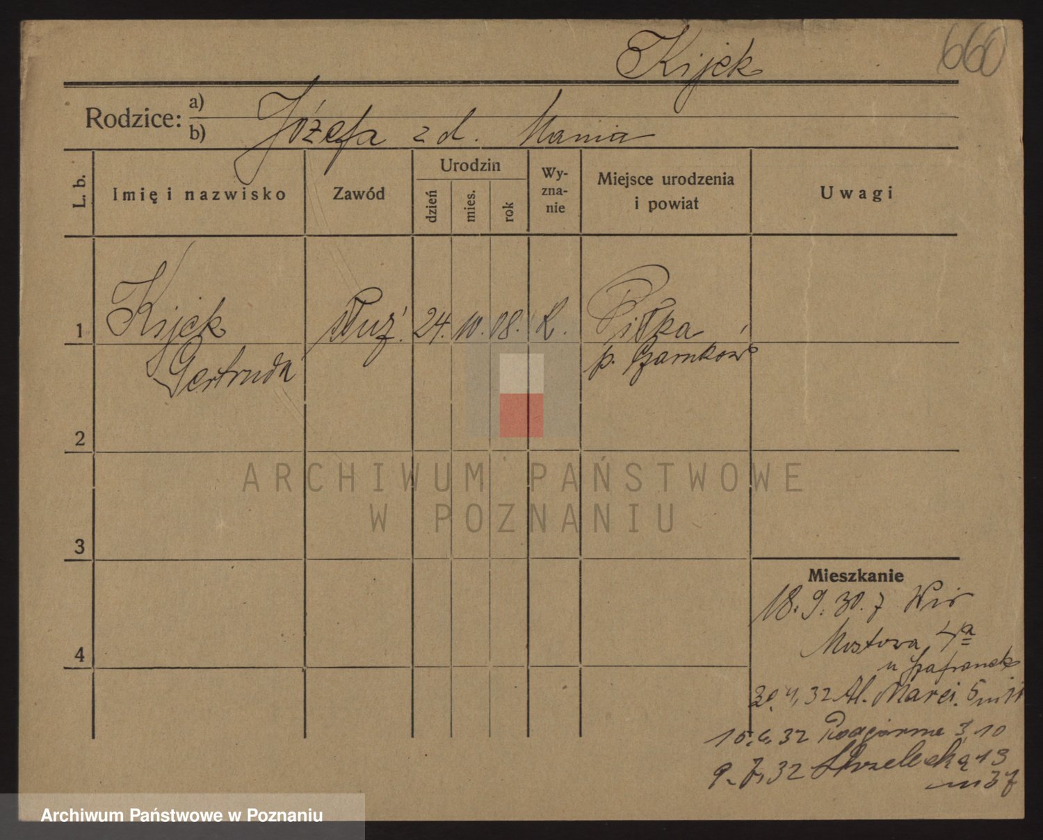 Podgląd karty osobowej dostępny jest po kliknięciu na nazwisko lub ikonkę karty. Można dokonywać powiększenia (ikony na górze) lub przechodzić między kolejnymi skanami (strzałki po bokach).