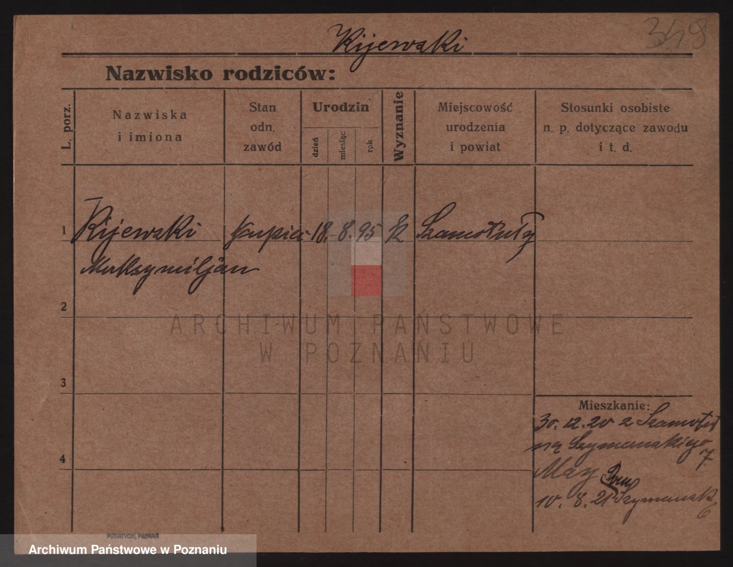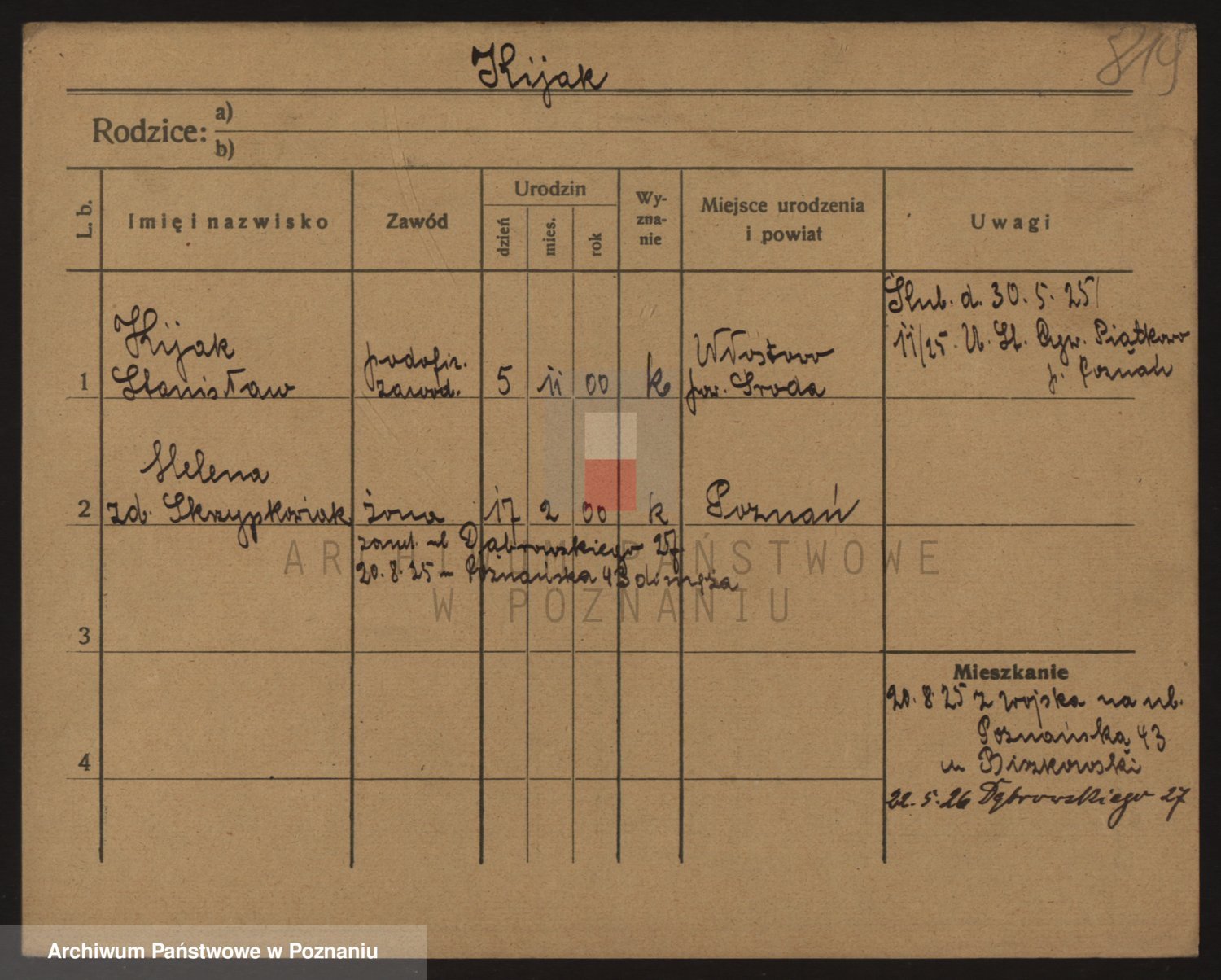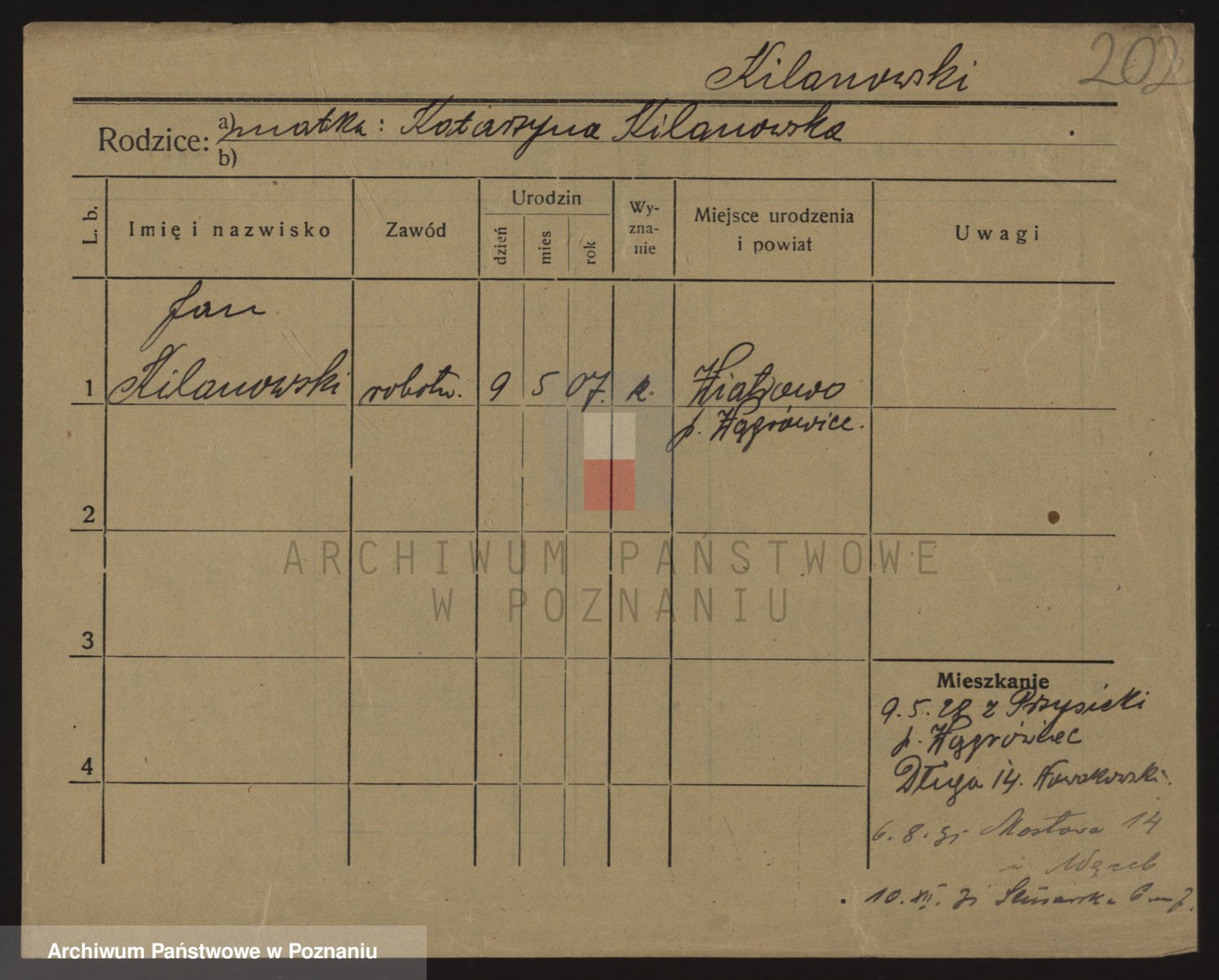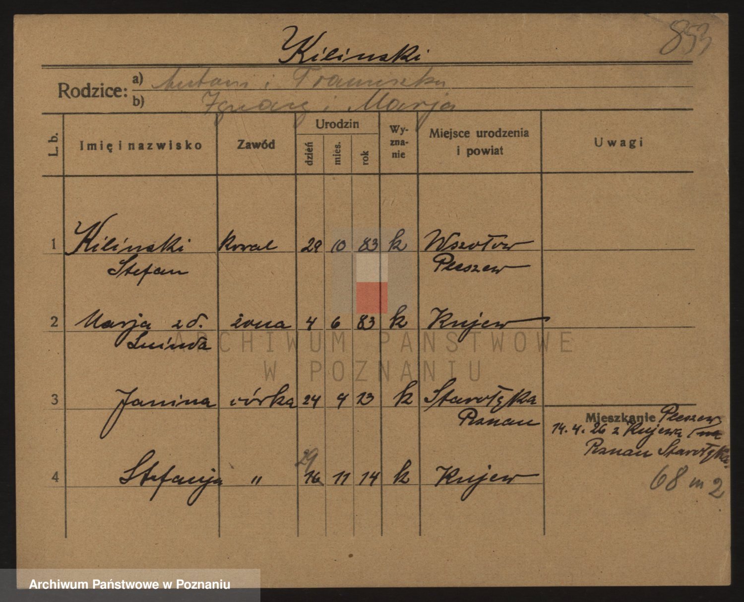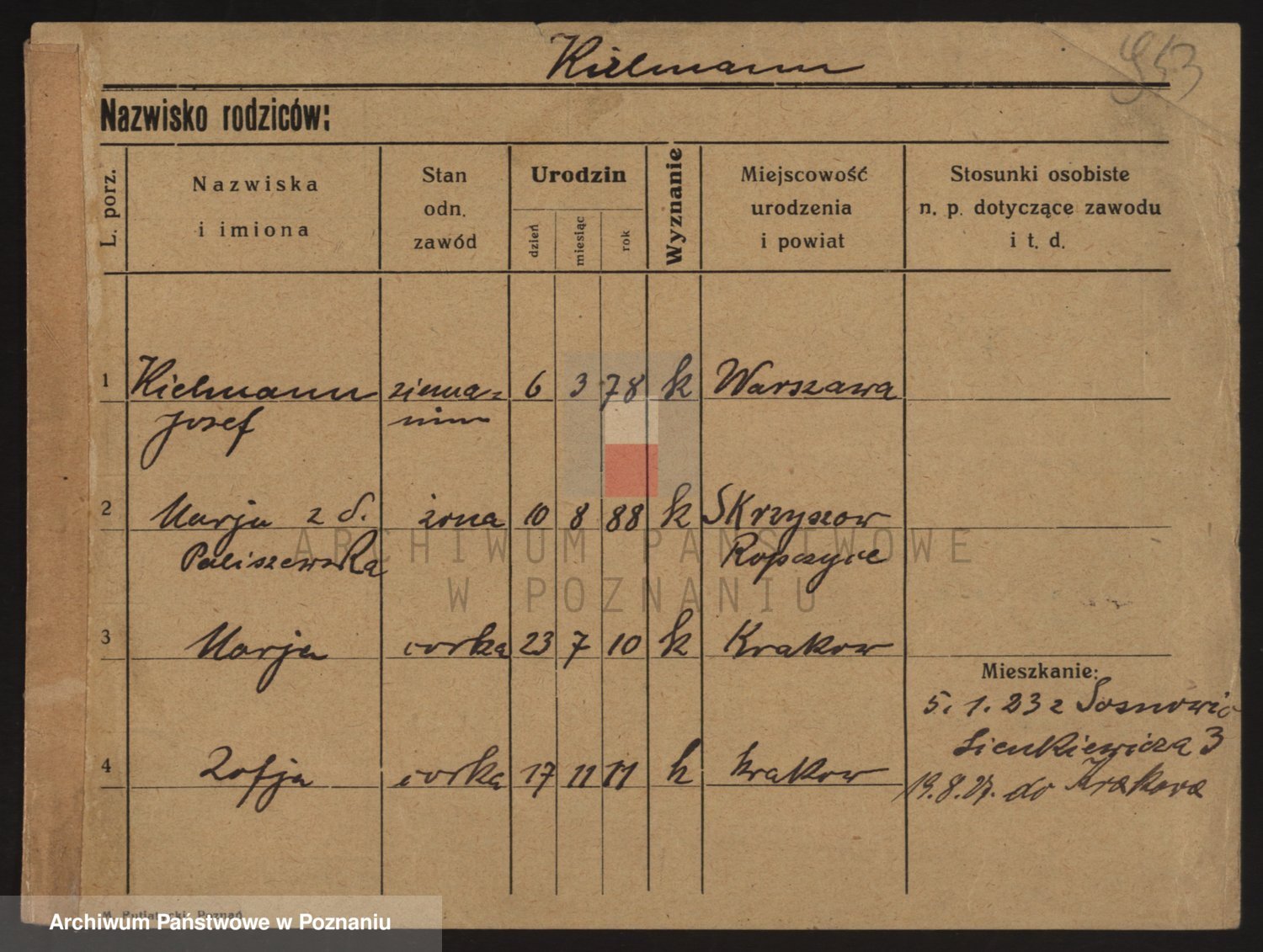 Podgląd karty osobowej dostępny jest po kliknięciu na nazwisko lub ikonkę karty. Można dokonywać powiększenia (ikony na górze) lub przechodzić między kolejnymi skanami (strzałki po bokach).