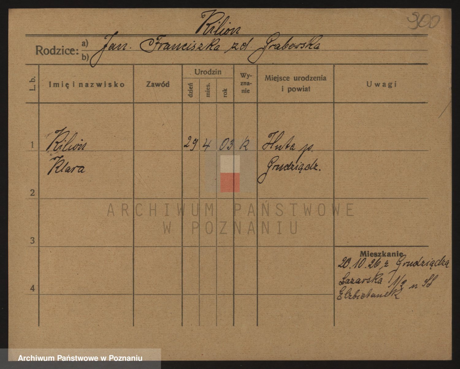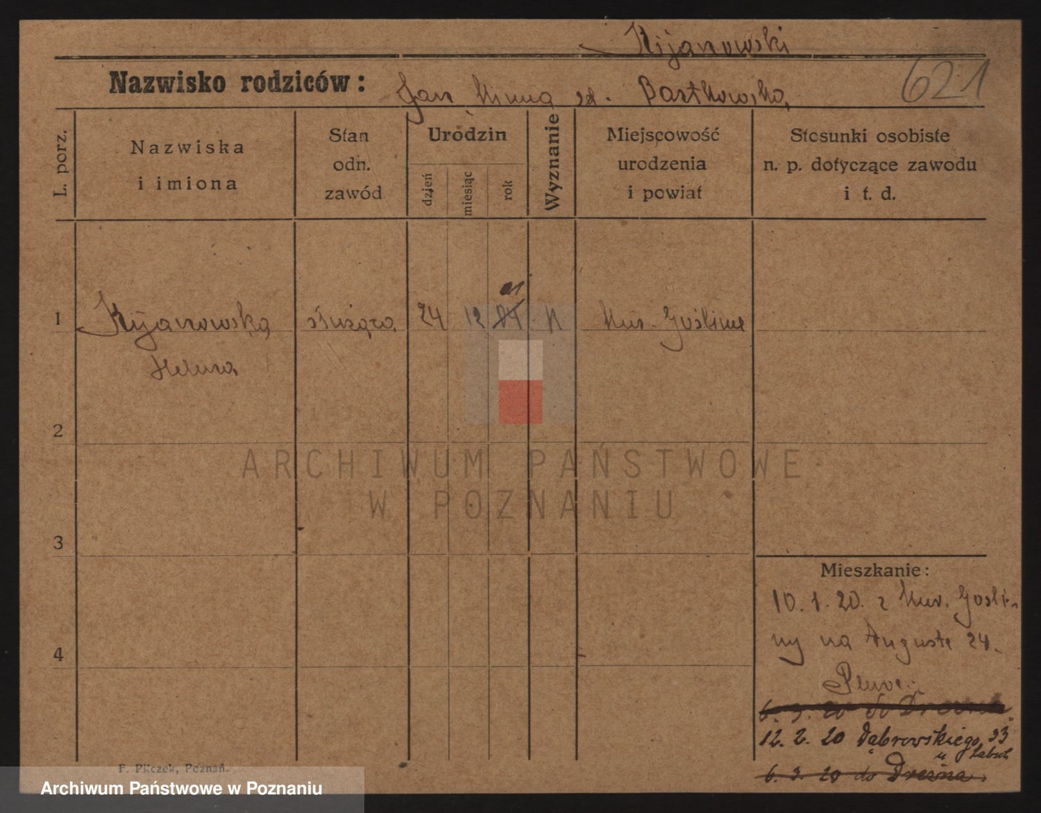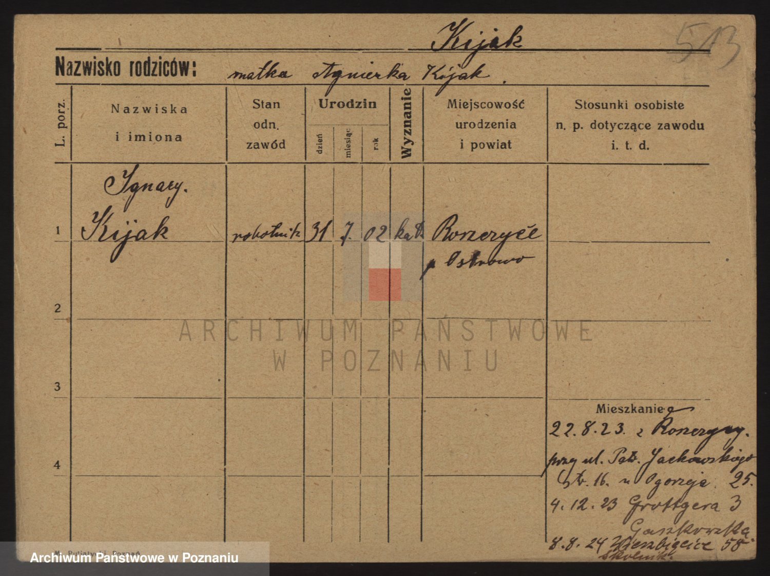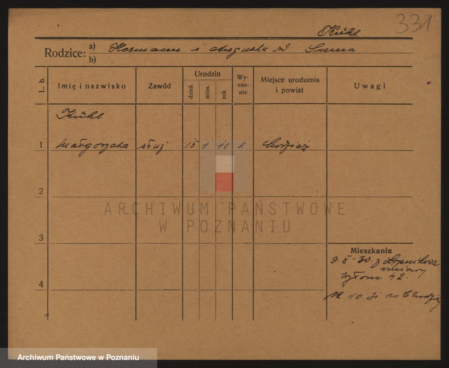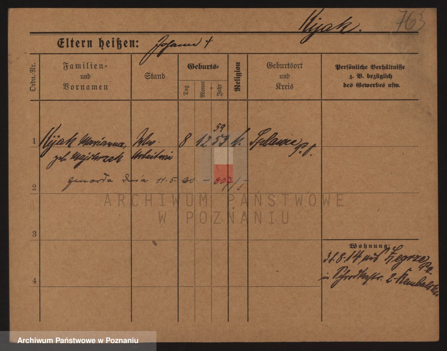 Podgląd karty osobowej dostępny jest po kliknięciu na nazwisko lub ikonkę karty. Można dokonywać powiększenia (ikony na górze) lub przechodzić między kolejnymi skanami (strzałki po bokach).