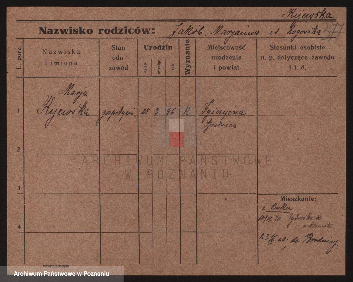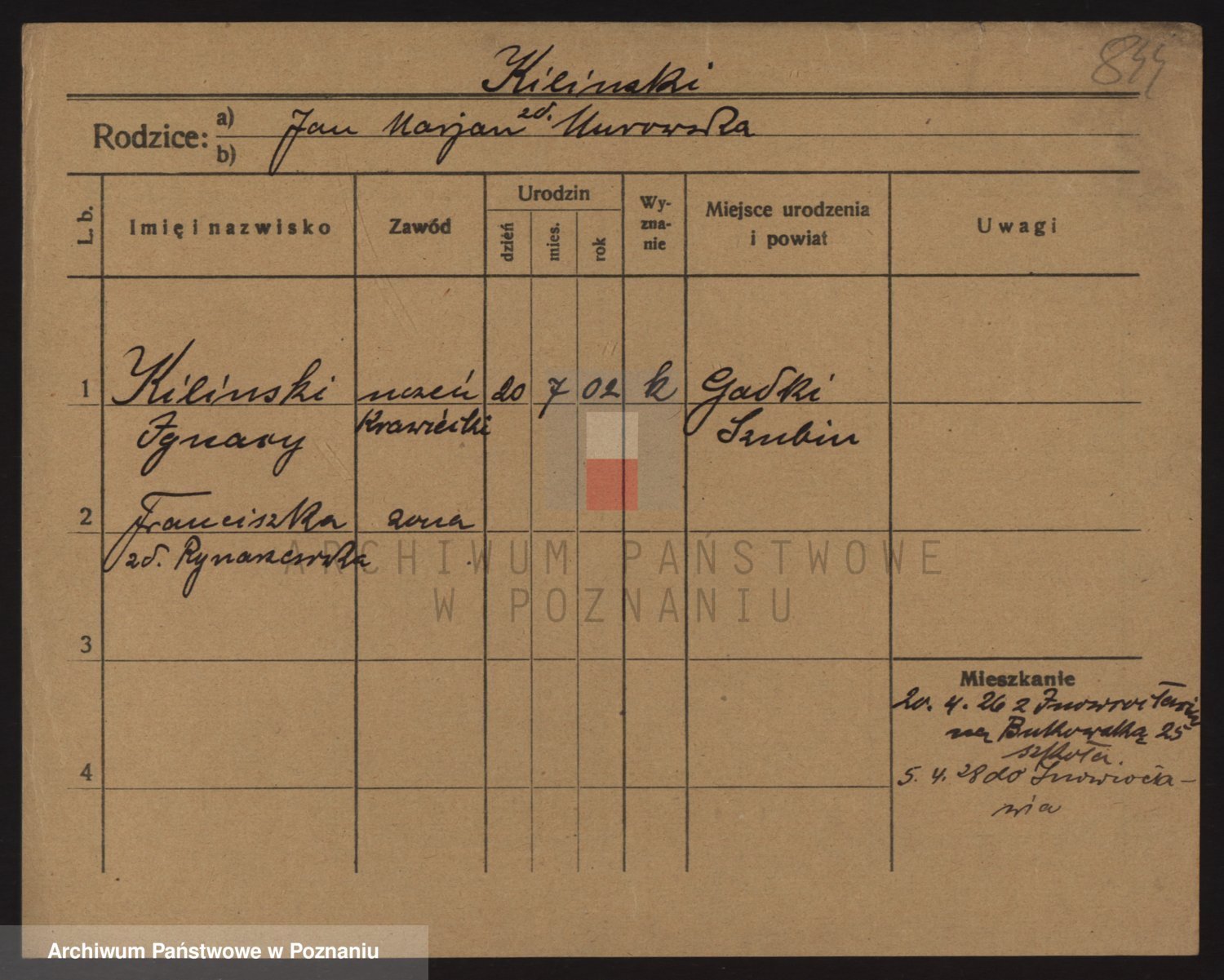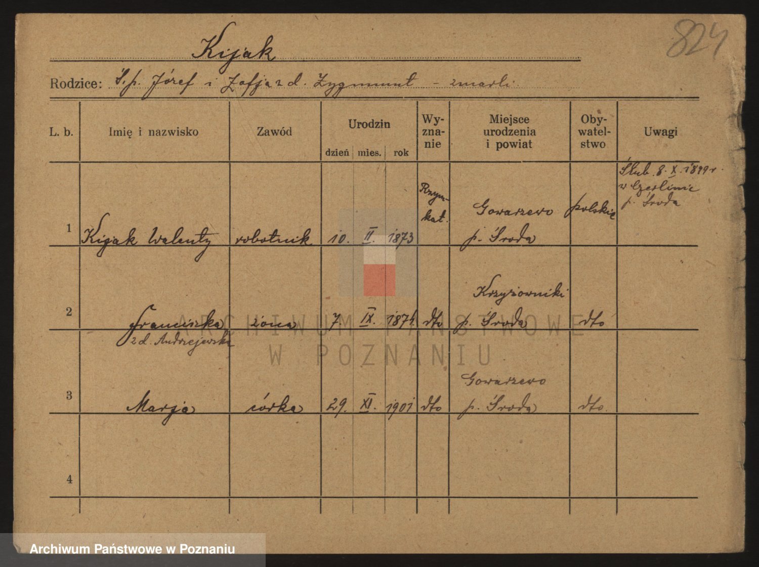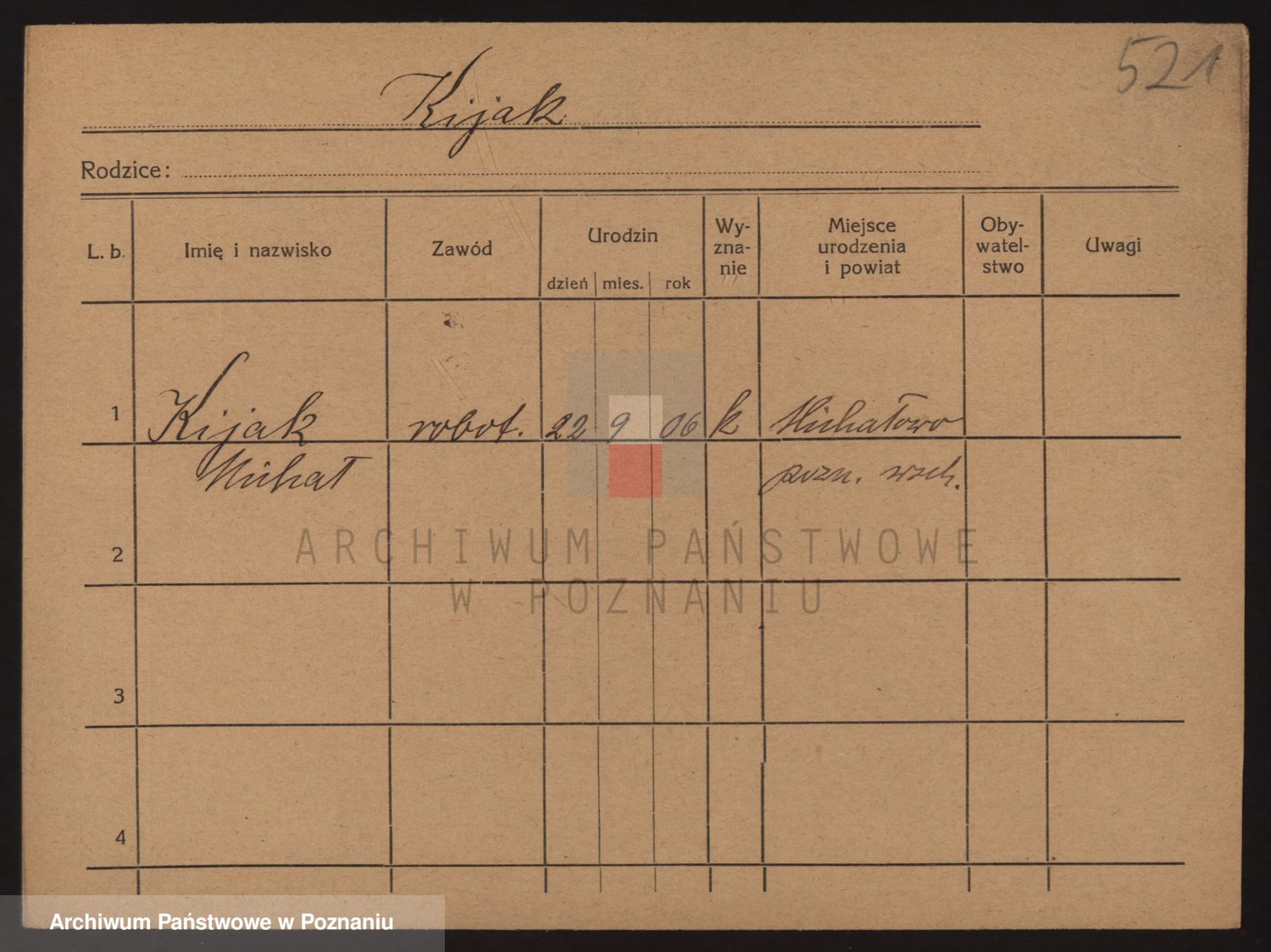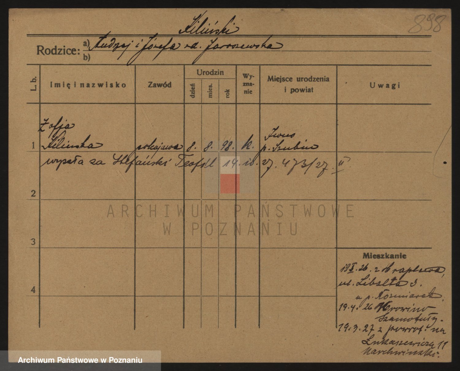 Podgląd karty osobowej dostępny jest po kliknięciu na nazwisko lub ikonkę karty. Można dokonywać powiększenia (ikony na górze) lub przechodzić między kolejnymi skanami (strzałki po bokach).