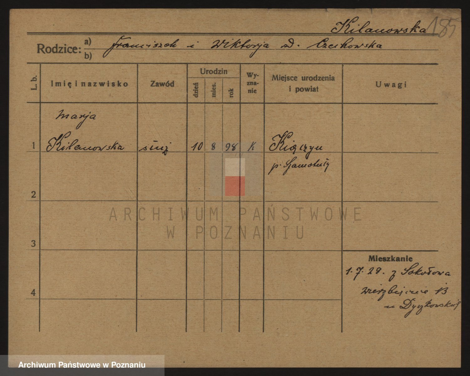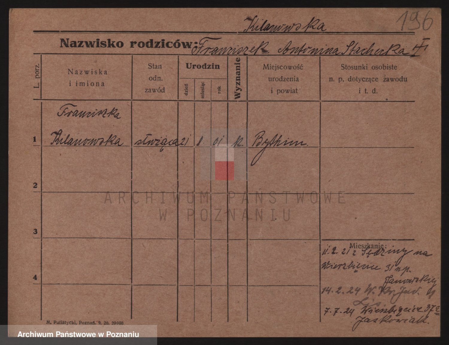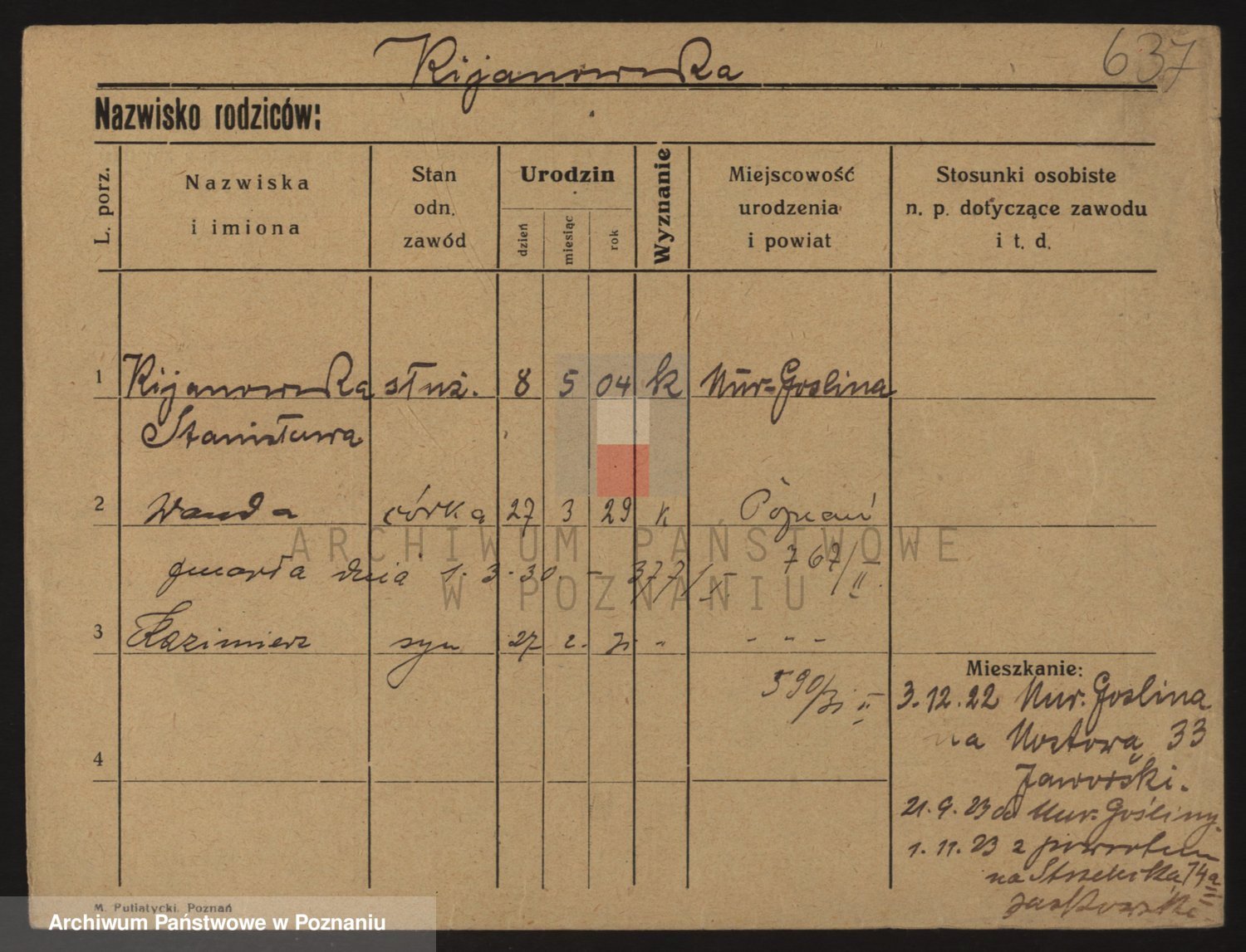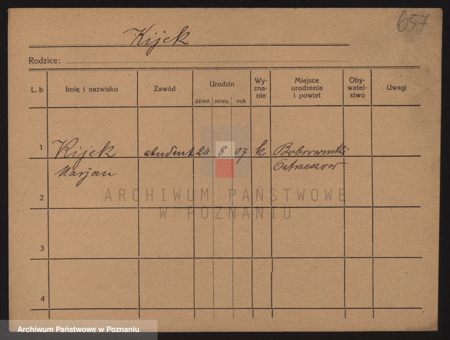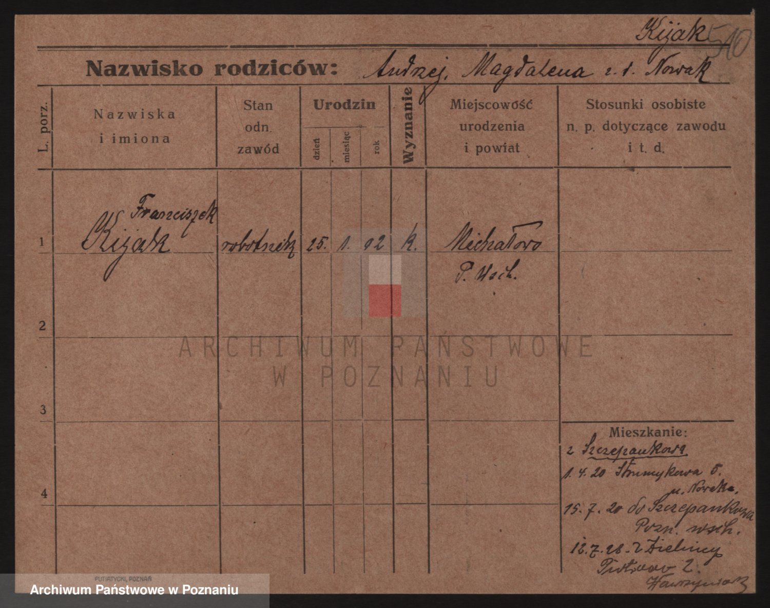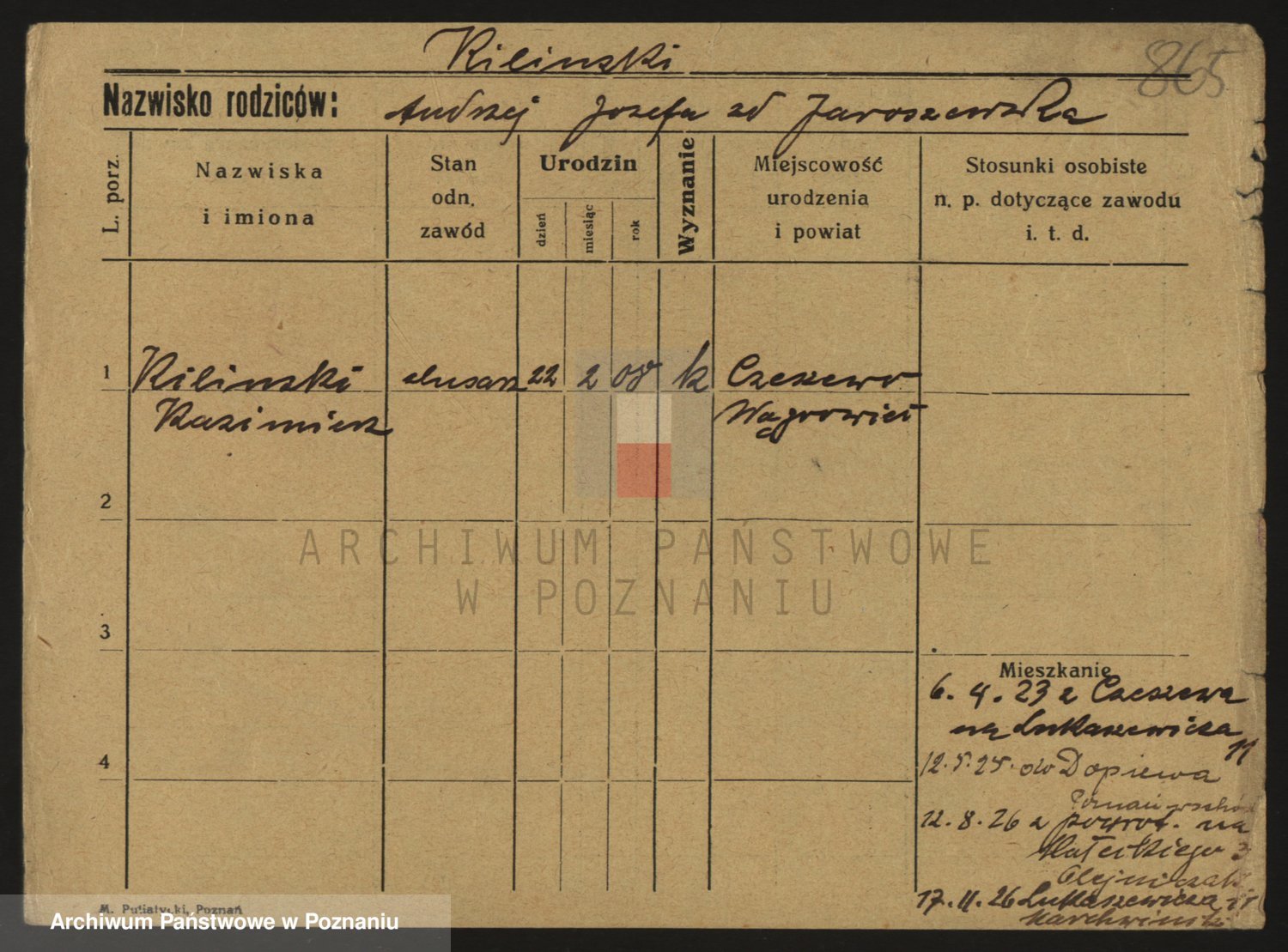 Podgląd karty osobowej dostępny jest po kliknięciu na nazwisko lub ikonkę karty. Można dokonywać powiększenia (ikony na górze) lub przechodzić między kolejnymi skanami (strzałki po bokach).