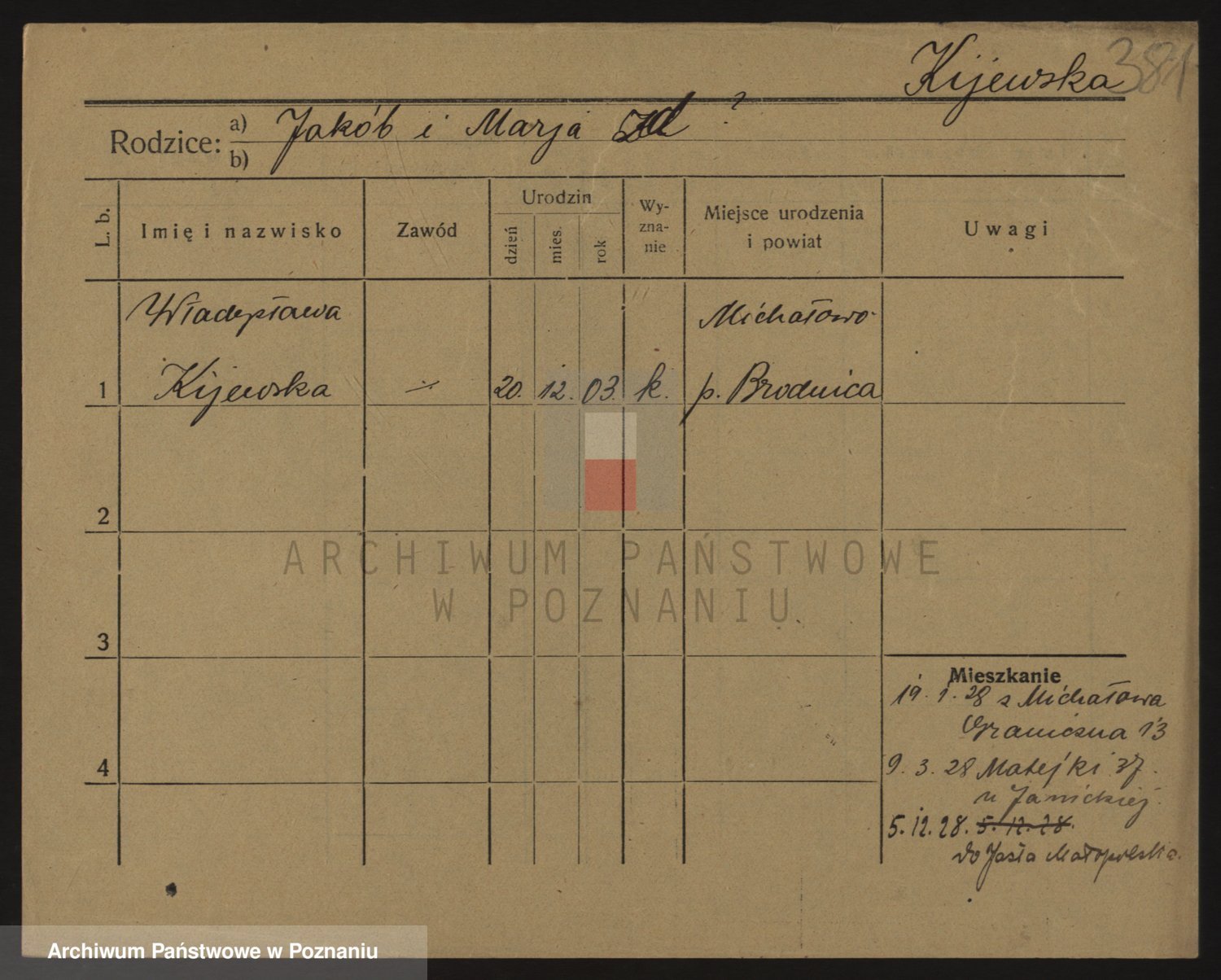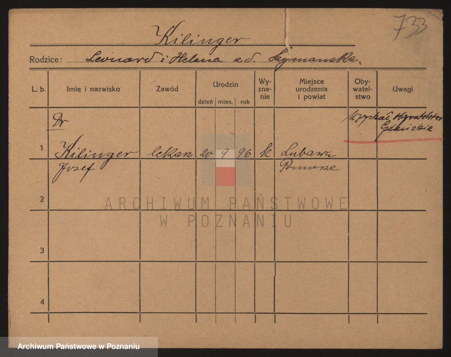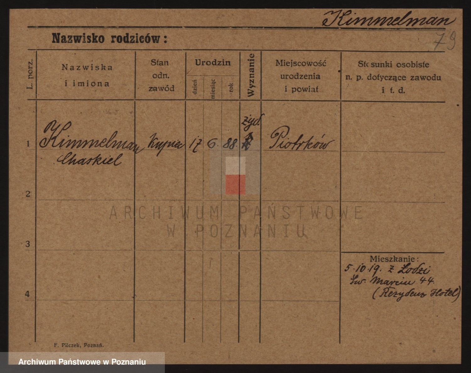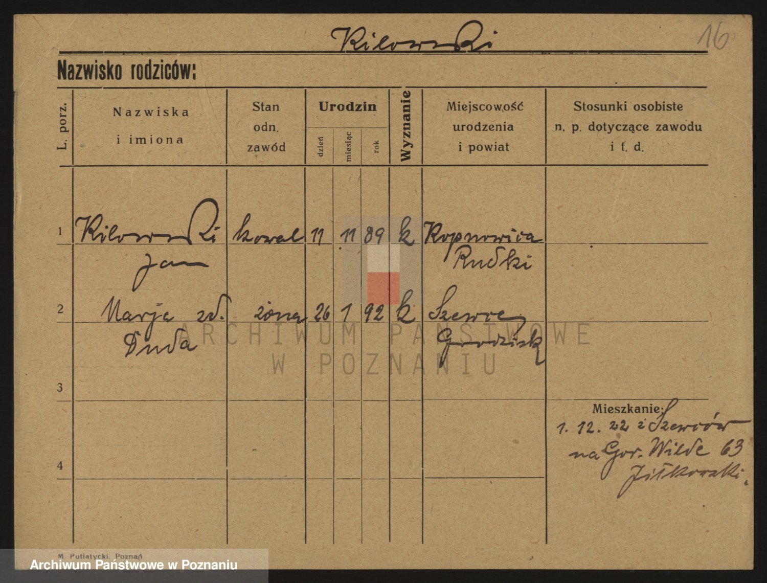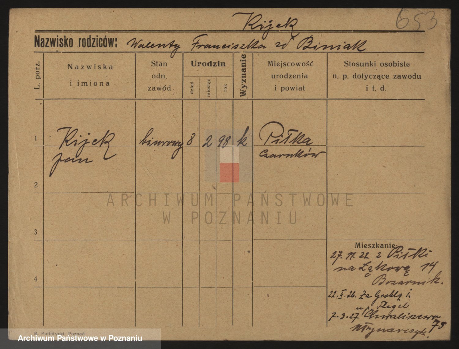 Podgląd karty osobowej dostępny jest po kliknięciu na nazwisko lub ikonkę karty. Można dokonywać powiększenia (ikony na górze) lub przechodzić między kolejnymi skanami (strzałki po bokach).