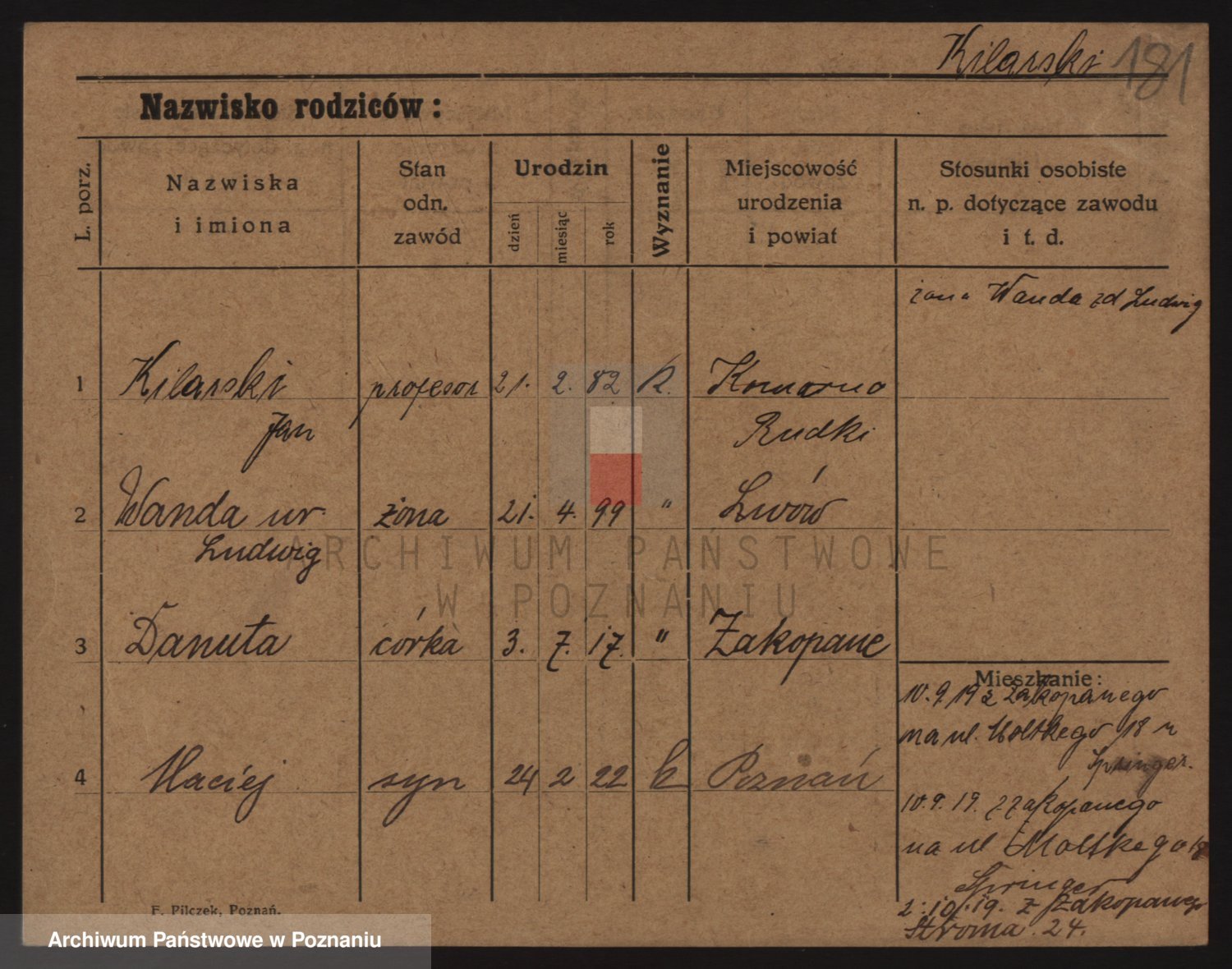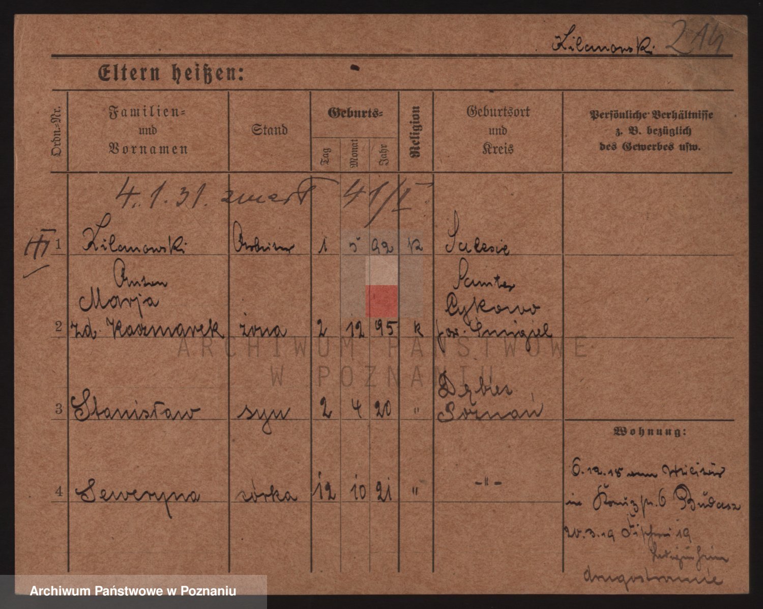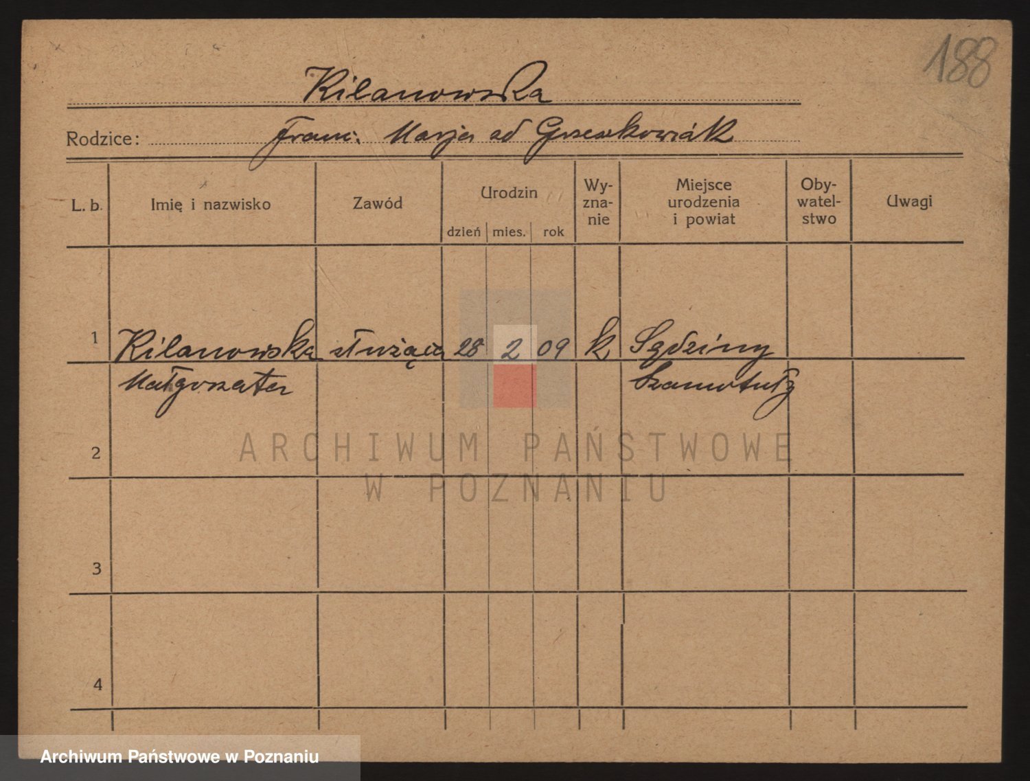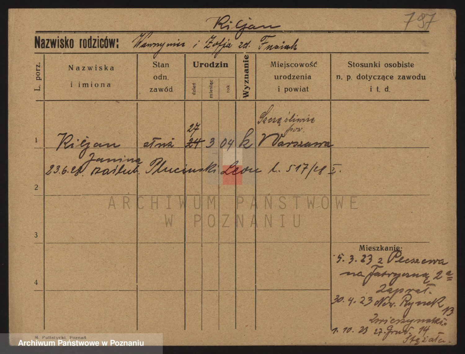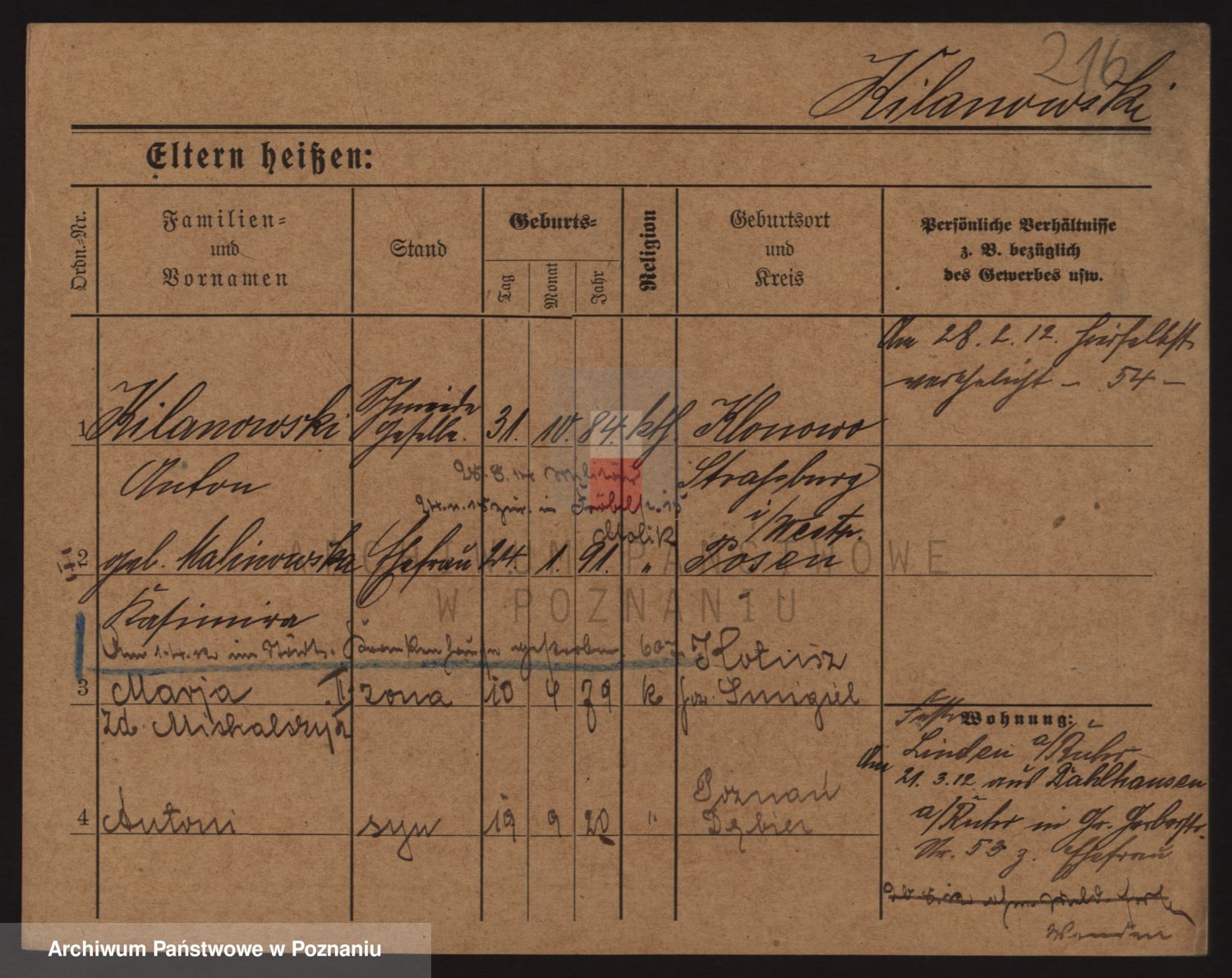 Podgląd karty osobowej dostępny jest po kliknięciu na nazwisko lub ikonkę karty. Można dokonywać powiększenia (ikony na górze) lub przechodzić między kolejnymi skanami (strzałki po bokach).