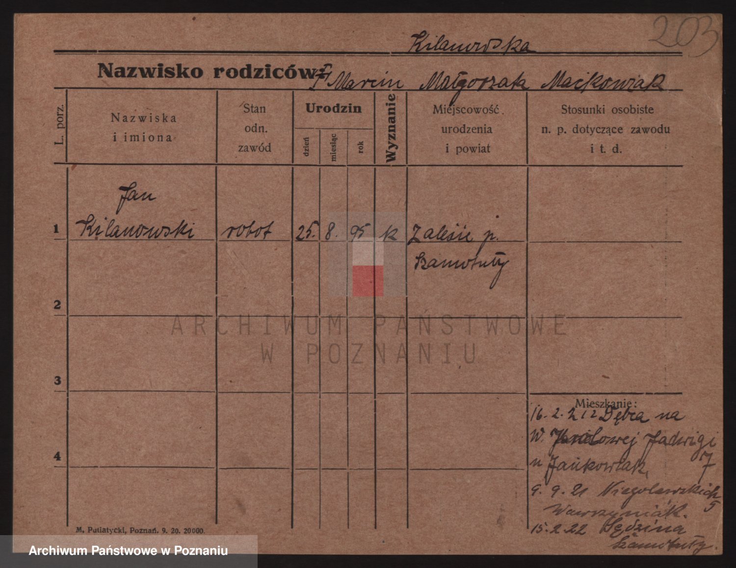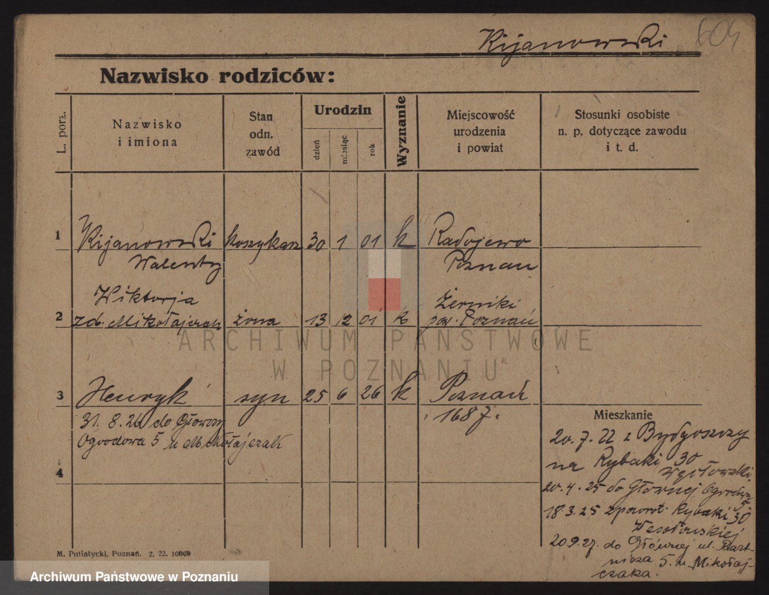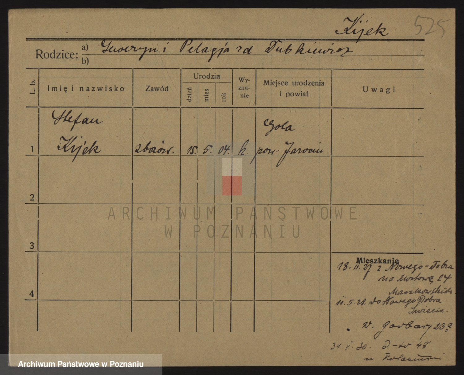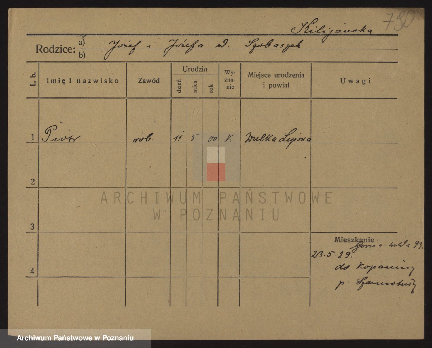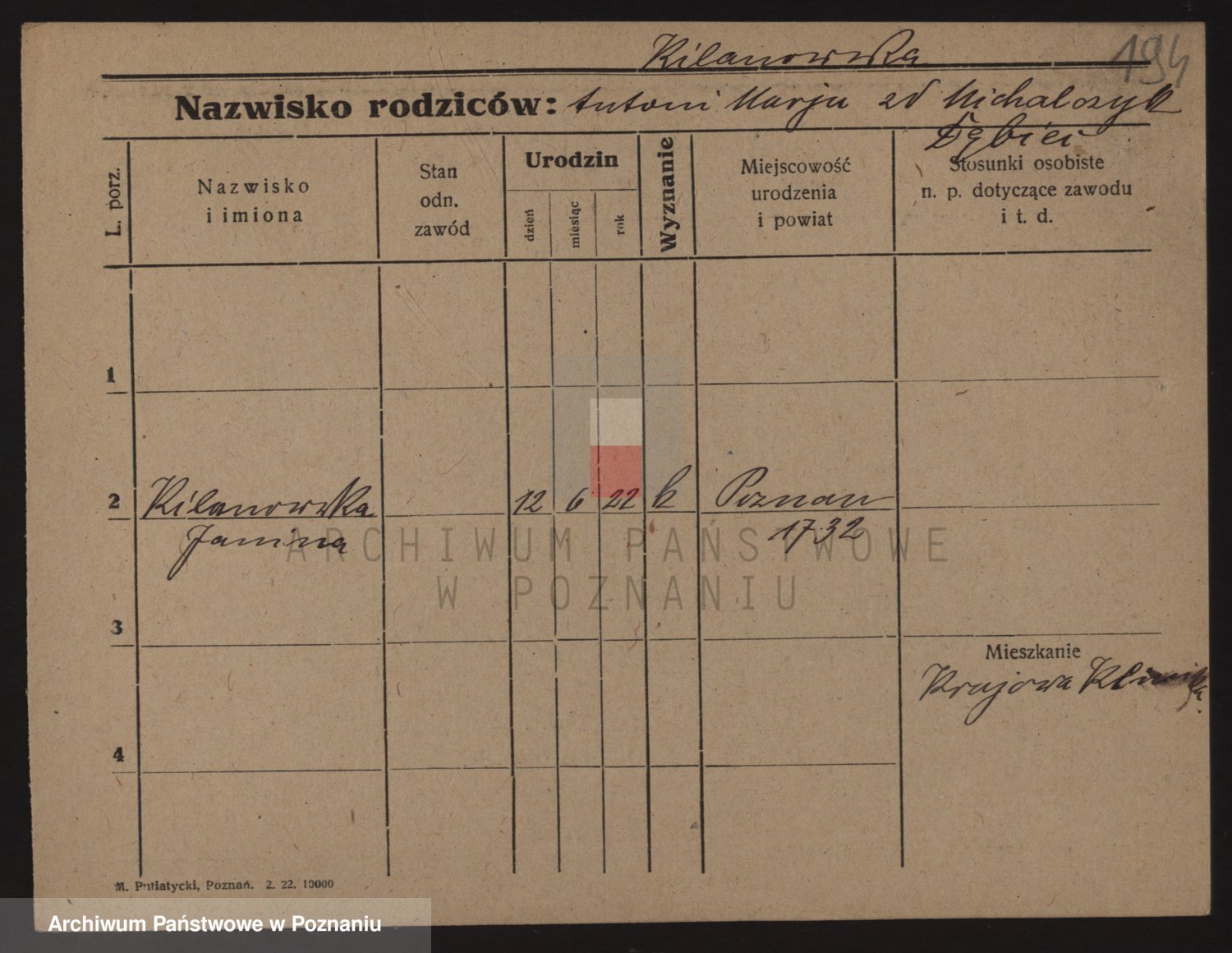 Podgląd karty osobowej dostępny jest po kliknięciu na nazwisko lub ikonkę karty. Można dokonywać powiększenia (ikony na górze) lub przechodzić między kolejnymi skanami (strzałki po bokach).