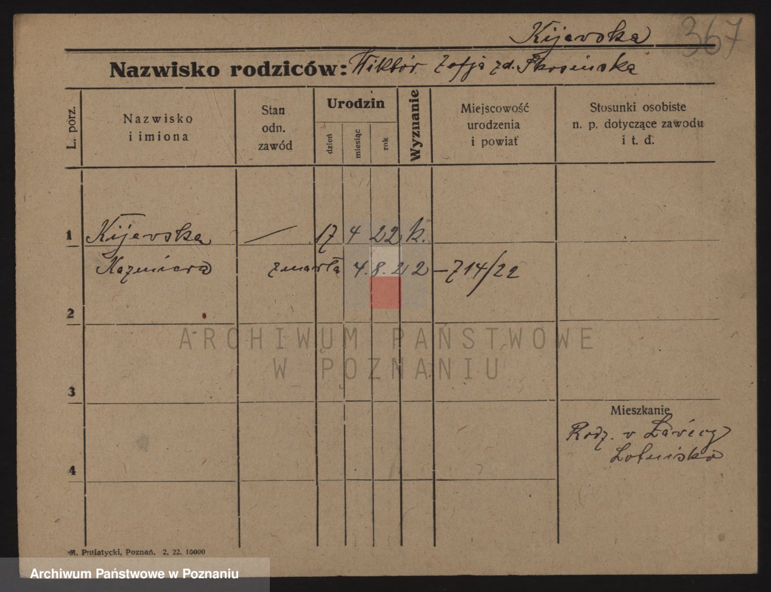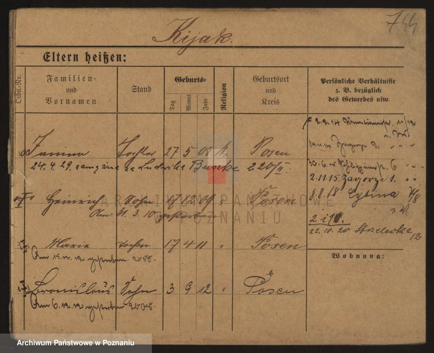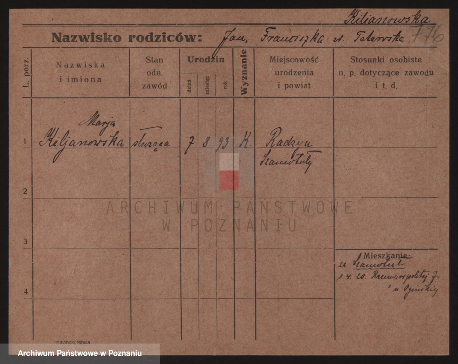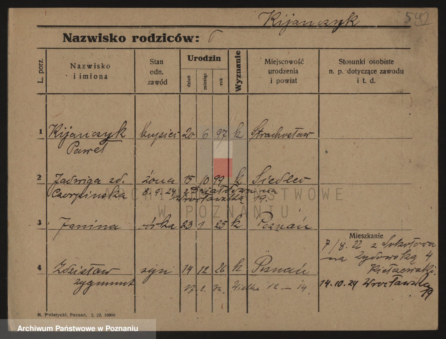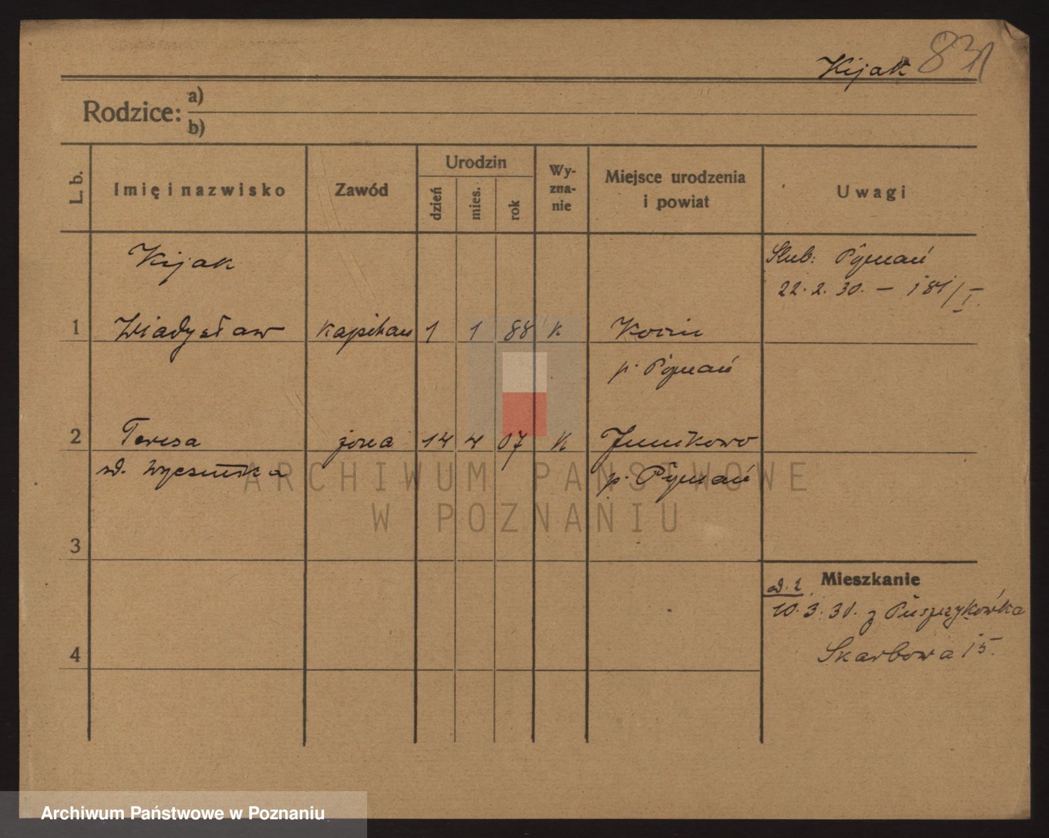 Podgląd karty osobowej dostępny jest po kliknięciu na nazwisko lub ikonkę karty. Można dokonywać powiększenia (ikony na górze) lub przechodzić między kolejnymi skanami (strzałki po bokach).