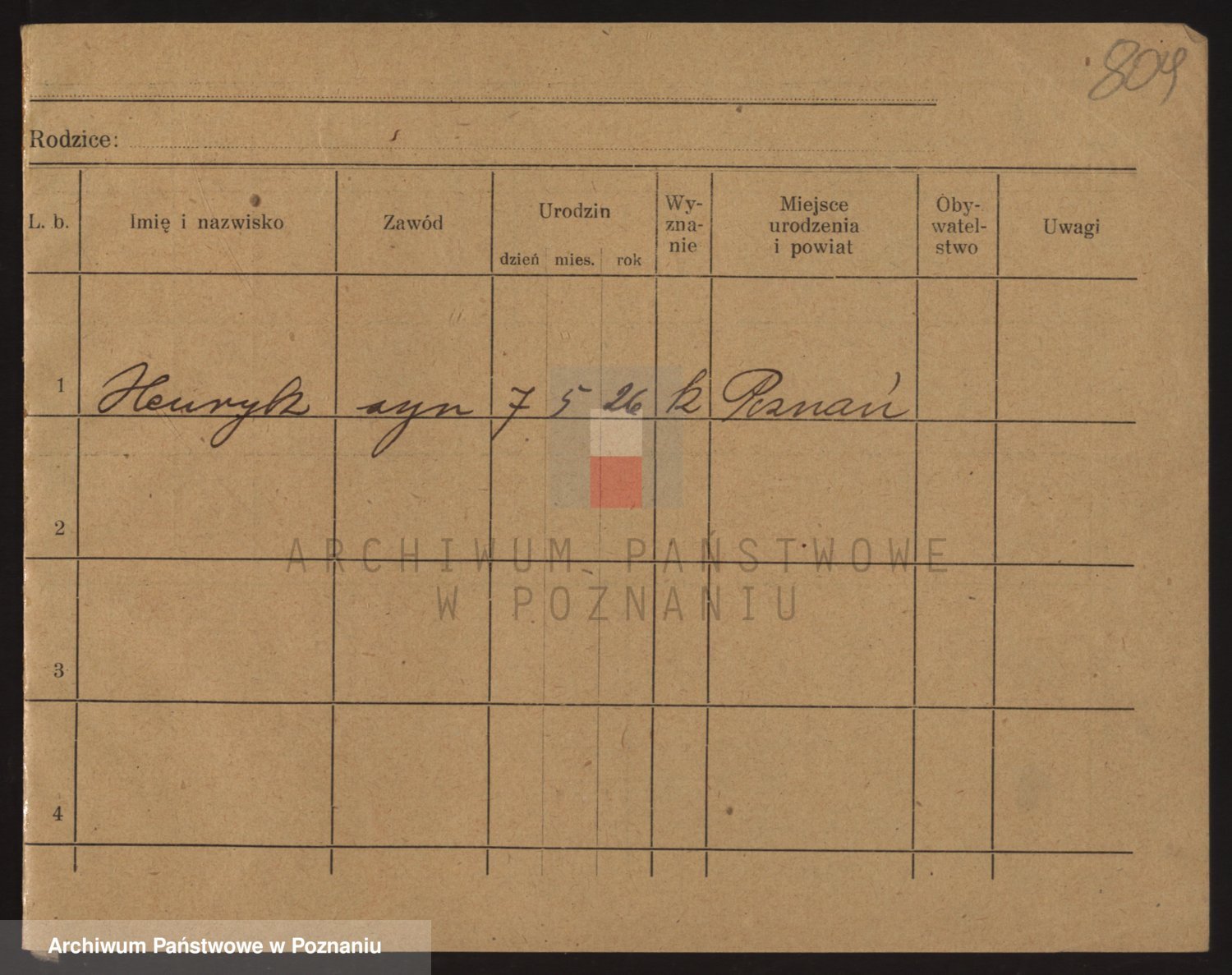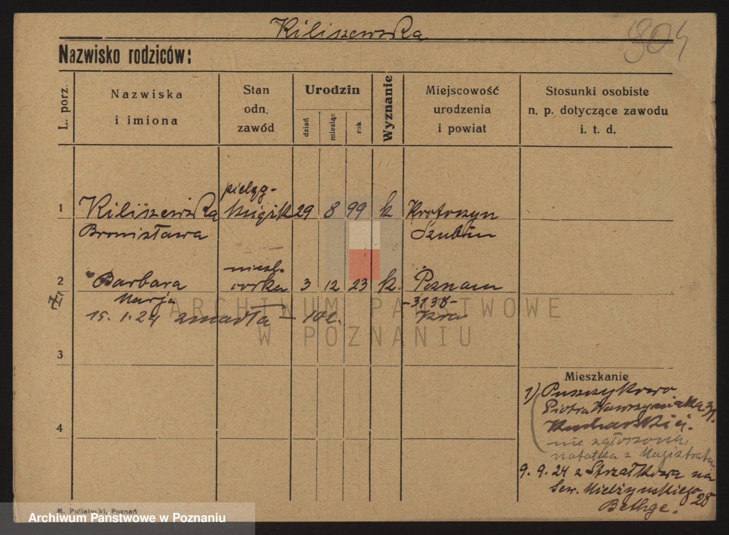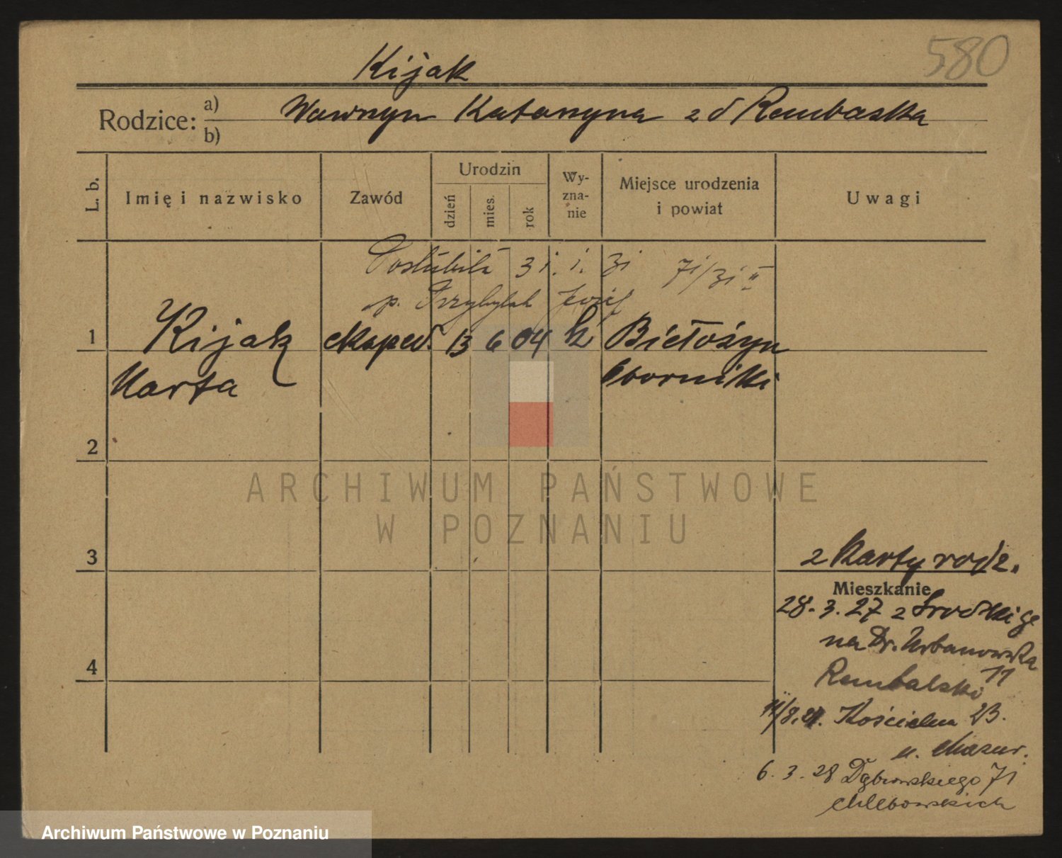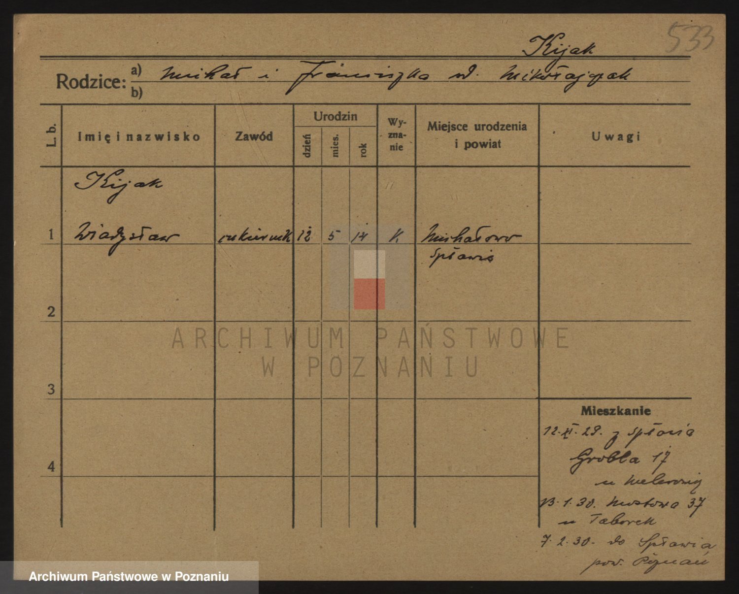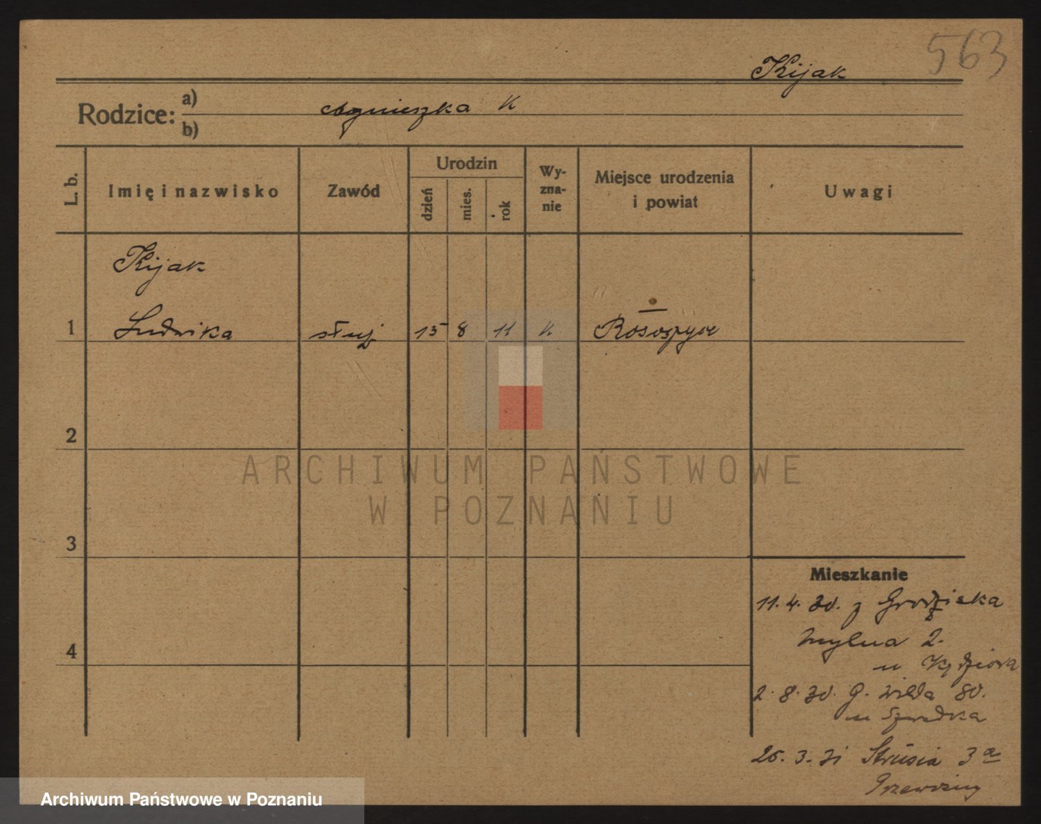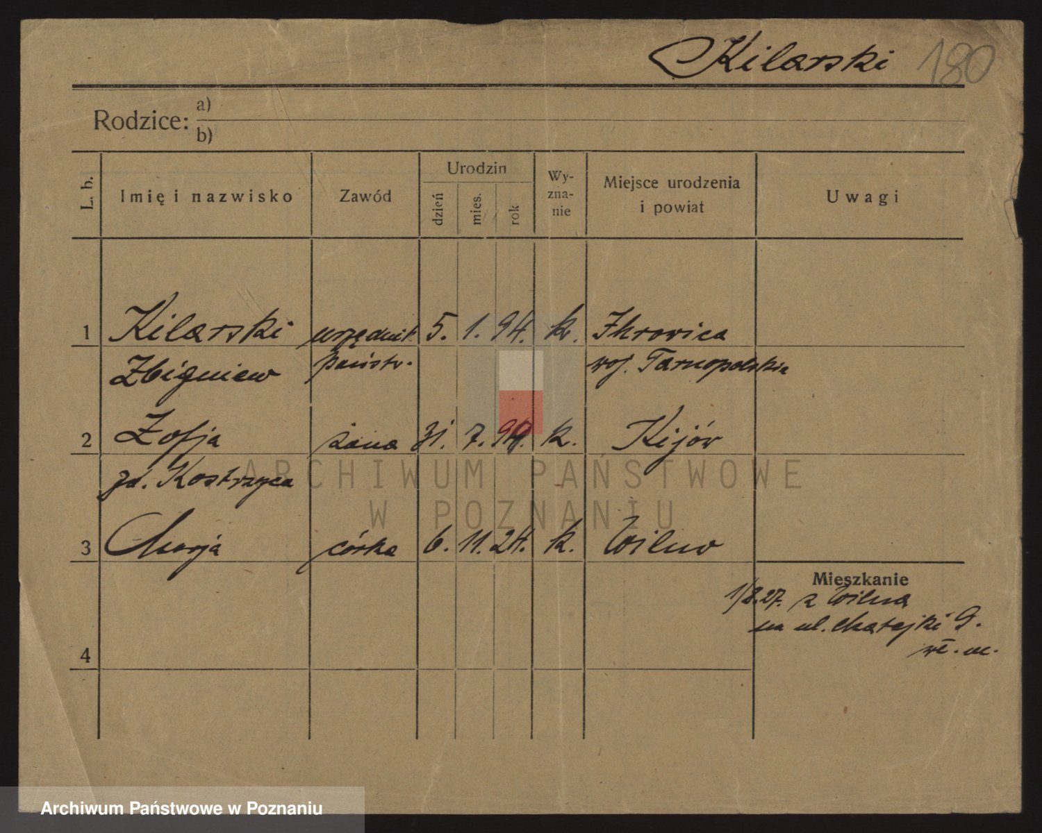 Podgląd karty osobowej dostępny jest po kliknięciu na nazwisko lub ikonkę karty. Można dokonywać powiększenia (ikony na górze) lub przechodzić między kolejnymi skanami (strzałki po bokach).