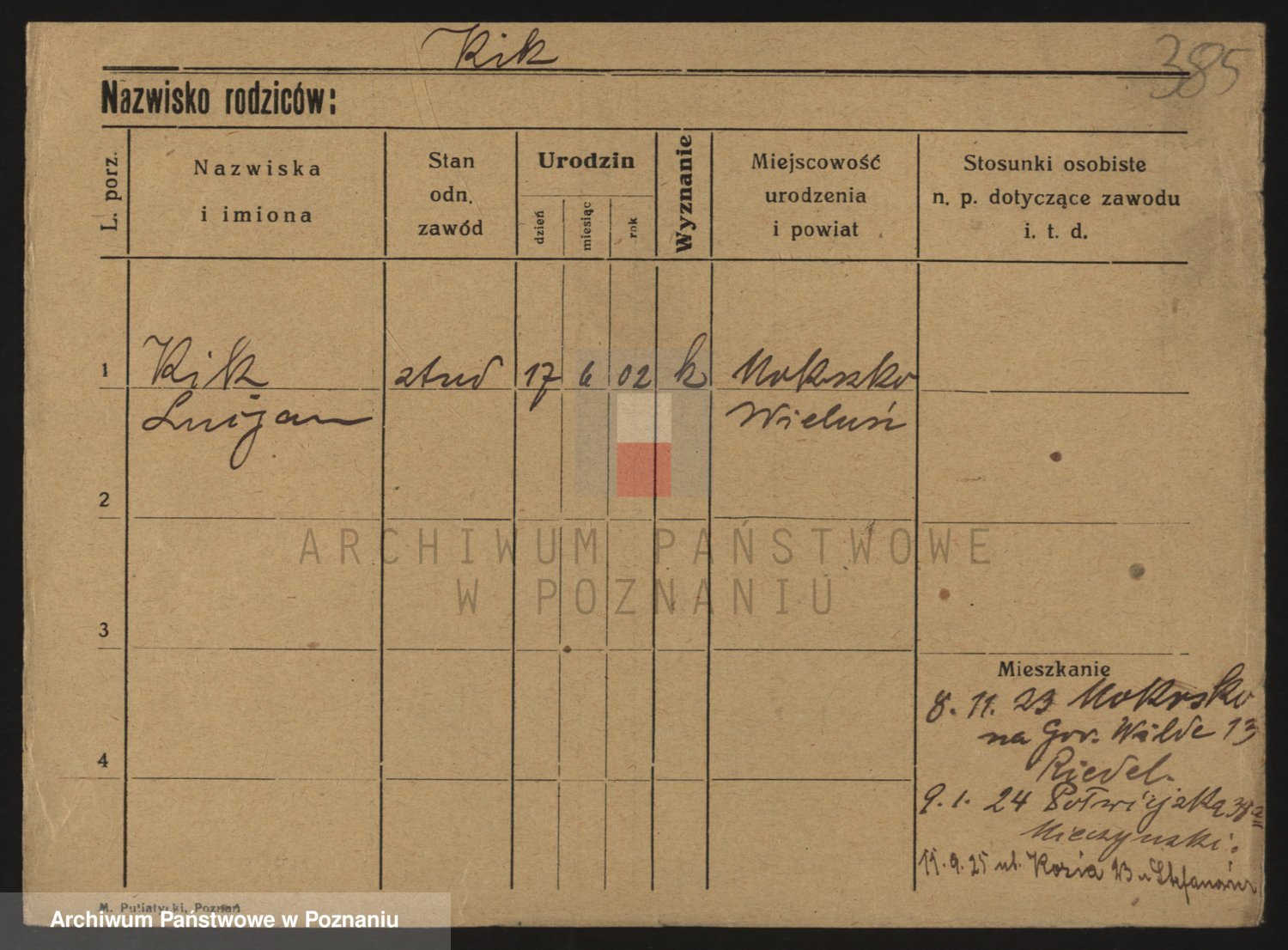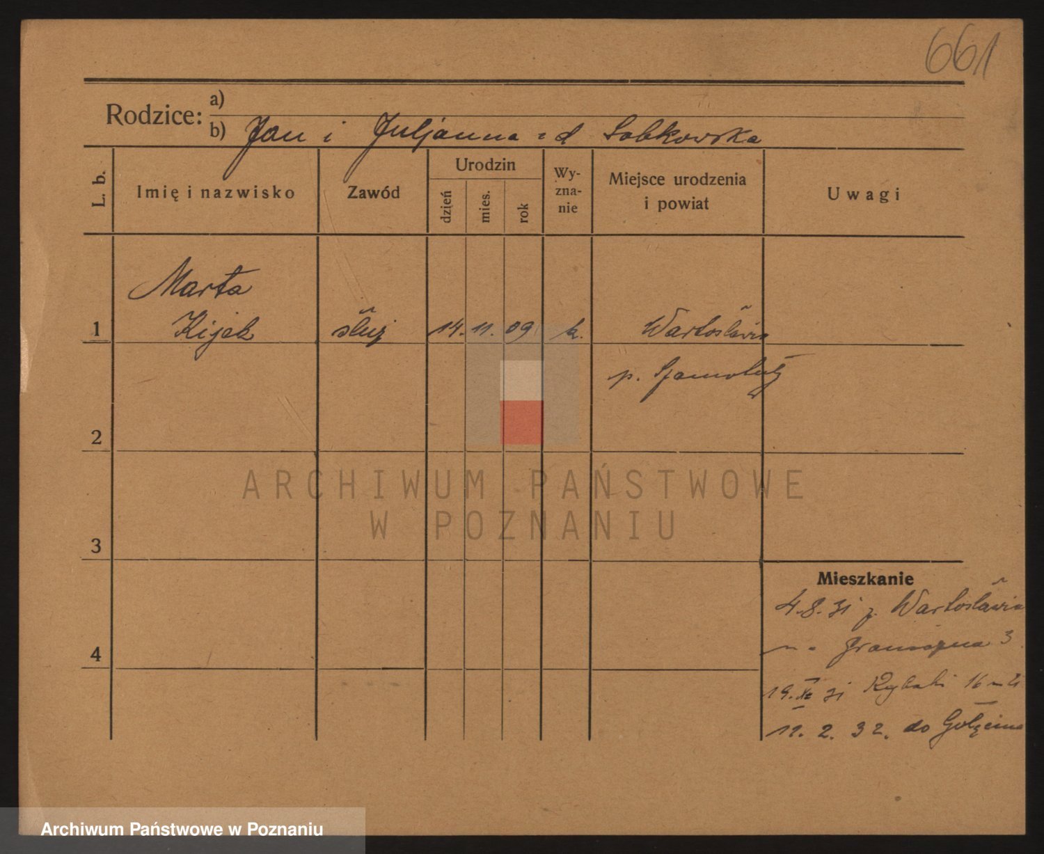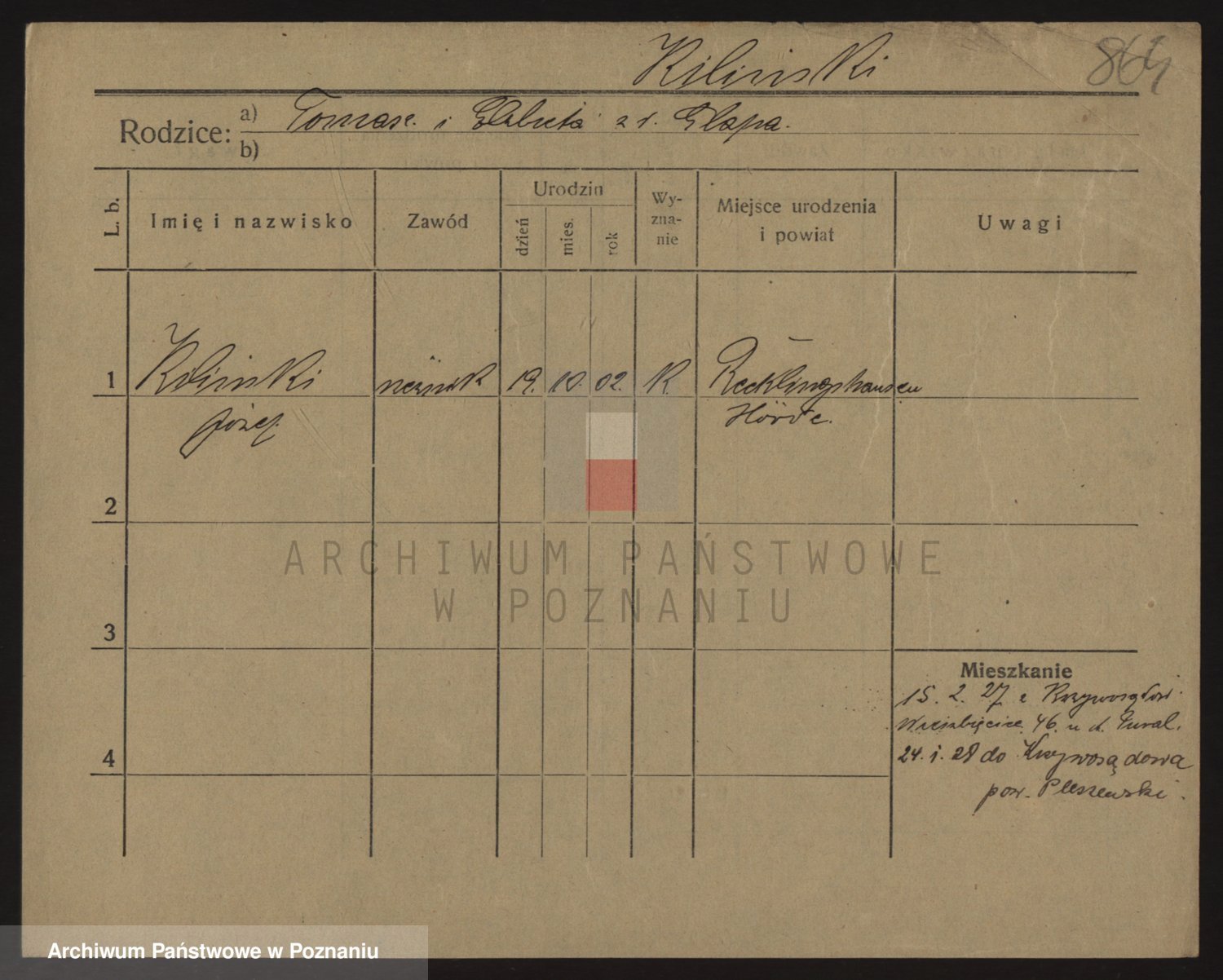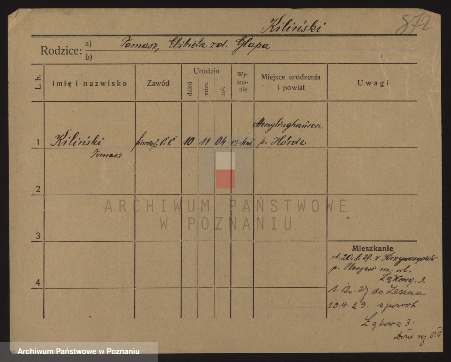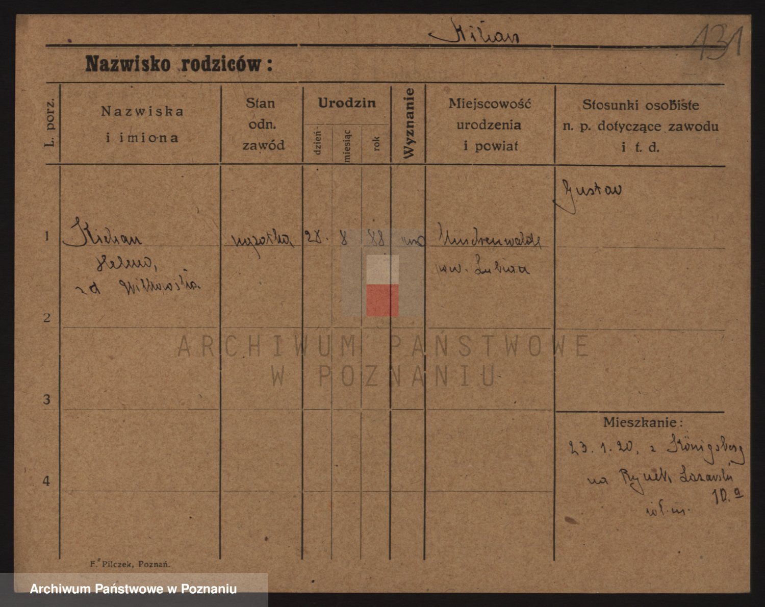 Podgląd karty osobowej dostępny jest po kliknięciu na nazwisko lub ikonkę karty. Można dokonywać powiększenia (ikony na górze) lub przechodzić między kolejnymi skanami (strzałki po bokach).
