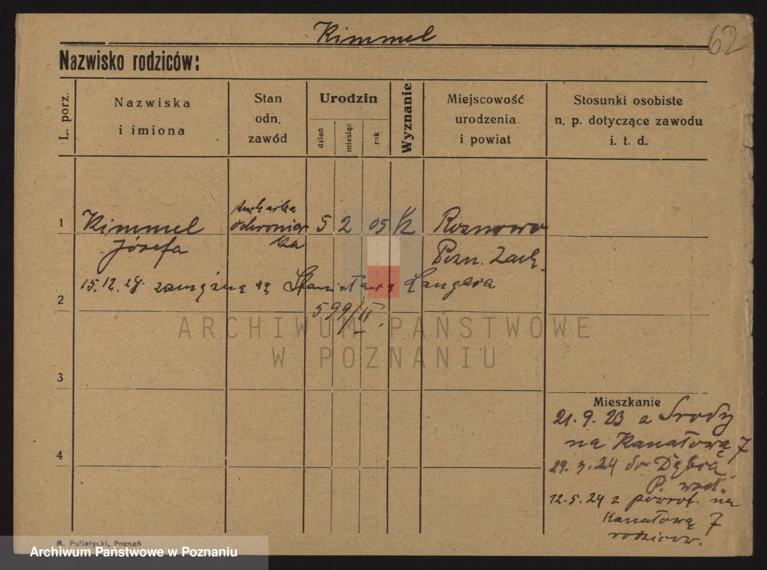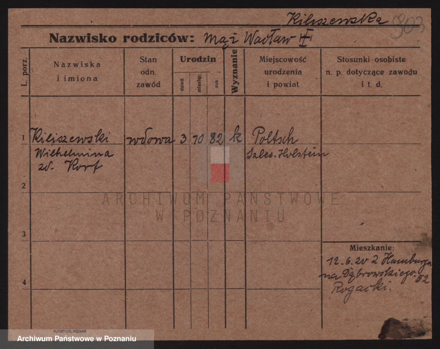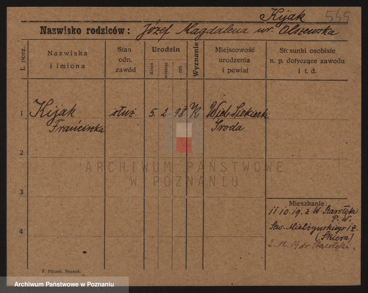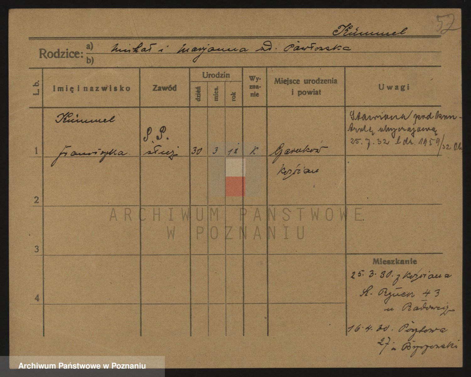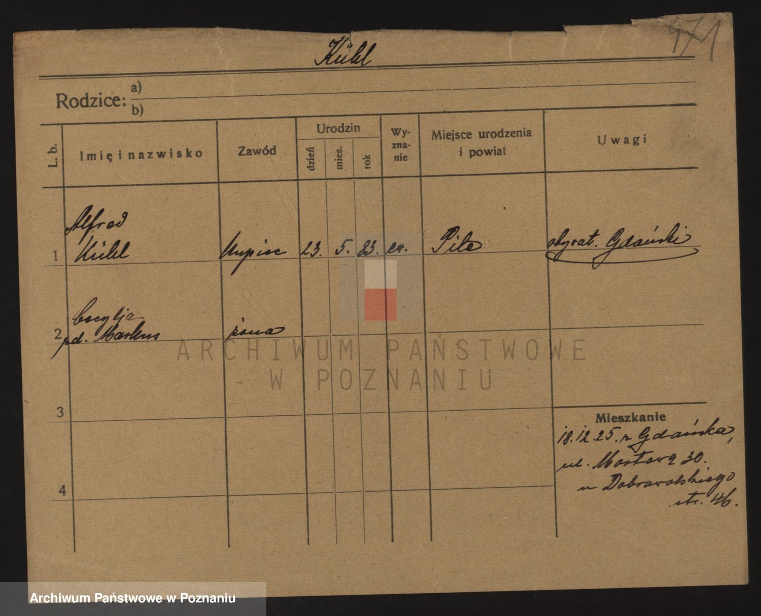 Podgląd karty osobowej dostępny jest po kliknięciu na nazwisko lub ikonkę karty. Można dokonywać powiększenia (ikony na górze) lub przechodzić między kolejnymi skanami (strzałki po bokach).