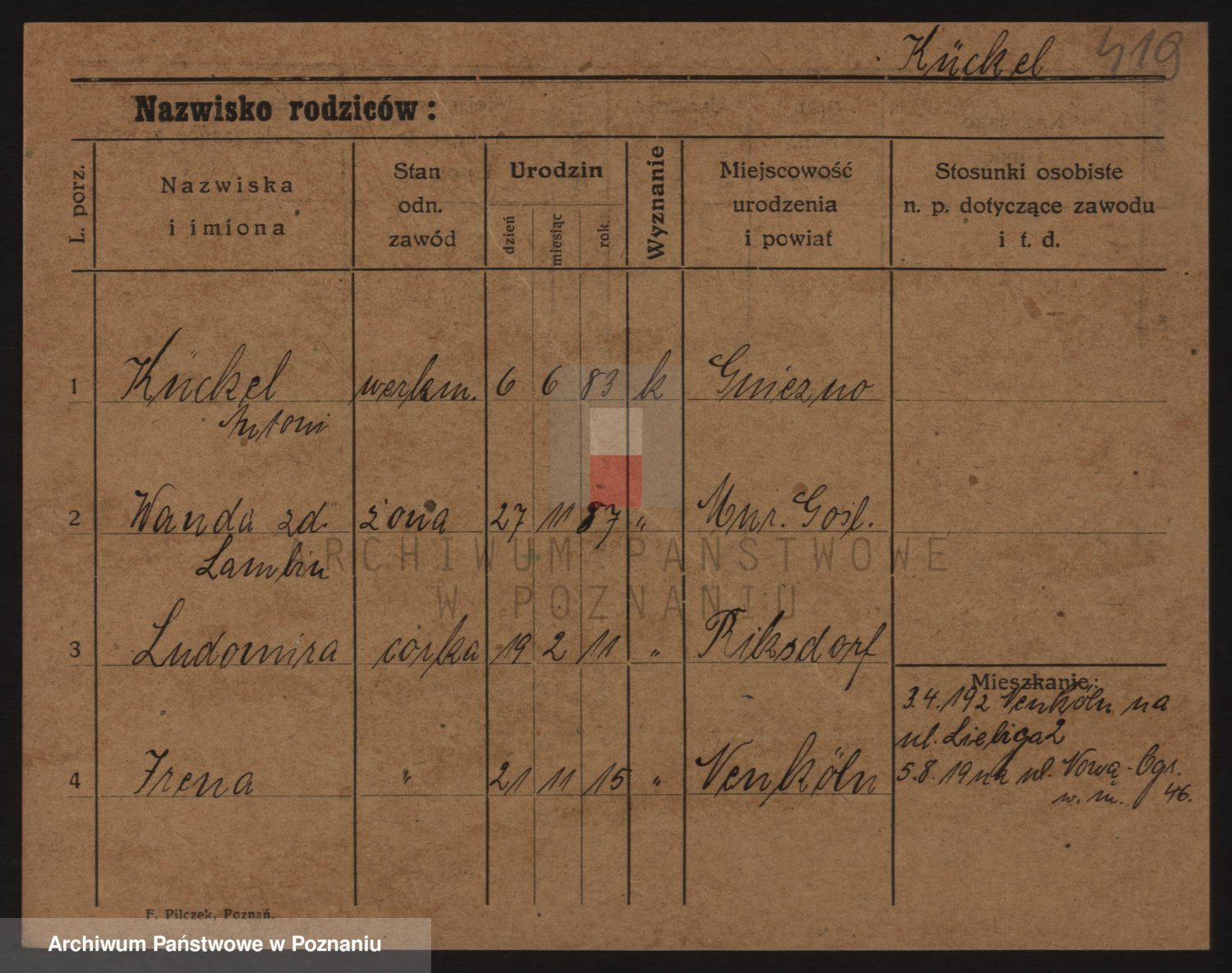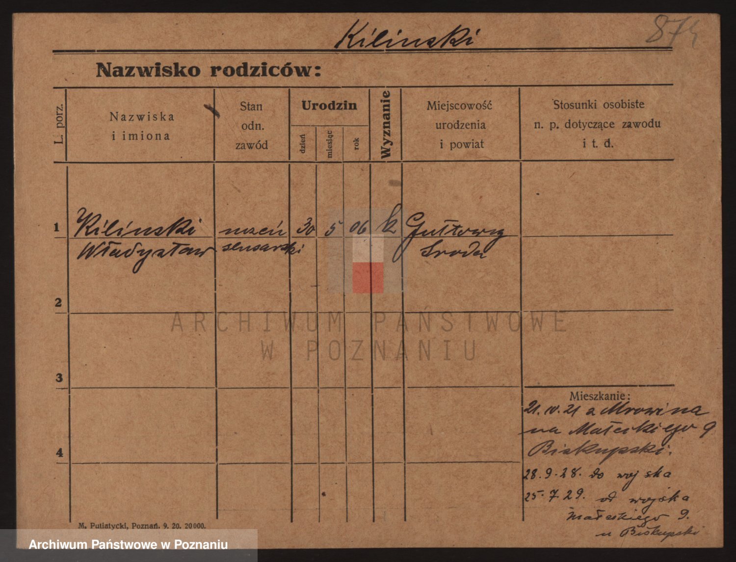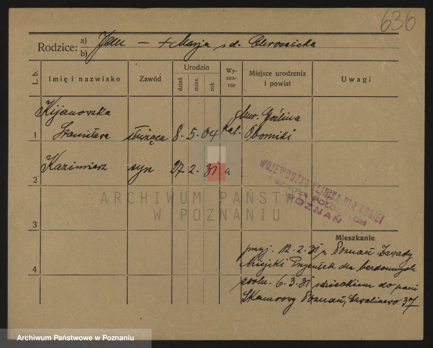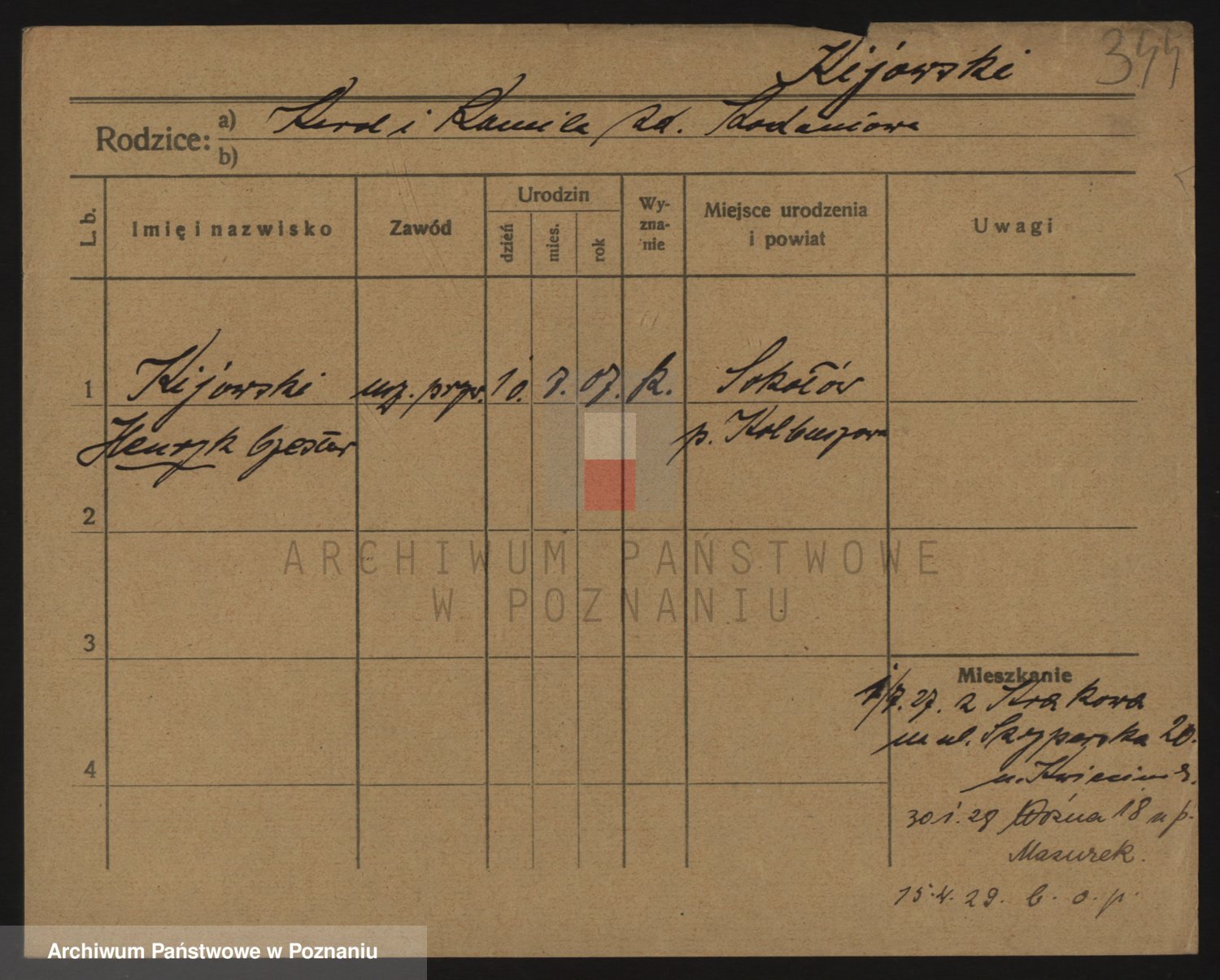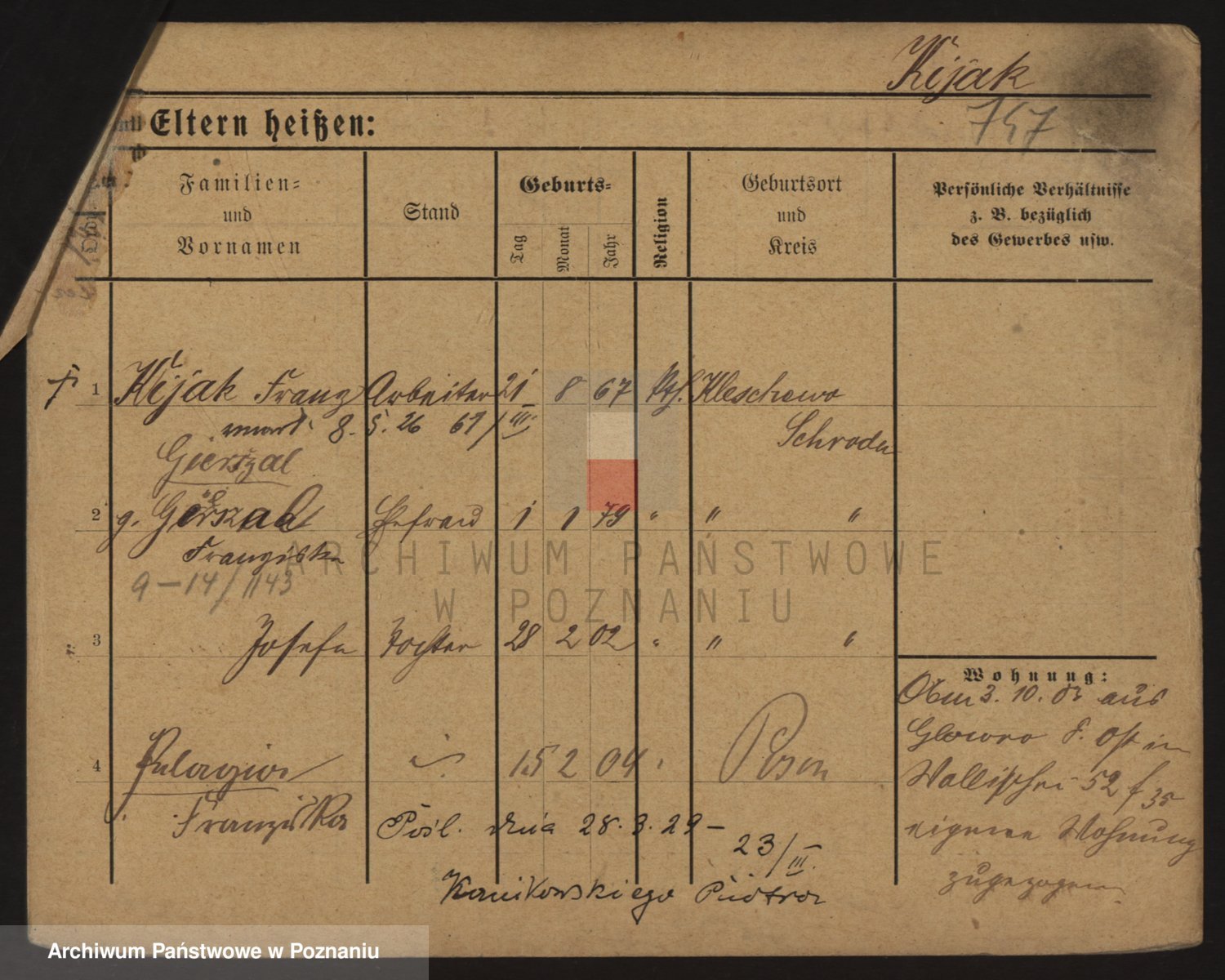 Podgląd karty osobowej dostępny jest po kliknięciu na nazwisko lub ikonkę karty. Można dokonywać powiększenia (ikony na górze) lub przechodzić między kolejnymi skanami (strzałki po bokach).