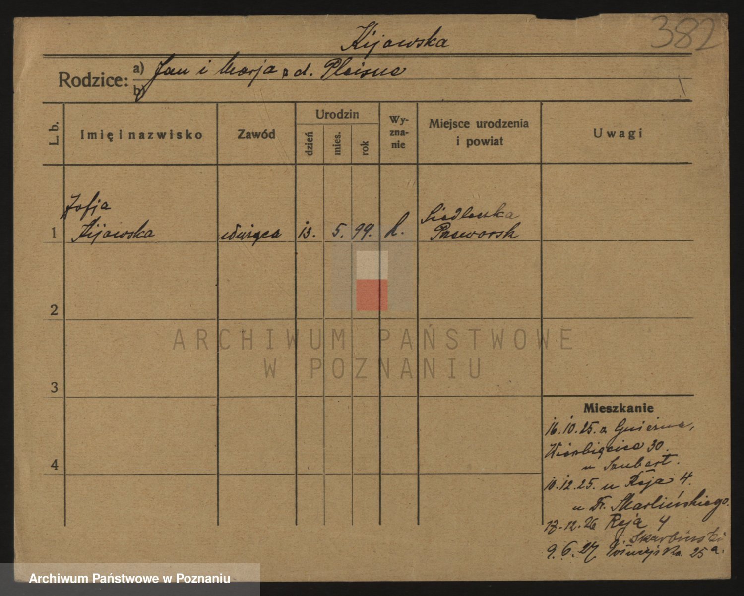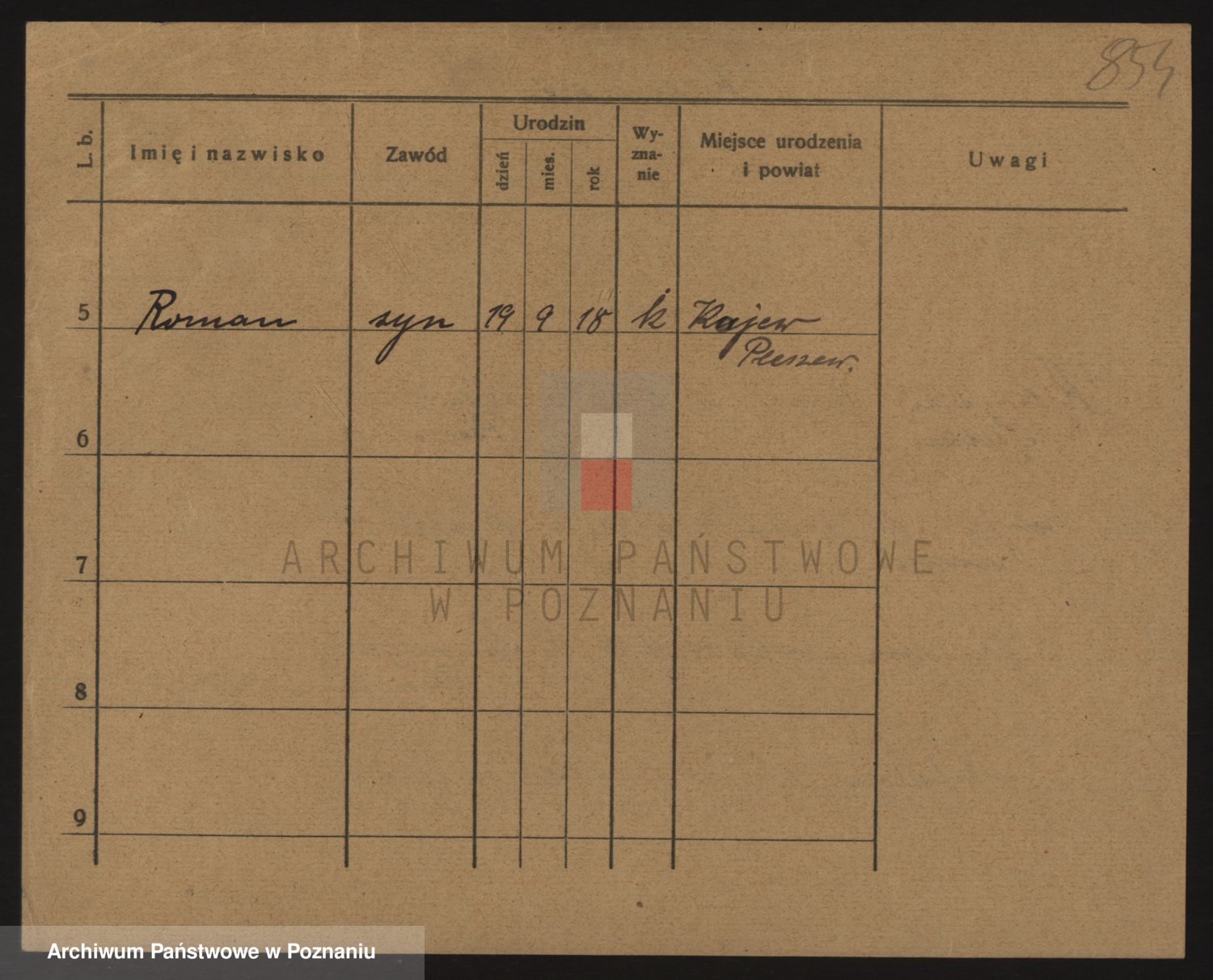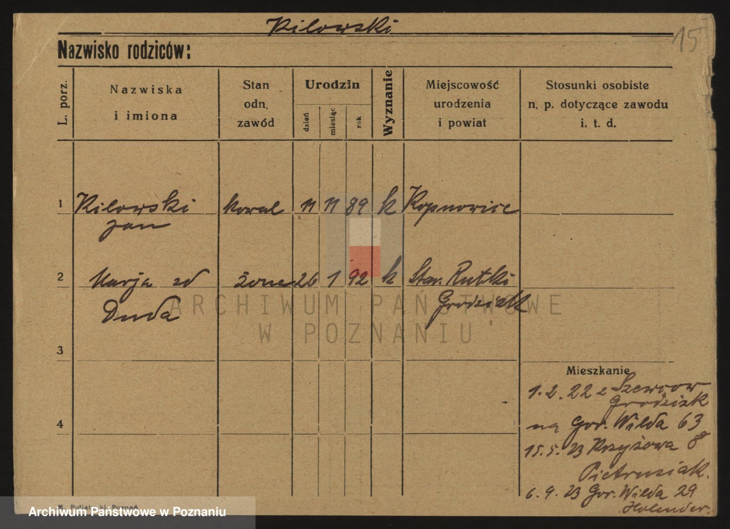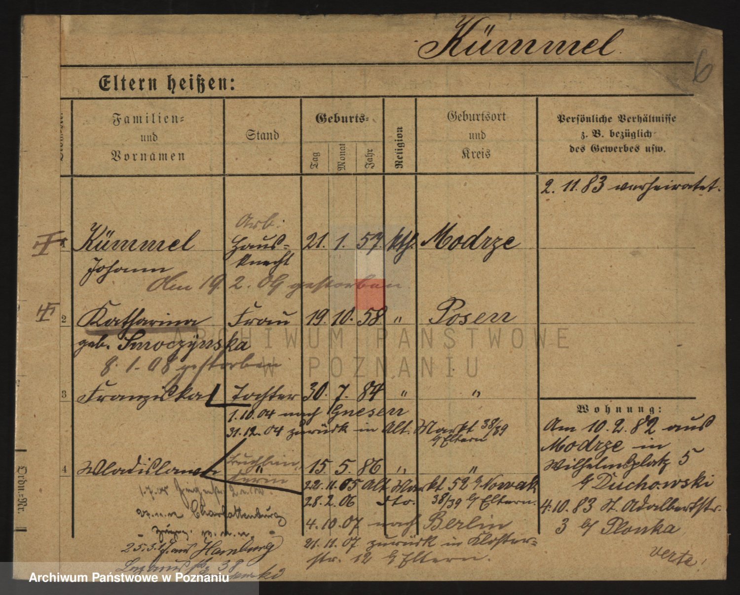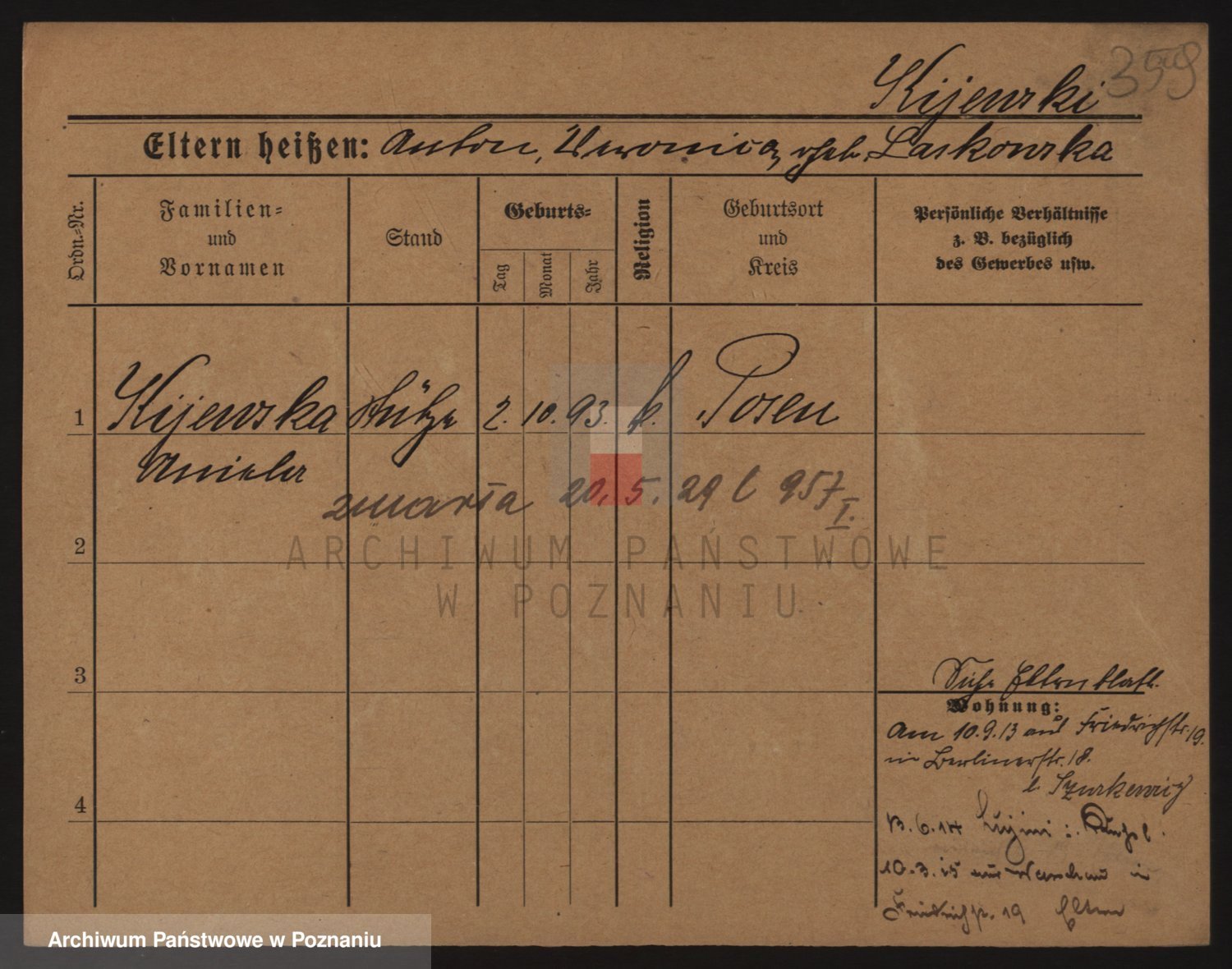 Podgląd karty osobowej dostępny jest po kliknięciu na nazwisko lub ikonkę karty. Można dokonywać powiększenia (ikony na górze) lub przechodzić między kolejnymi skanami (strzałki po bokach).