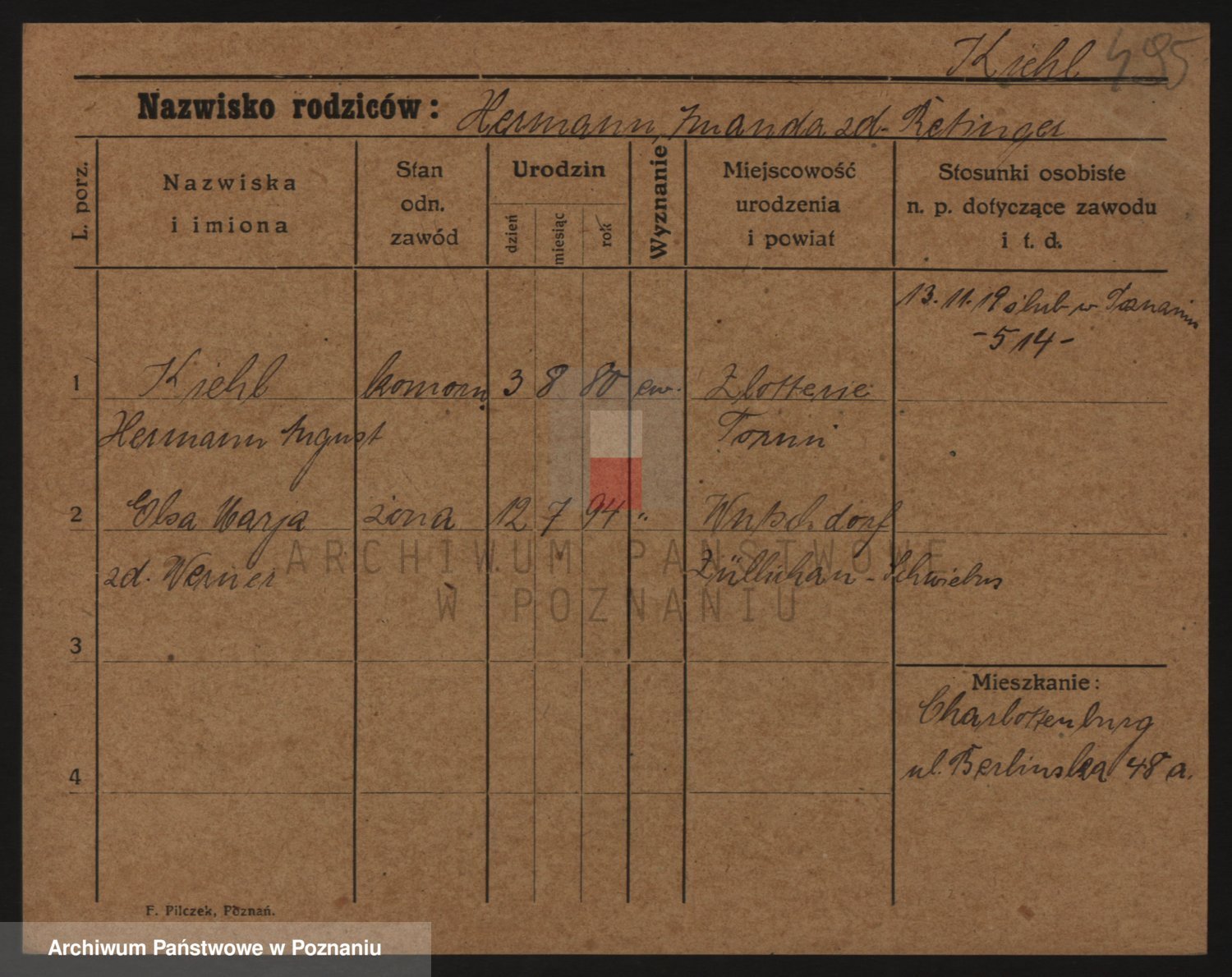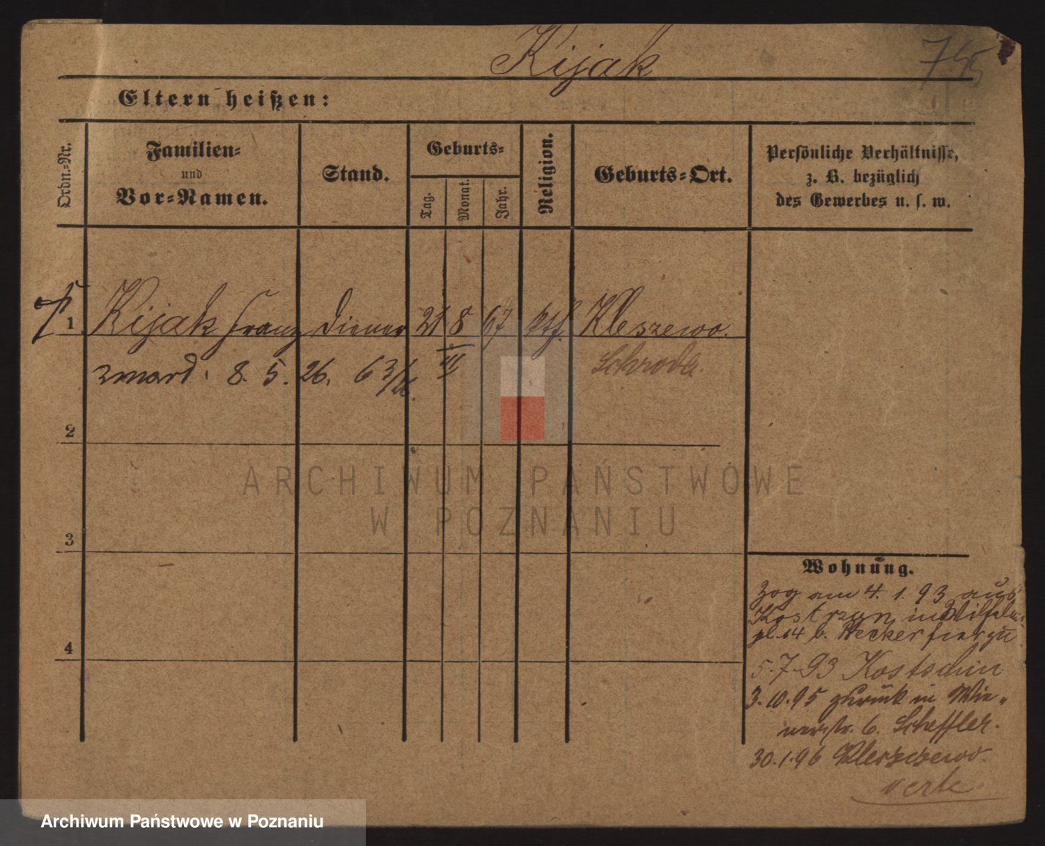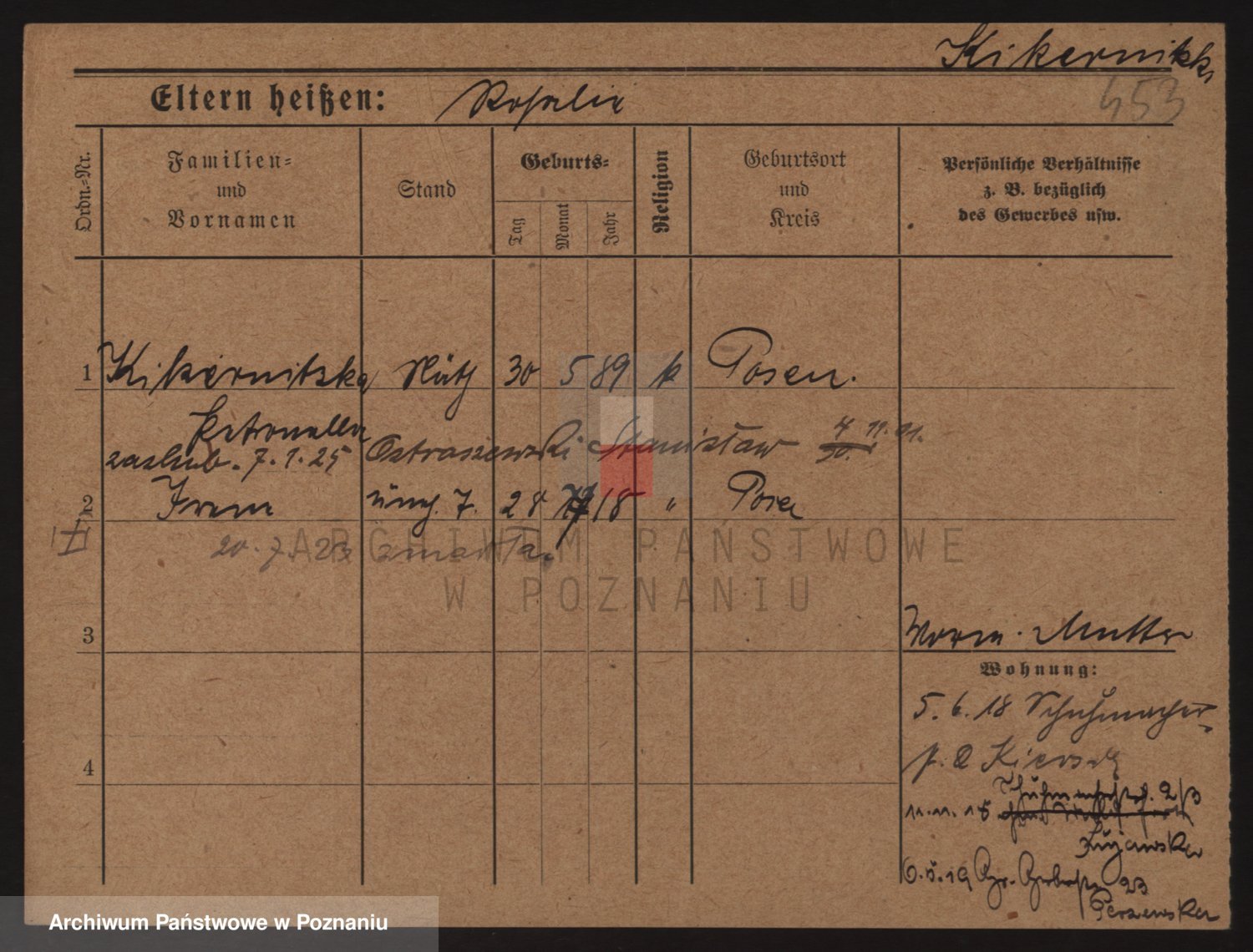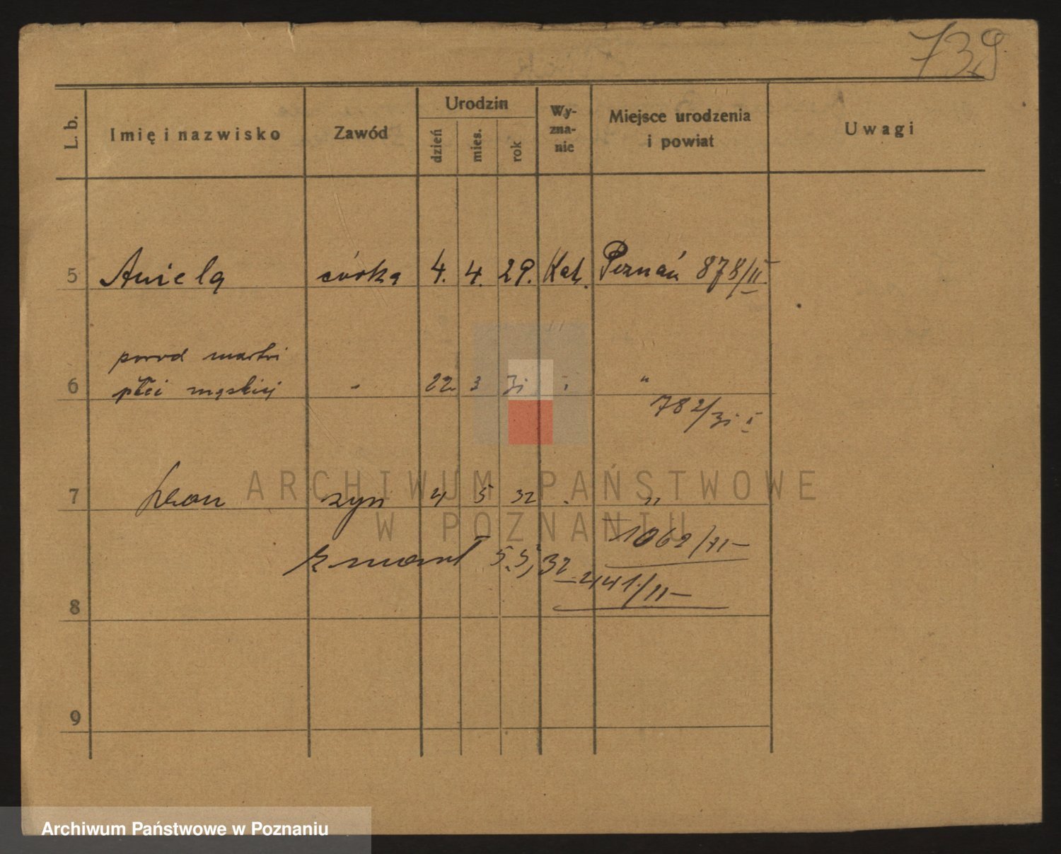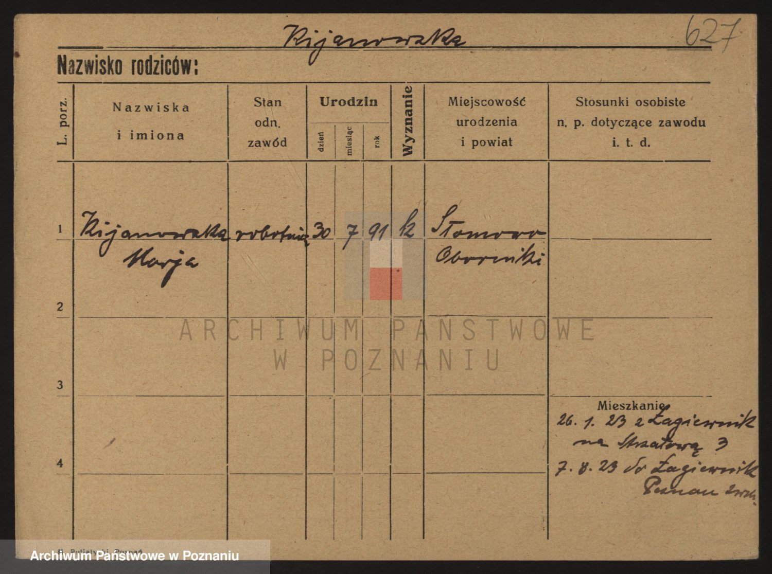 Podgląd karty osobowej dostępny jest po kliknięciu na nazwisko lub ikonkę karty. Można dokonywać powiększenia (ikony na górze) lub przechodzić między kolejnymi skanami (strzałki po bokach).