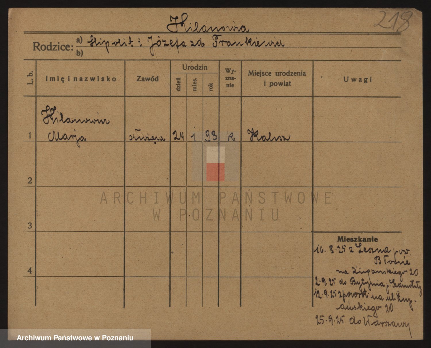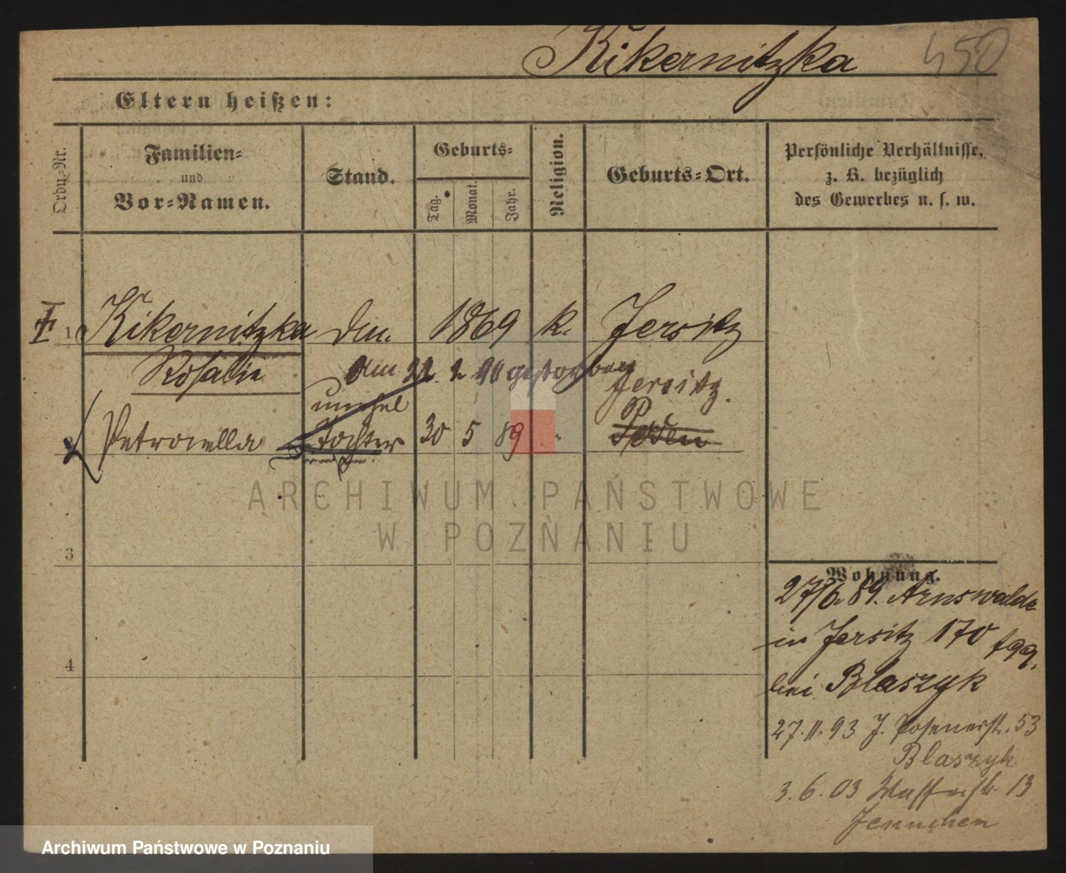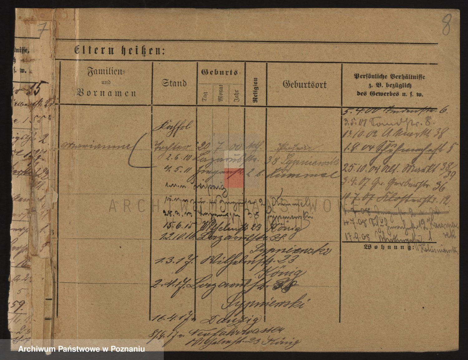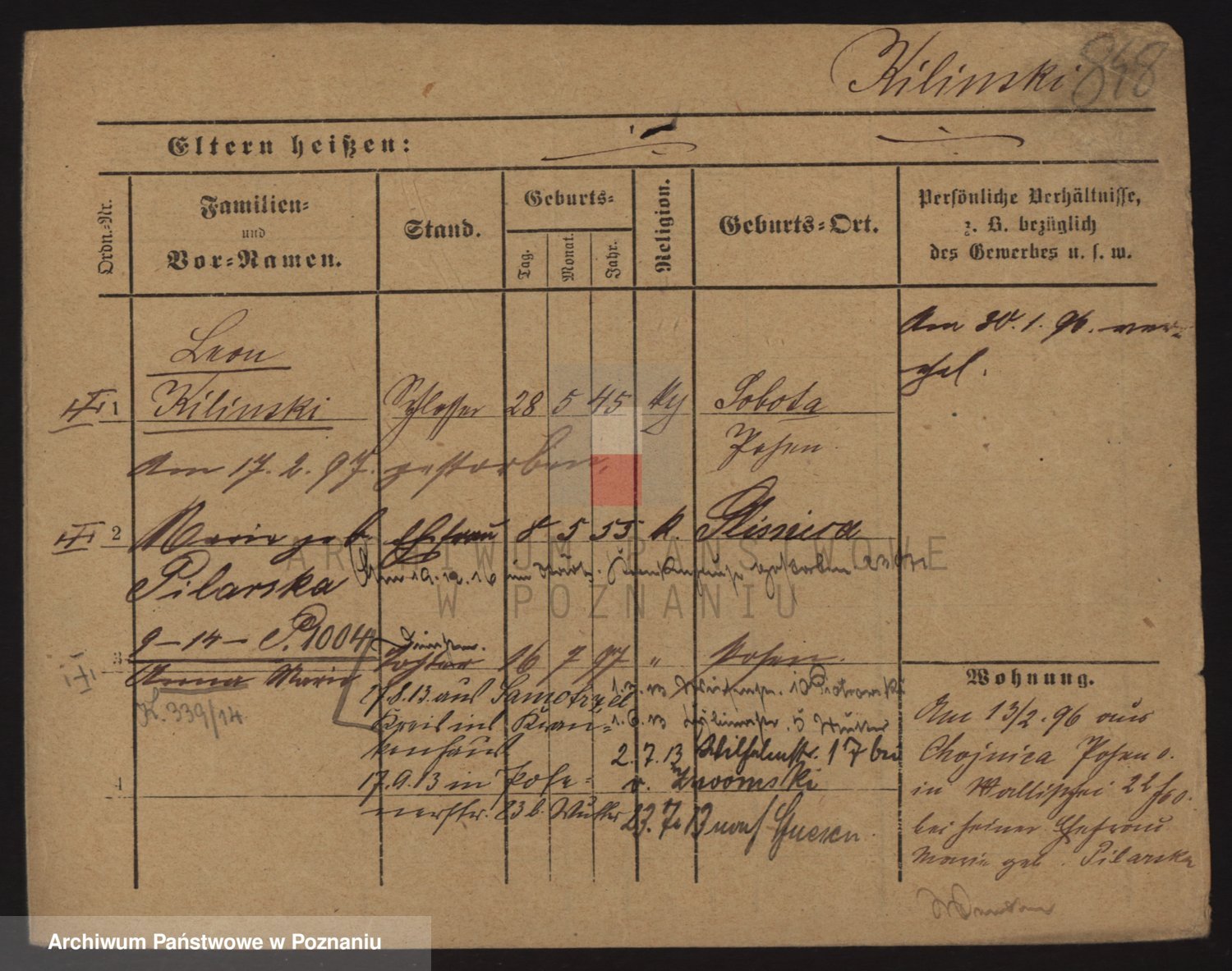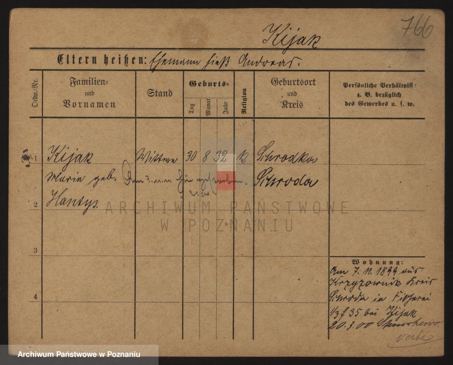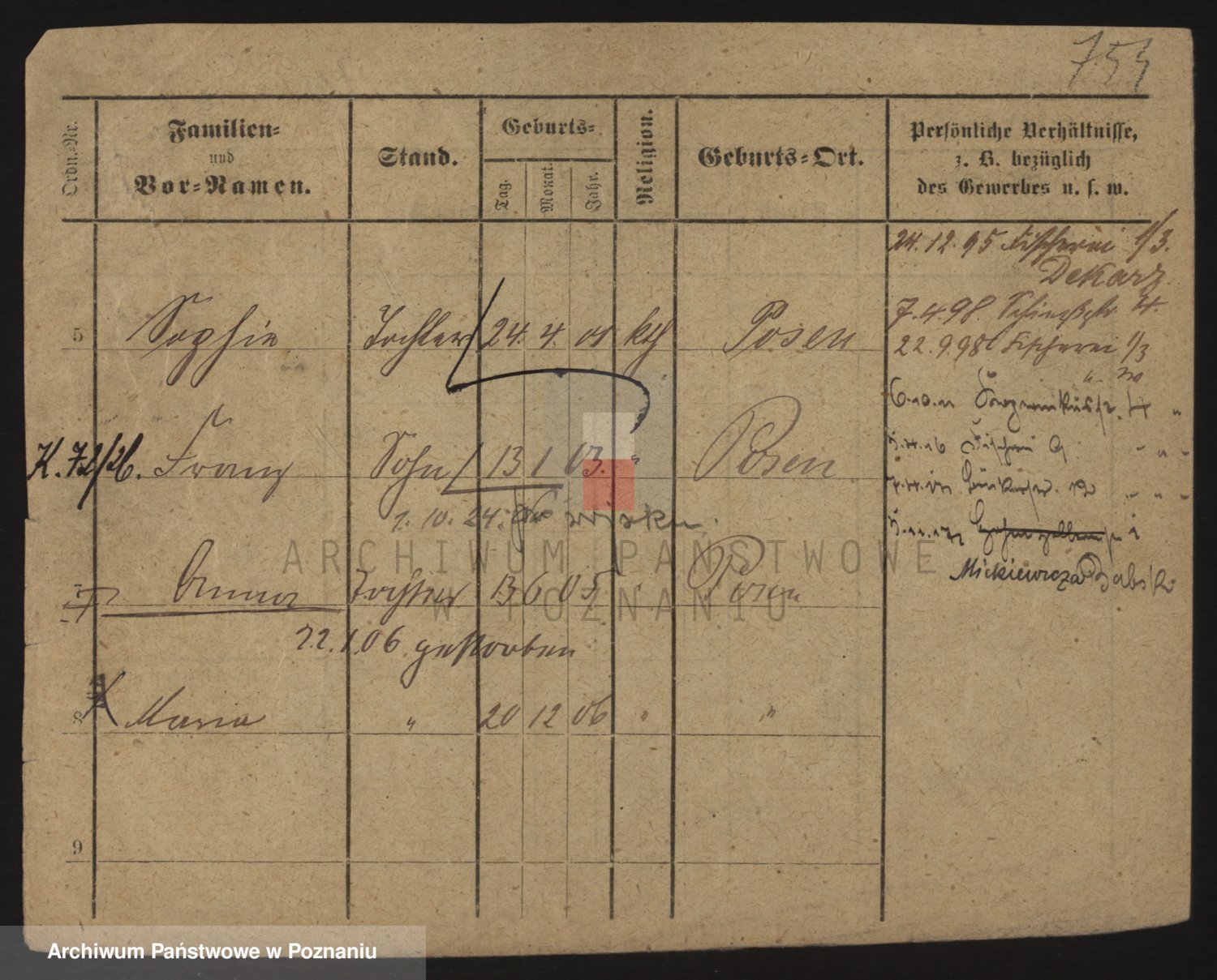 Podgląd karty osobowej dostępny jest po kliknięciu na nazwisko lub ikonkę karty. Można dokonywać powiększenia (ikony na górze) lub przechodzić między kolejnymi skanami (strzałki po bokach).