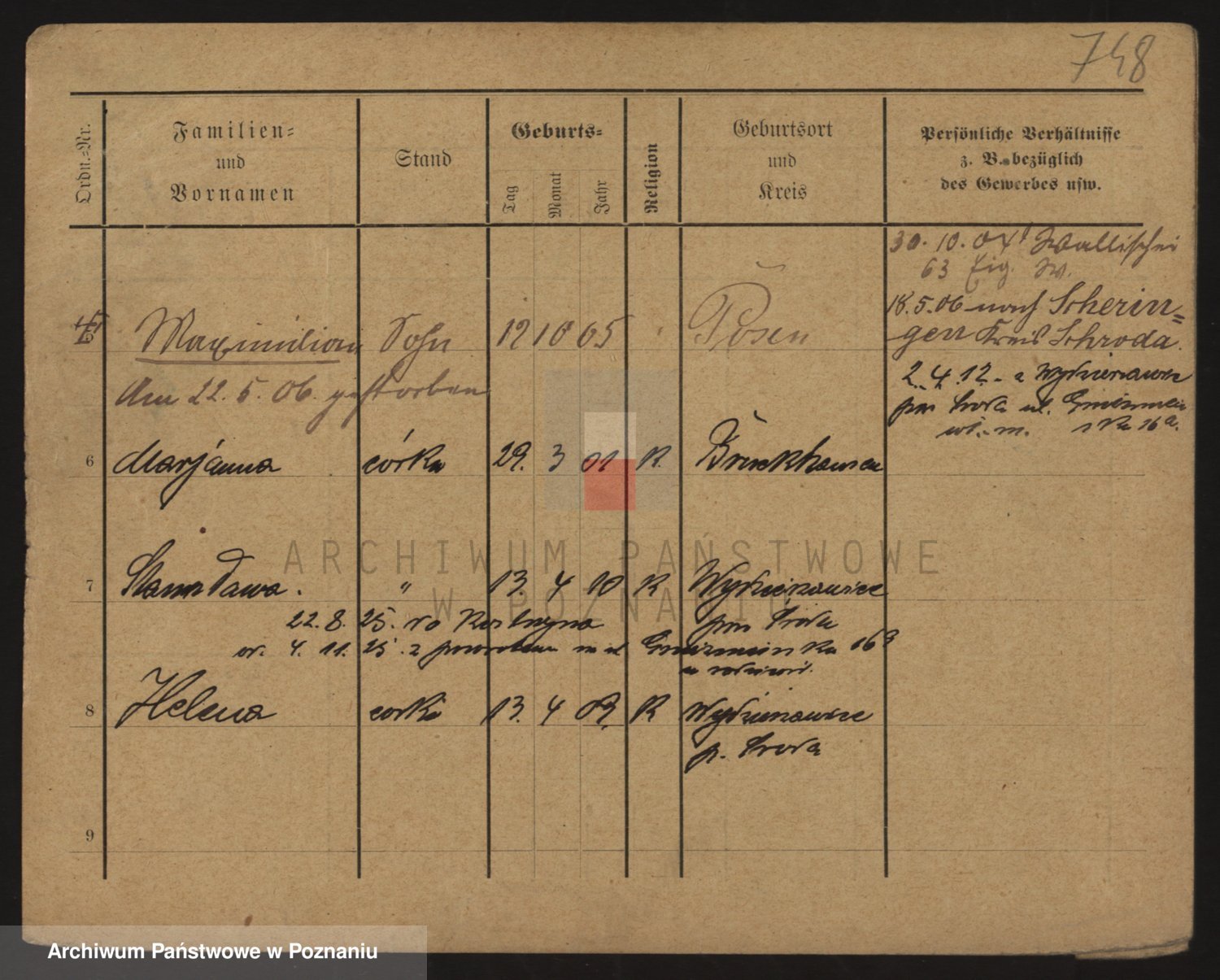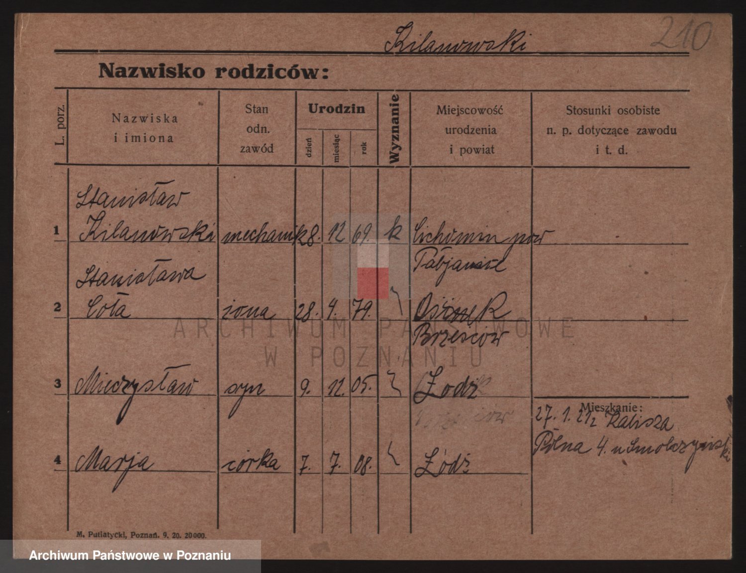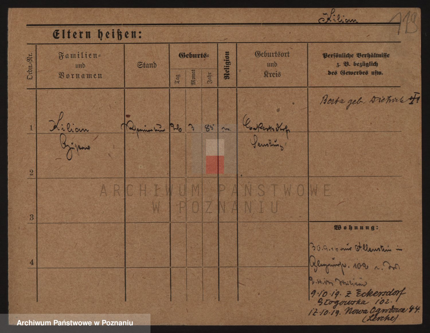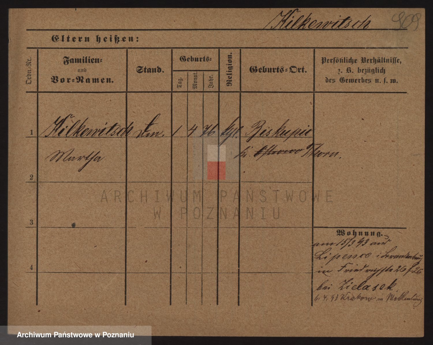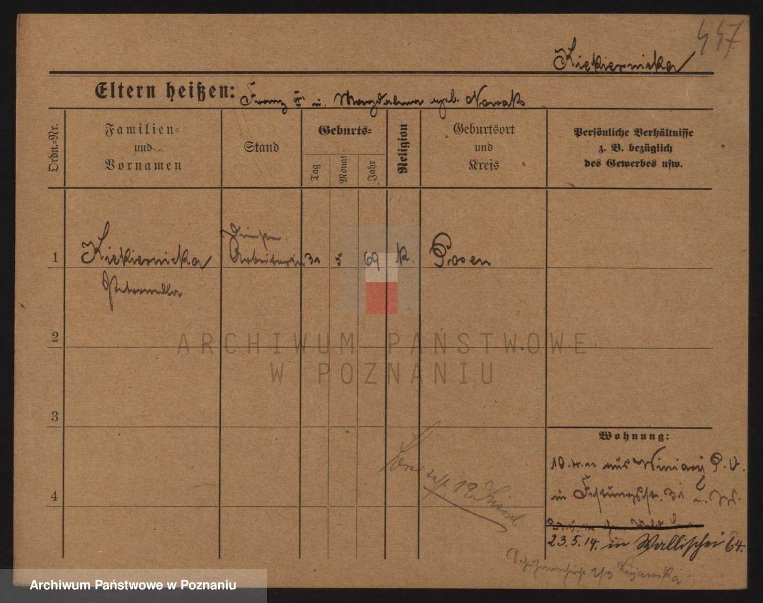 Podgląd karty osobowej dostępny jest po kliknięciu na nazwisko lub ikonkę karty. Można dokonywać powiększenia (ikony na górze) lub przechodzić między kolejnymi skanami (strzałki po bokach).