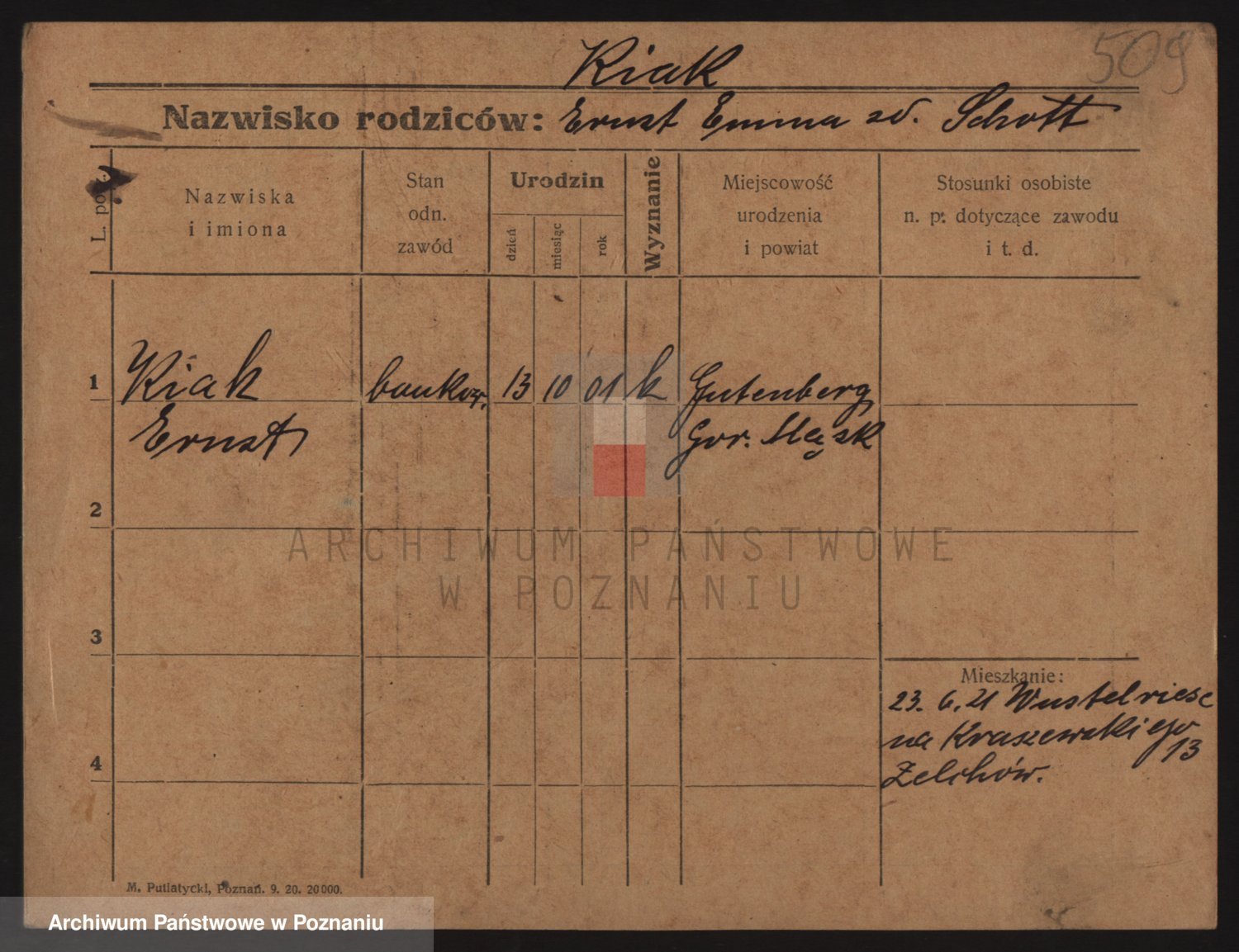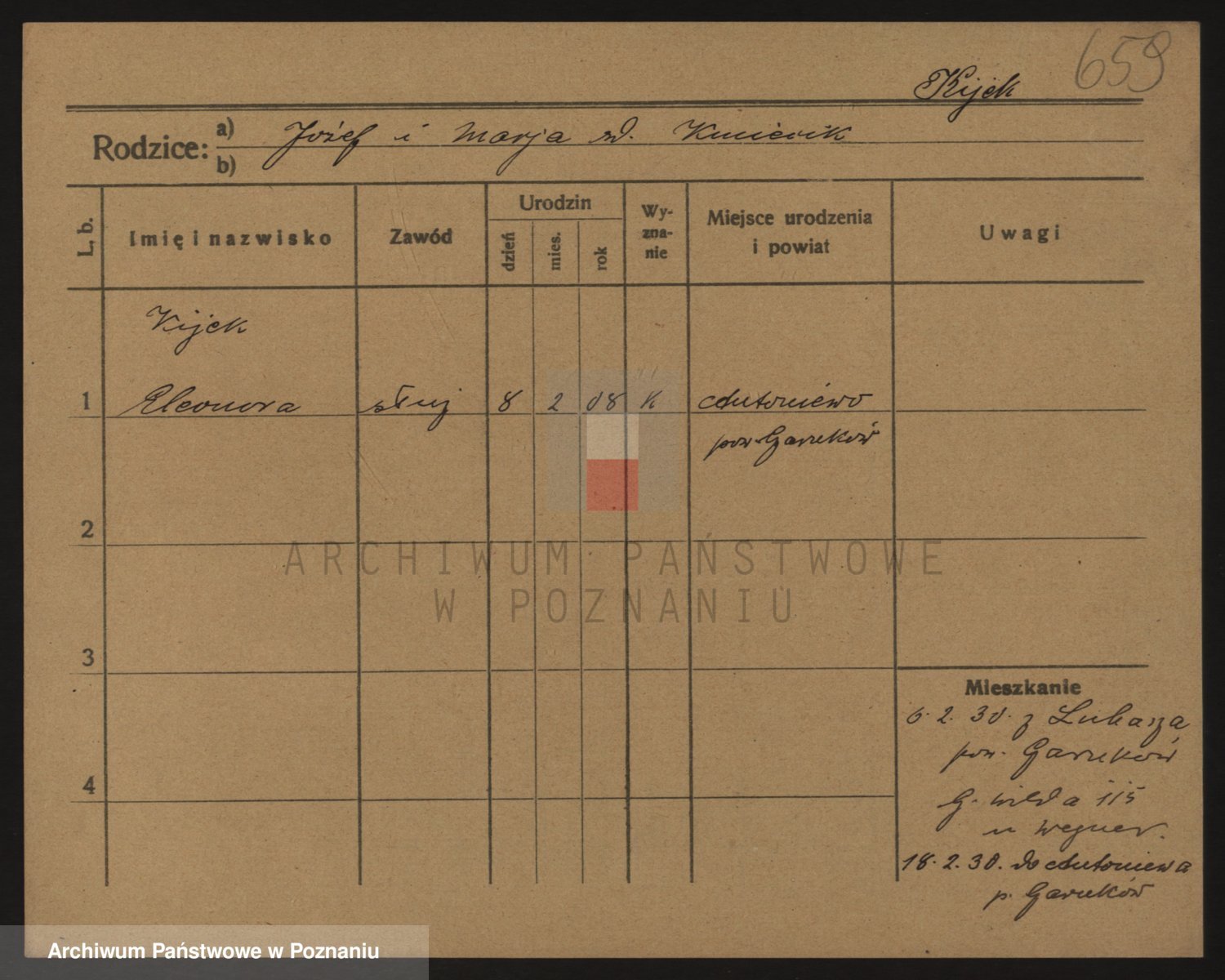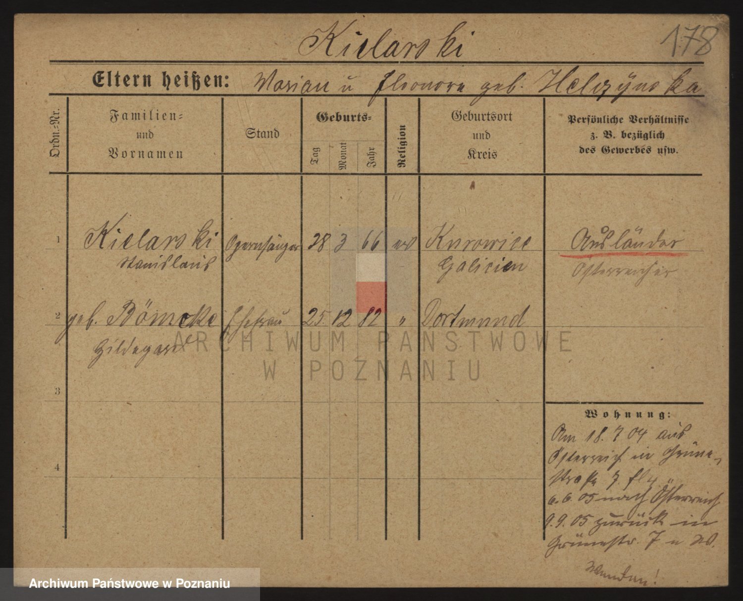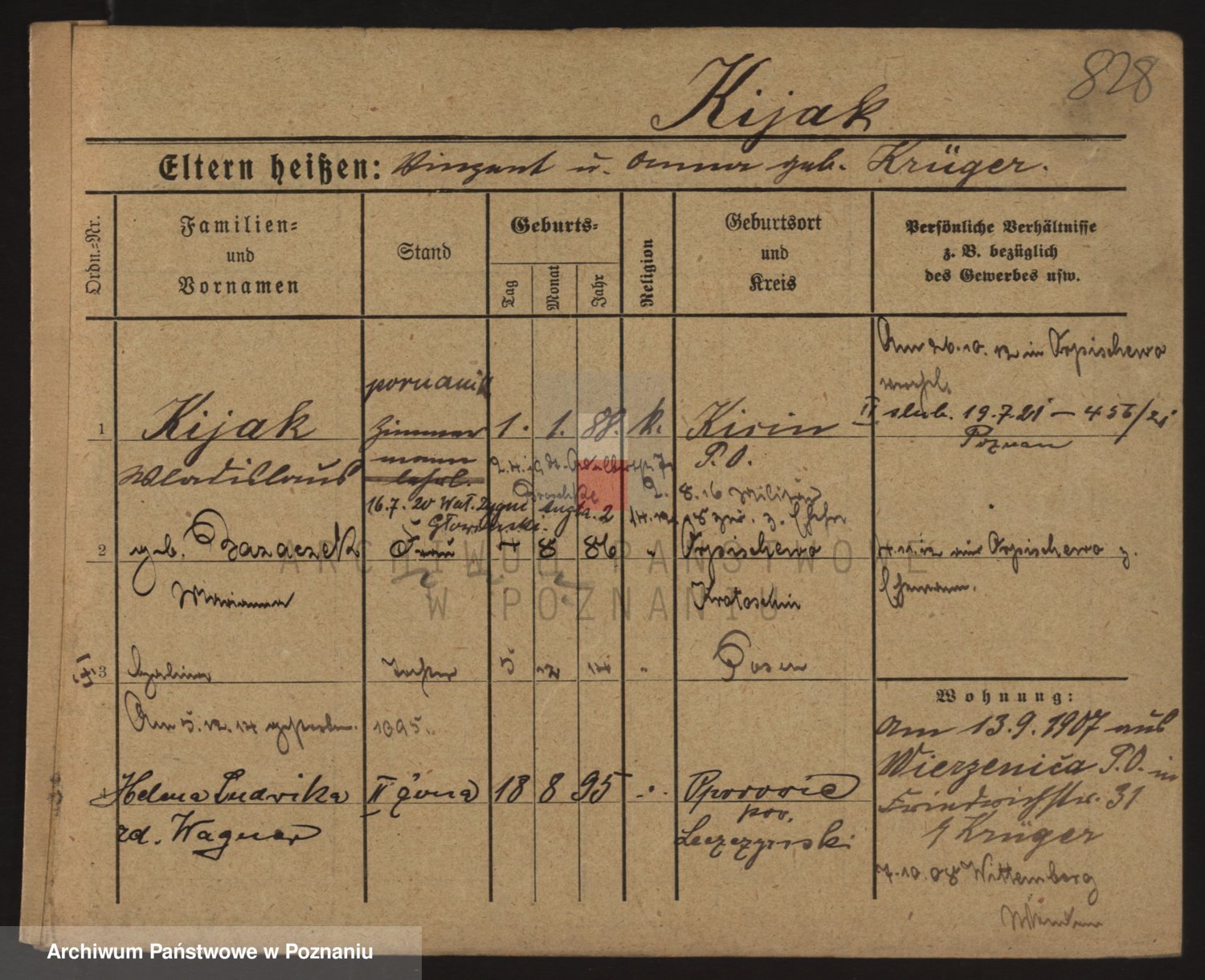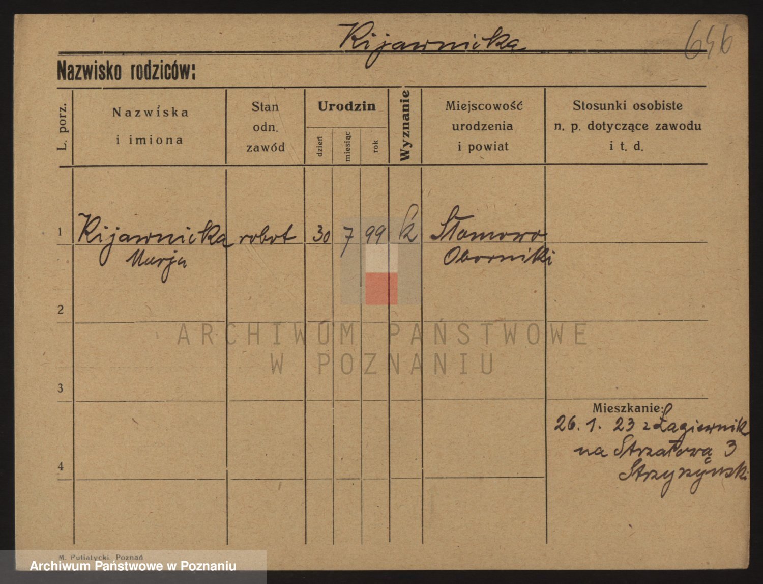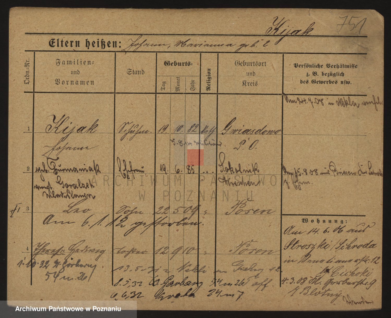 Podgląd karty osobowej dostępny jest po kliknięciu na nazwisko lub ikonkę karty. Można dokonywać powiększenia (ikony na górze) lub przechodzić między kolejnymi skanami (strzałki po bokach).