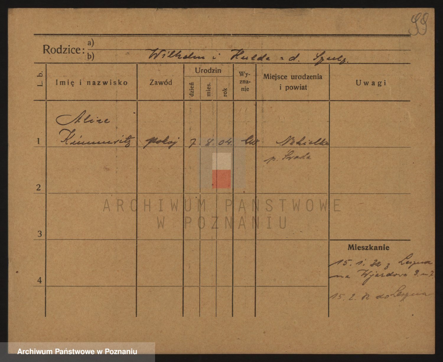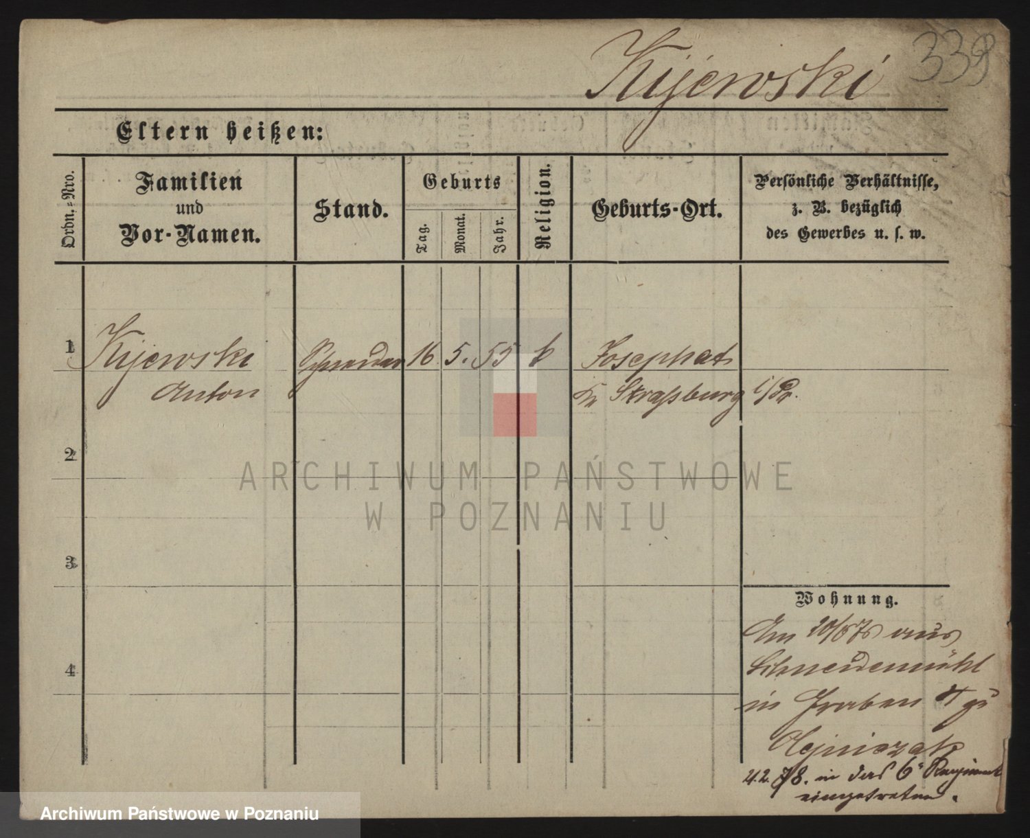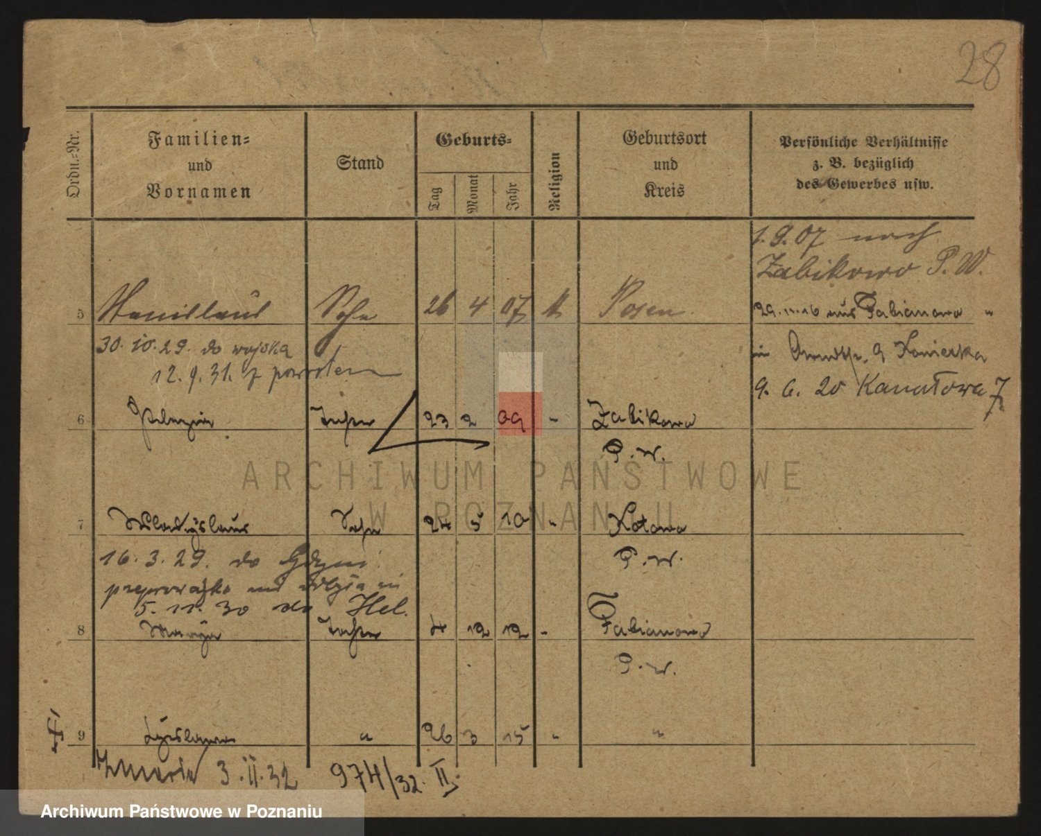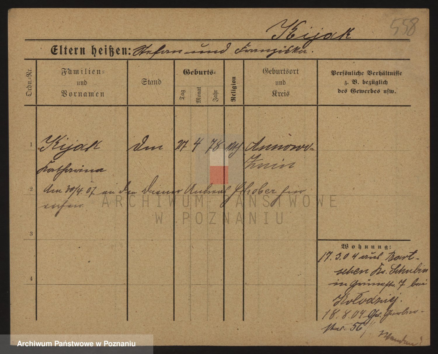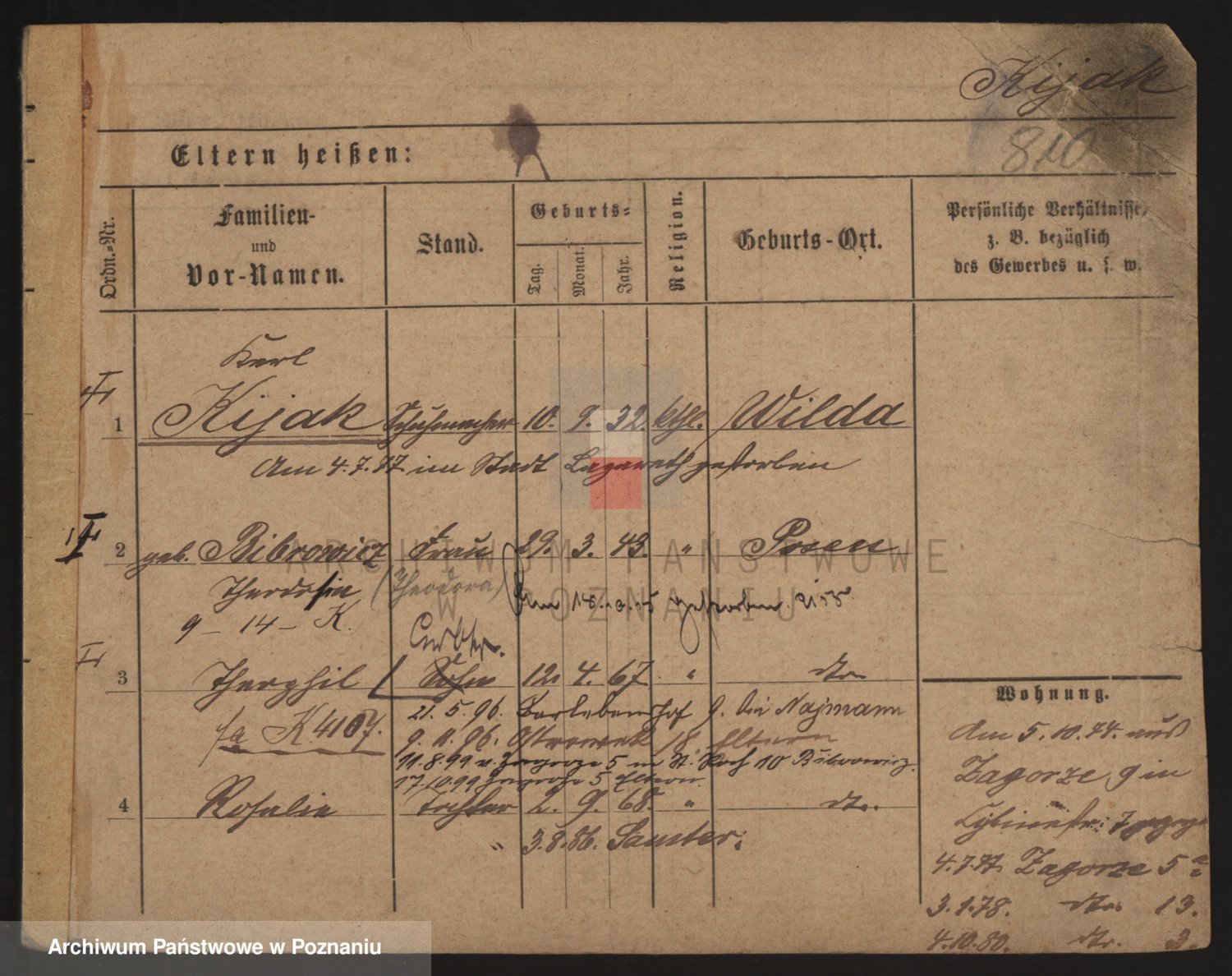 Podgląd karty osobowej dostępny jest po kliknięciu na nazwisko lub ikonkę karty. Można dokonywać powiększenia (ikony na górze) lub przechodzić między kolejnymi skanami (strzałki po bokach).
