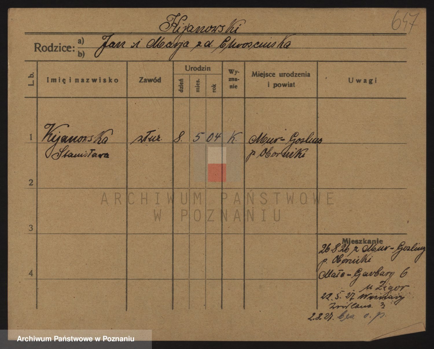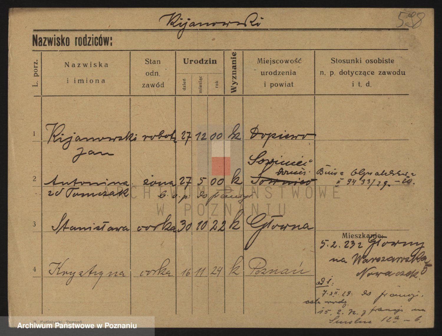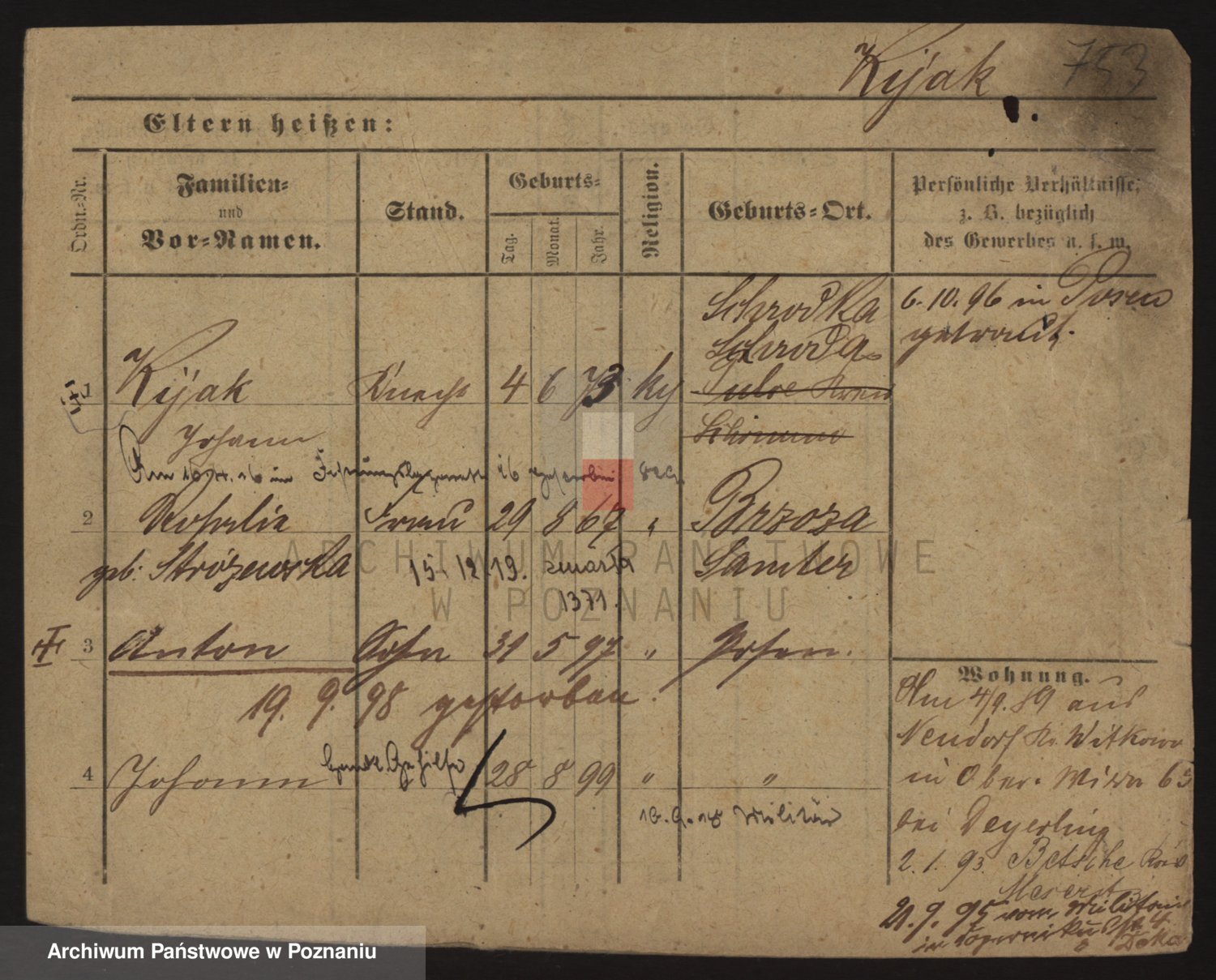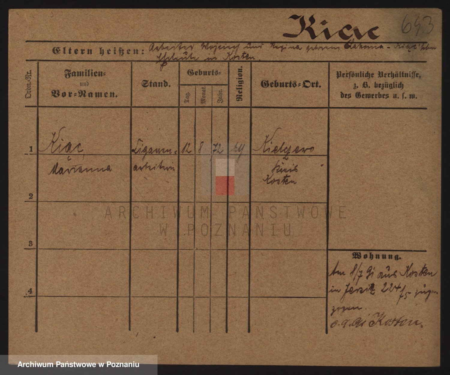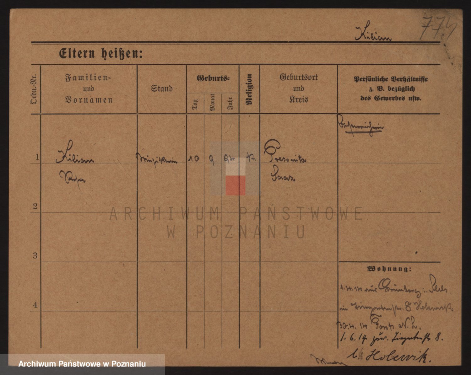 Podgląd karty osobowej dostępny jest po kliknięciu na nazwisko lub ikonkę karty. Można dokonywać powiększenia (ikony na górze) lub przechodzić między kolejnymi skanami (strzałki po bokach).