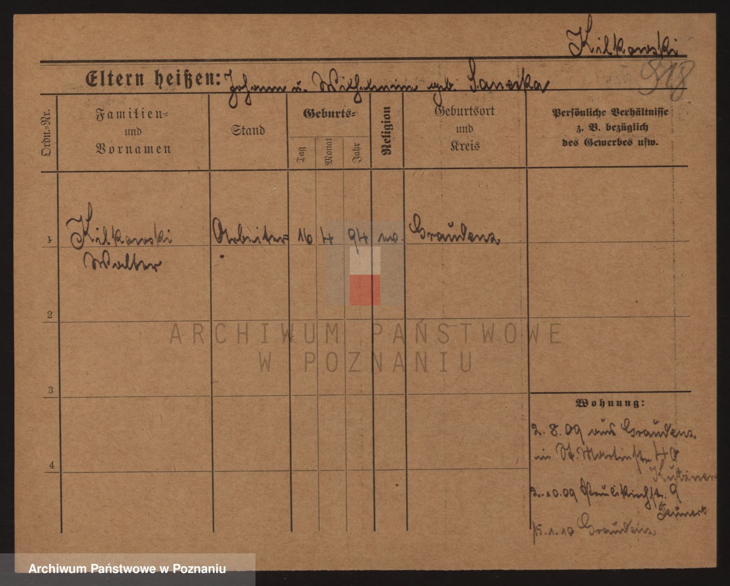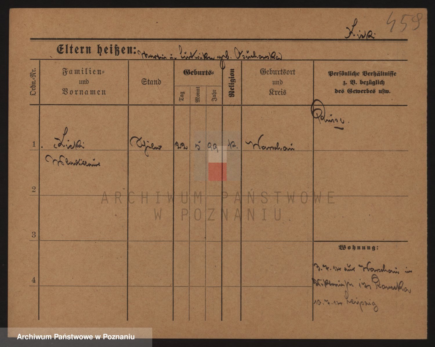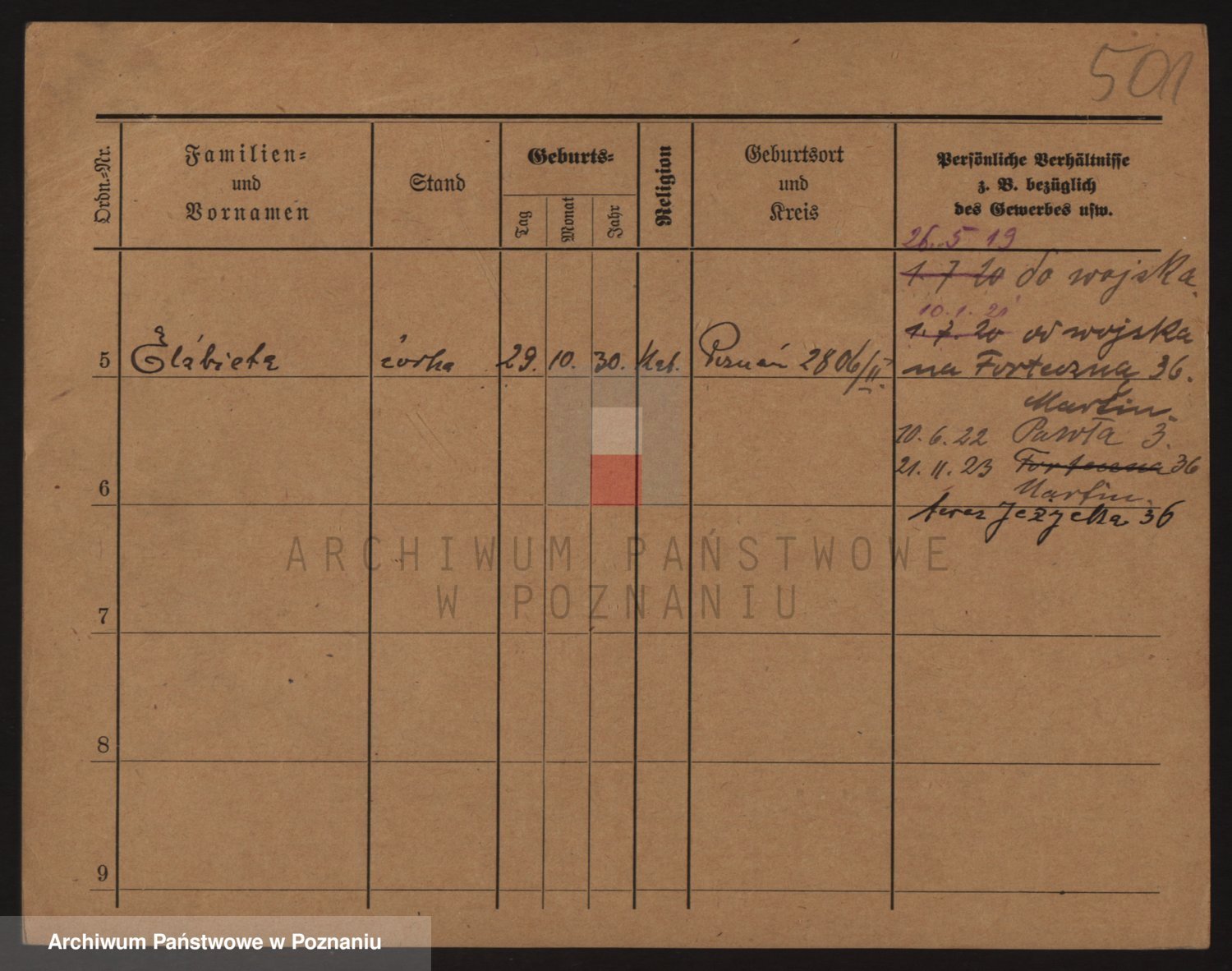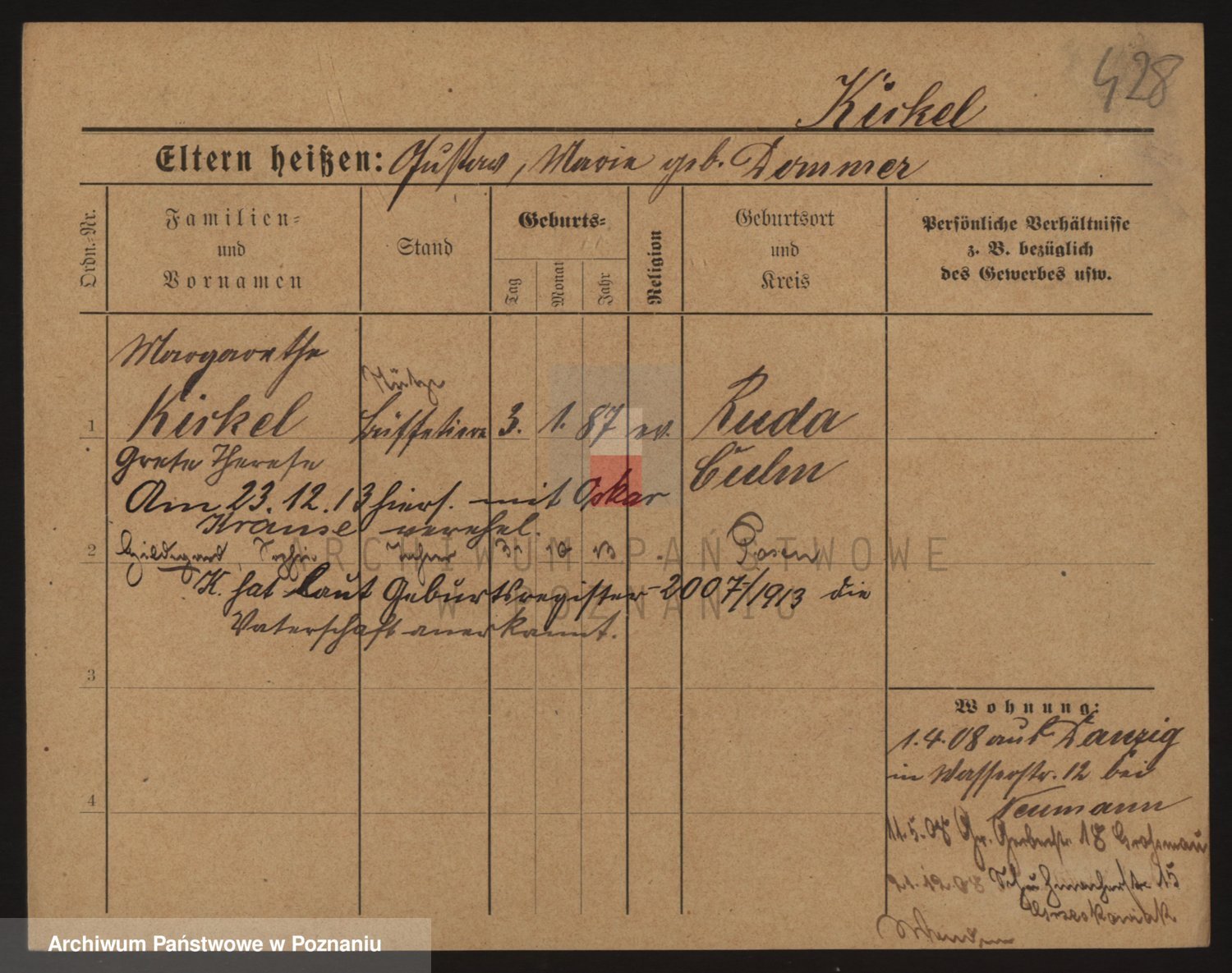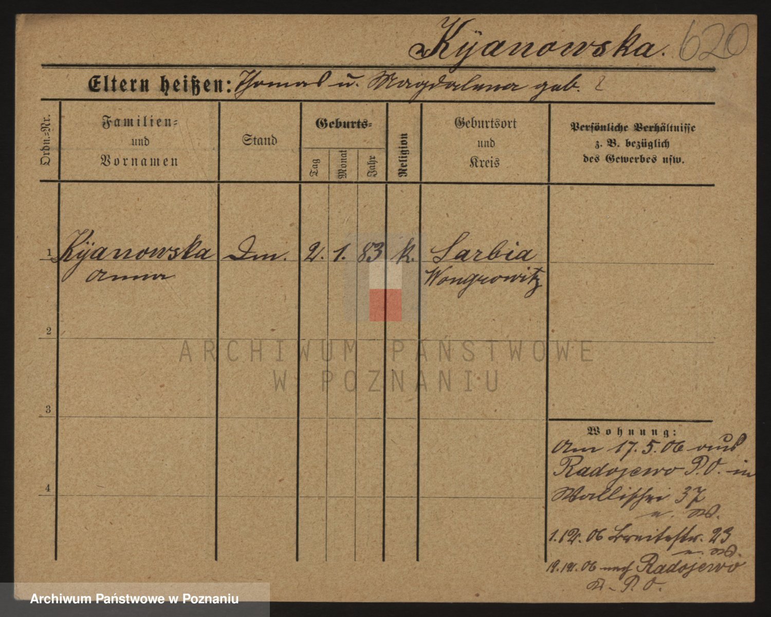 Podgląd karty osobowej dostępny jest po kliknięciu na nazwisko lub ikonkę karty. Można dokonywać powiększenia (ikony na górze) lub przechodzić między kolejnymi skanami (strzałki po bokach).