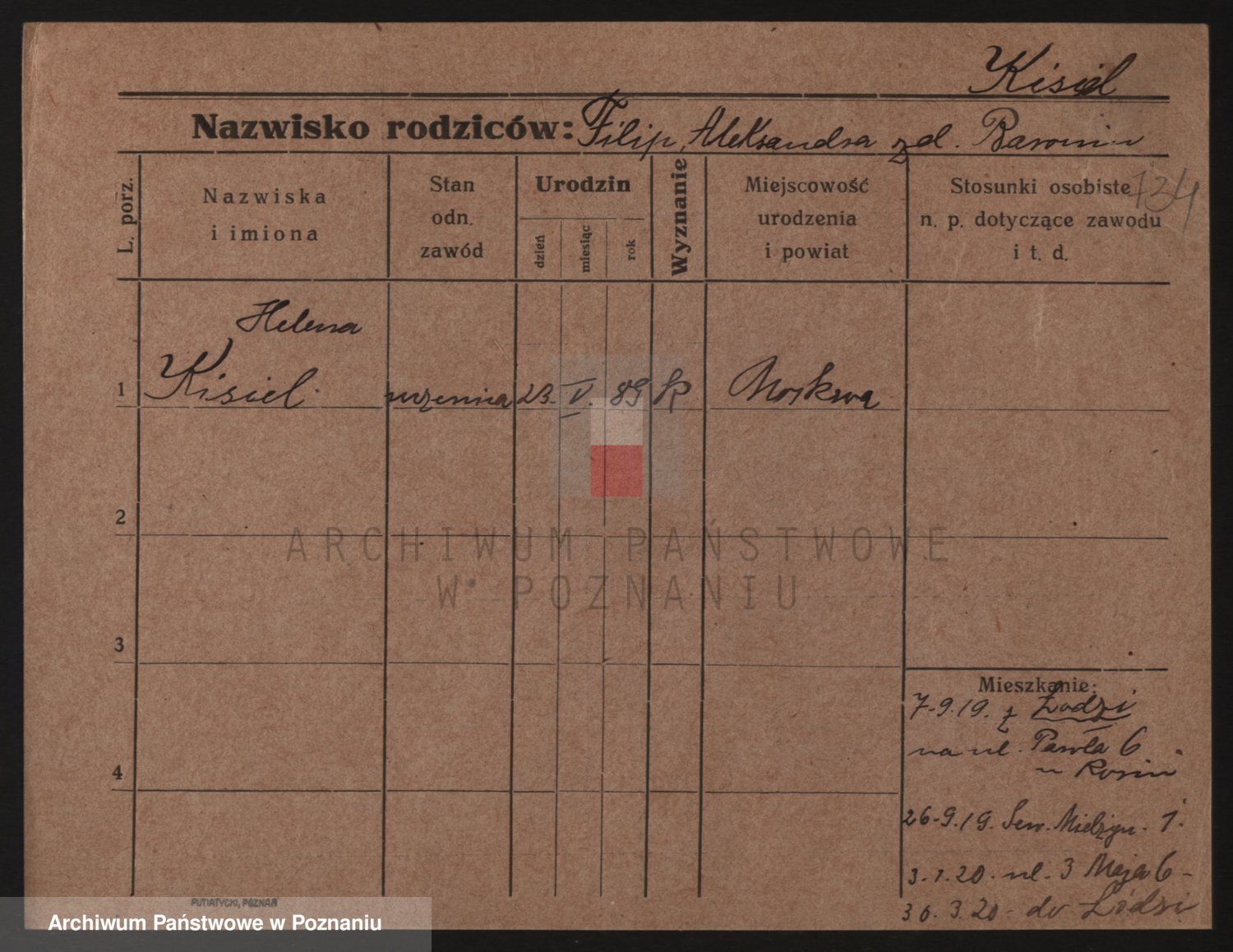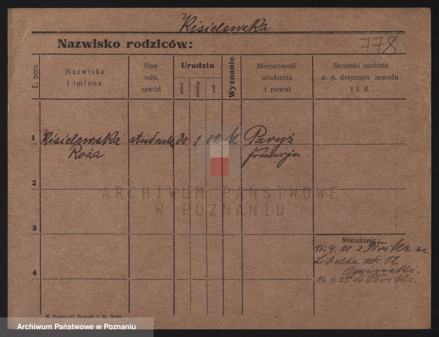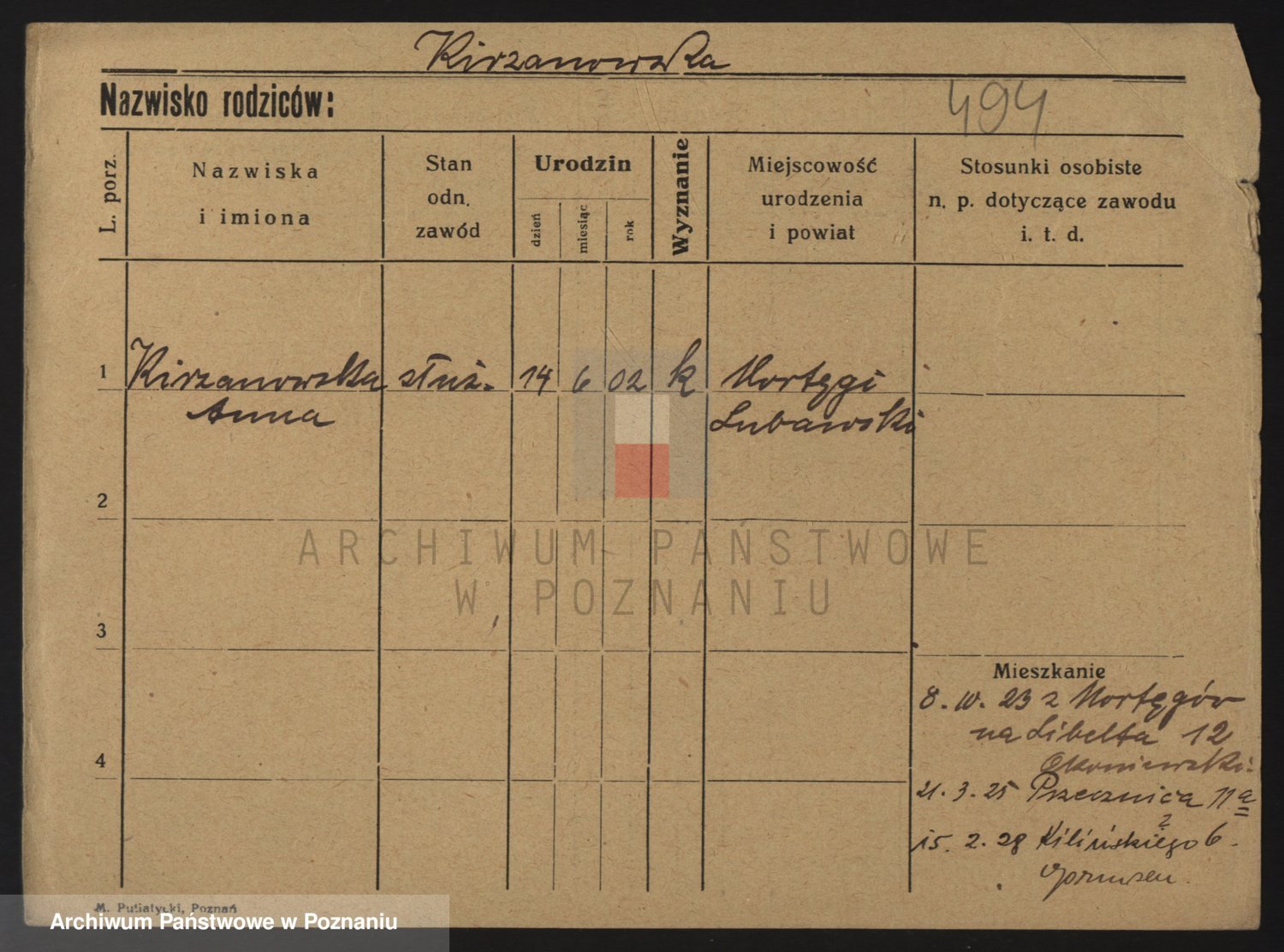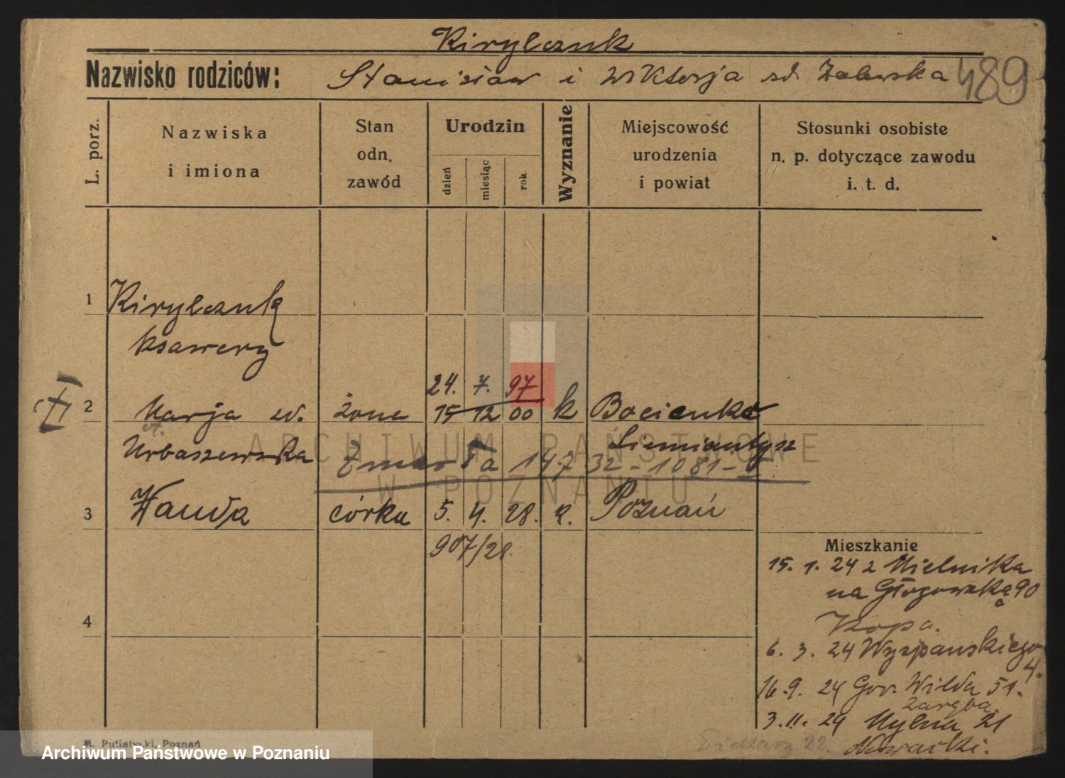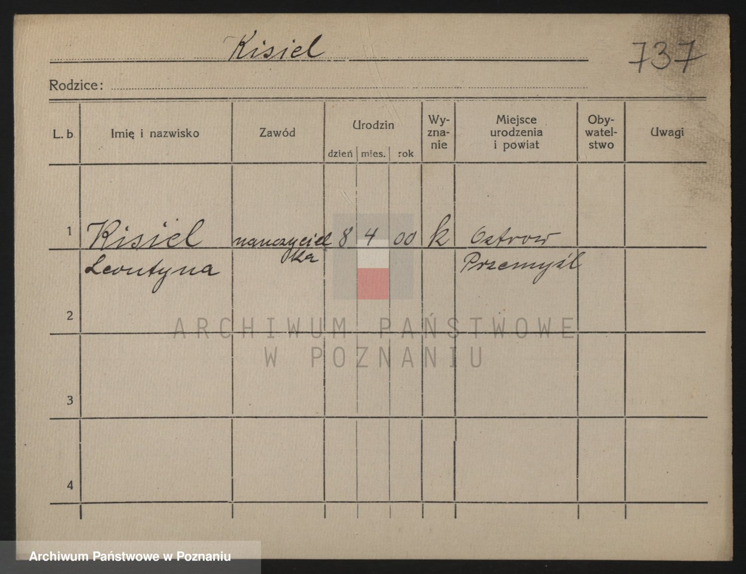 Podgląd karty osobowej dostępny jest po kliknięciu na nazwisko lub ikonkę karty. Można dokonywać powiększenia (ikony na górze) lub przechodzić między kolejnymi skanami (strzałki po bokach).