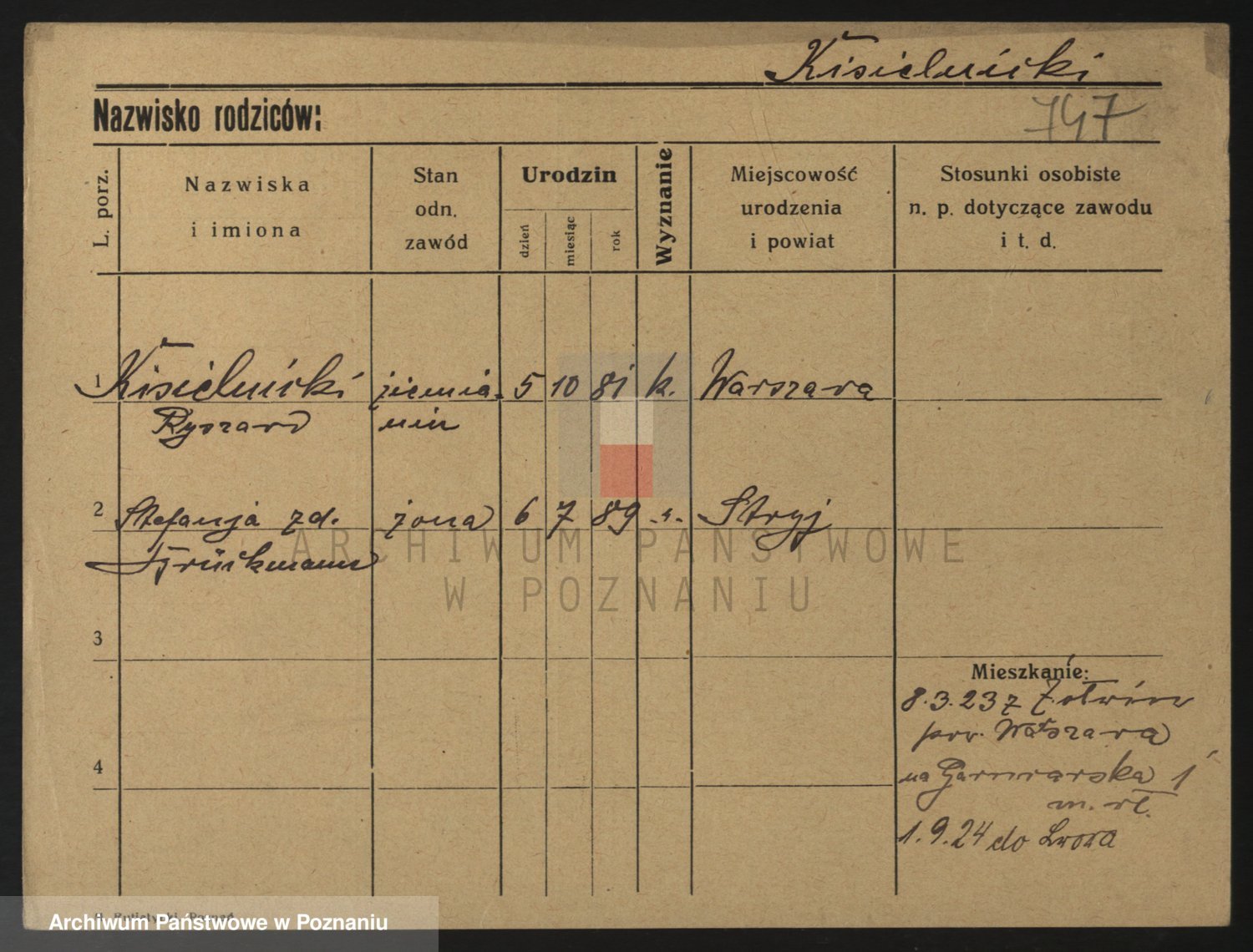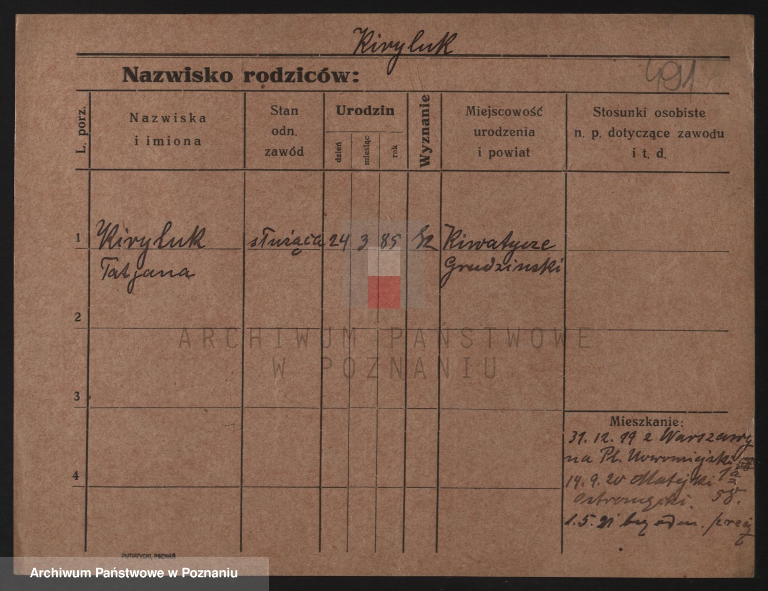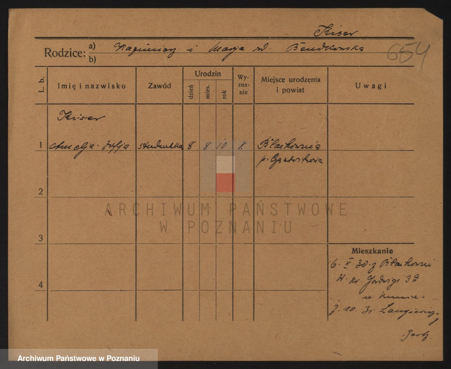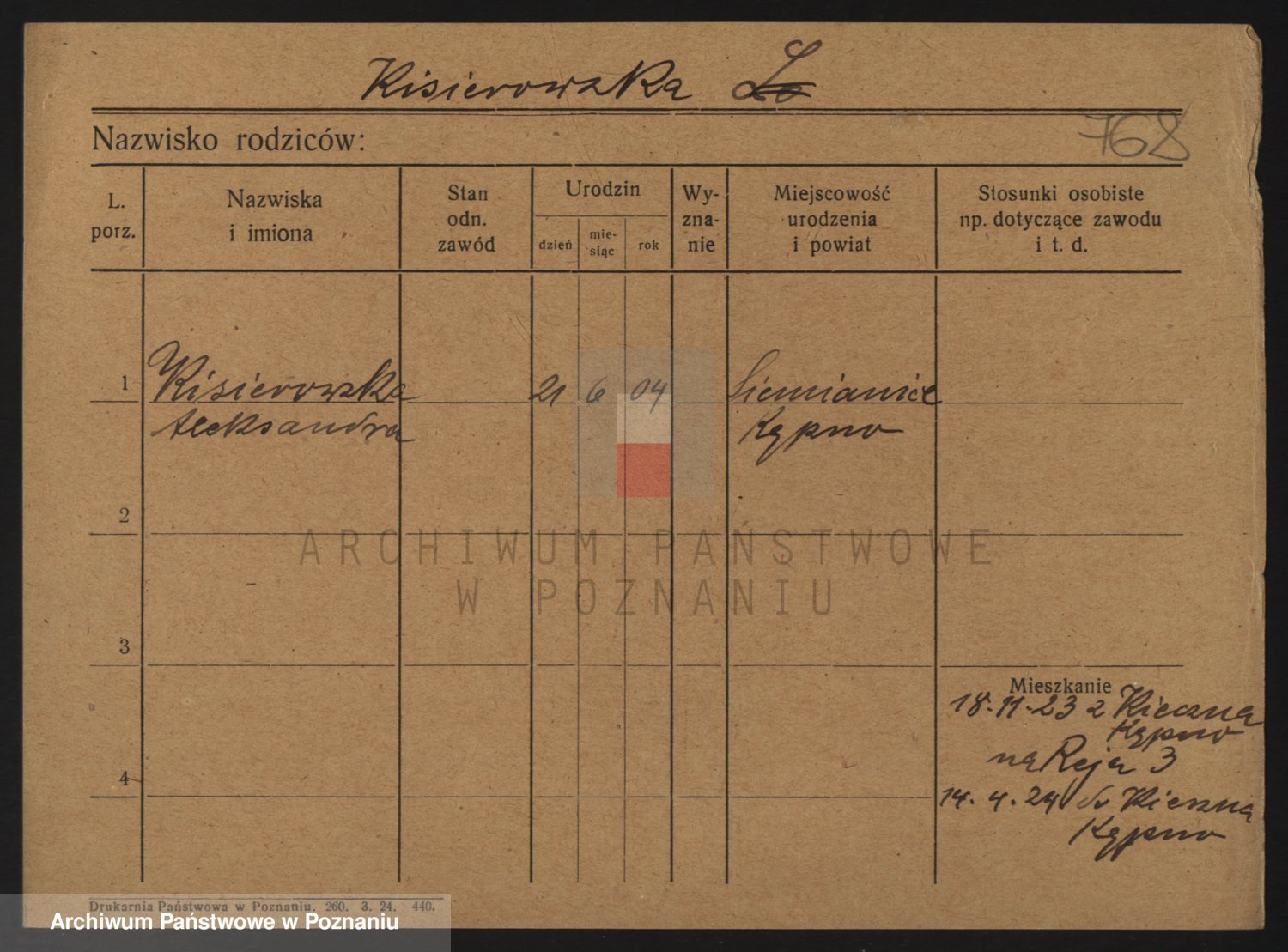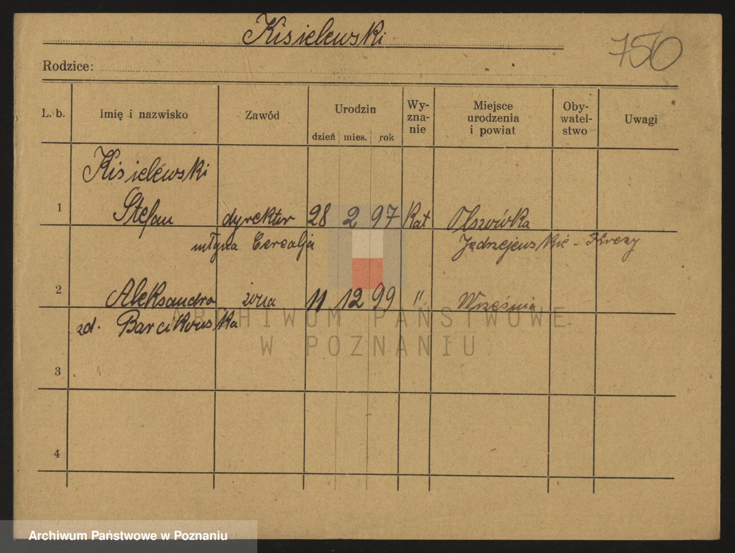 Podgląd karty osobowej dostępny jest po kliknięciu na nazwisko lub ikonkę karty. Można dokonywać powiększenia (ikony na górze) lub przechodzić między kolejnymi skanami (strzałki po bokach).