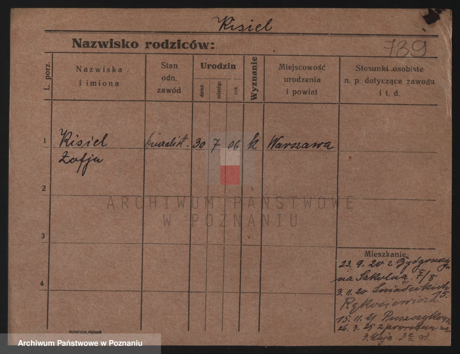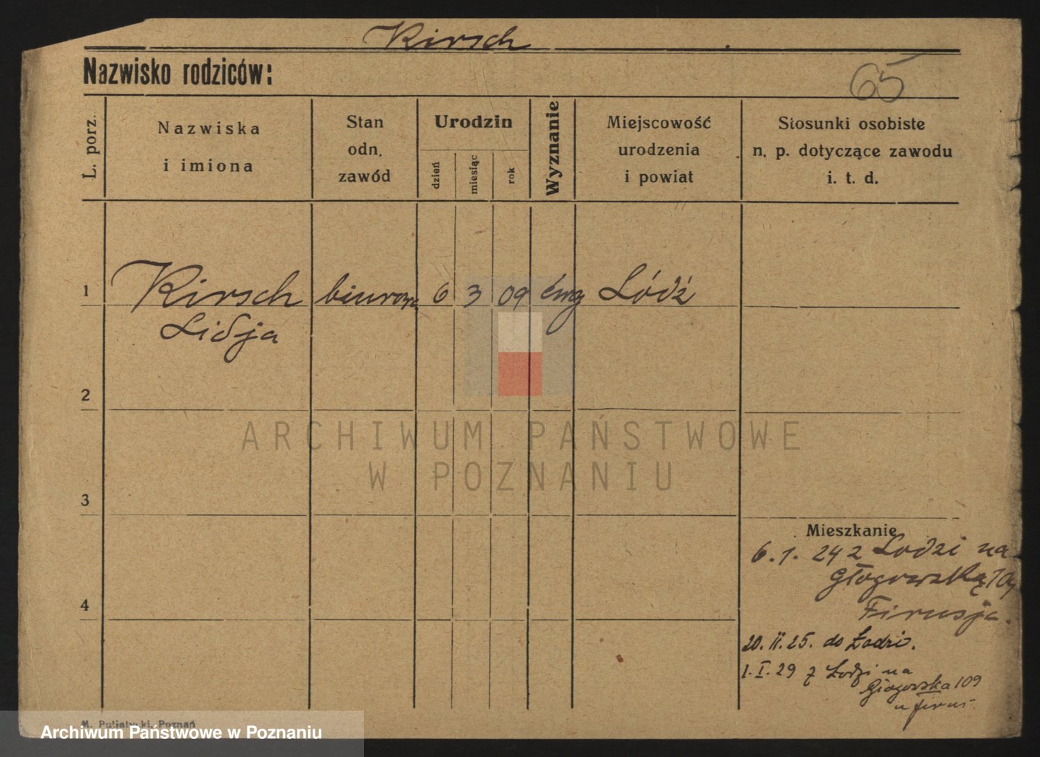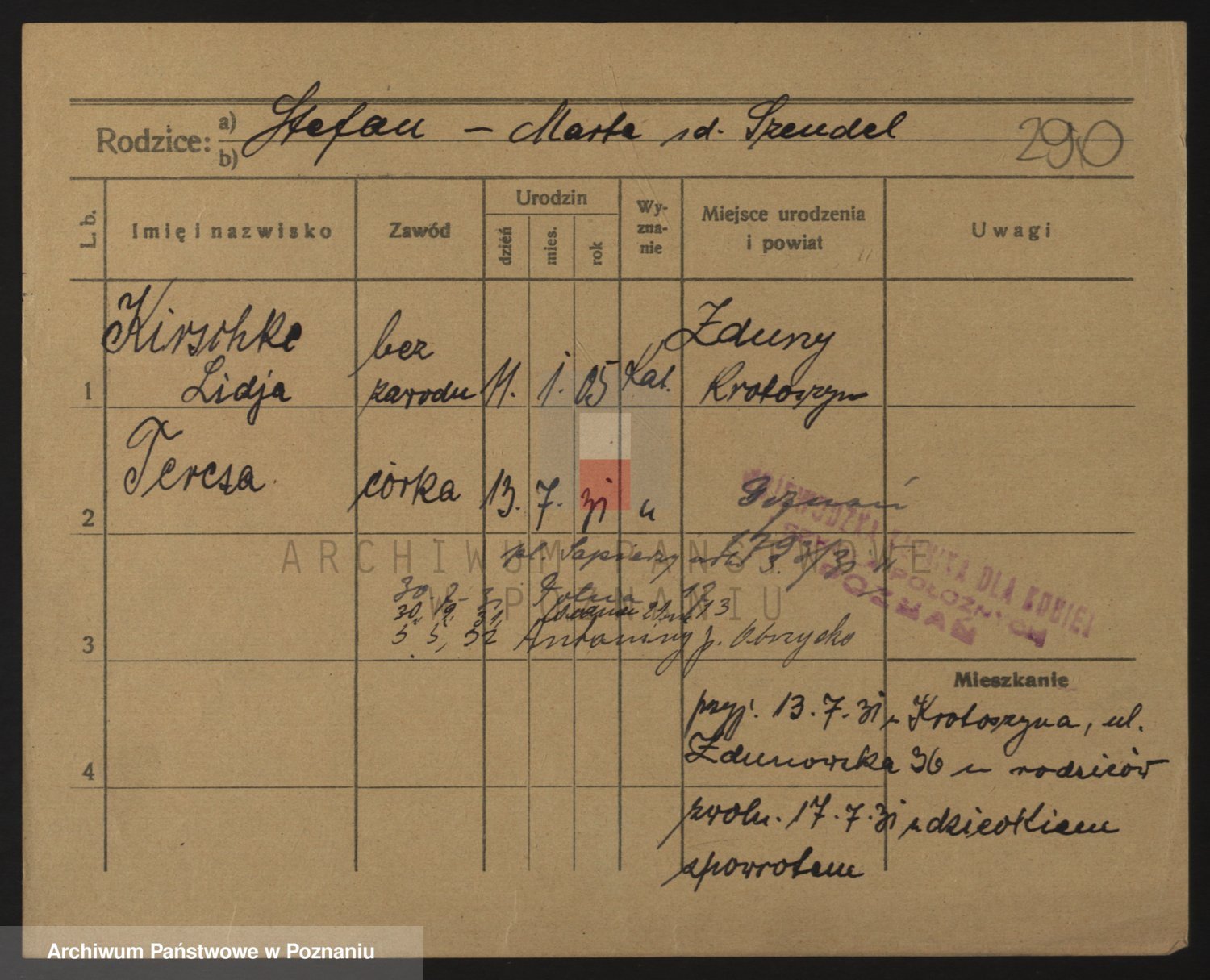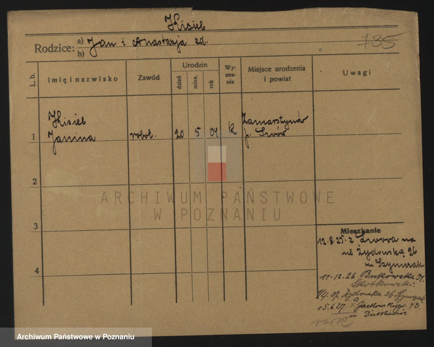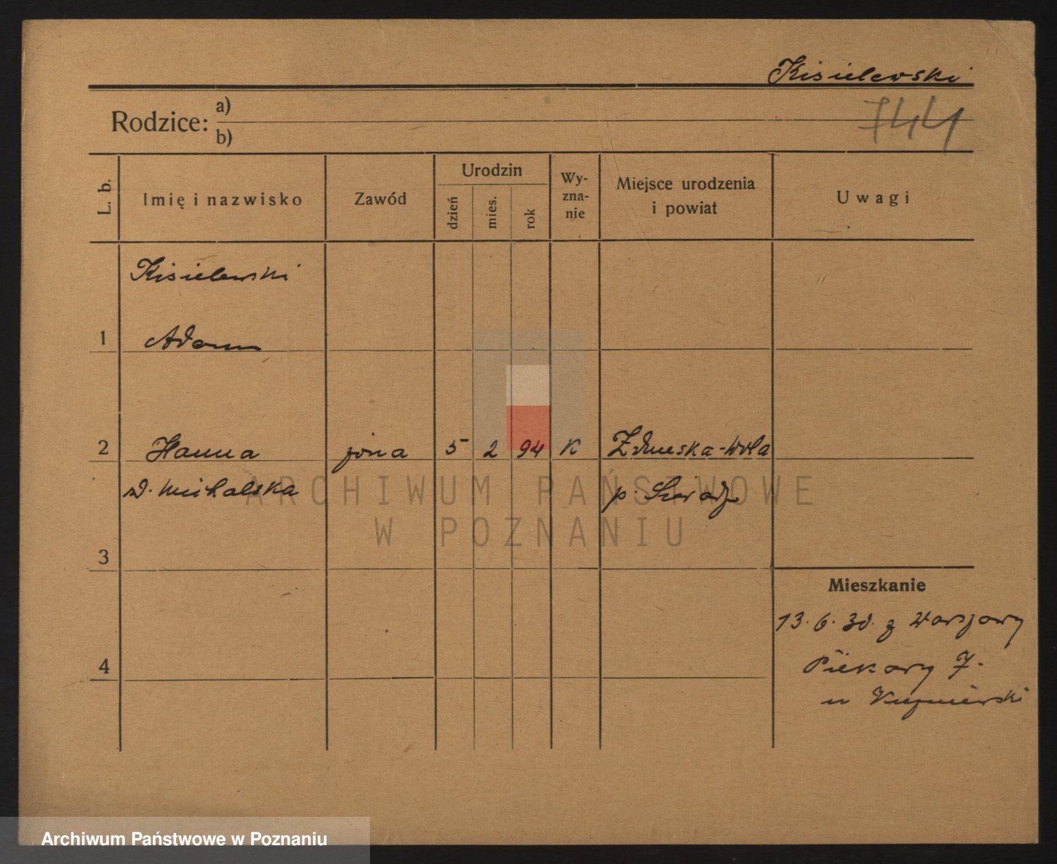 Podgląd karty osobowej dostępny jest po kliknięciu na nazwisko lub ikonkę karty. Można dokonywać powiększenia (ikony na górze) lub przechodzić między kolejnymi skanami (strzałki po bokach).