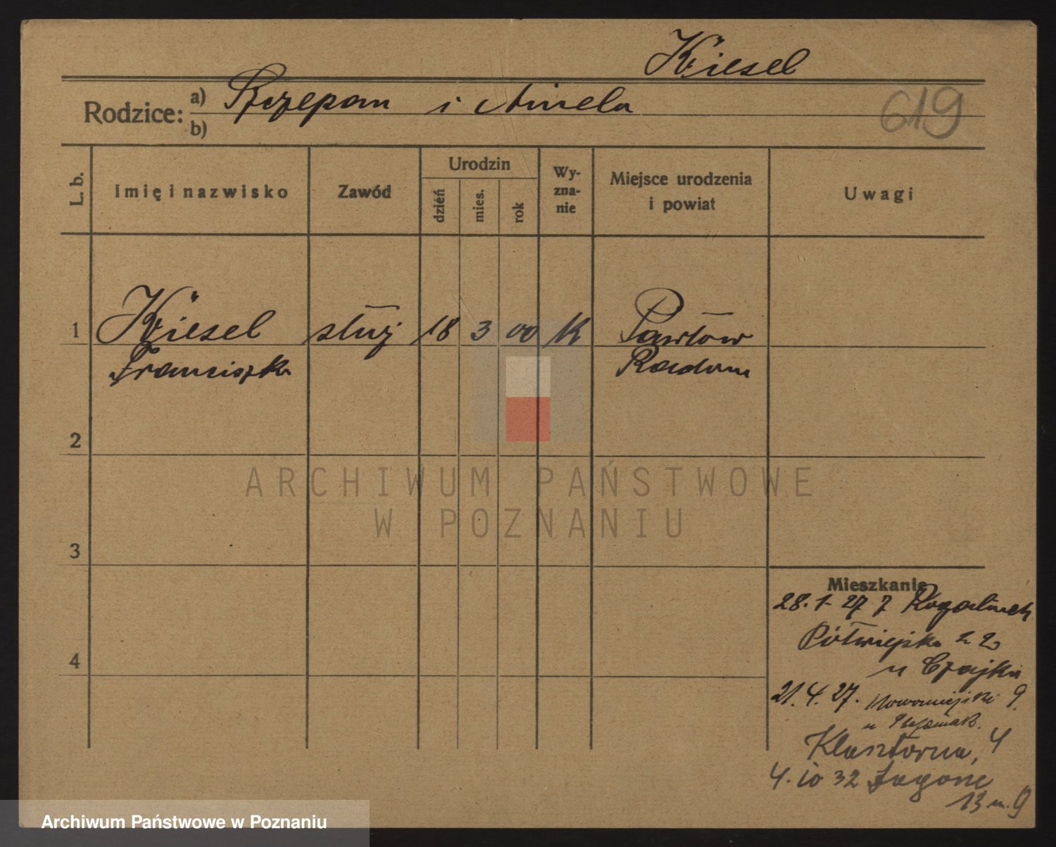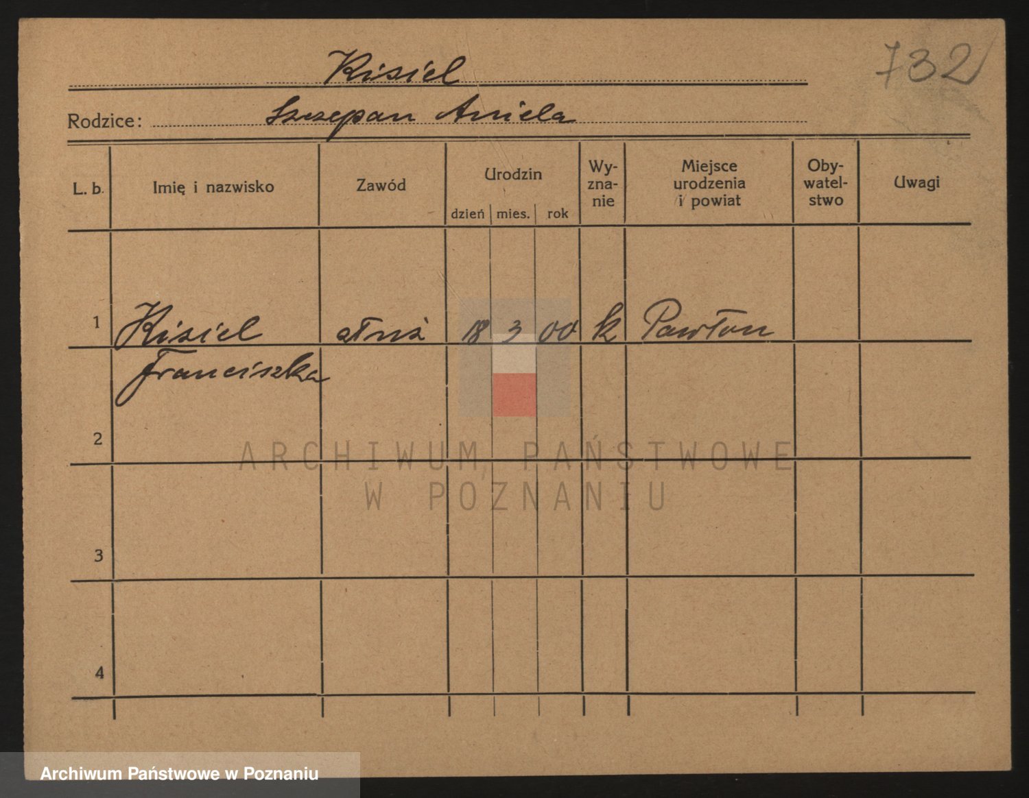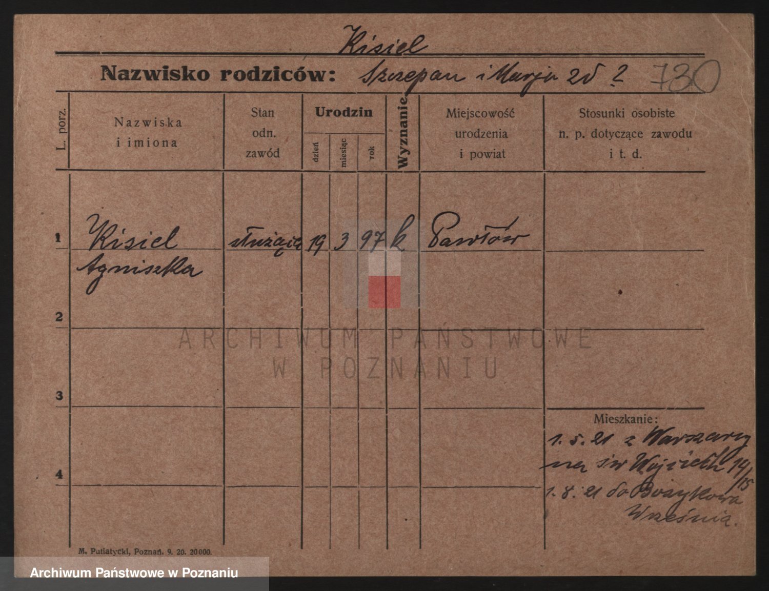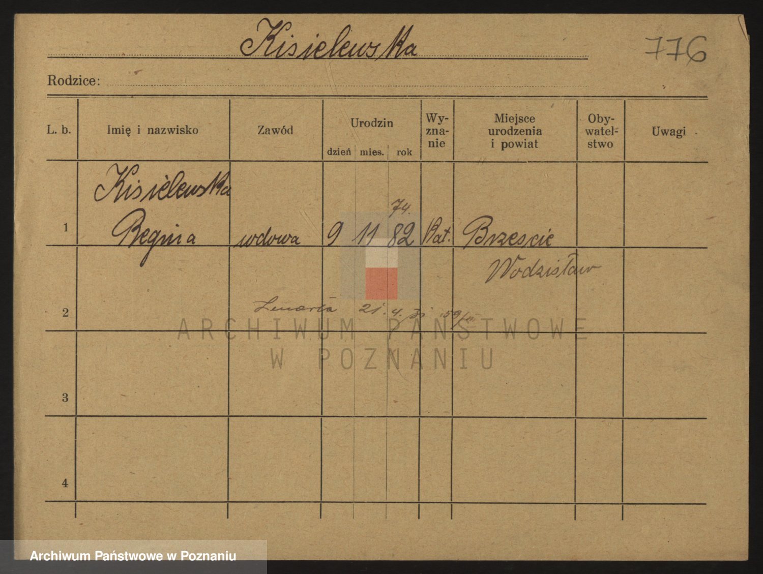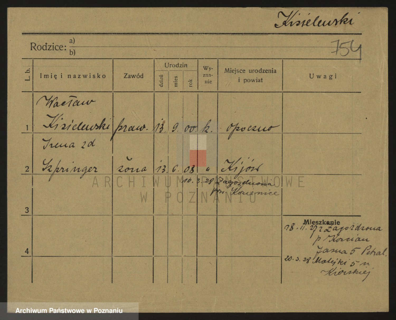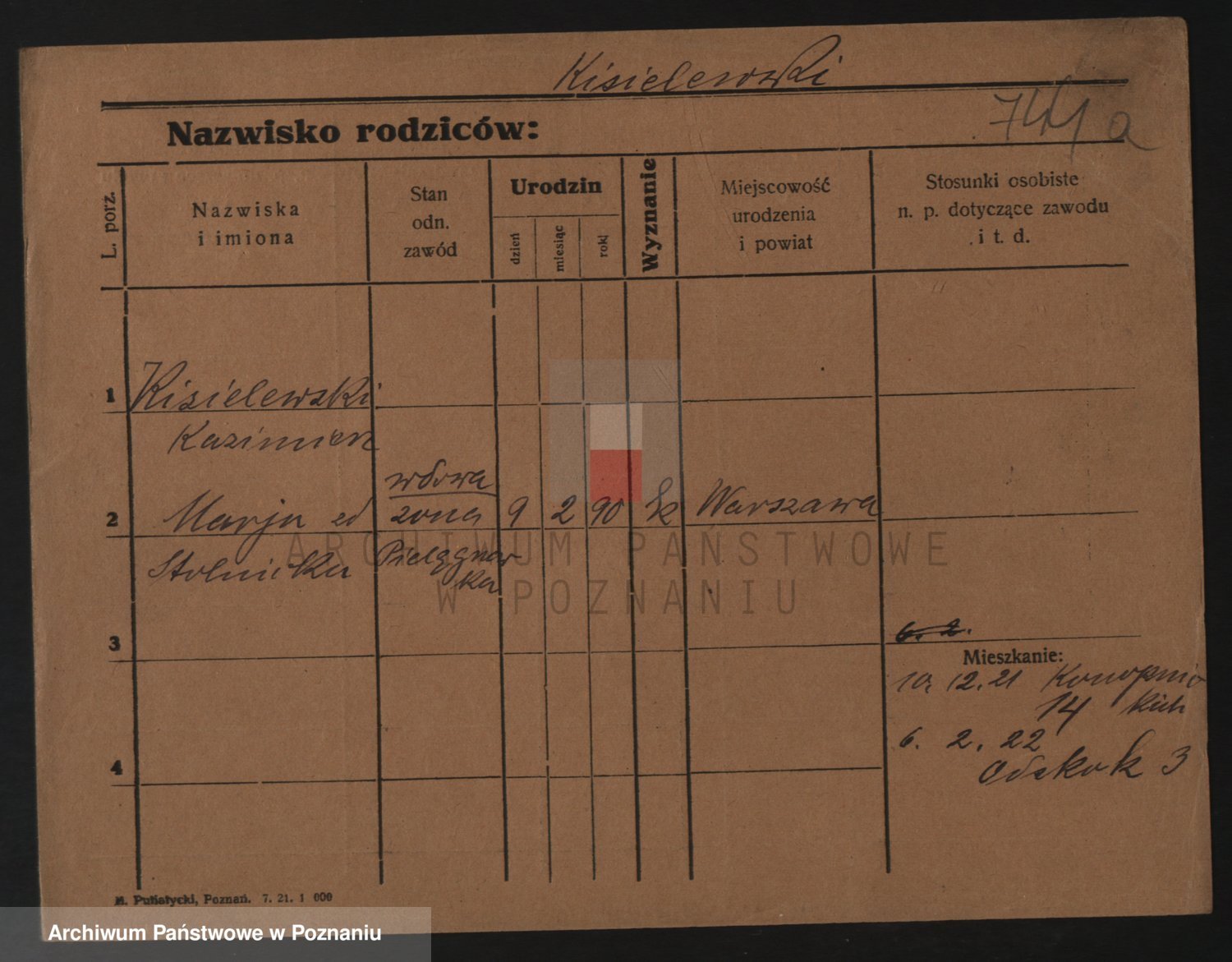 Podgląd karty osobowej dostępny jest po kliknięciu na nazwisko lub ikonkę karty. Można dokonywać powiększenia (ikony na górze) lub przechodzić między kolejnymi skanami (strzałki po bokach).